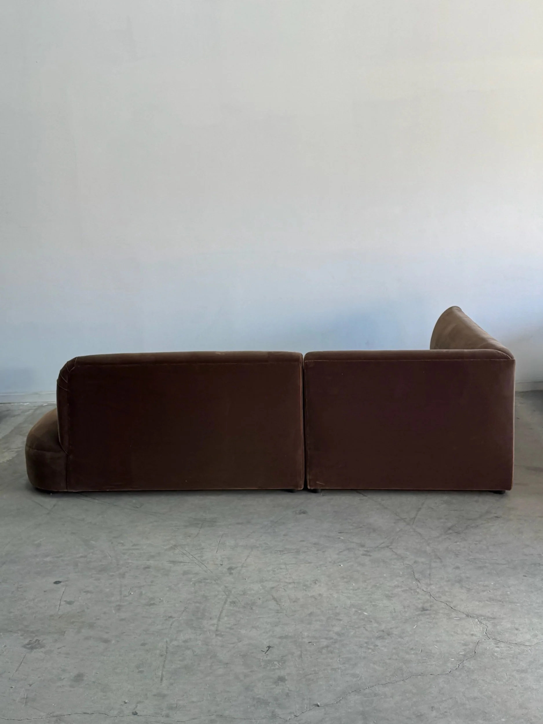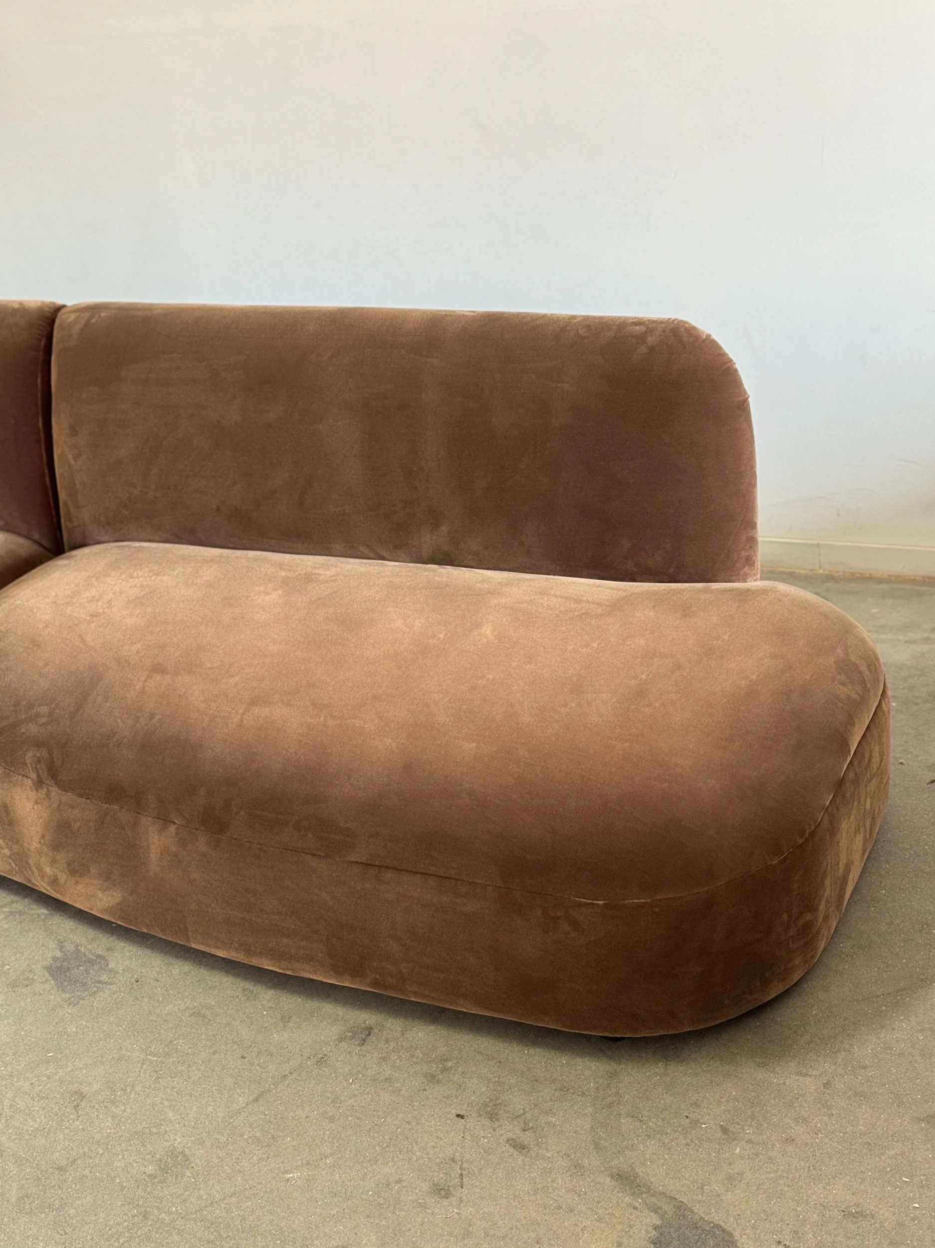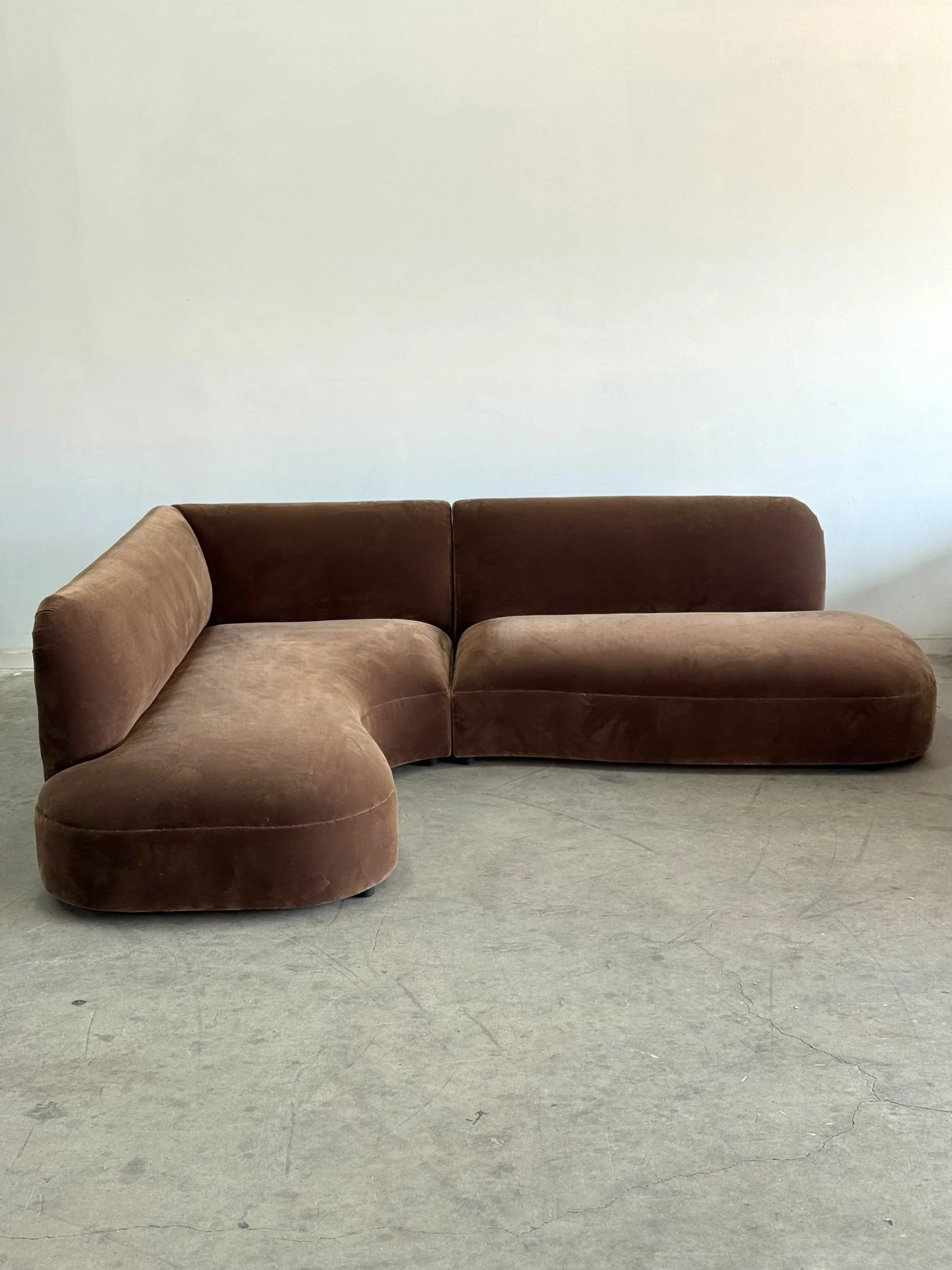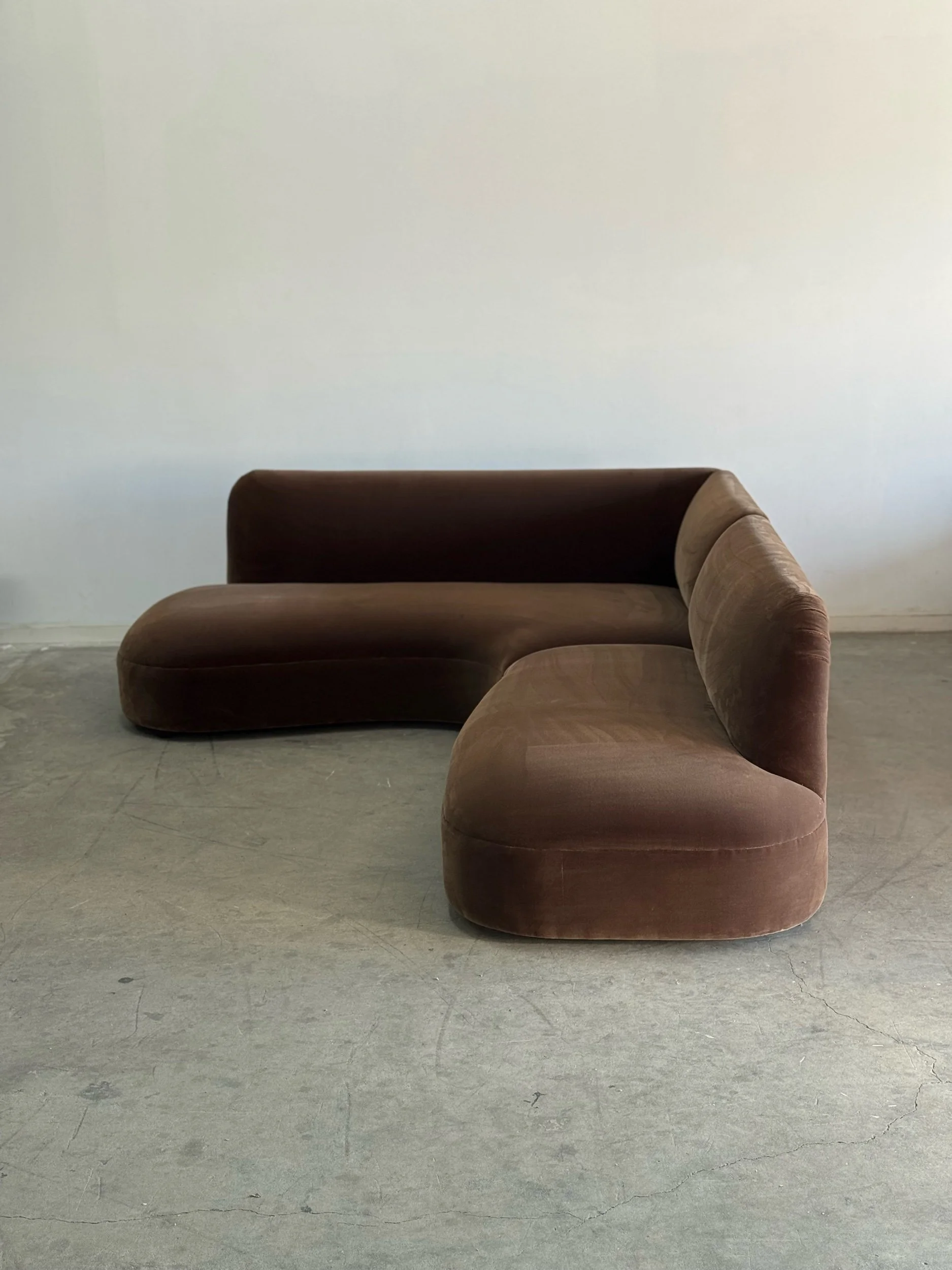 Protoype Floor model for our made to order Oversized channel sectional. This model features a spring and medium foam mix with a high pile mohair mix. Item features arm rest on each side and ample depth compared to other sofas. Item also shows a nice lip overhang on the front of the sofa. This large sectional consists of three pieces that can bee used as modular pieces or connected with pre installed undermount brackets. Price is for the floor model as shows.