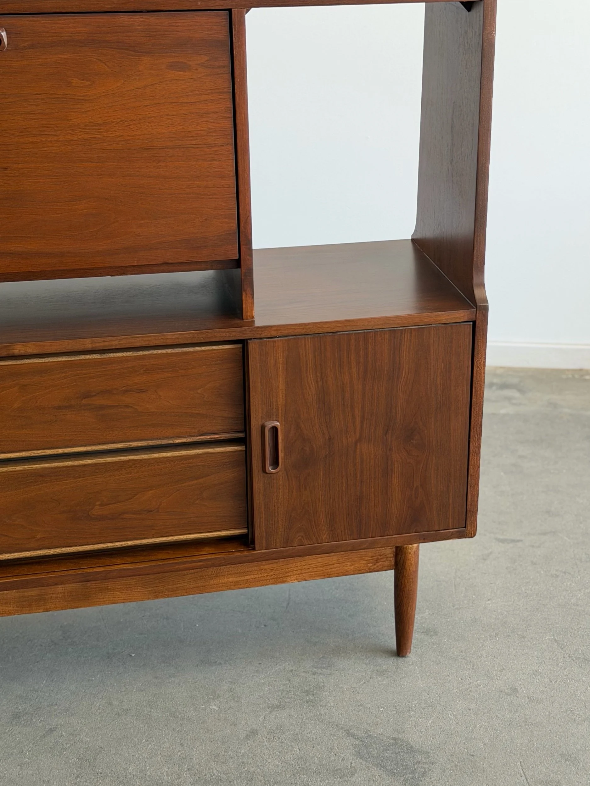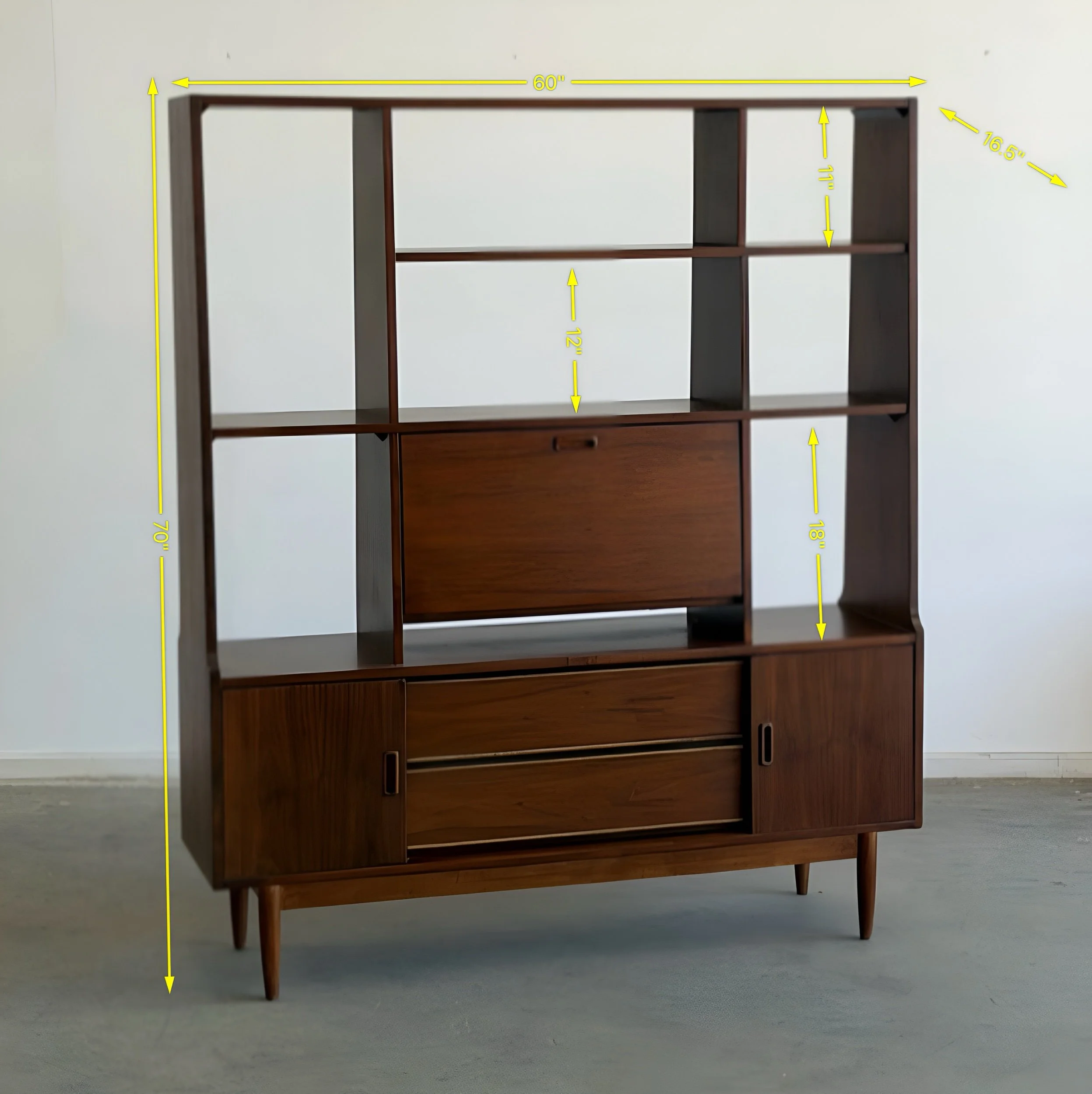 Make a statement with this expansive Mid-Century Modern wall unit. This architecturally stunning piece offers the perfect blend of open display space and hidden storage. Crafted from rich, warm walnut, it features a lower credenza base with two sliding doors and two spacious drawers, topped by a versatile shelving system that includes a central "drop-down" bar or secretary cabinet.