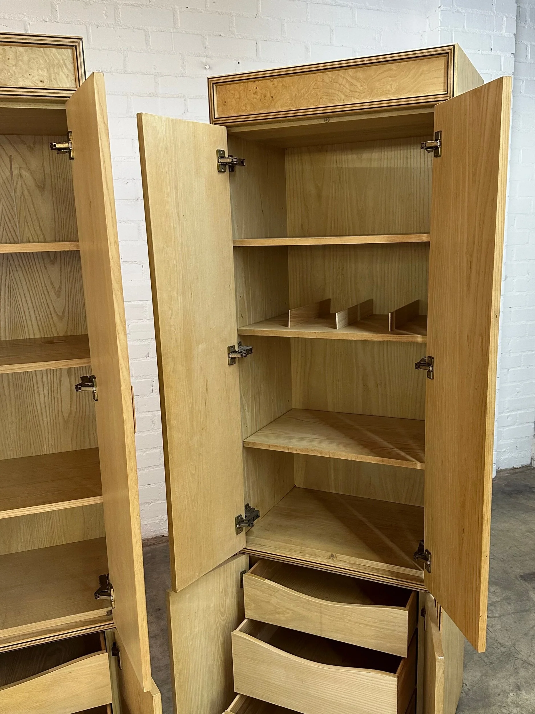 Large tall armoires both in good vintage condition. Each unit is in original vintage condition with very minor wear pictured. Price is per unit. Both units are structurally sound , sturdy and fully functional.