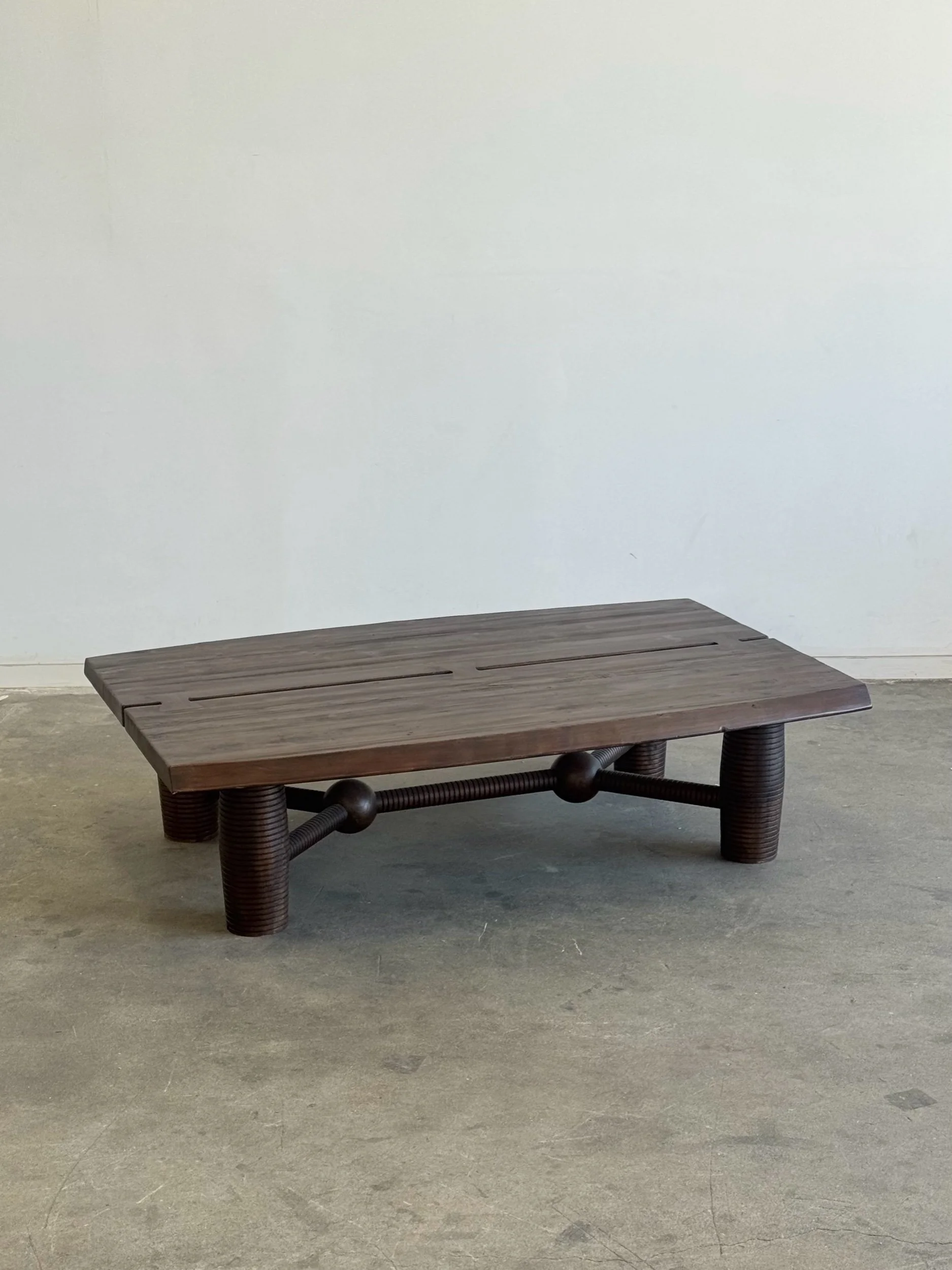 Constructed from reclaimed pine wood, this Sixpenny coffee table reveals natural grain patterns with subtle imperfections that gives the table its character. Its distinctive stretcher features spheres and carved details throughout. Finished in a dark ebony walnut.