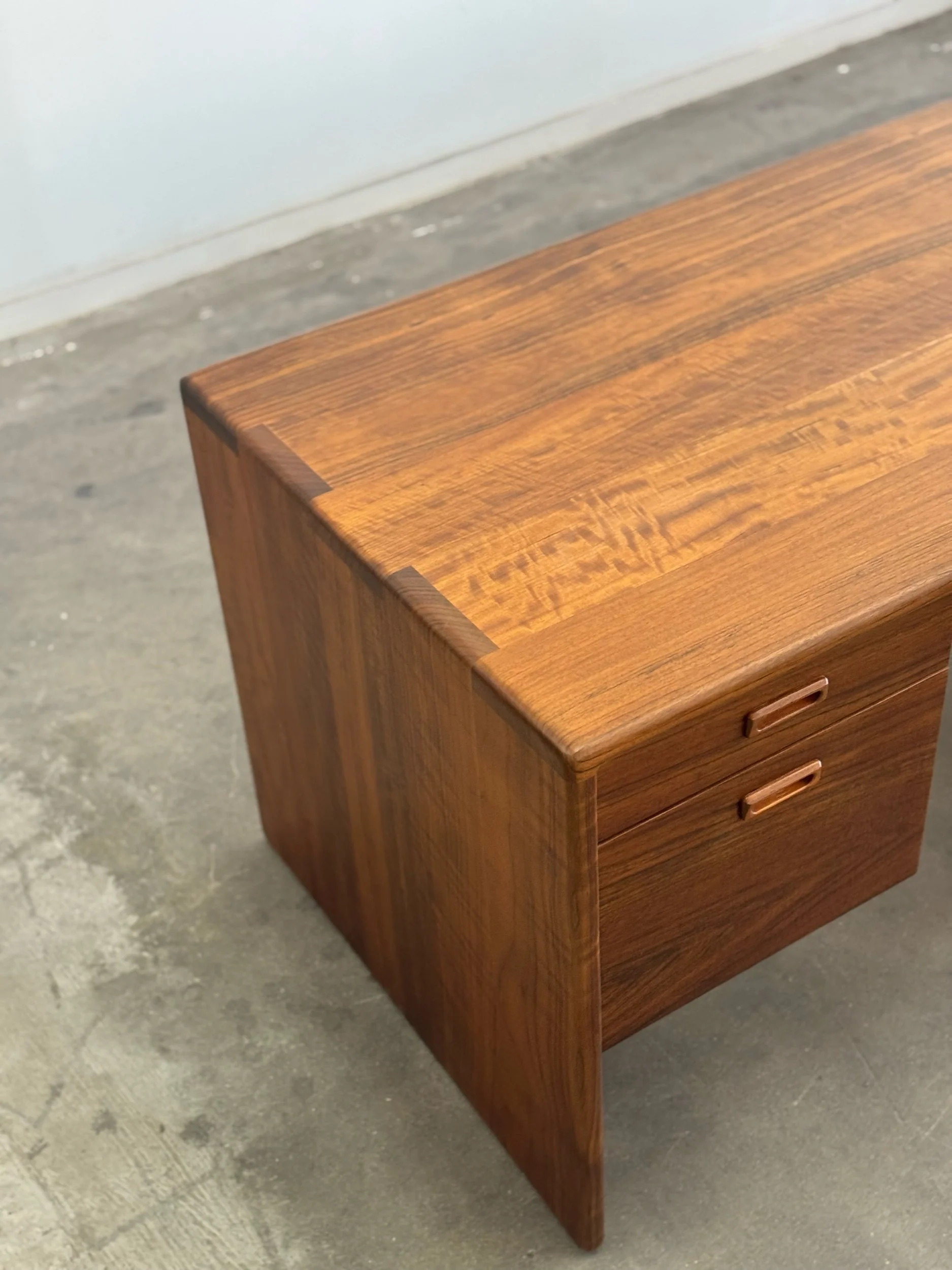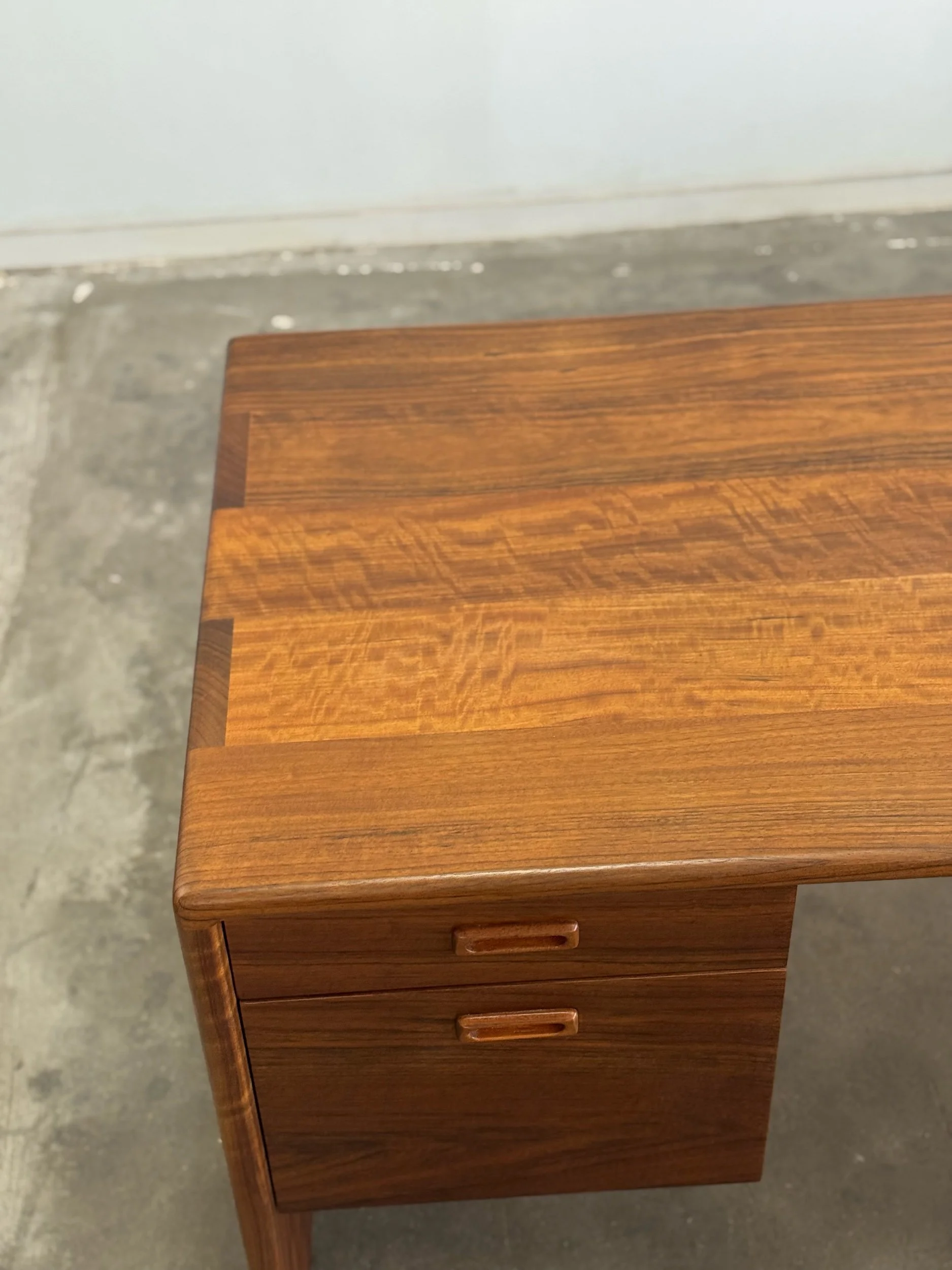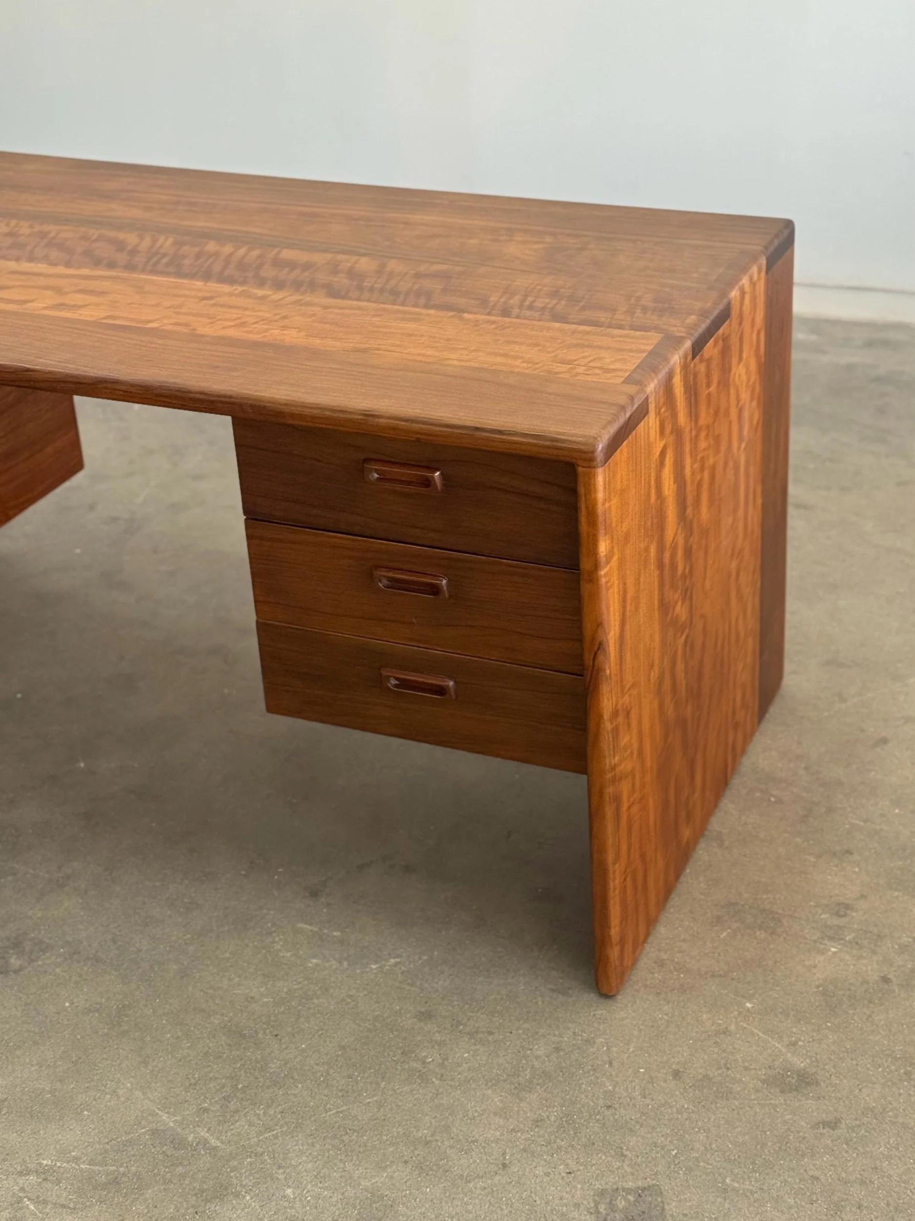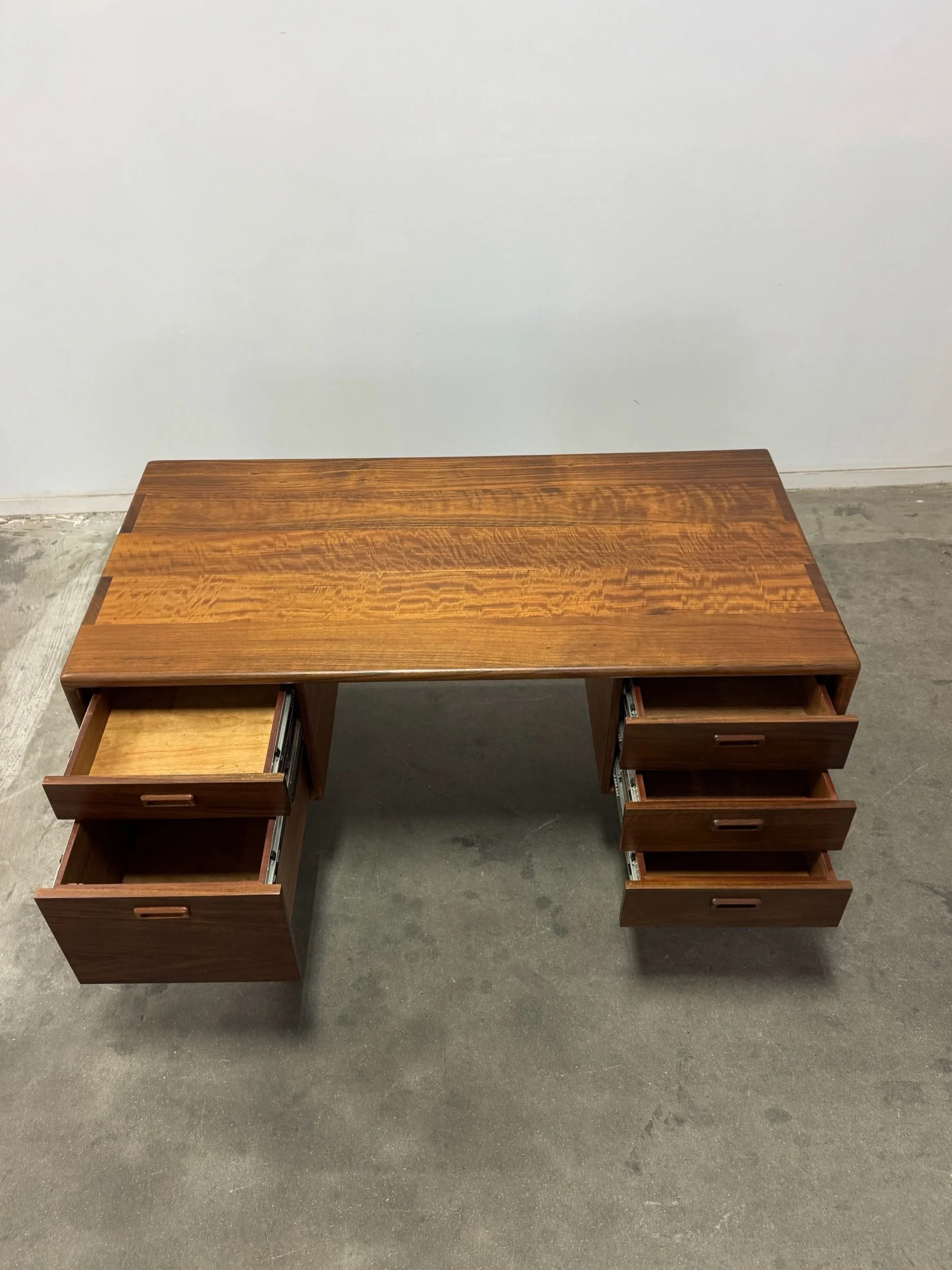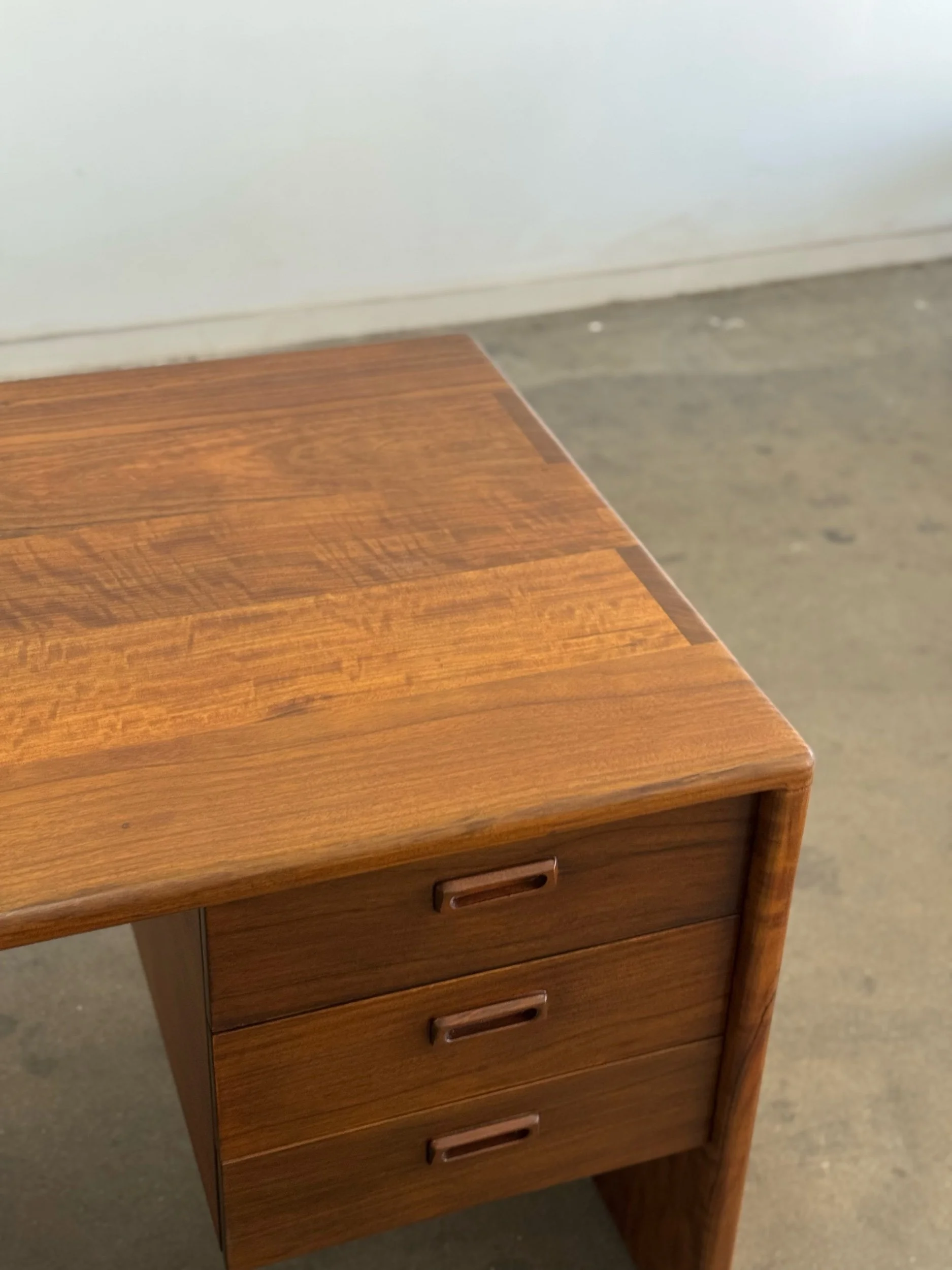 Fully restored solid desk crafted in what seems to be Shedua. Desk is in excellent condition with no major areas of wear . Unit features exposed dovetail corners , sculpted handles , is finished on all sides. Desk is structurally sound and fully functional.