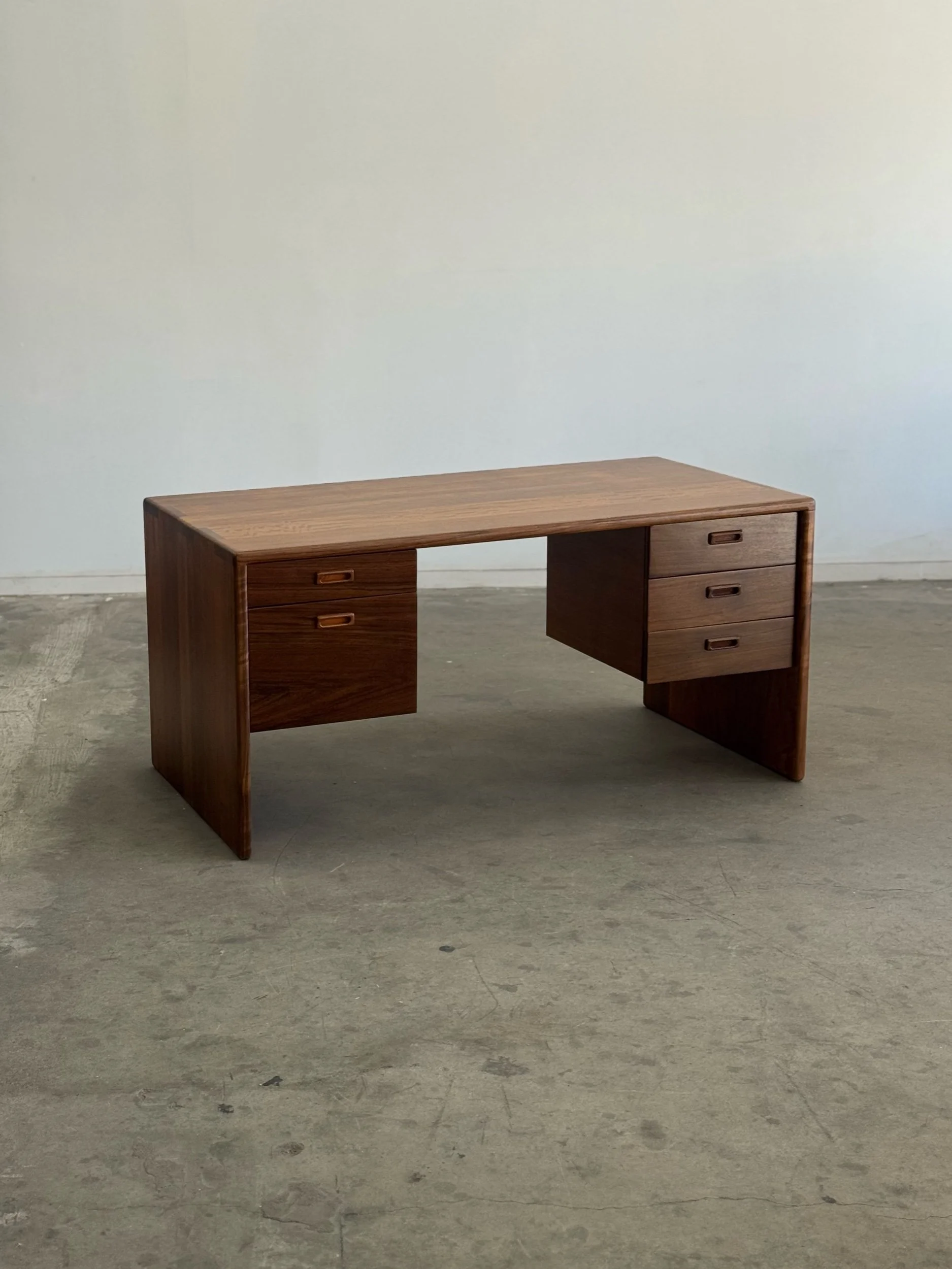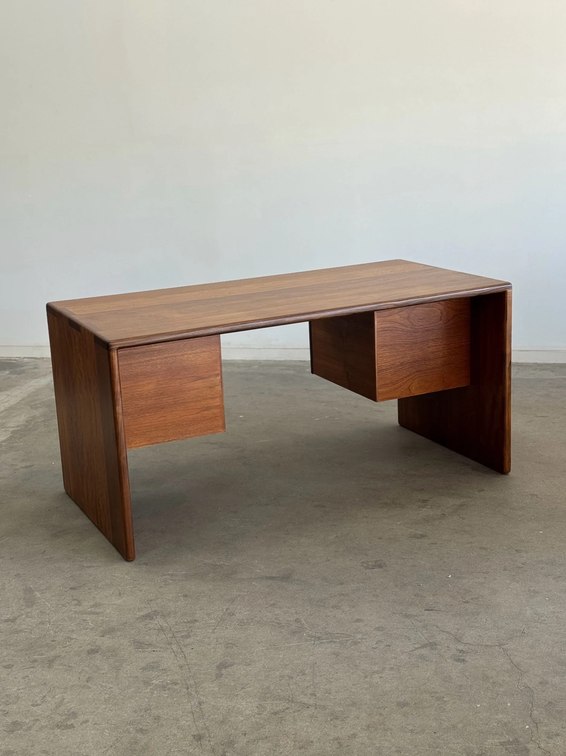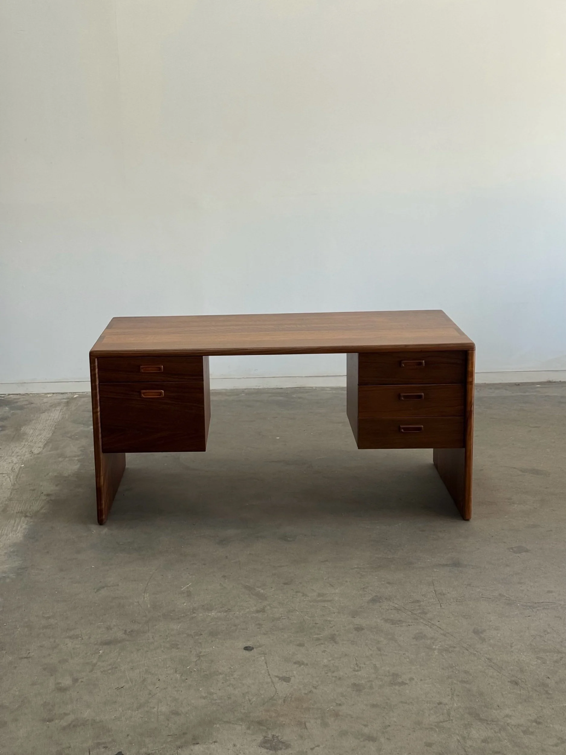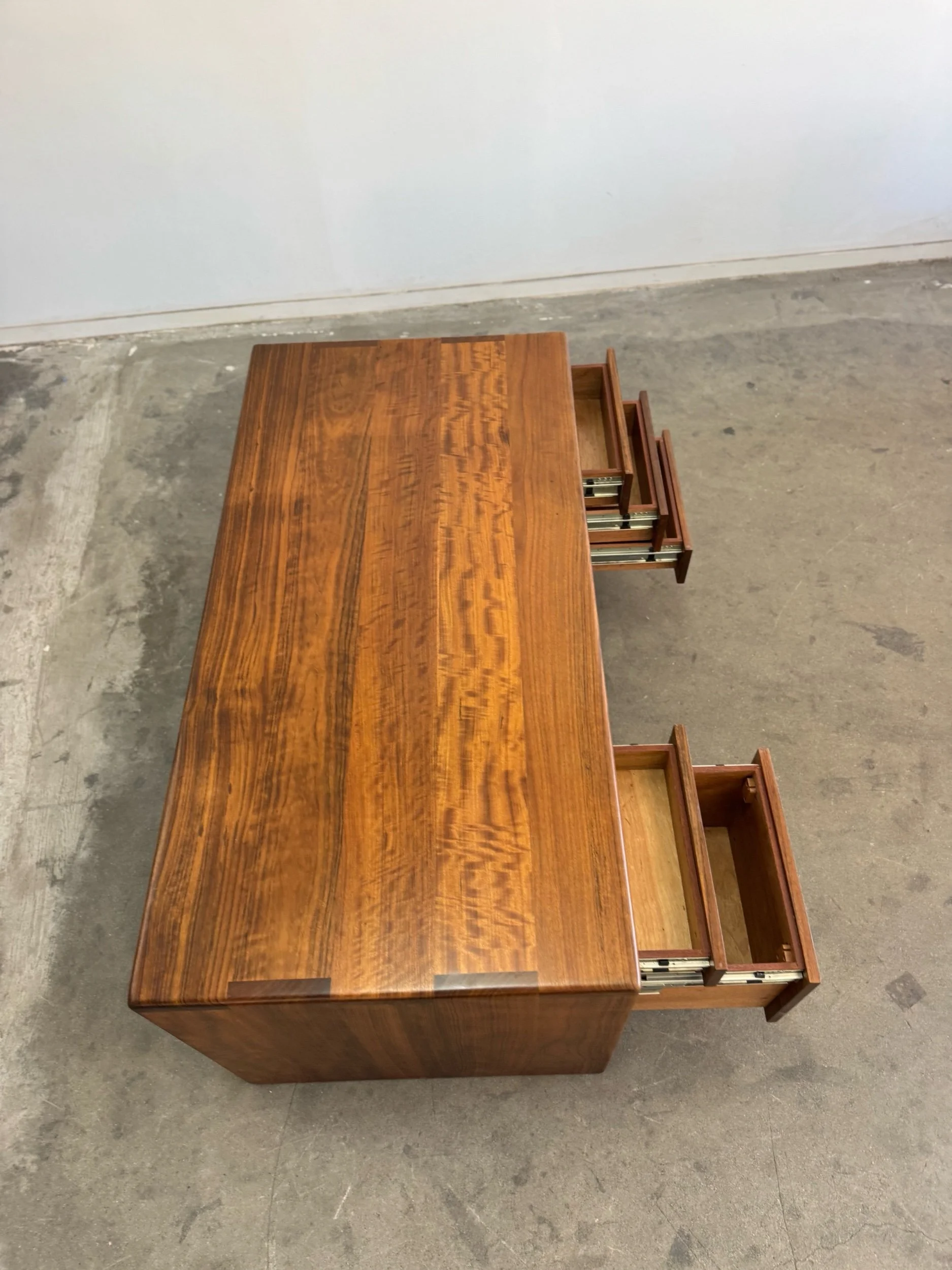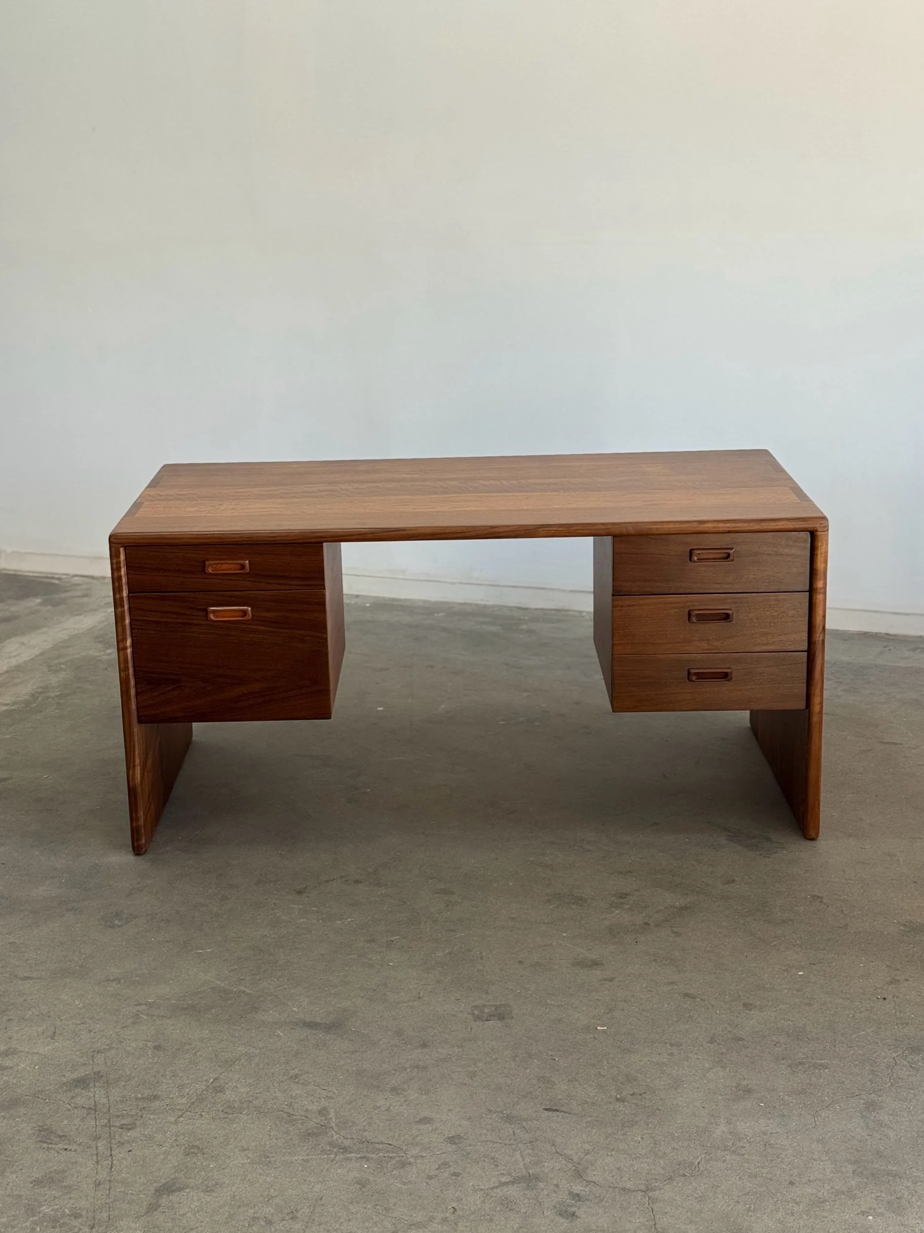 Fully restored solid desk crafted in what seems to be Shedua. Desk is in excellent condition with no major areas of wear . Unit features exposed dovetail corners , sculpted handles , is finished on all sides. Desk is structurally sound and fully functional.
