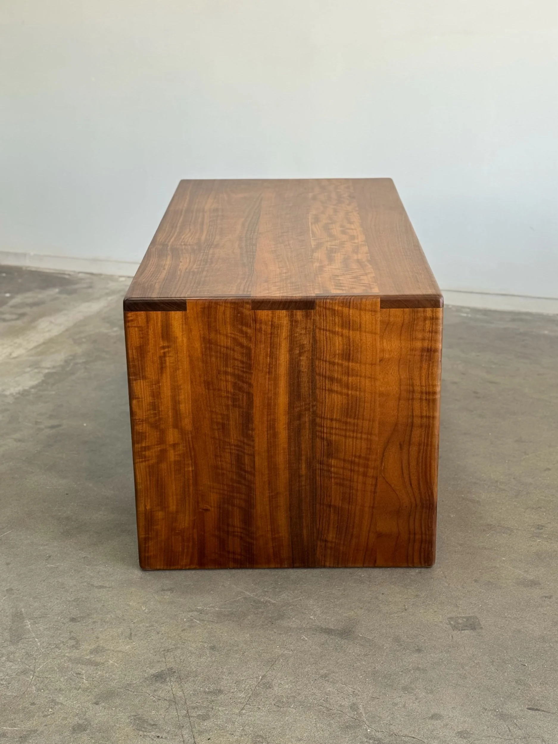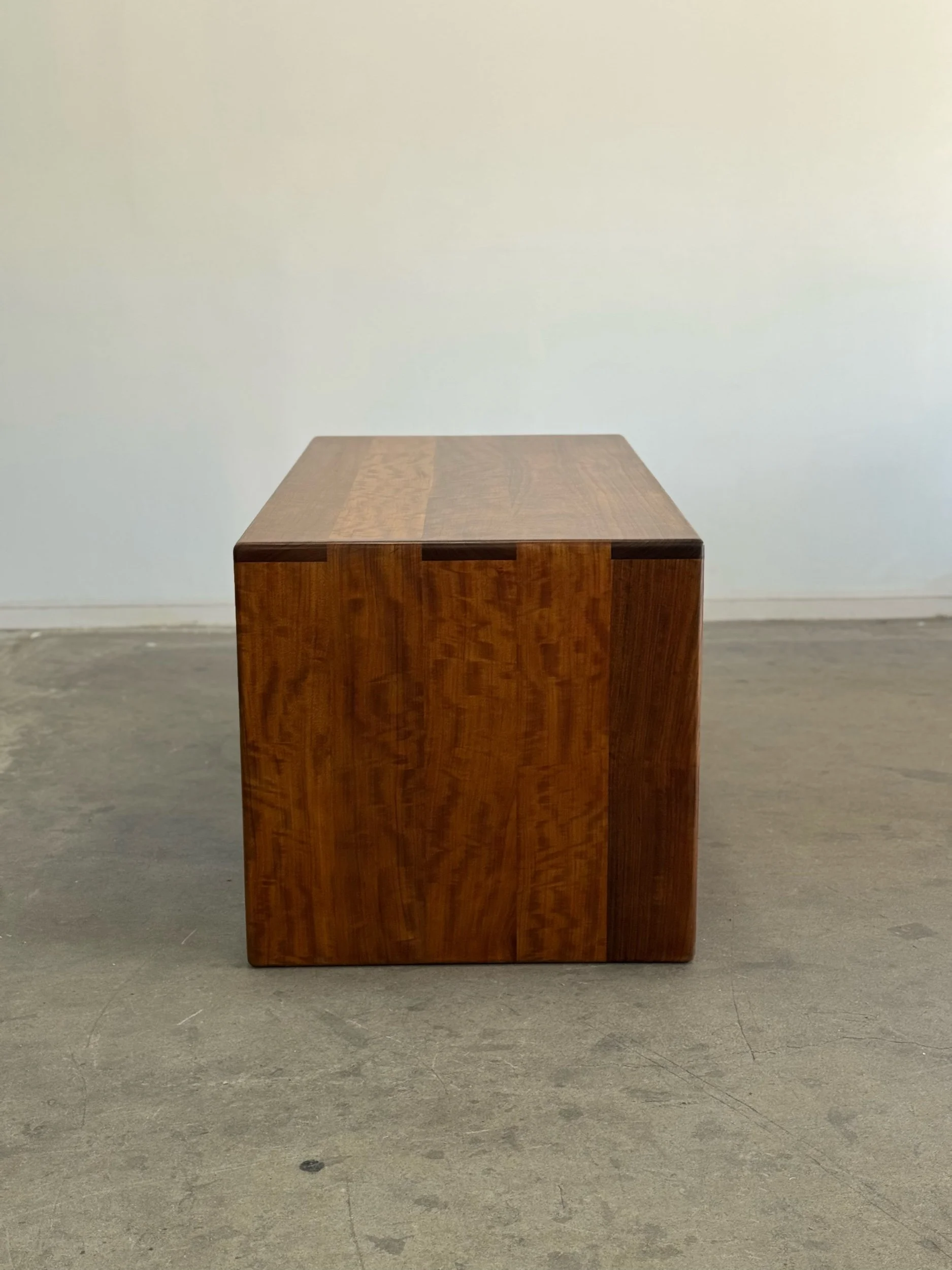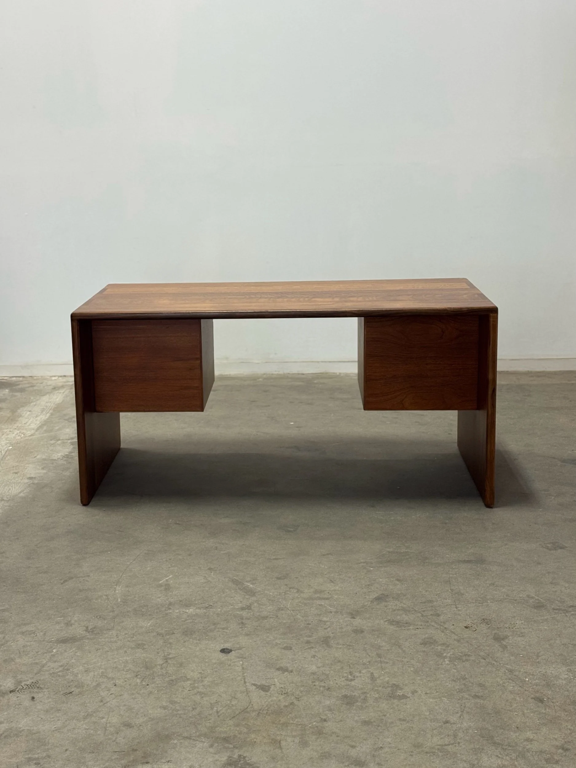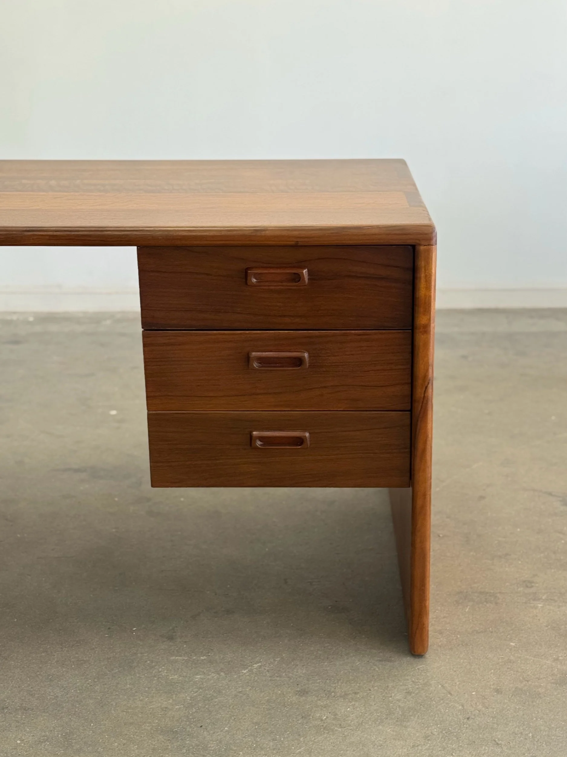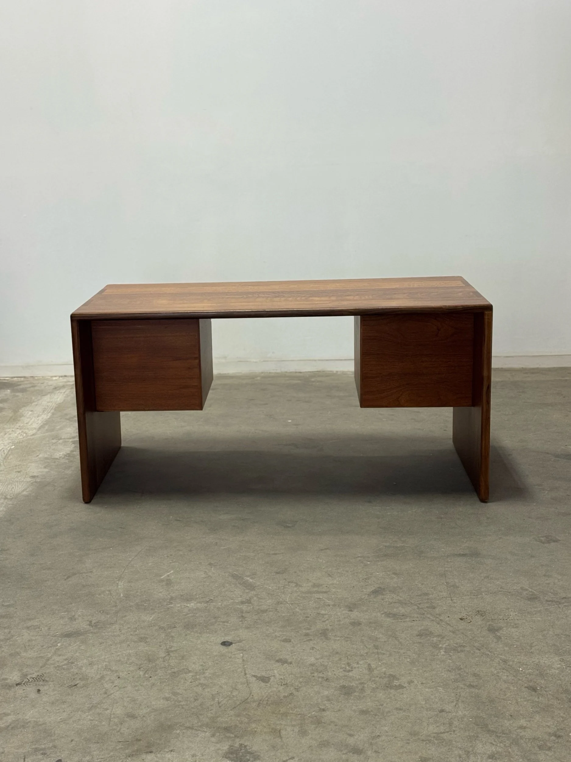 Fully restored solid desk crafted in what seems to be Shedua. Desk is in excellent condition with no major areas of wear . Unit features exposed dovetail corners , sculpted handles , is finished on all sides. Desk is structurally sound and fully functional.