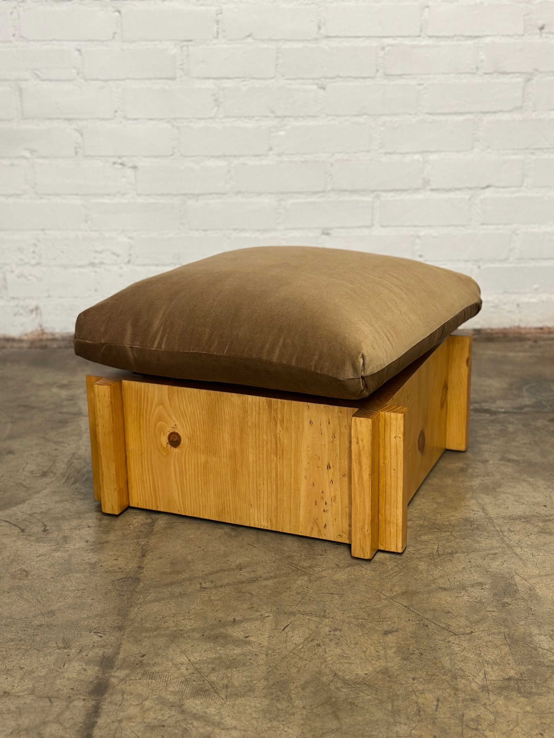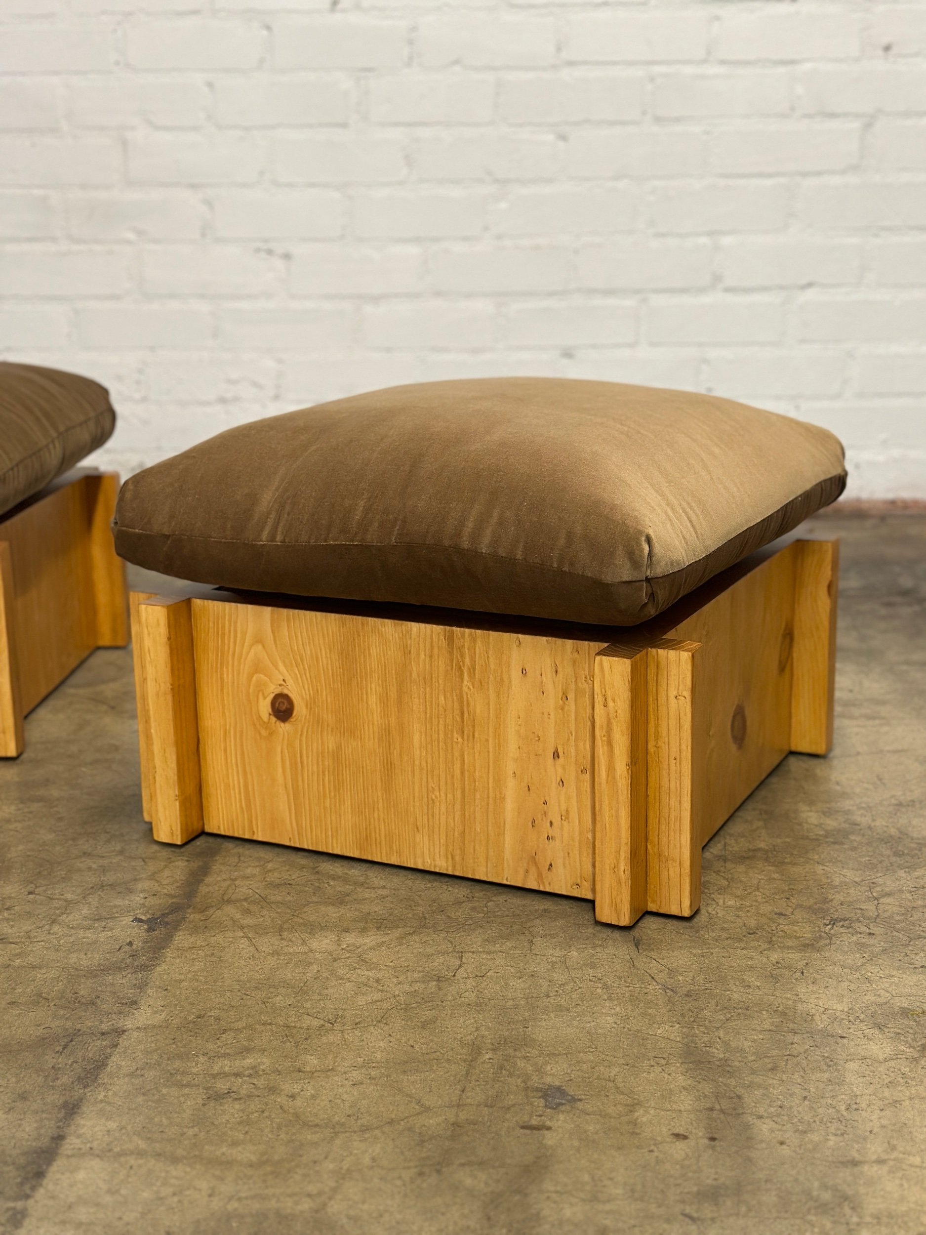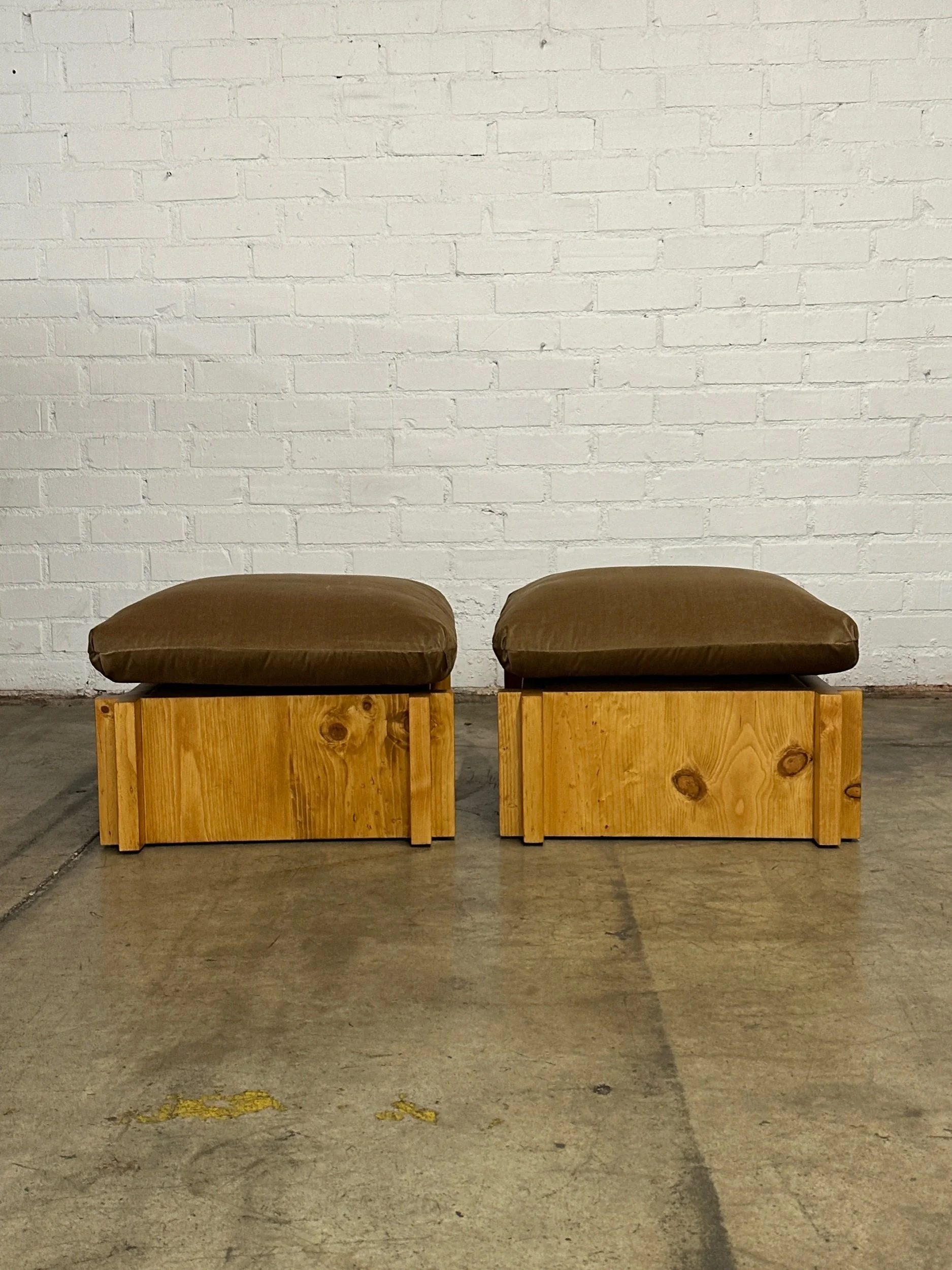 Fabricated in house from solid pine , each lounge features exceptional craftsmanship. Clear coated to shows natural warm pine hues. Lounger show cases overlapping crosses that interlock the frame and provide a nice added flair of detail. Price is per ottoman as shown. Each cushion has synthetic feather fill for ample comfort.