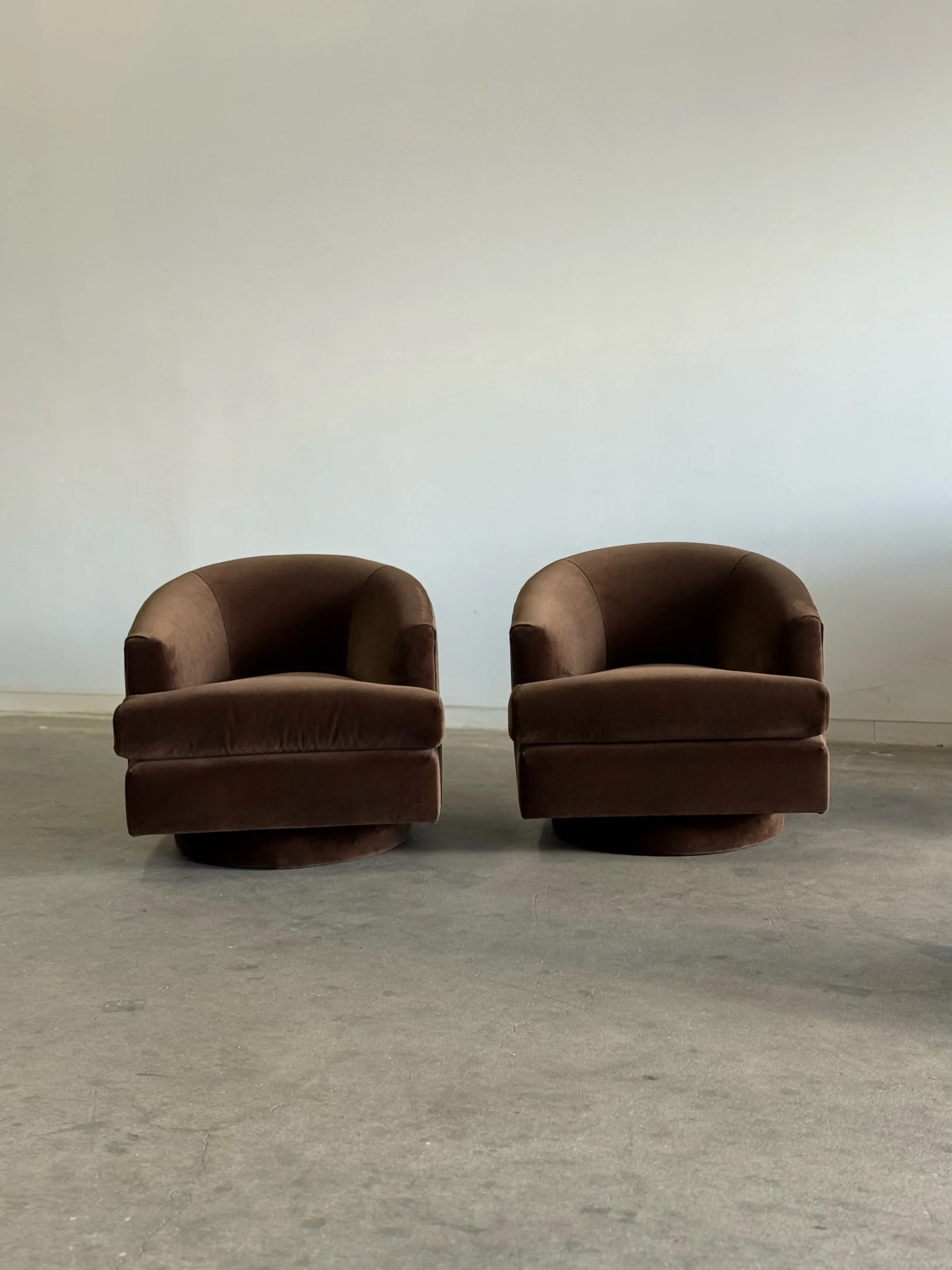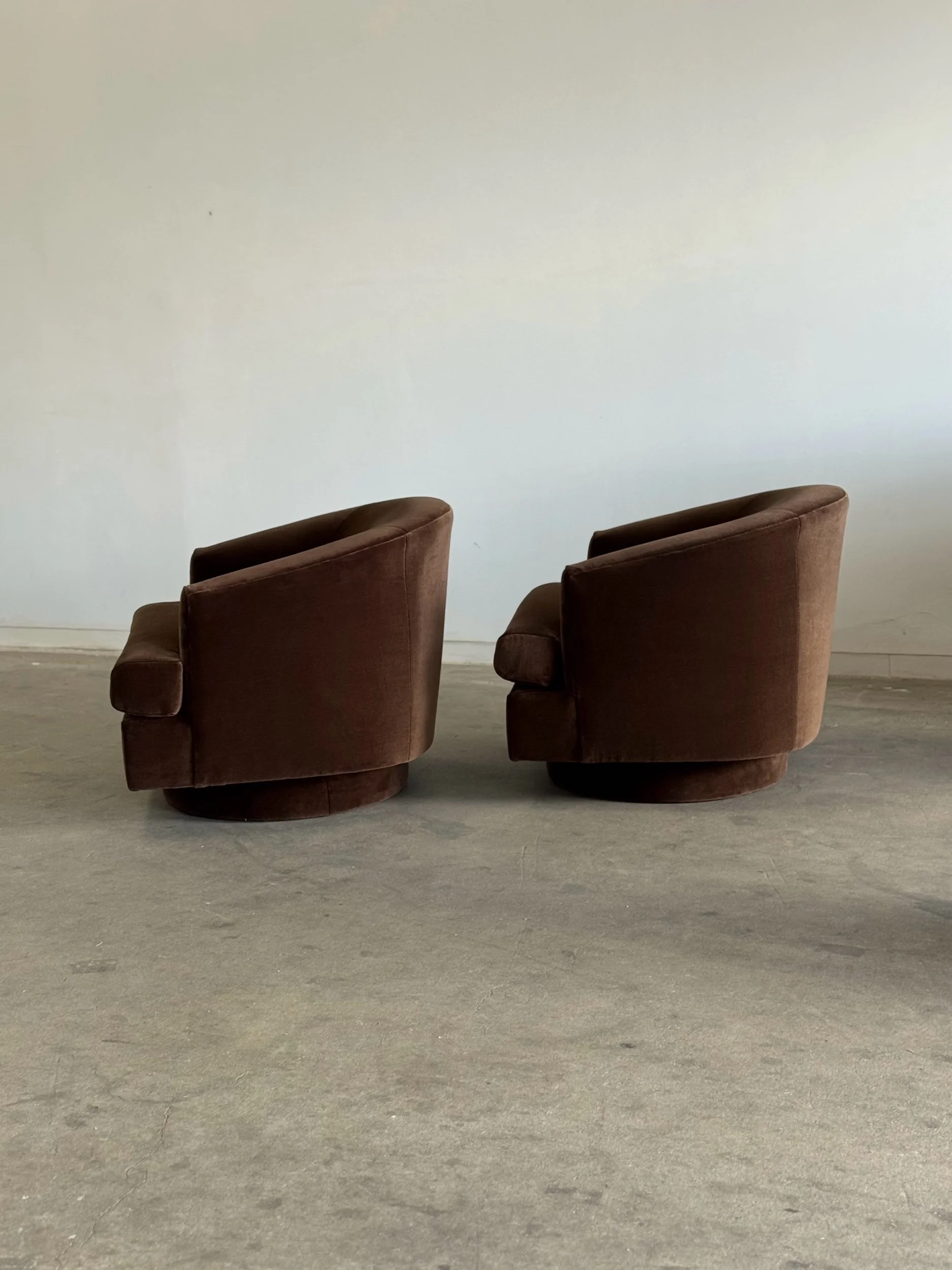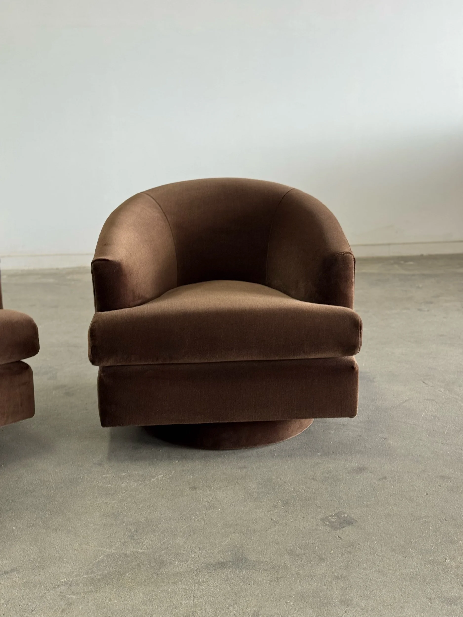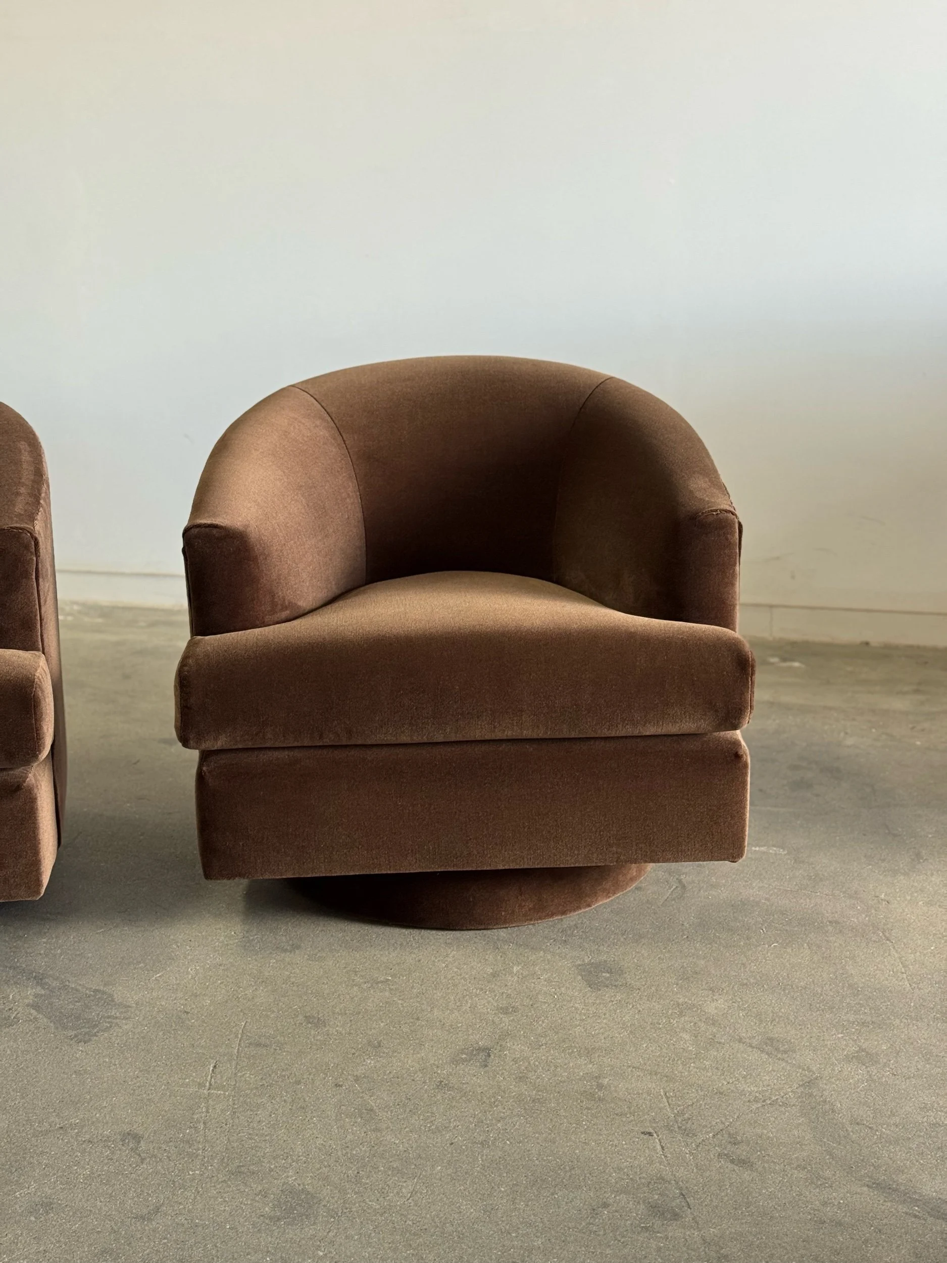 Thoughtfully restored & reupholstered mid-century modern swivel barrel chairs attributed to the style of Milo Baughman. Both chairs are structurally sound with newly added brown velvet fabric.