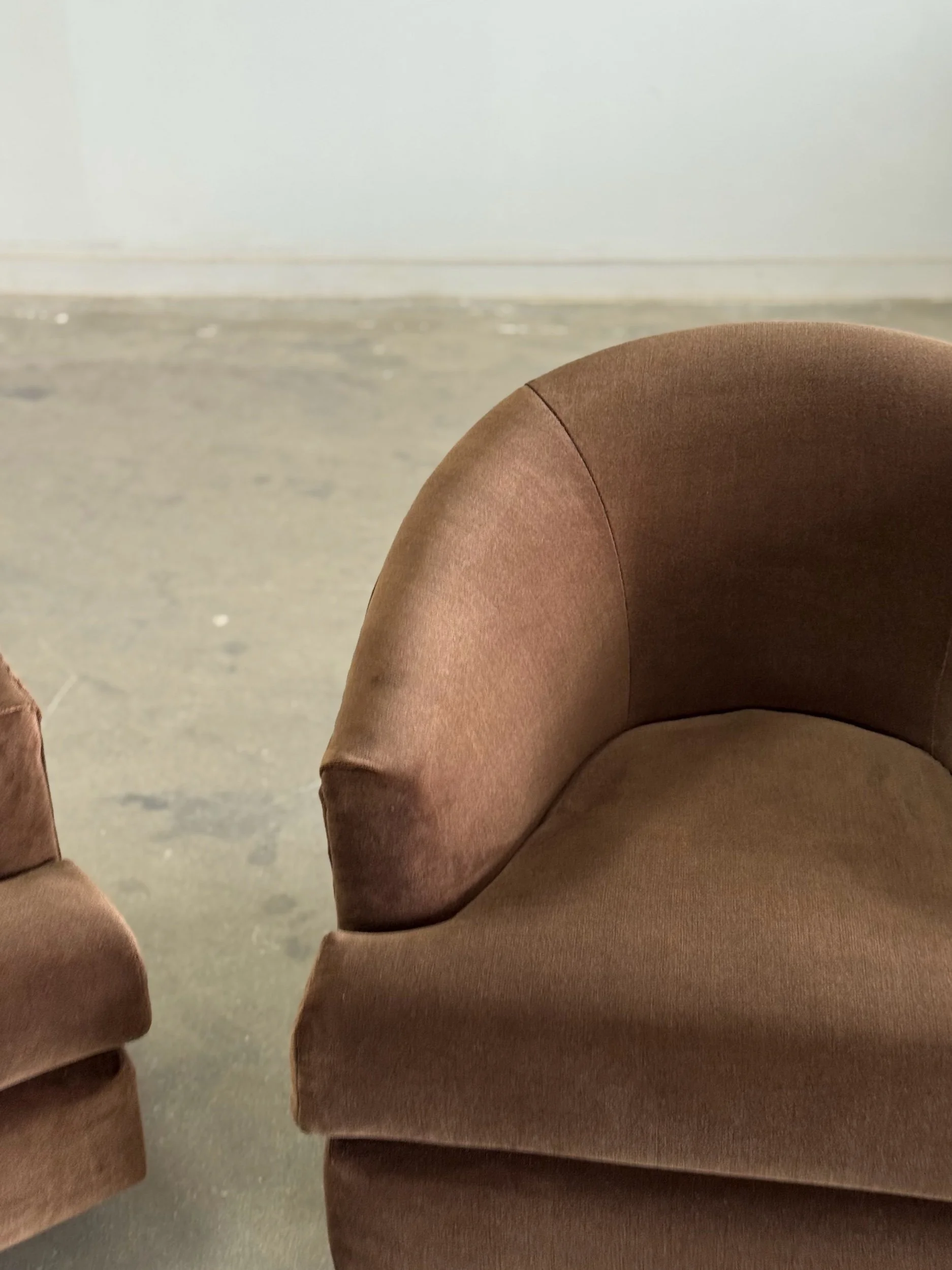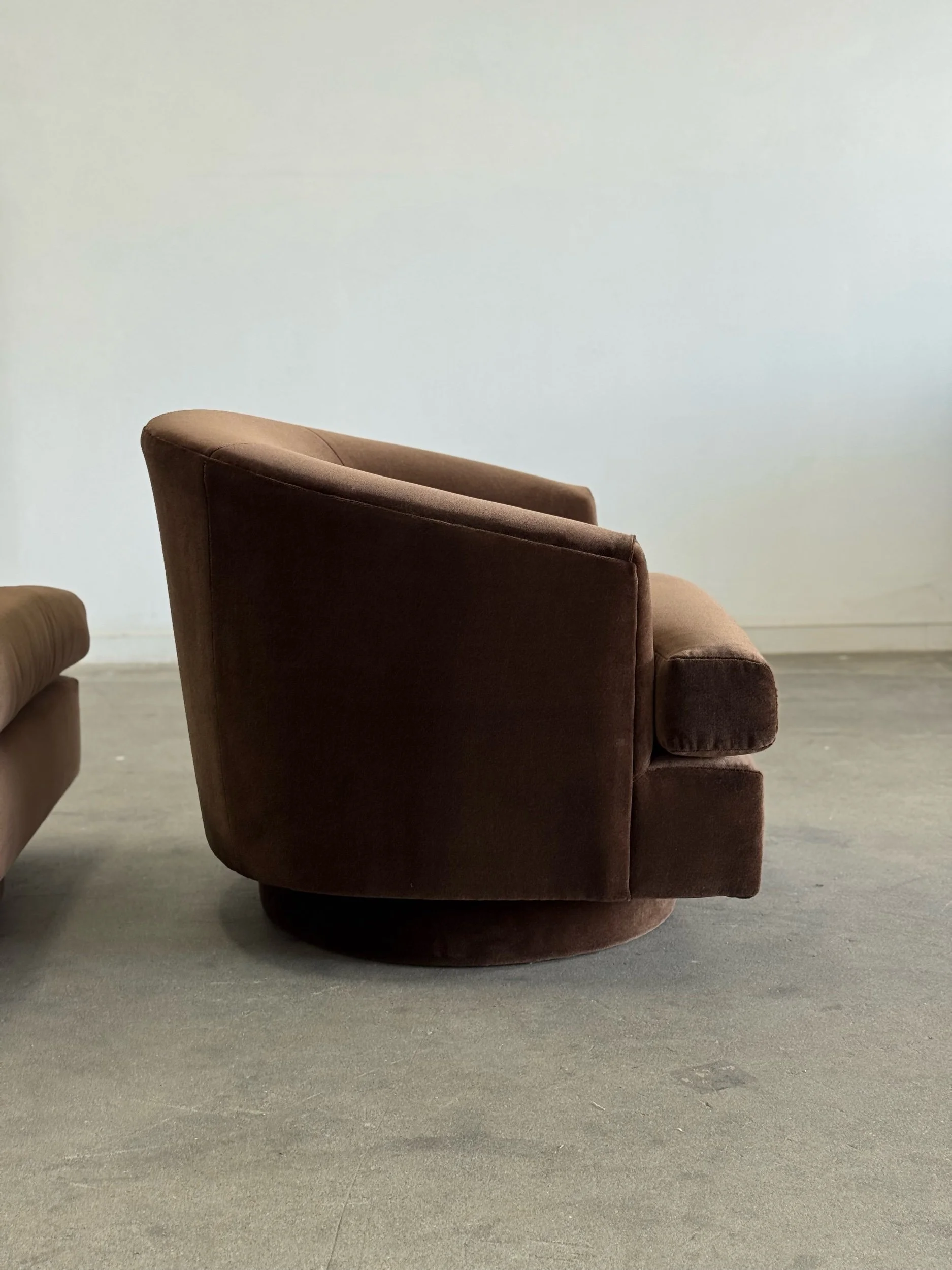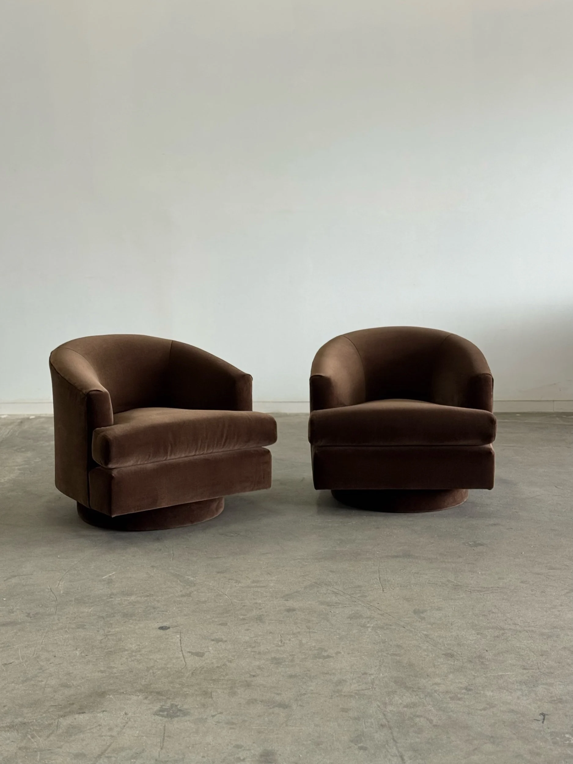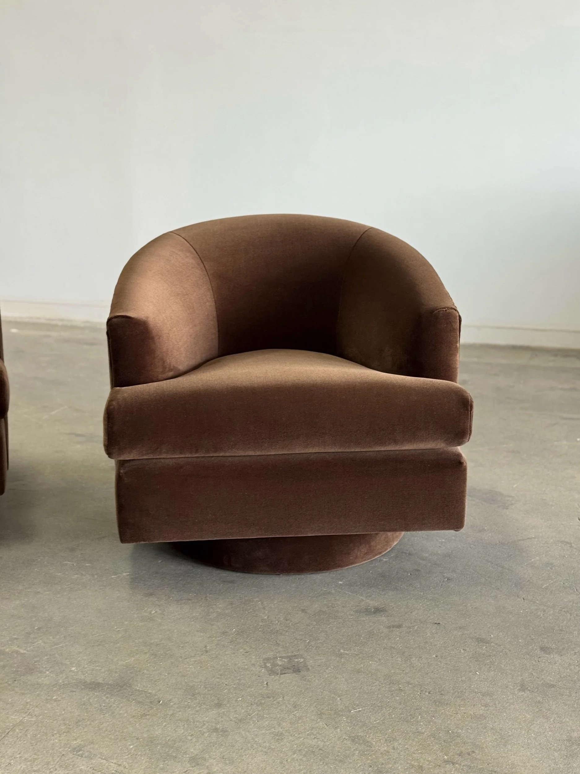 Thoughtfully restored & reupholstered mid-century modern swivel barrel chairs attributed to the style of Milo Baughman. Both chairs are structurally sound with newly added brown velvet fabric.