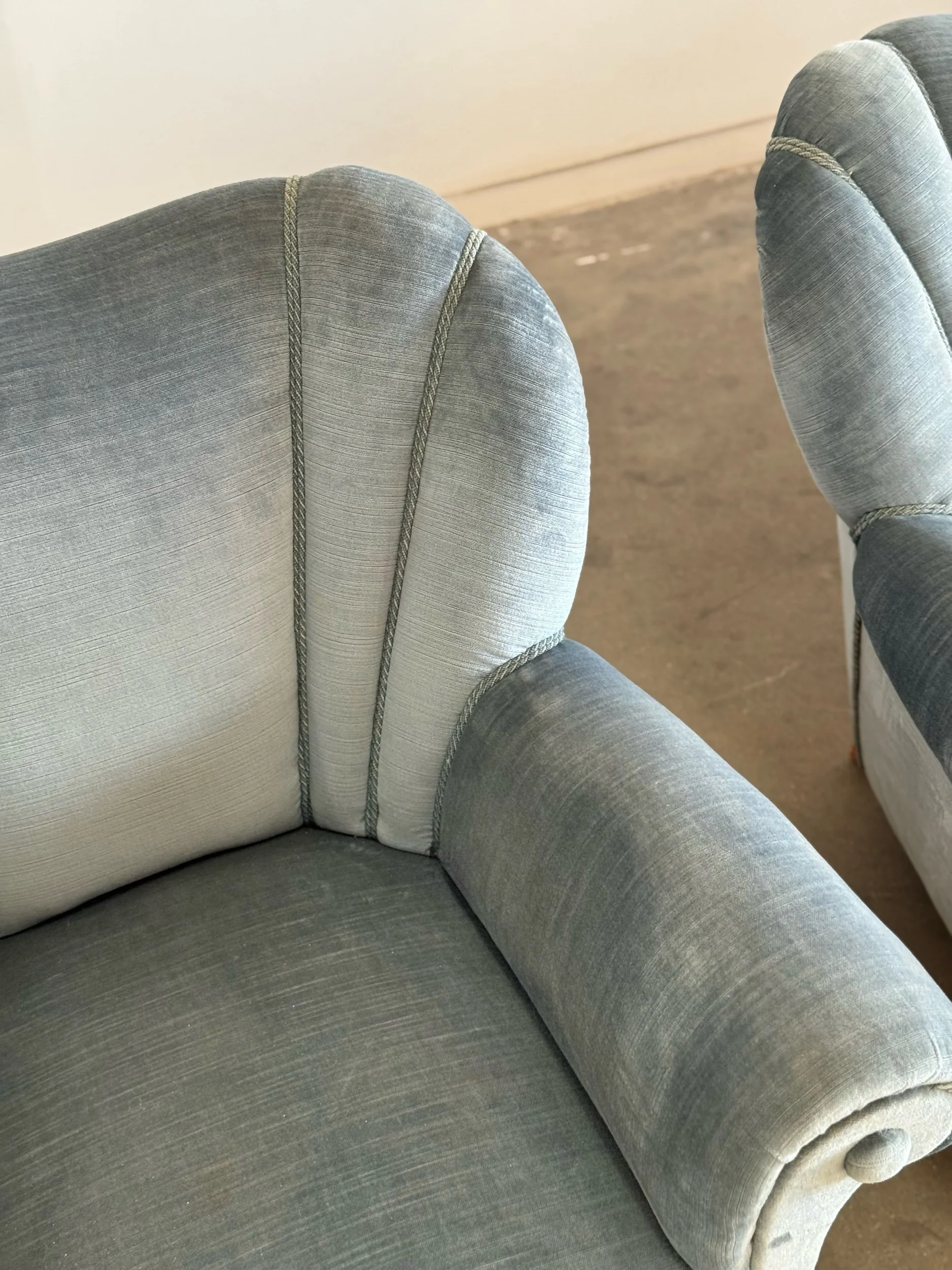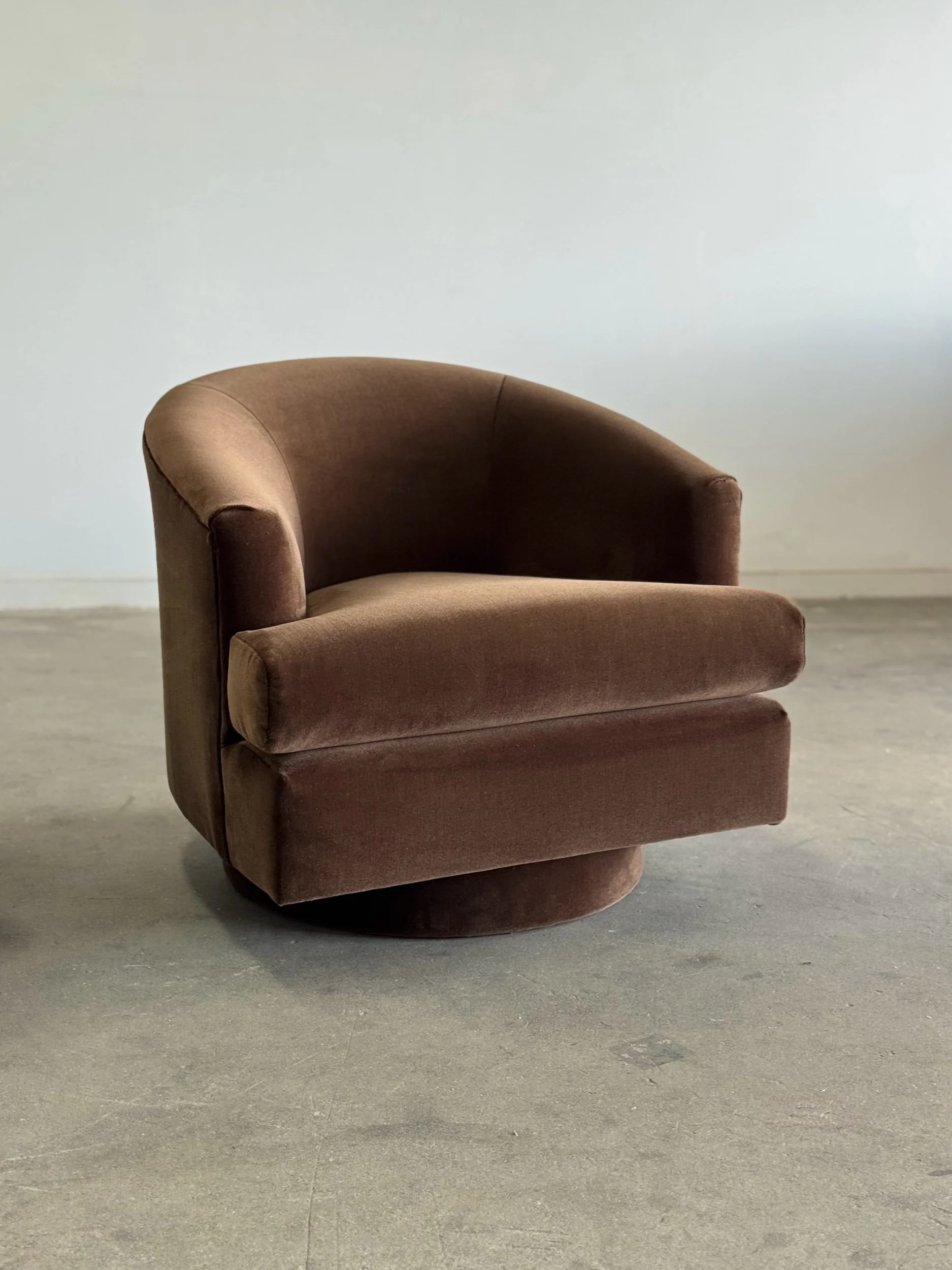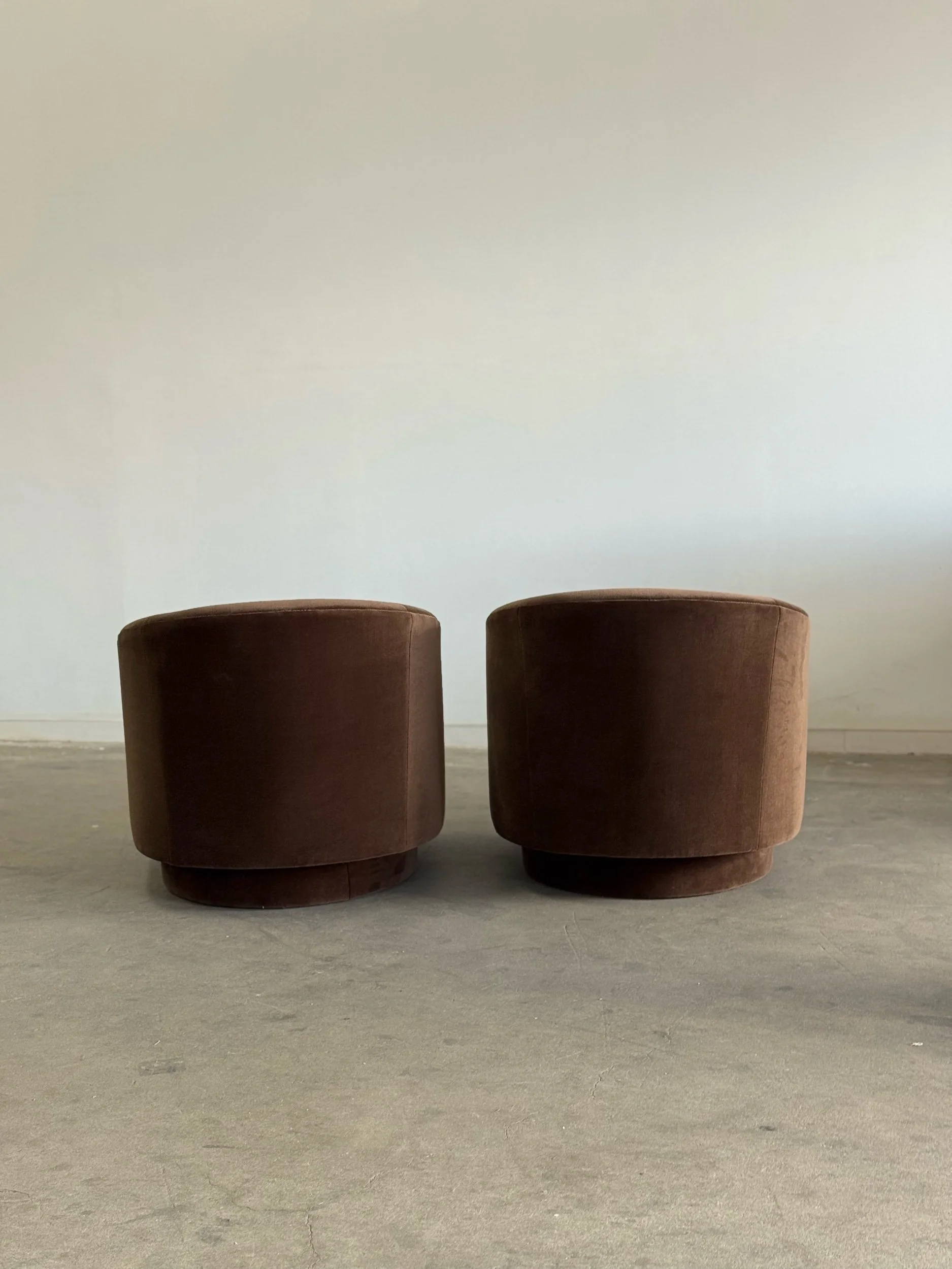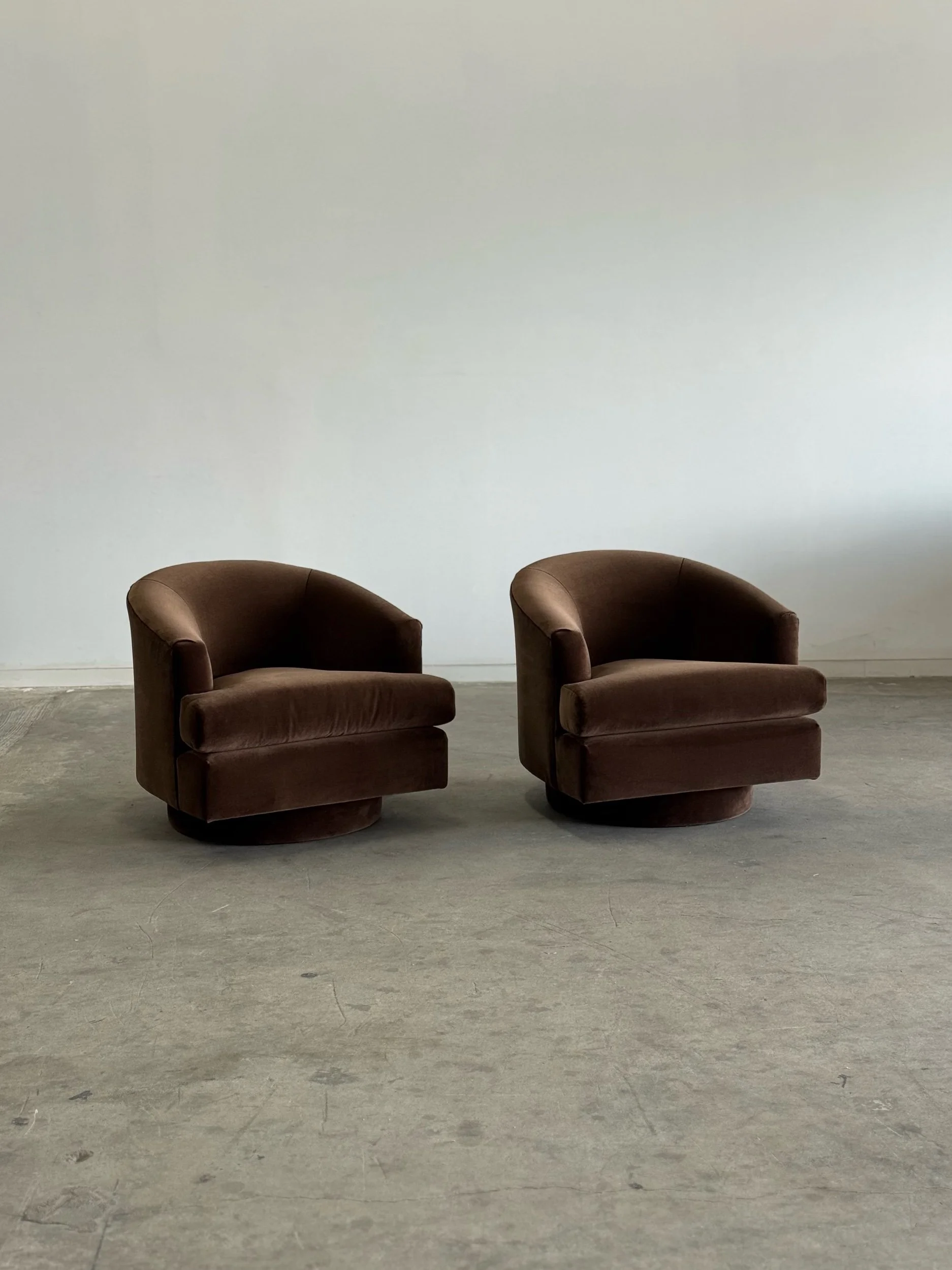 Thoughtfully restored & reupholstered mid-century modern swivel barrel chairs attributed to the style of Milo Baughman. Both chairs are structurally sound with newly added brown velvet fabric.