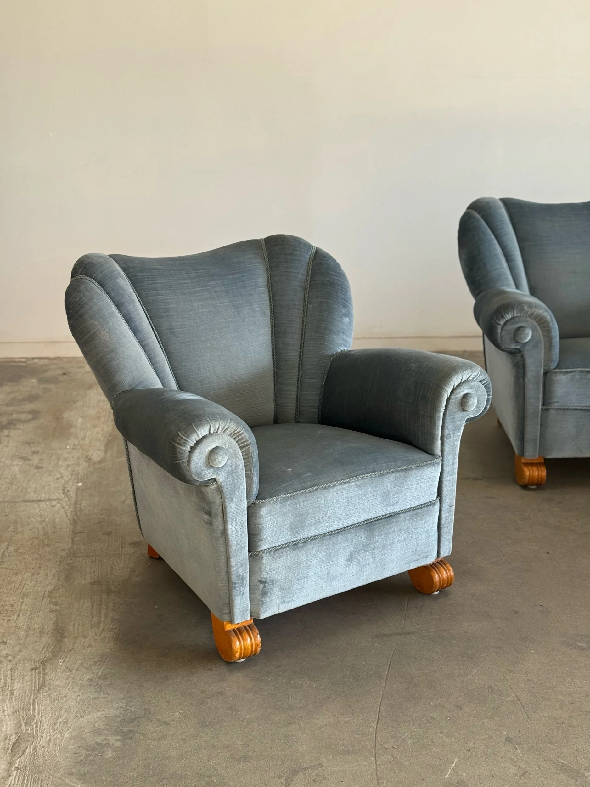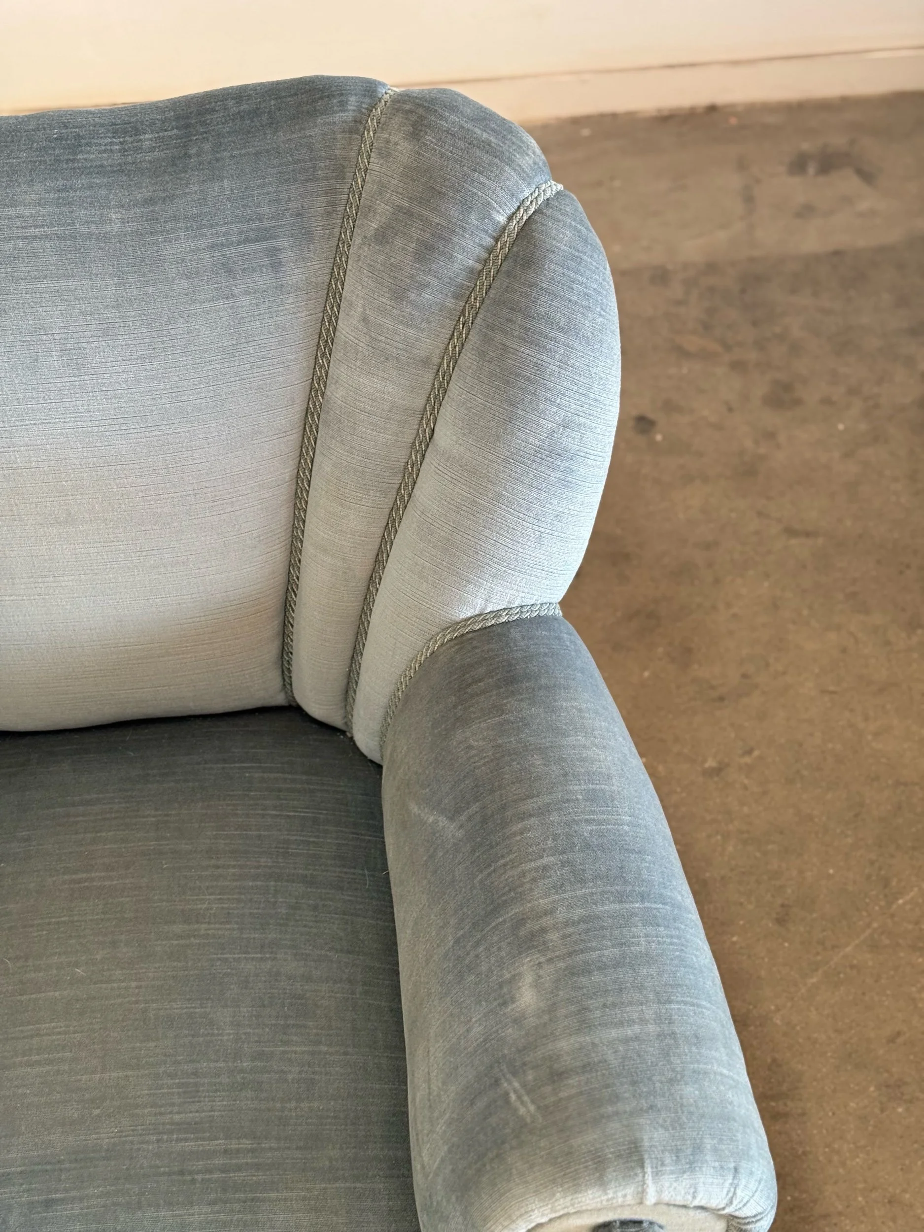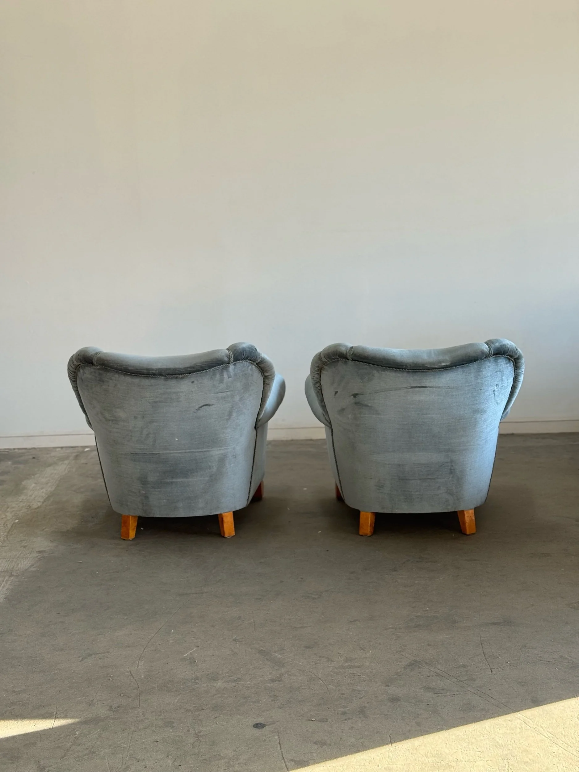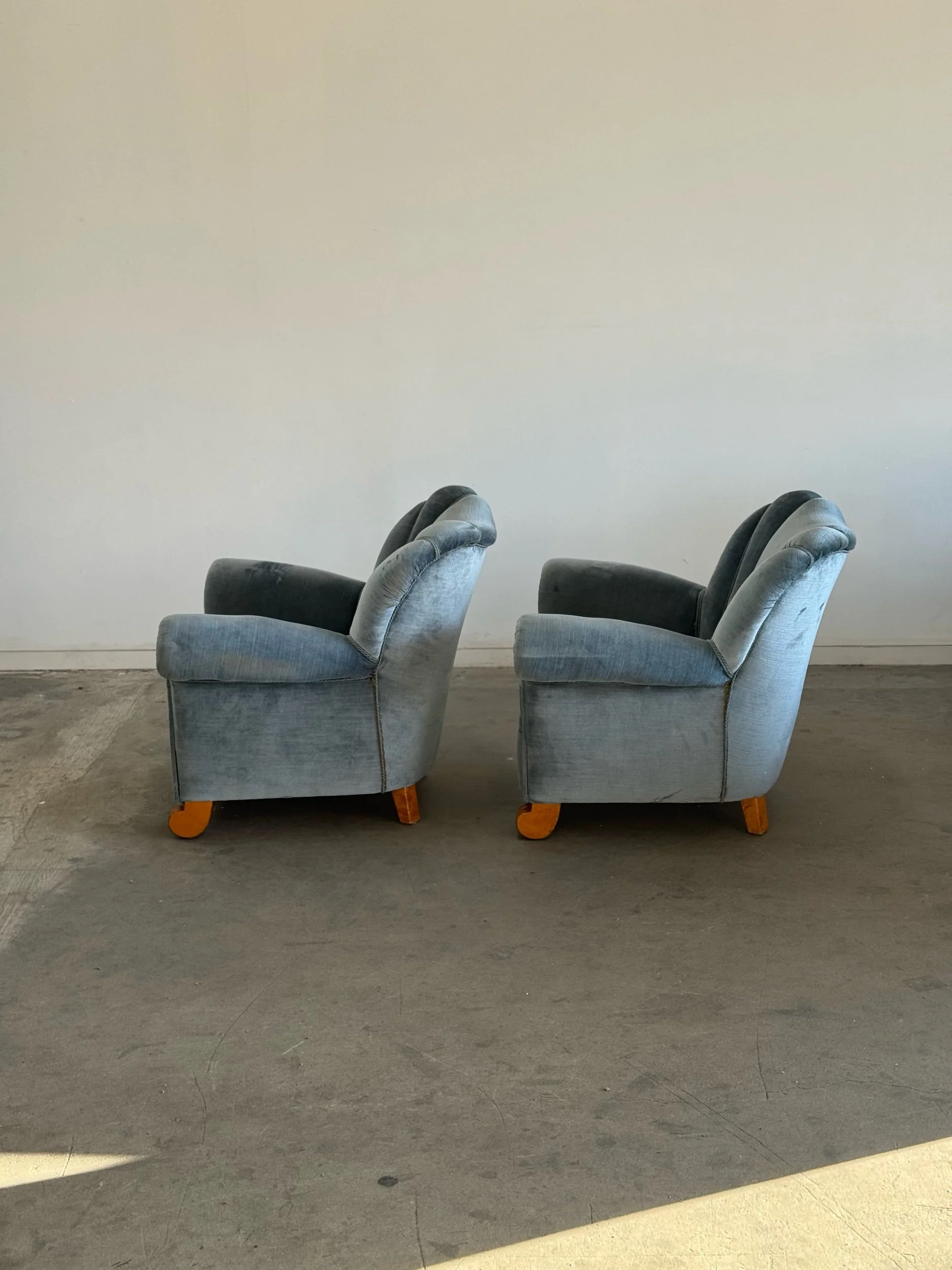 Thoughtfully restored & reupholstered mid-century modern swivel barrel chairs attributed to the style of Milo Baughman. Both chairs are structurally sound with newly added brown velvet fabric.
