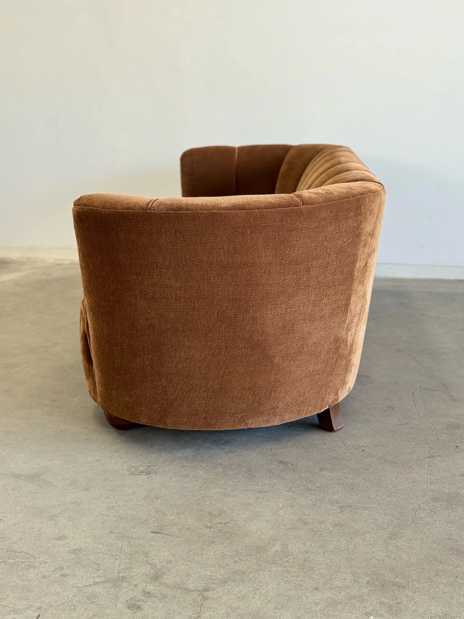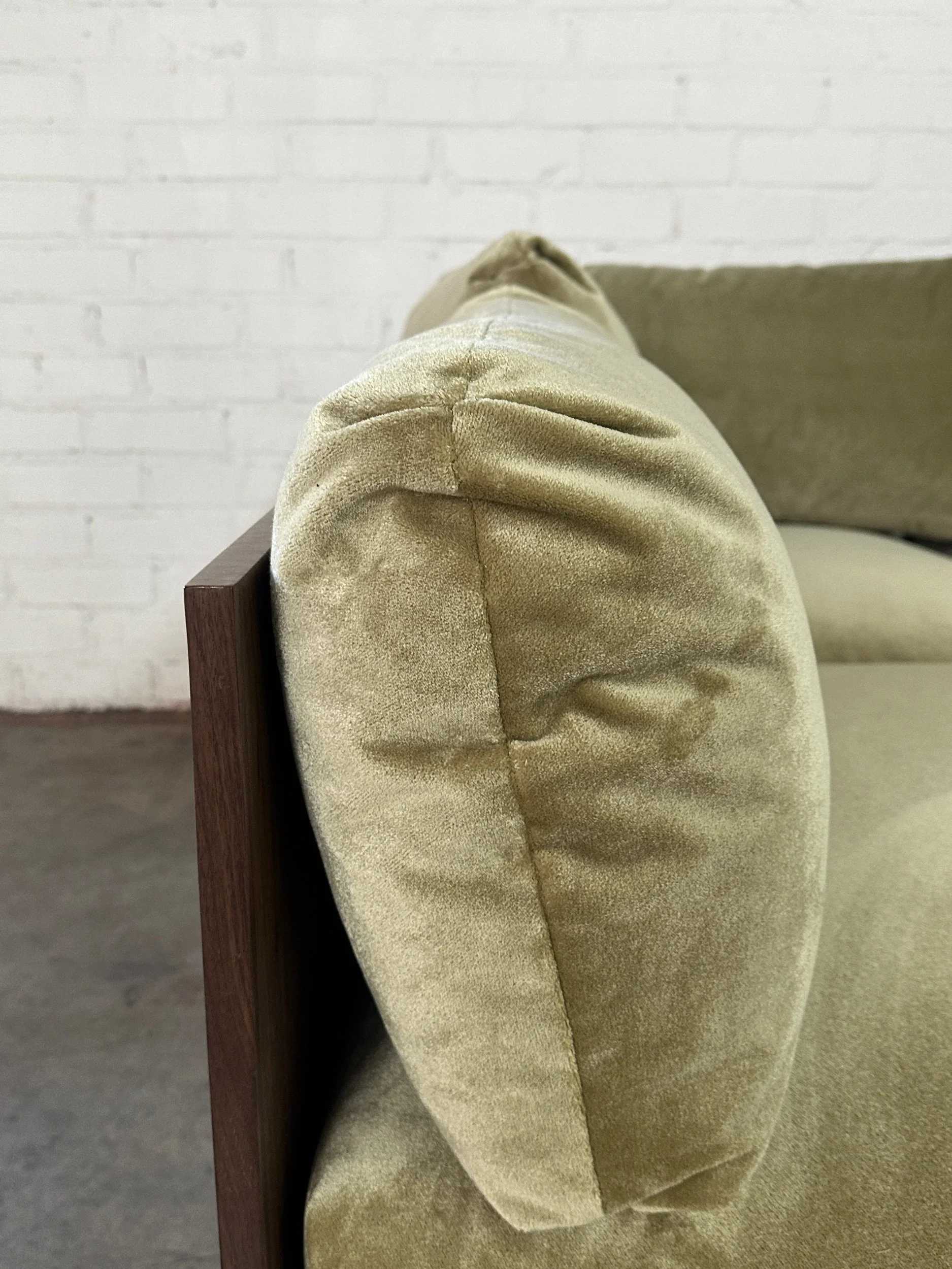 Handcrafted in house, The Cantabria modular features interchangeable walnut pieces crafted in solid walnut wood. Each piece features a walnut wooden plinth base that extends upwards on one side to provide back support. Our Cantabria Modular pieces each feature loose seat and back pillows filled with vegan feathers & foam mix for optimal support and comfort. Upholstered in a high pile velvet in an iridescent artichoke green.