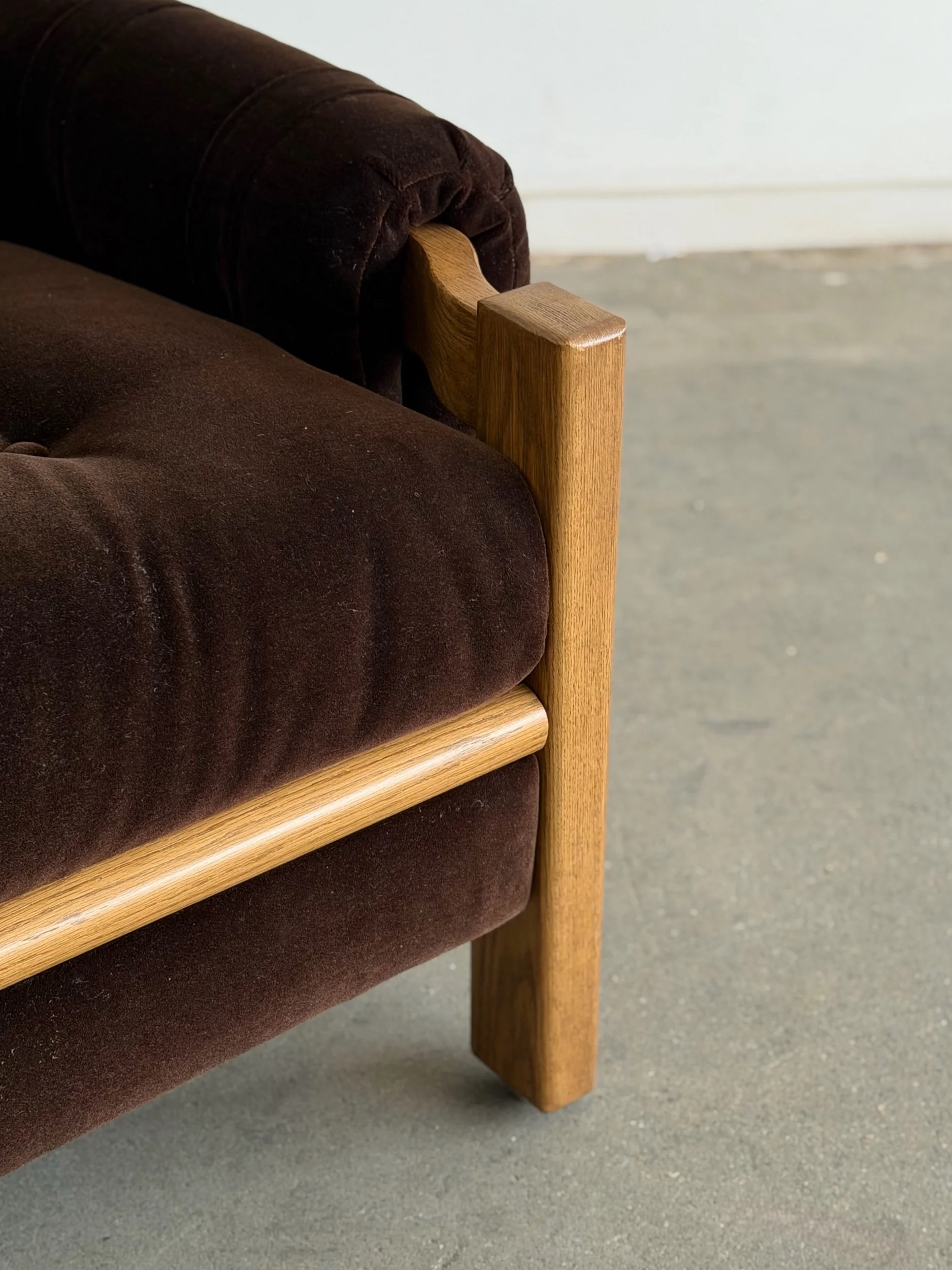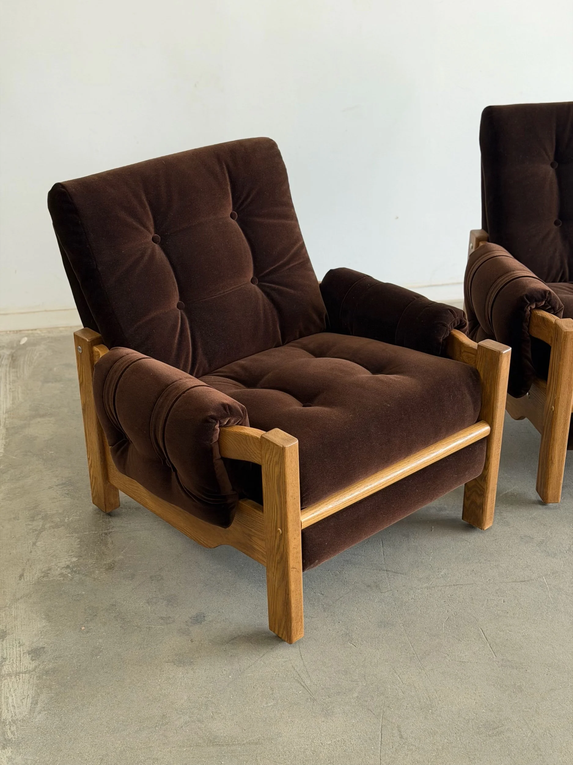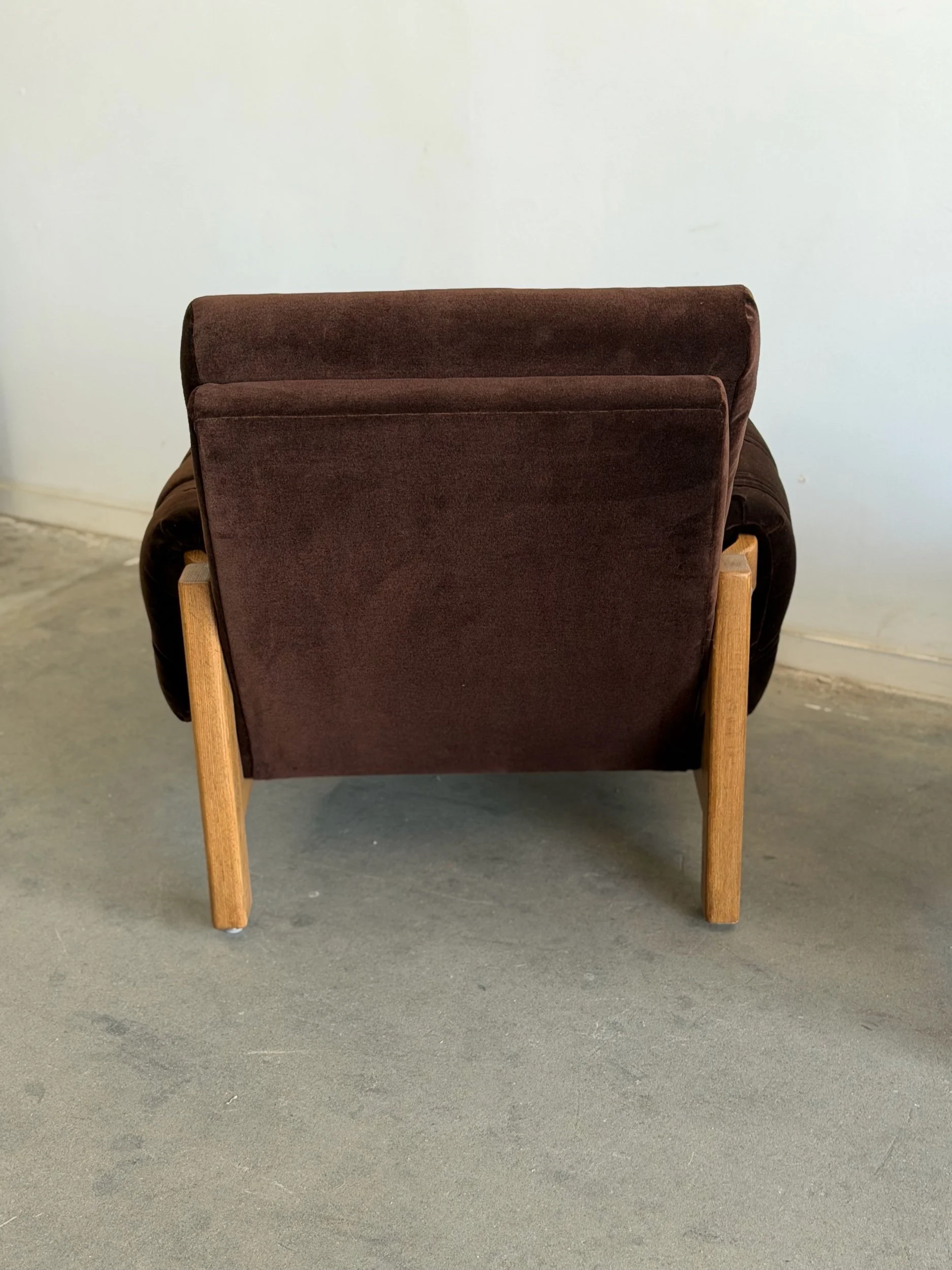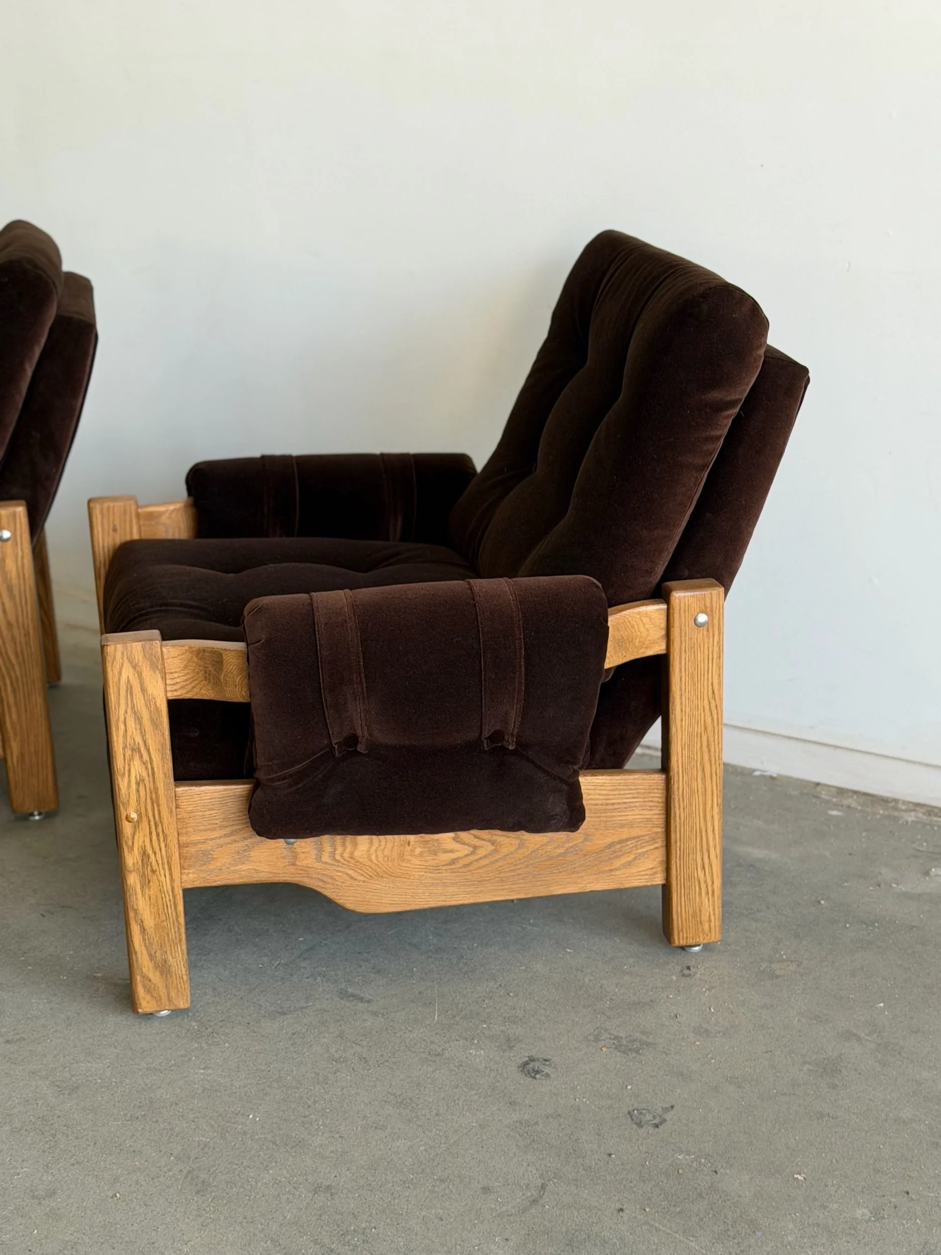 Our take on Safari Lounge Chairs . Units feature solid interior framing in Alder, solid oak arms, and dark brown performance velvet fabric .