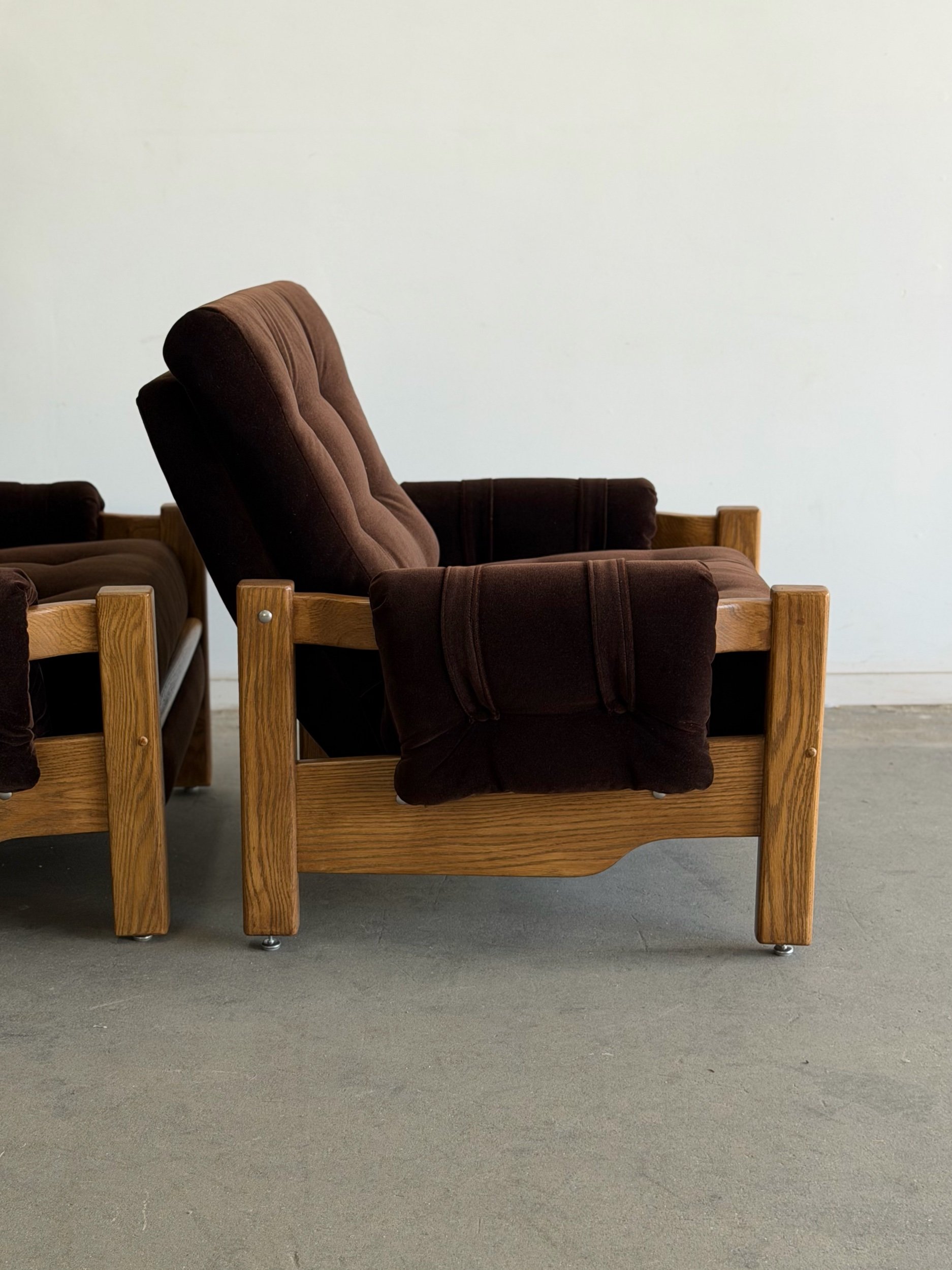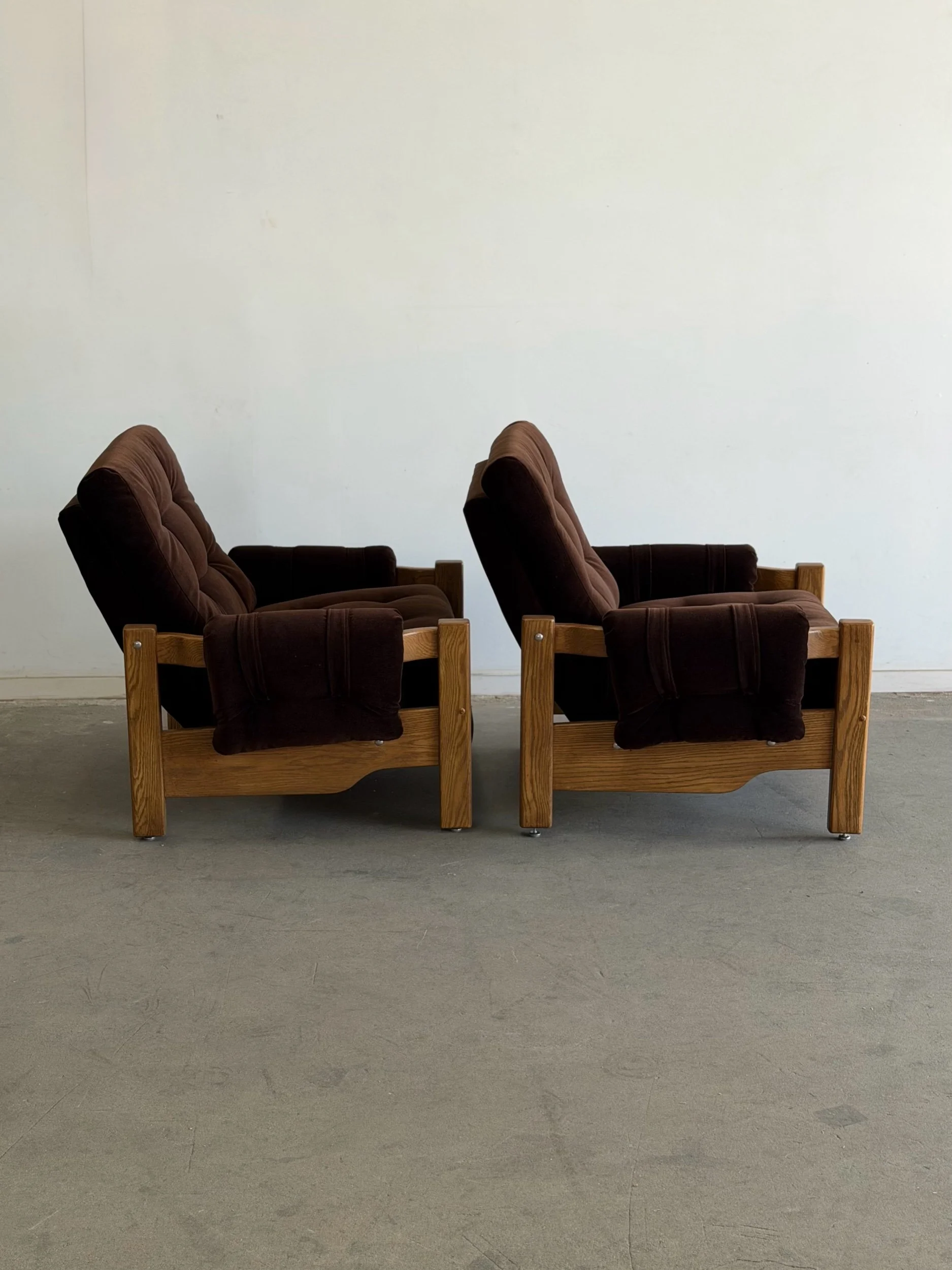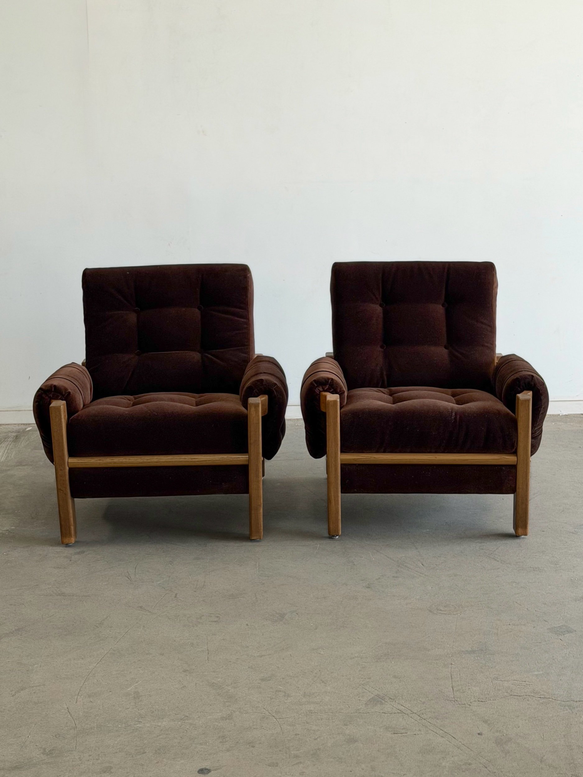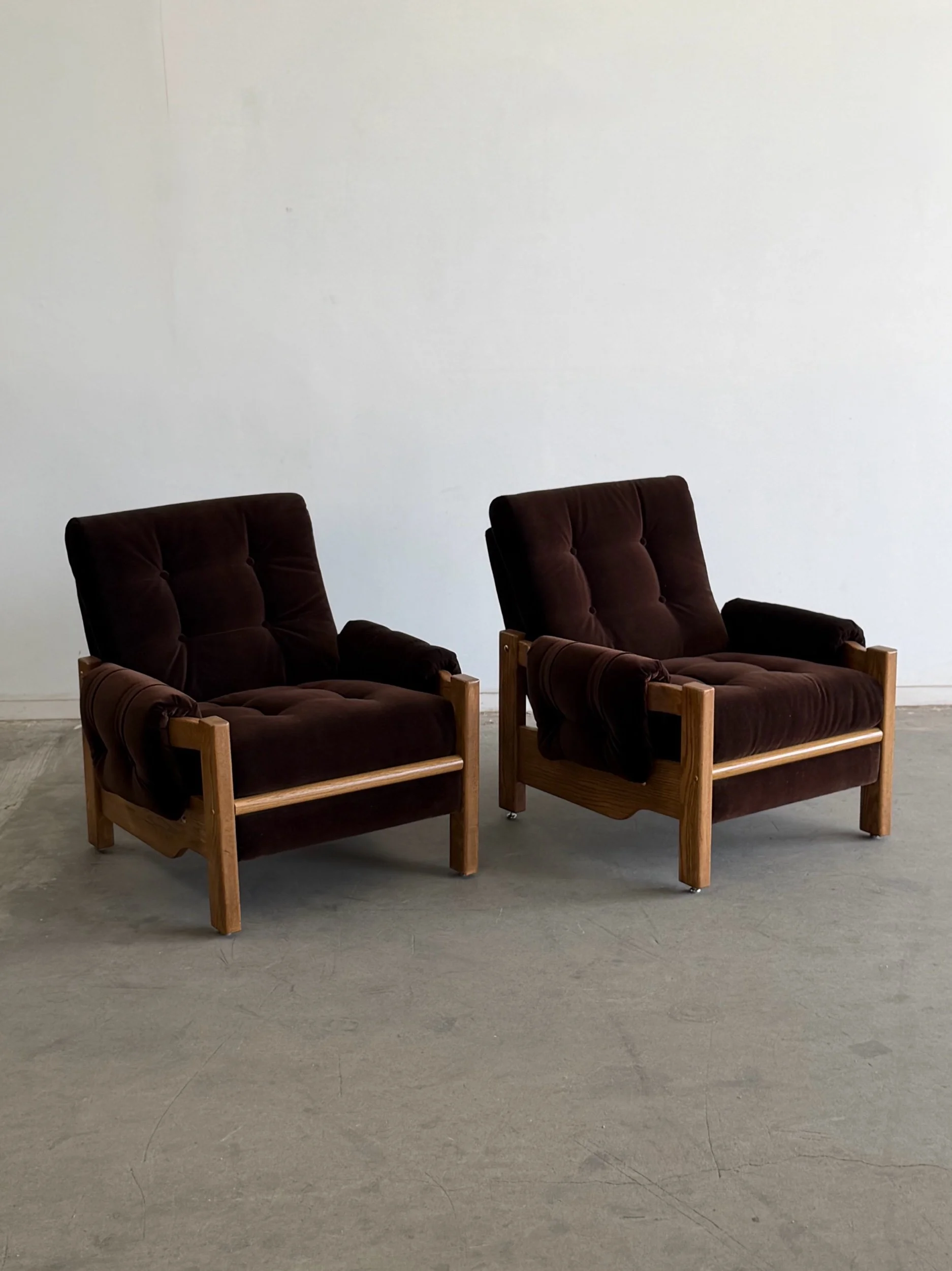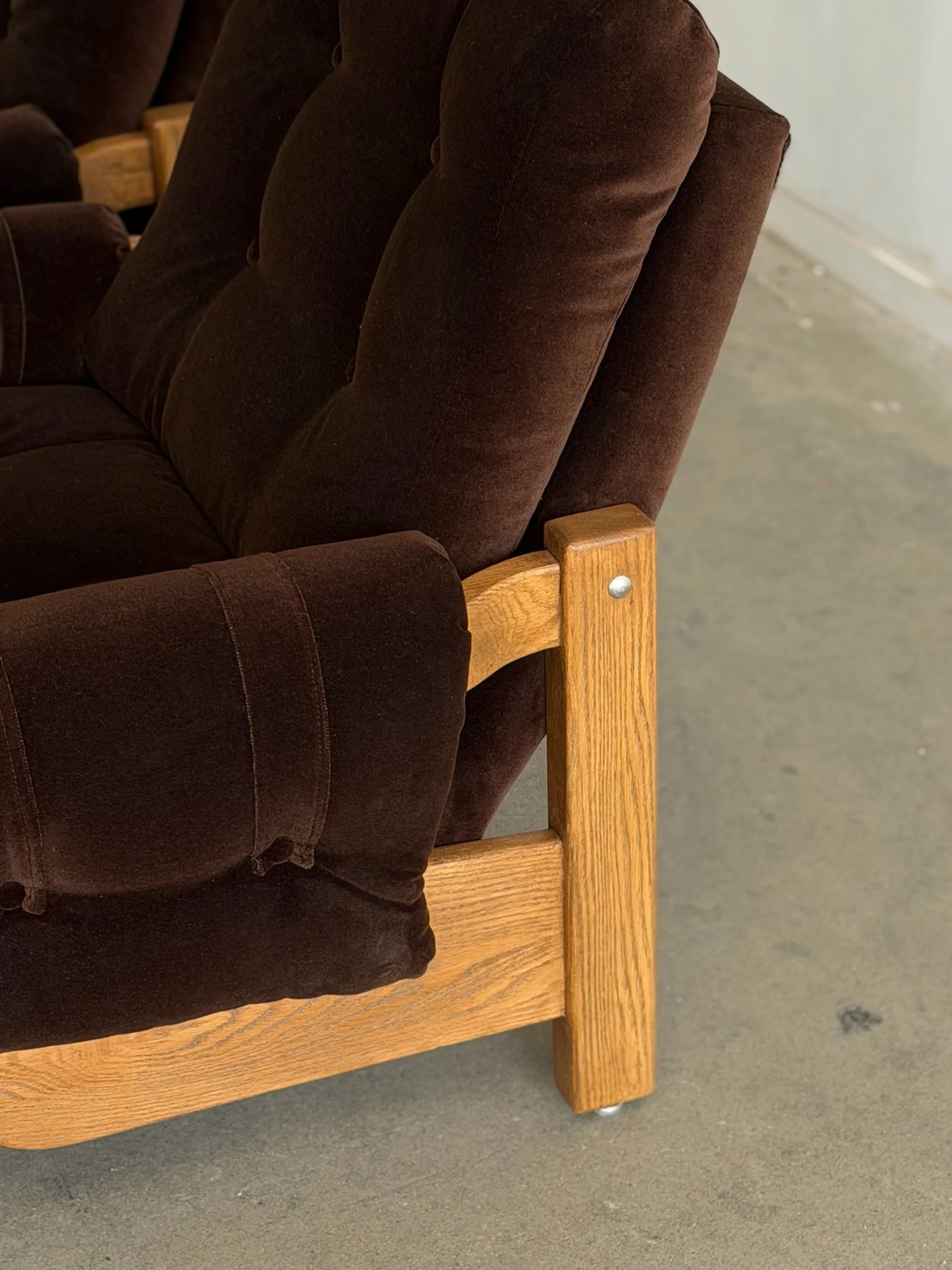Our take on Safari Lounge Chairs . Units feature solid interior framing in Alder, solid oak arms, and dark brown performance velvet fabric .