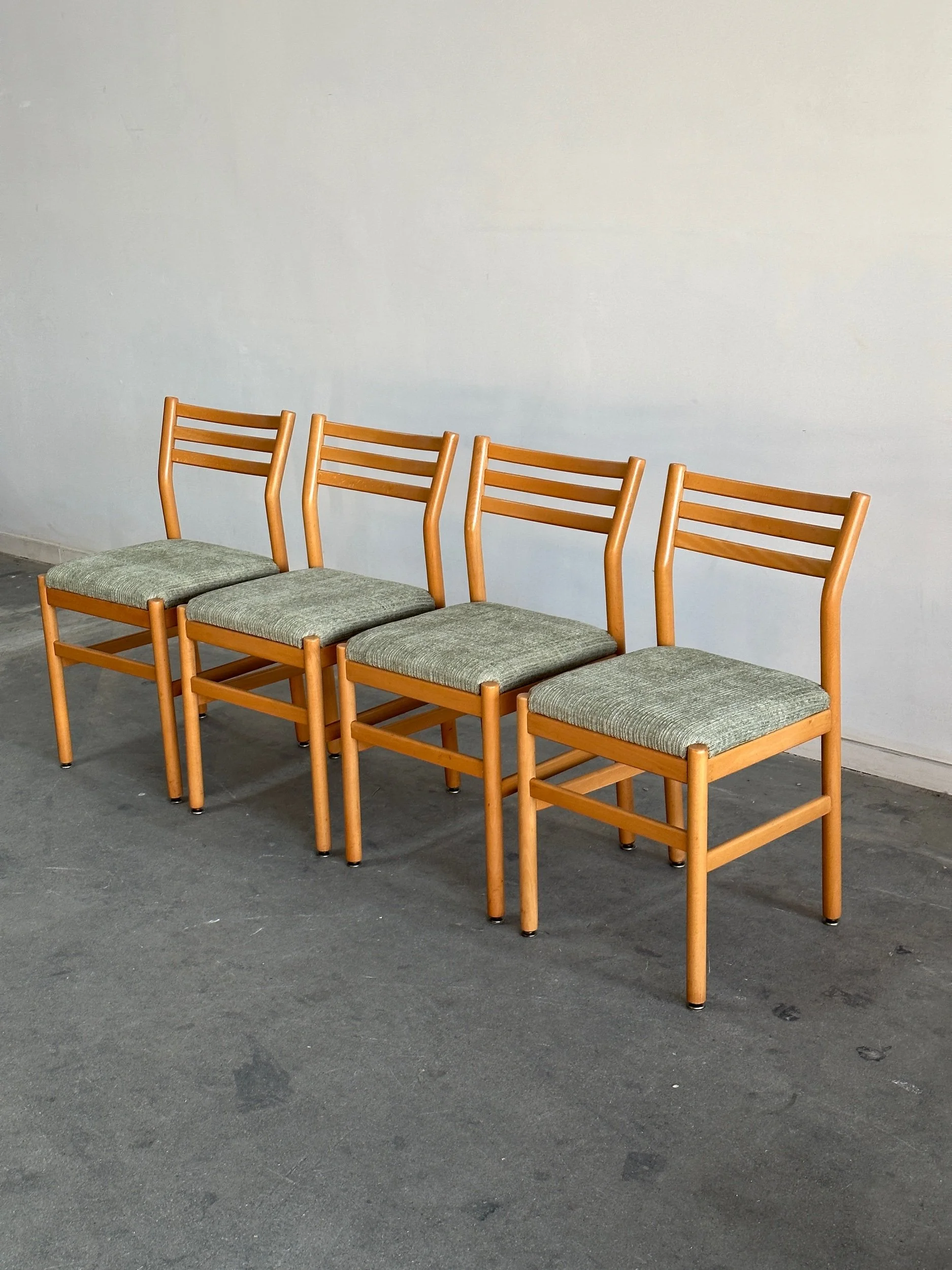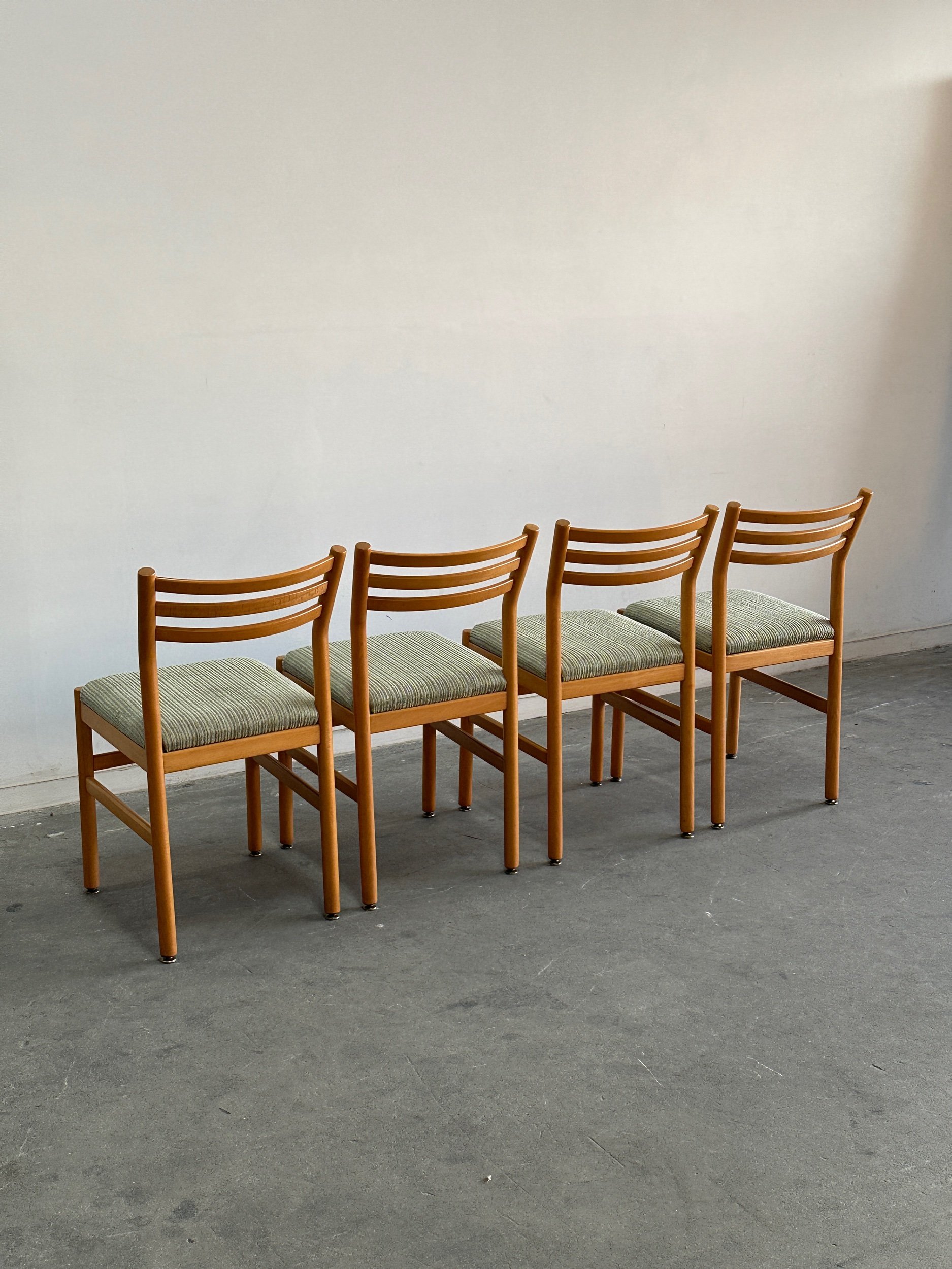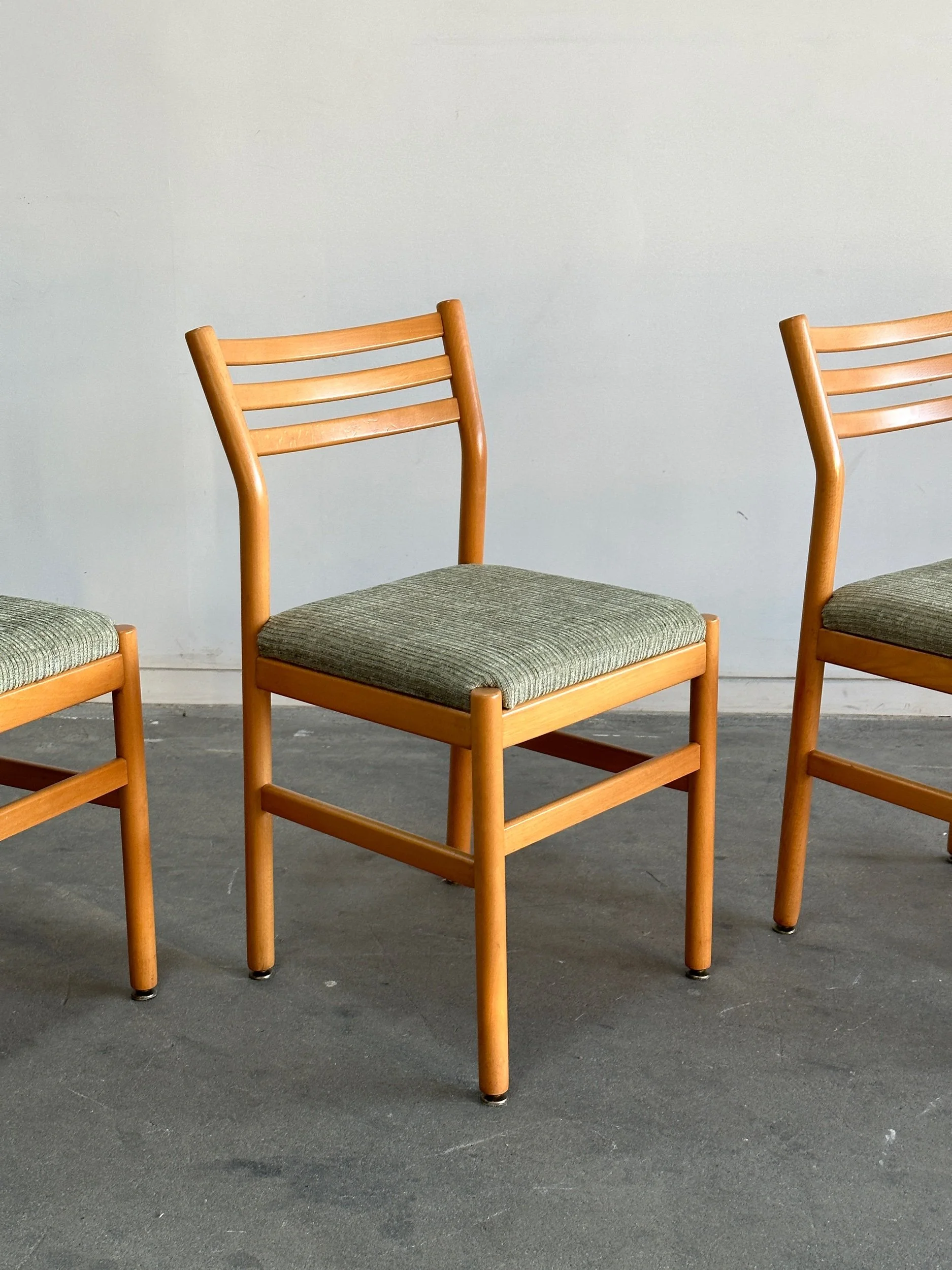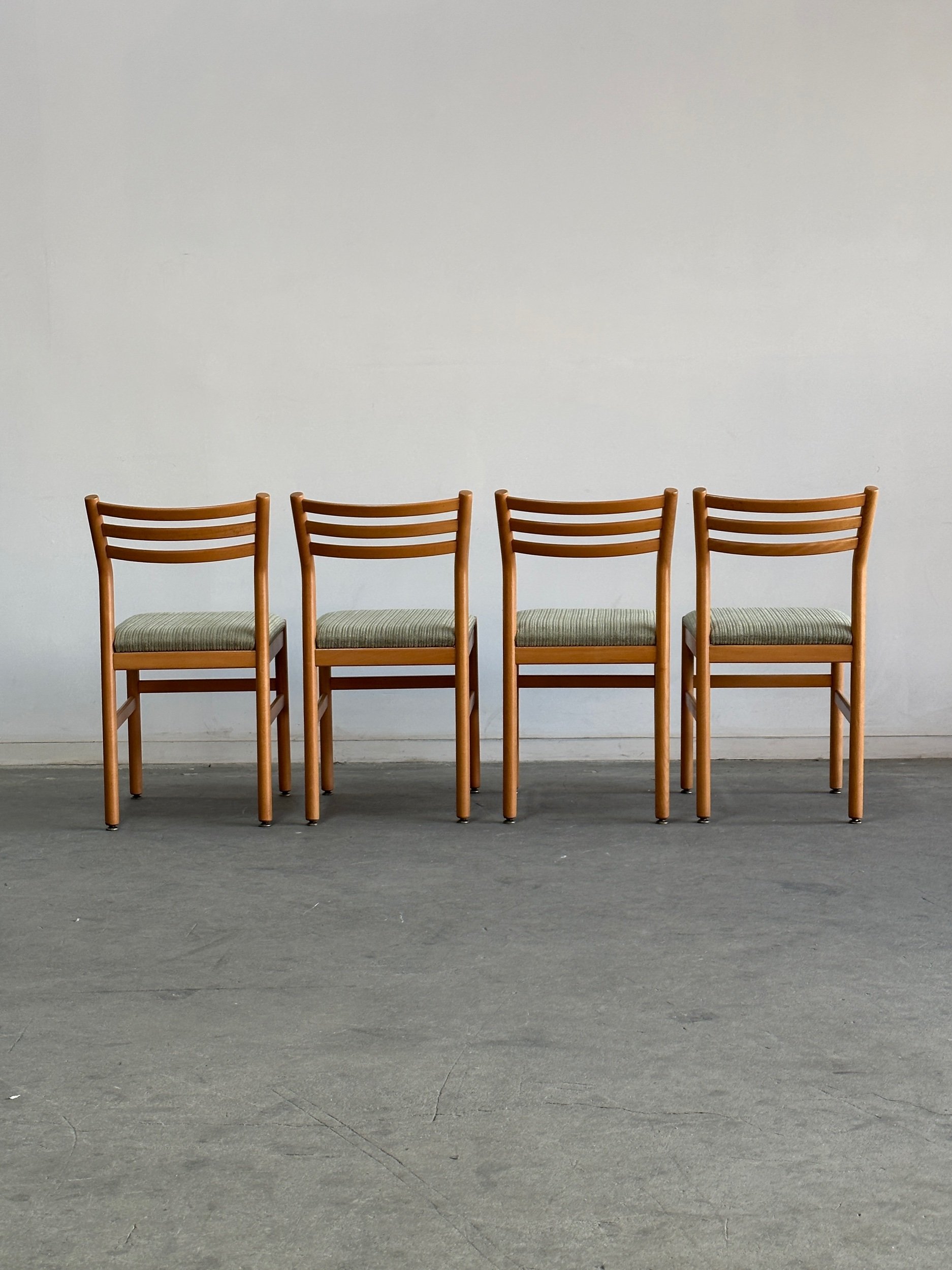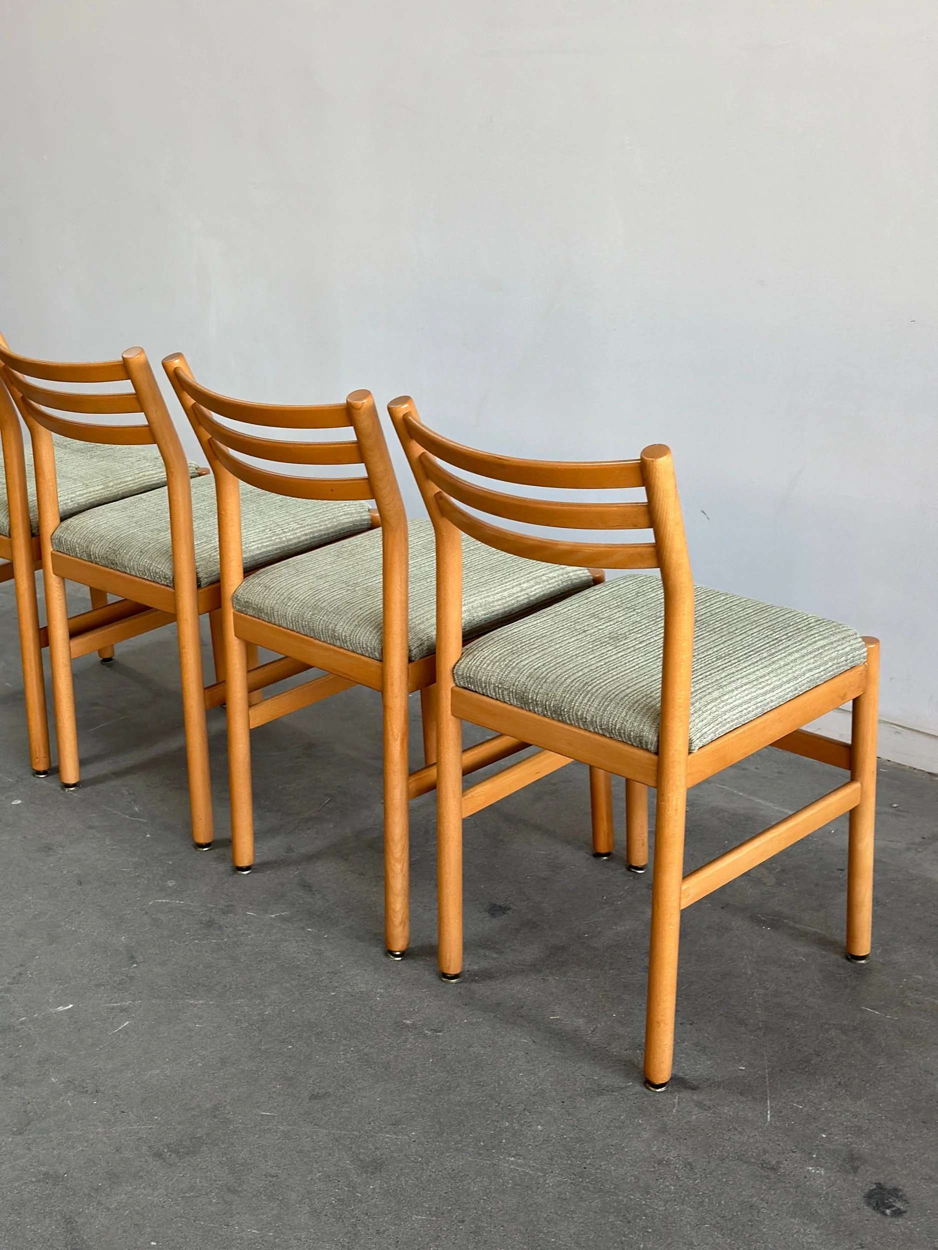 Swedish dining chairs circa 1980s. This set has been structurally restored and each unit features fresh straps, new foam and new textured fabric. Price is for the set of four.