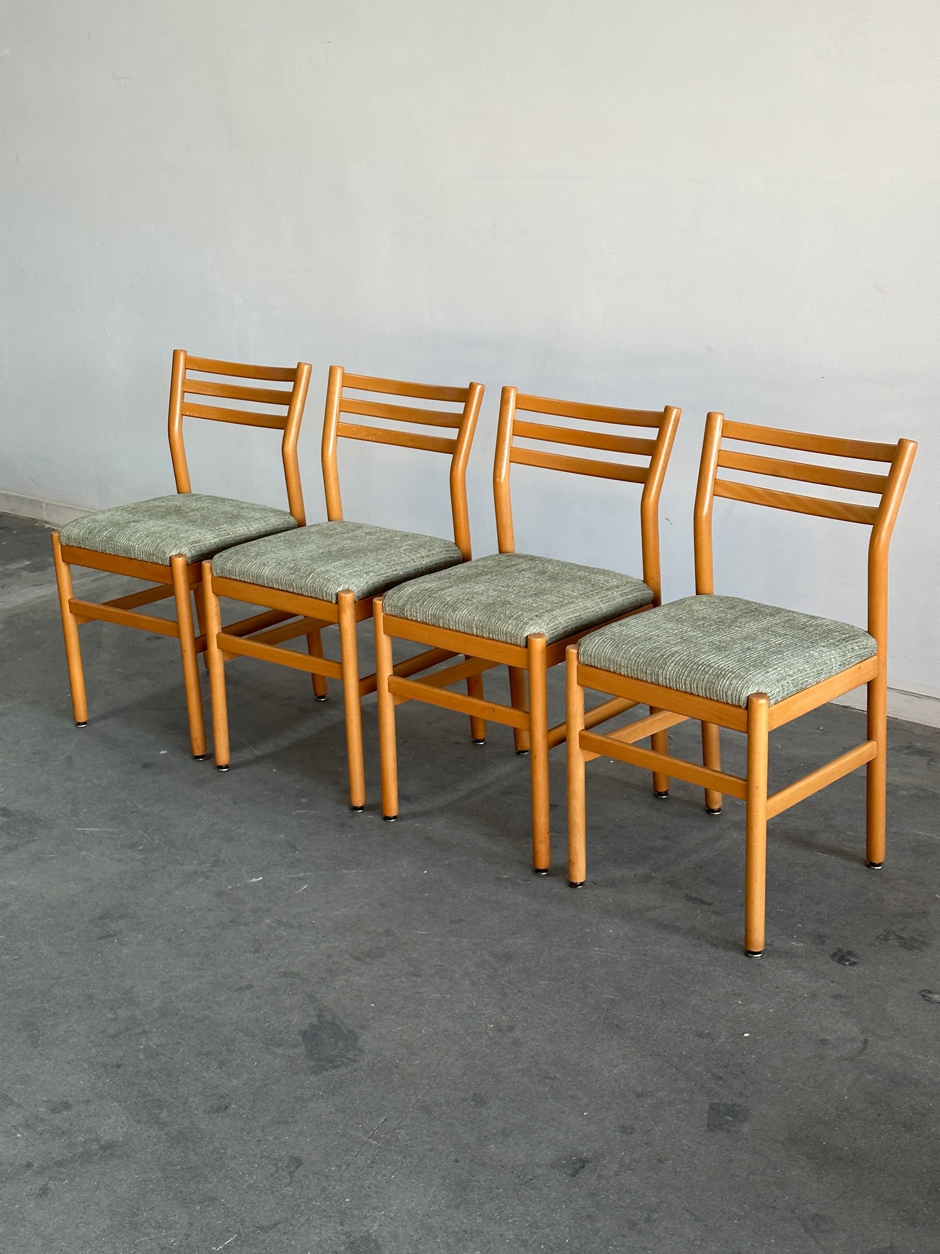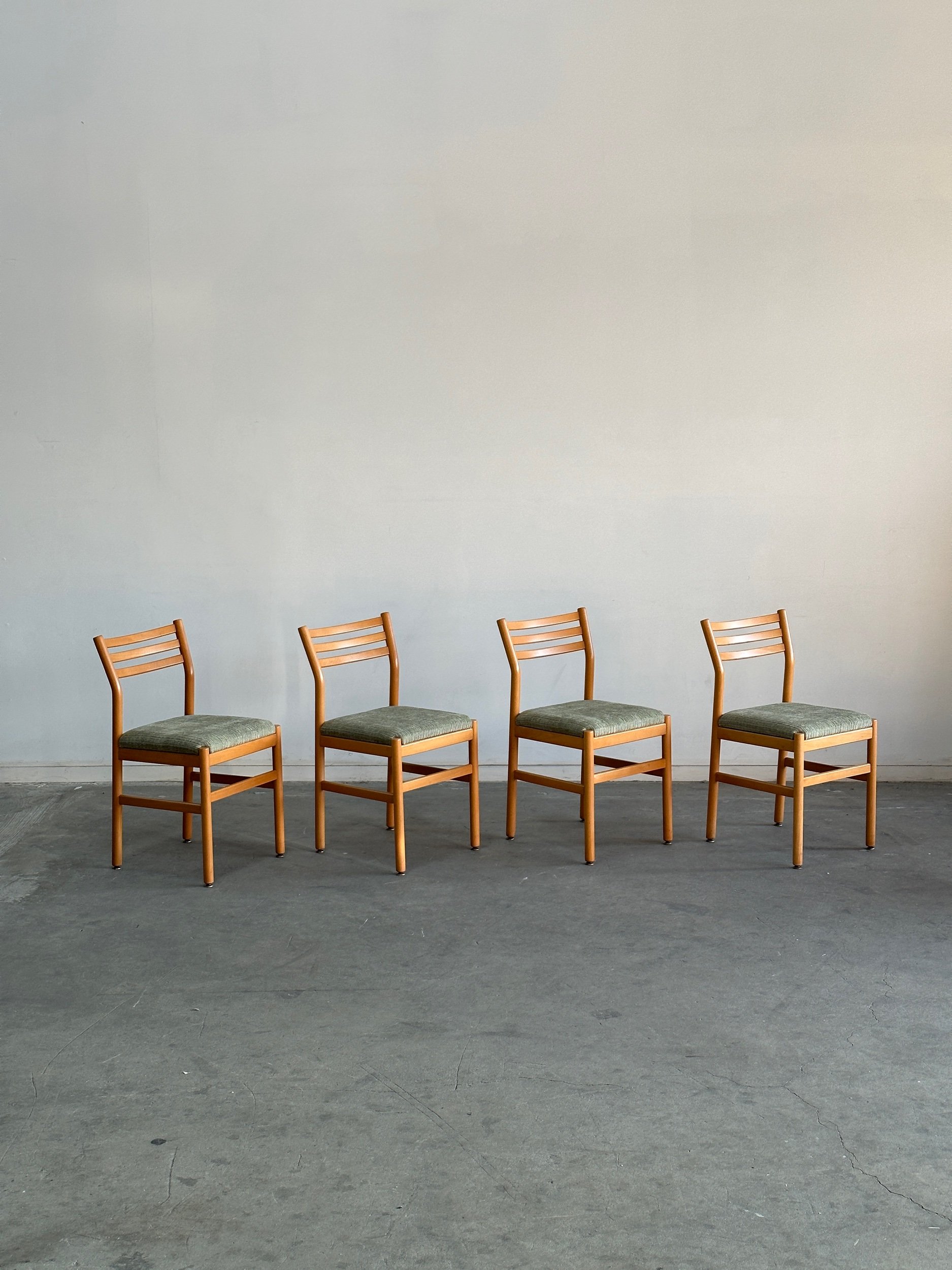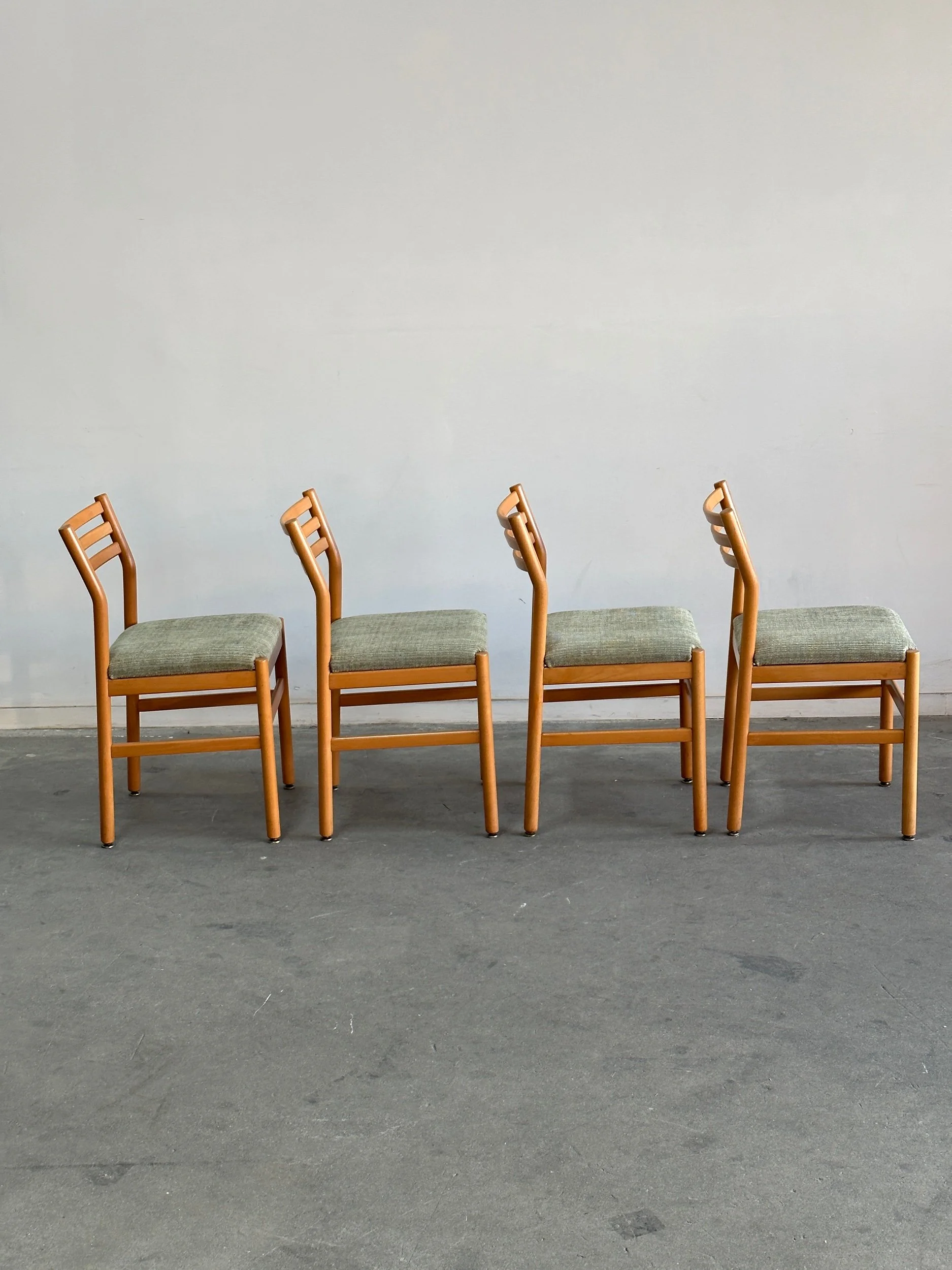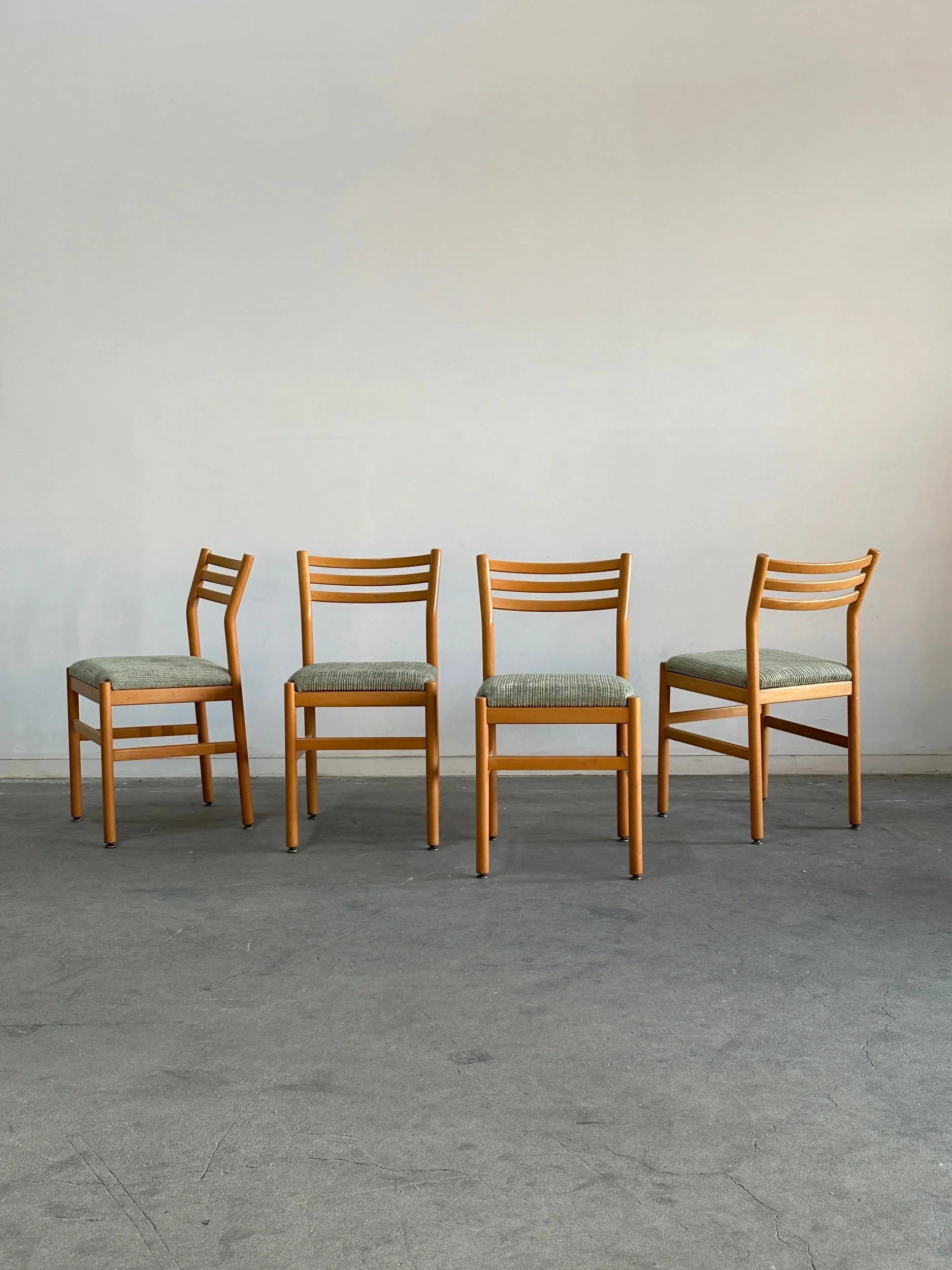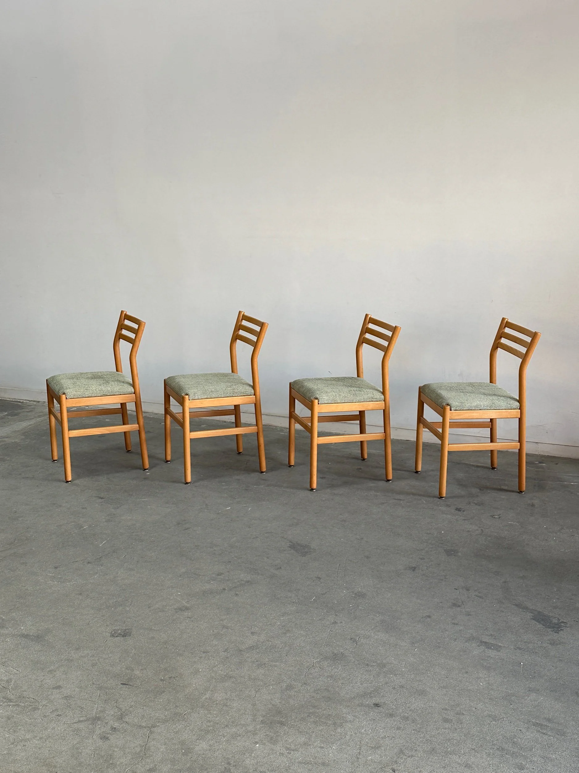 Swedish dining chairs circa 1980s. This set has been structurally restored and each unit features fresh straps, new foam and new textured fabric. Price is for the set of four.