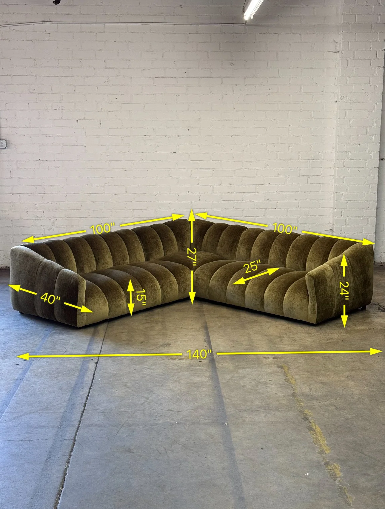 Our handcrafted channel tufted sectional sofa made from scratch in house. Each unit is modular but can be attached with undermounted connecters that have been installed. Item features both feather and foam for optimal comfort. Upholstered in a green textured high pile chenille.