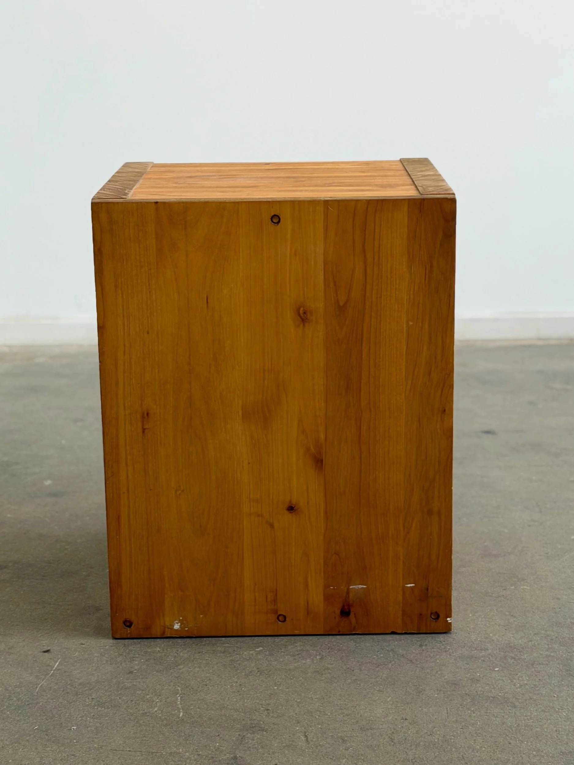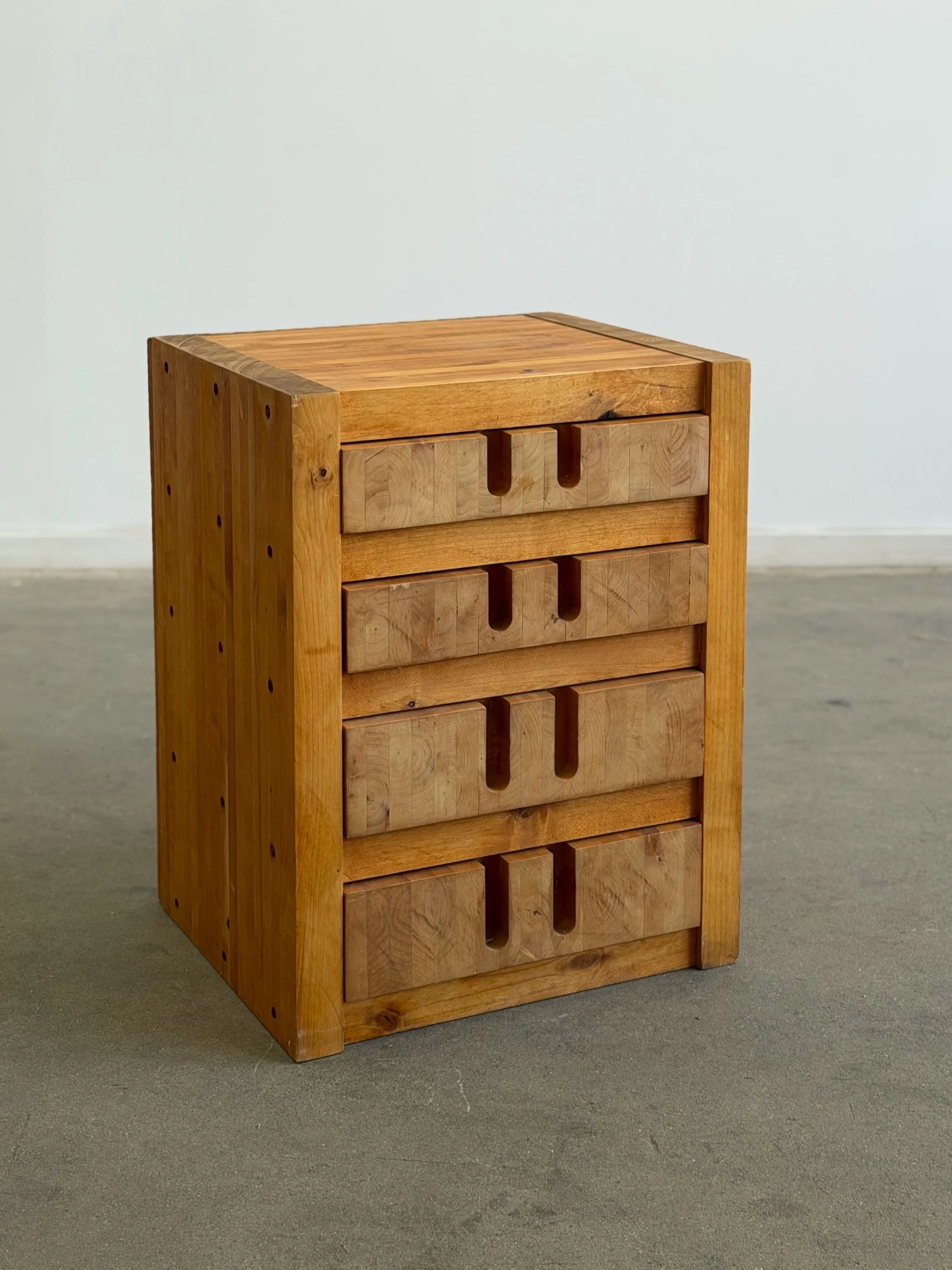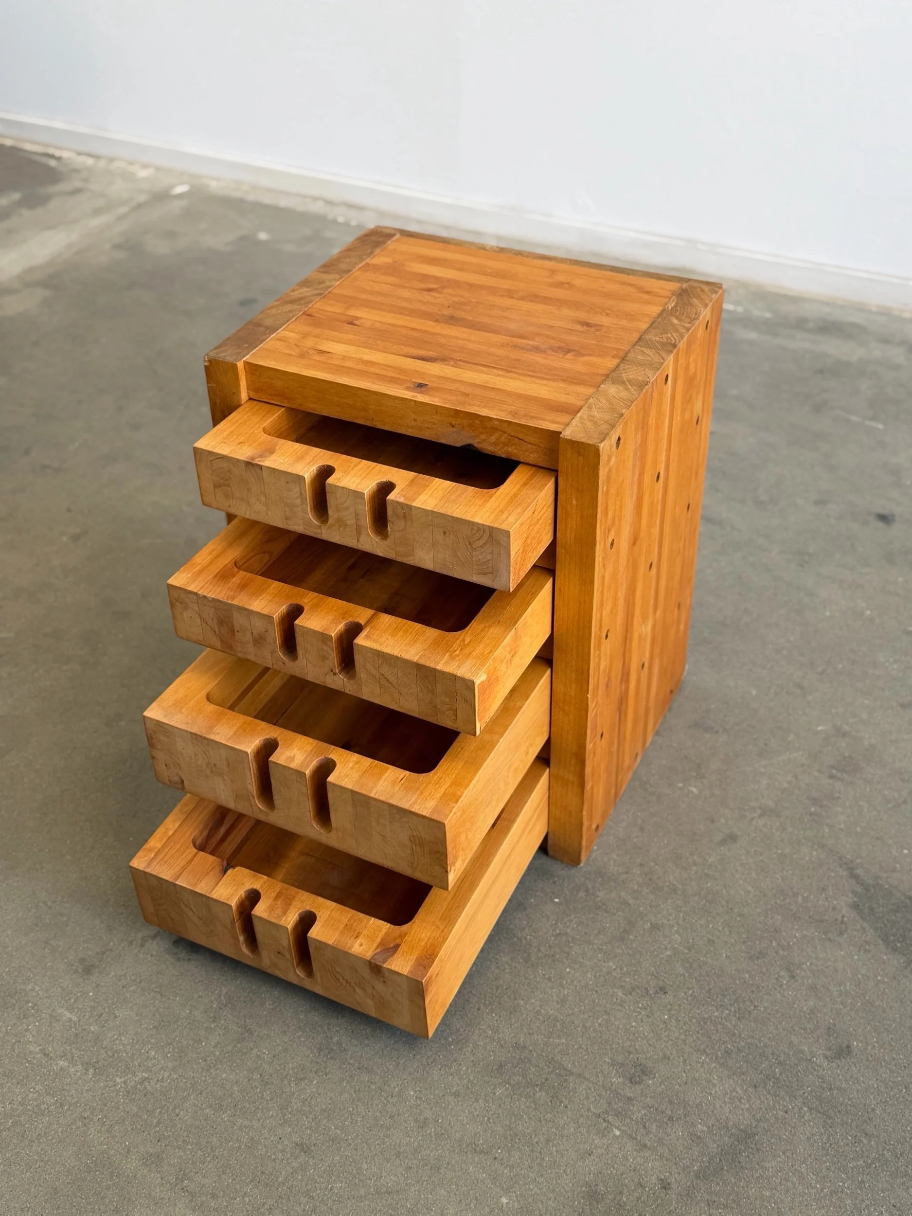 Designed with a distinct "nested" aesthetic, the unit features four tiered drawers, each finished with integrated finger-pull handles for a seamless, handle-free look. Whether used as a sophisticated bedside table, a desktop organizer, or a statement side piece, its warm texture and robust construction bring a grounded, earthy energy to any interior.