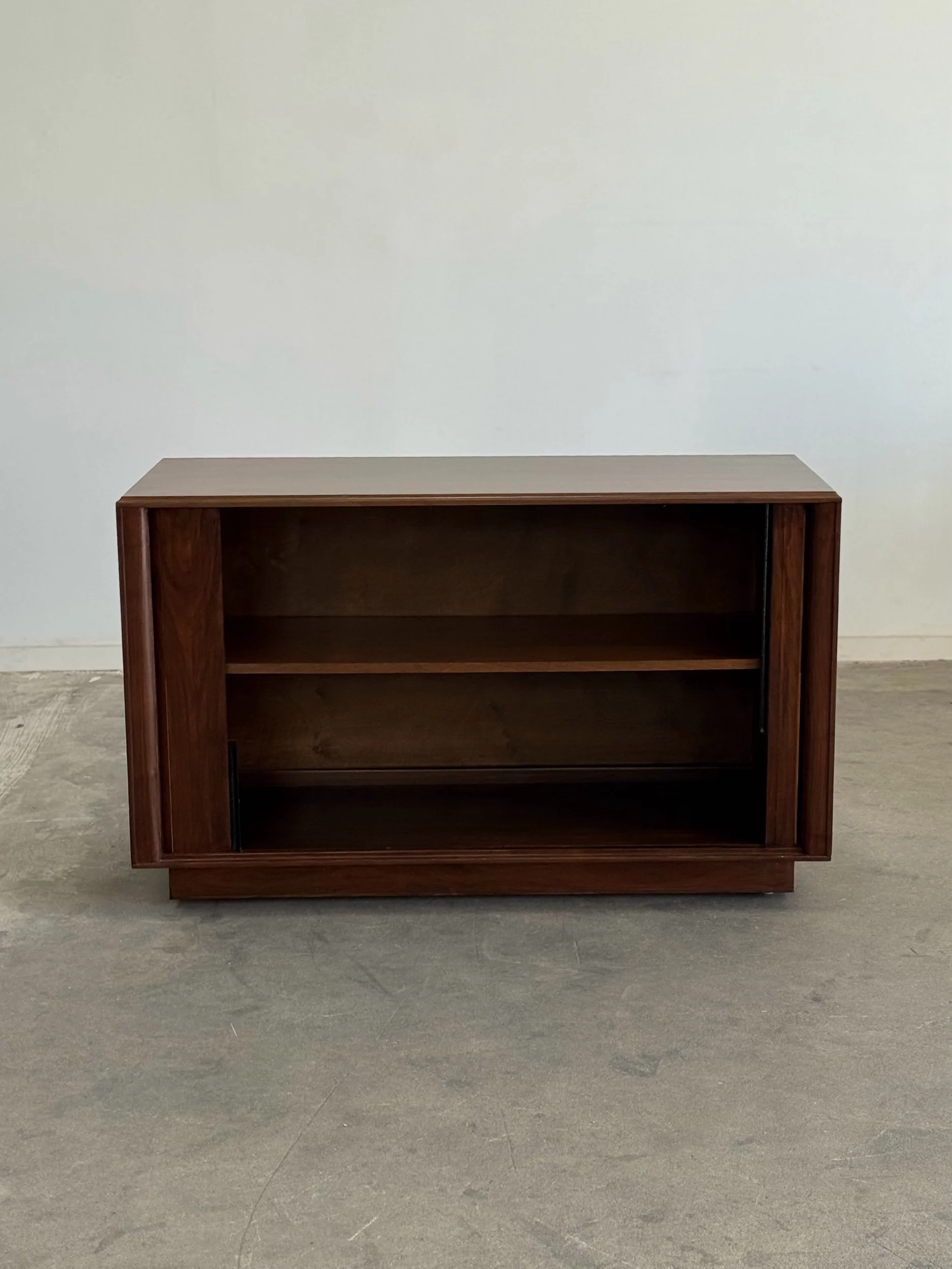 Milo Baughman Walnut Tambour Door Credenza for Glenn of California circa 1960s. Item has been fully restored and shows well with no major areas of wear. Credenza features original hardware, and removable shelving.