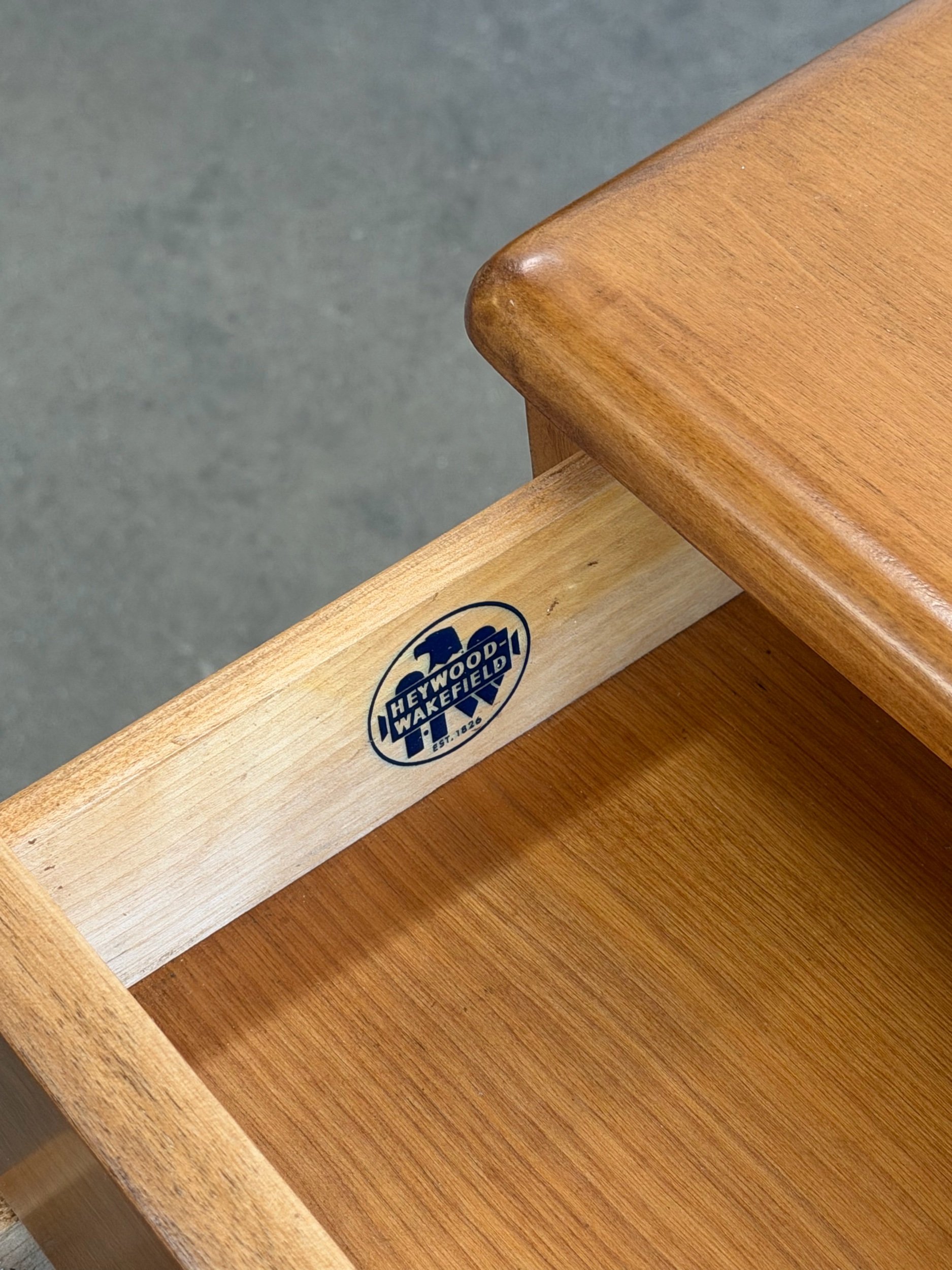This mid century Heywood desk stands the test of time through its sturdy constriction. Made from solid birch, this restored piece in golden tones features three drawers of various sizes and two side shelves for storage.