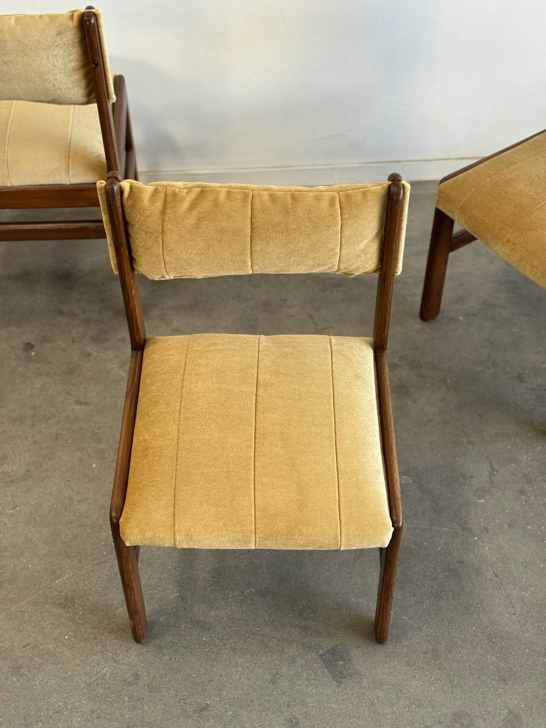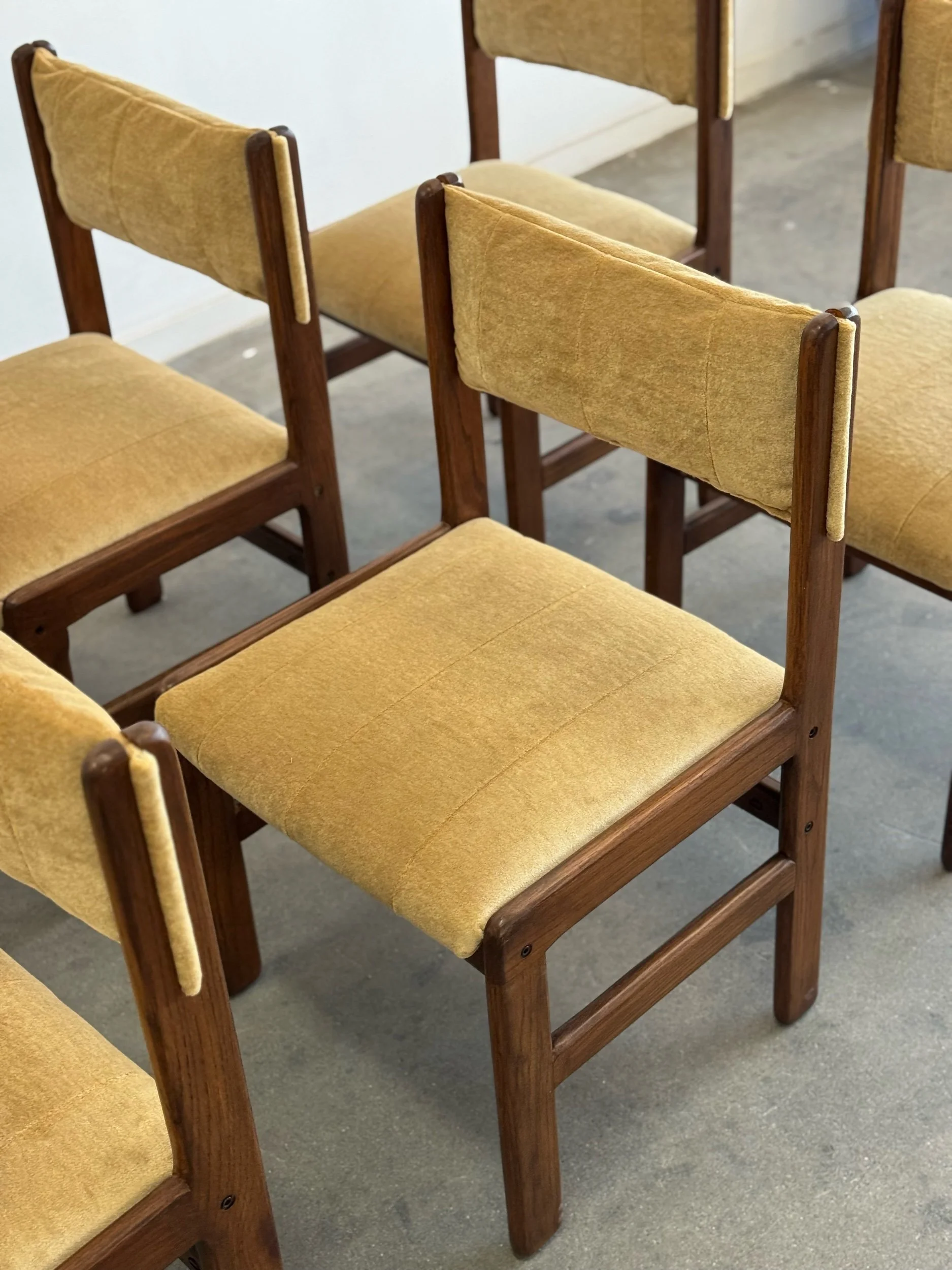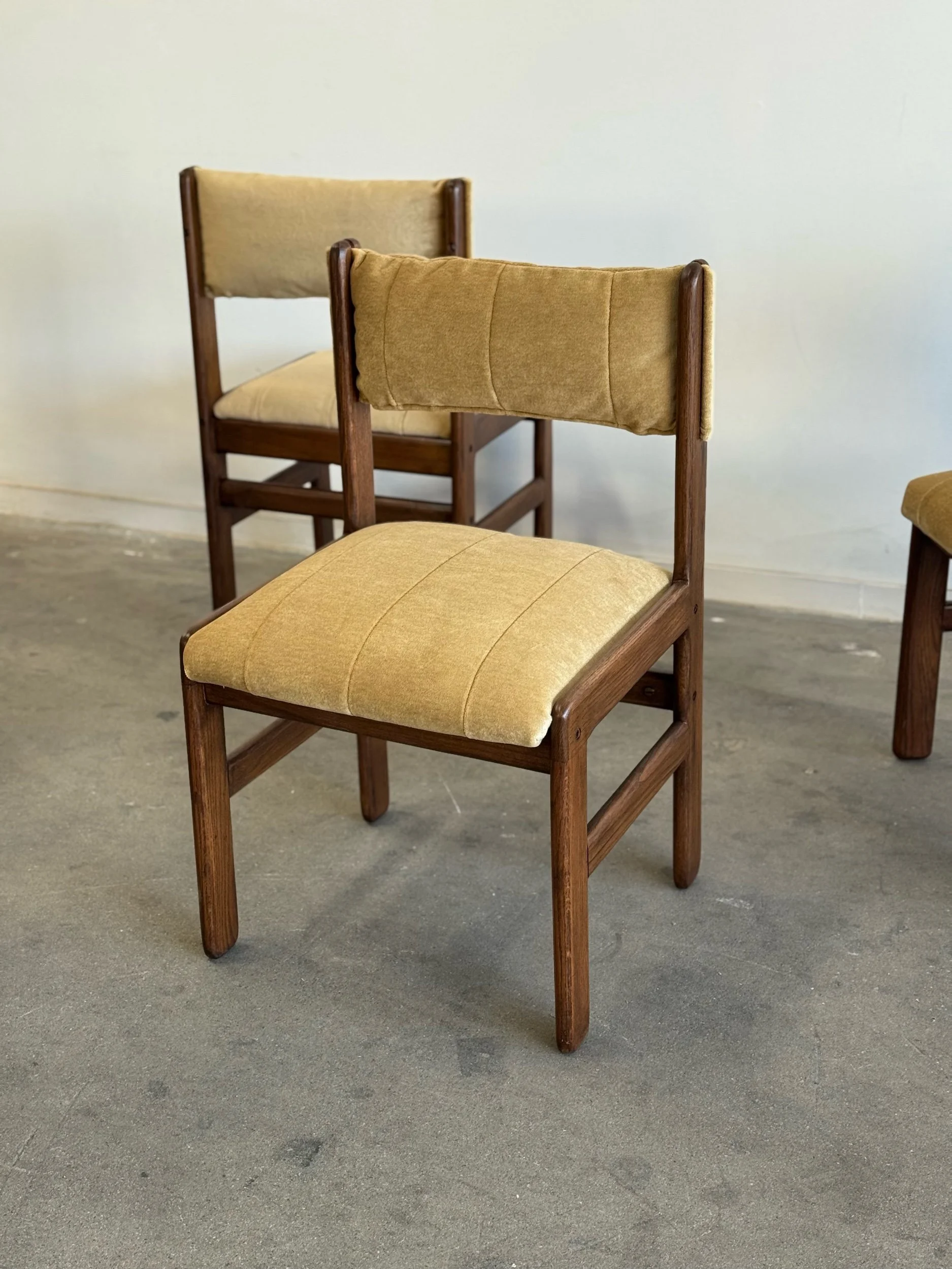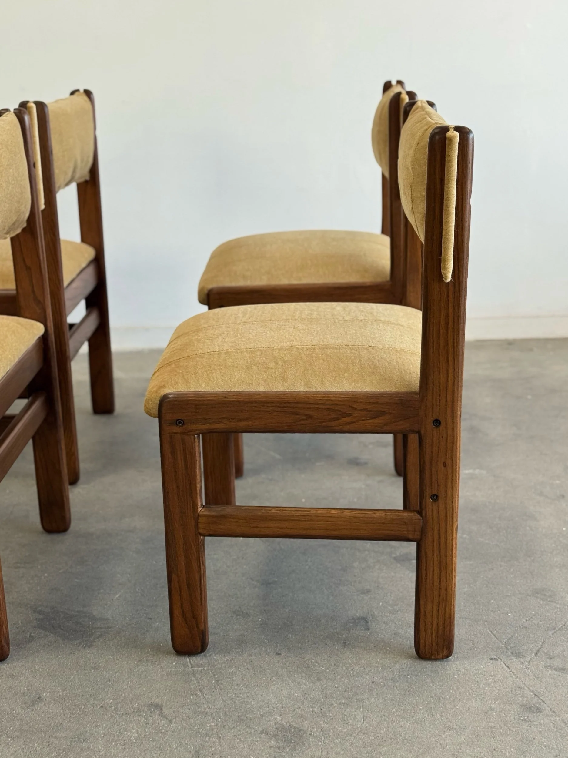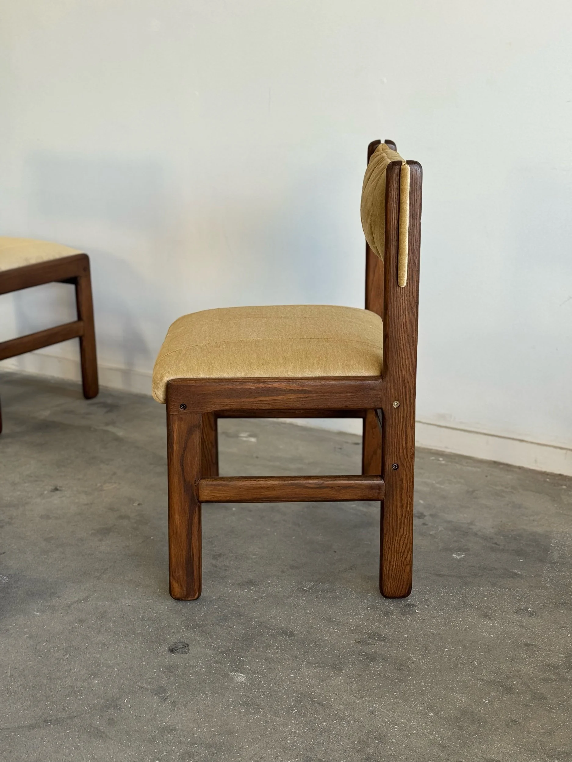 Solid oak dining chairs in excellent fully restored condition. Chairs have been reinforced and inspected for structural integrity, each unit presents in sturdy sound condition. Each unit features fresh fill and foam , new low pile mohair fabric, and fresh medium dark walnut stain on all the wooden surfaces. Price is for the set of six.
