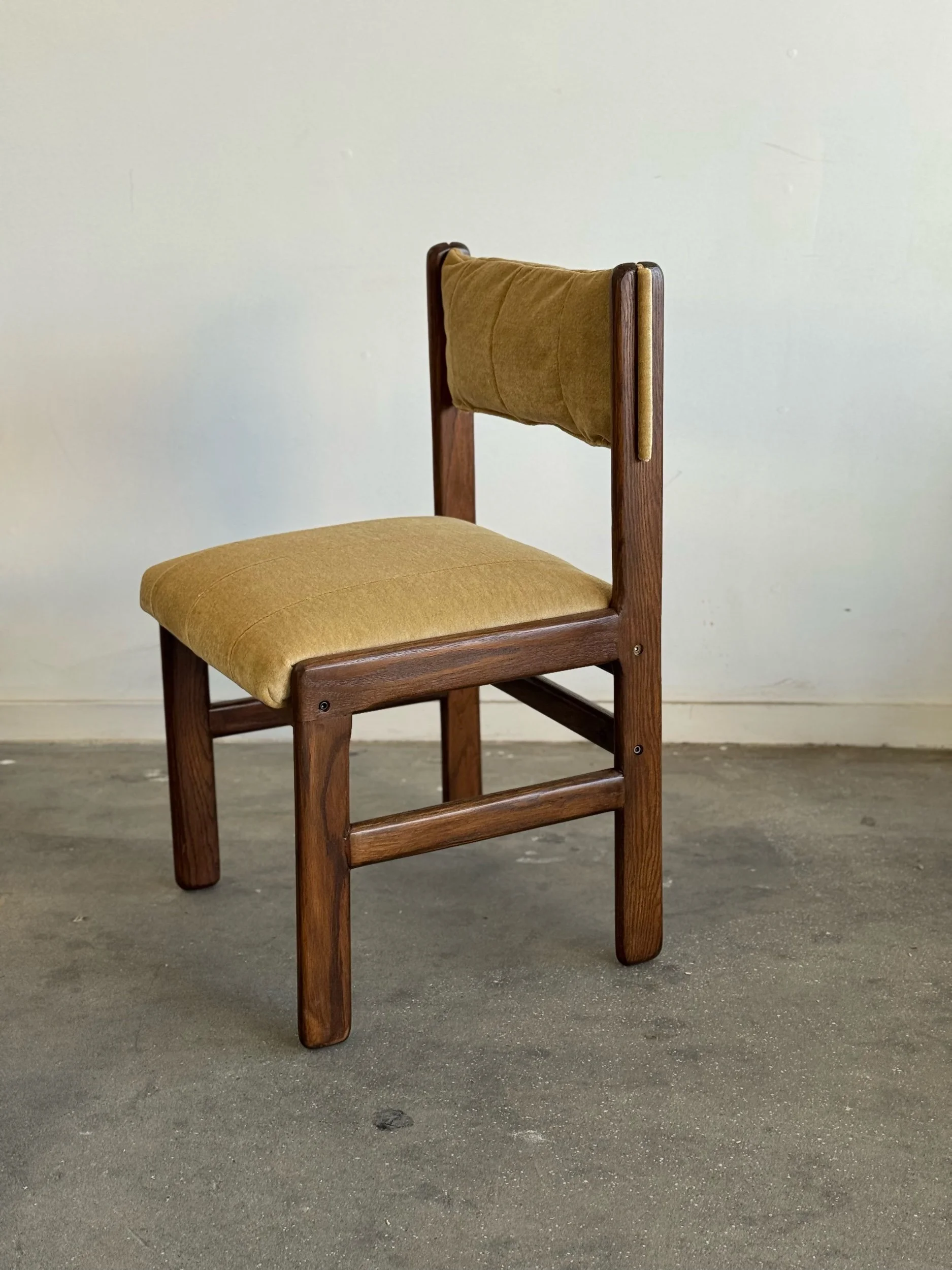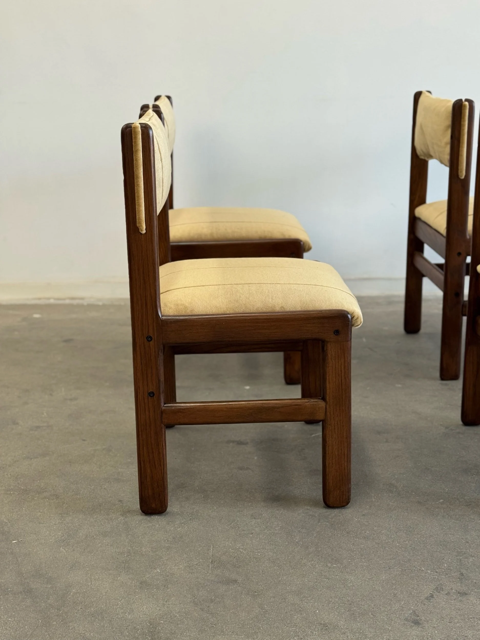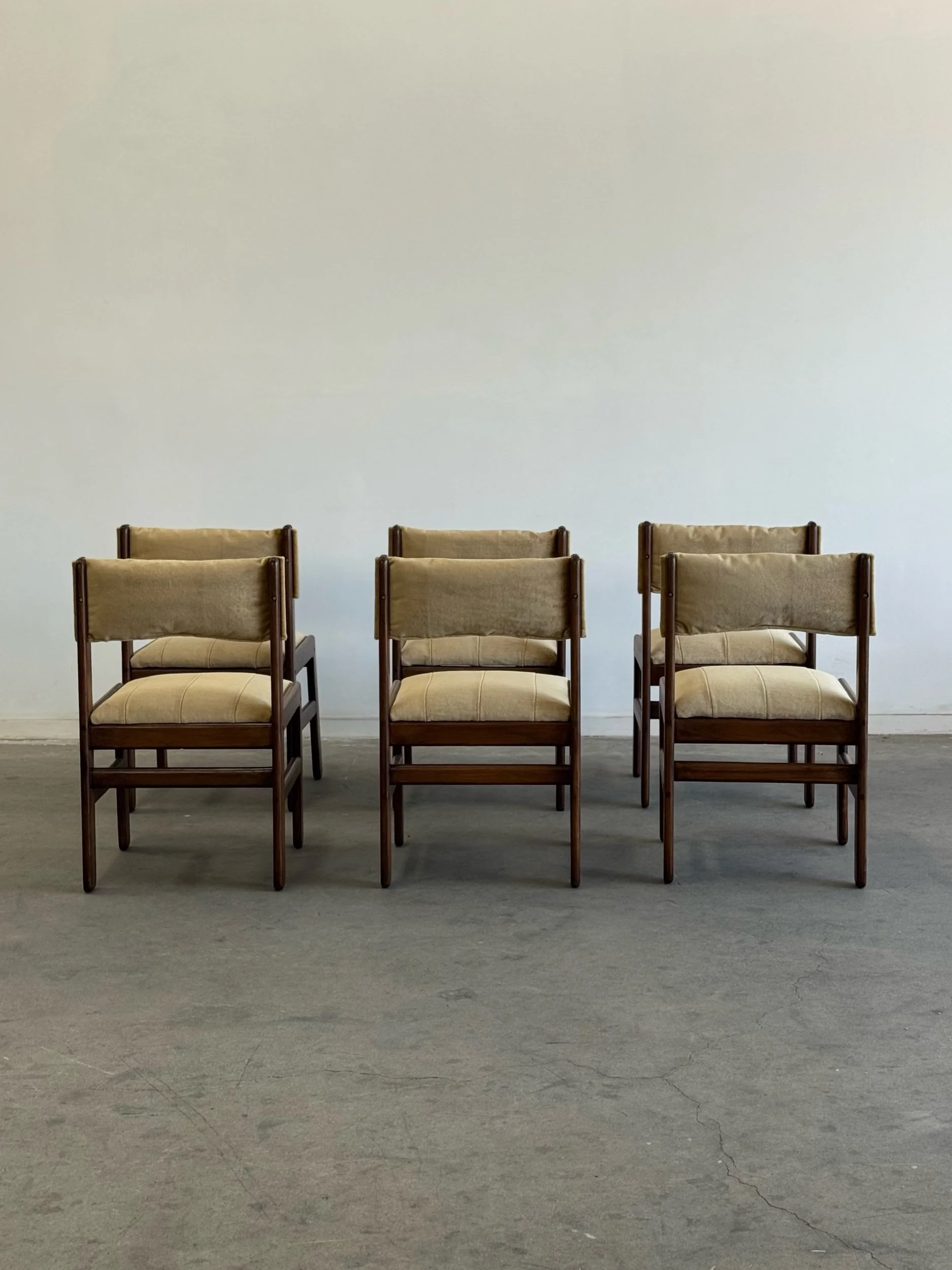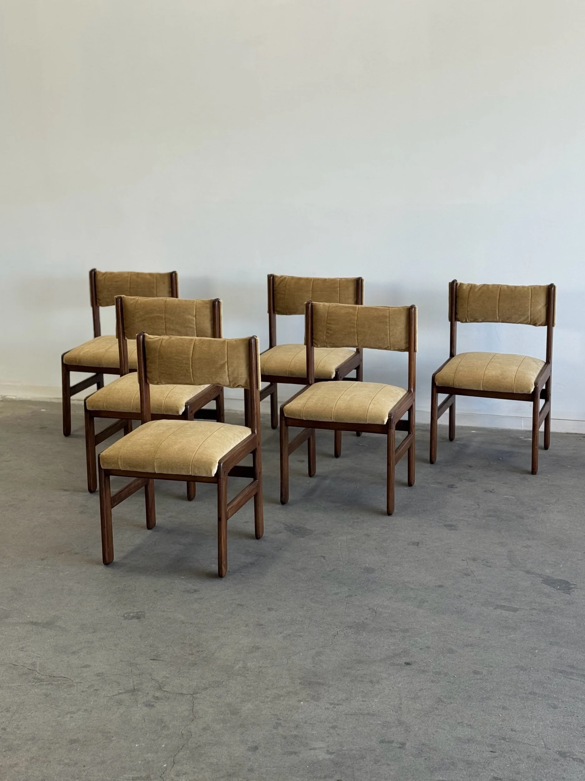 Solid oak dining chairs in excellent fully restored condition. Chairs have been reinforced and inspected for structural integrity, each unit presents in sturdy sound condition. Each unit features fresh fill and foam , new low pile mohair fabric, and fresh medium dark walnut stain on all the wooden surfaces. Price is for the set of six.