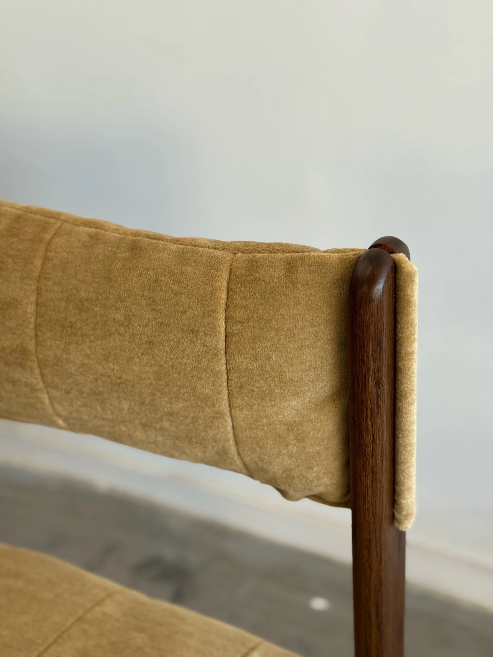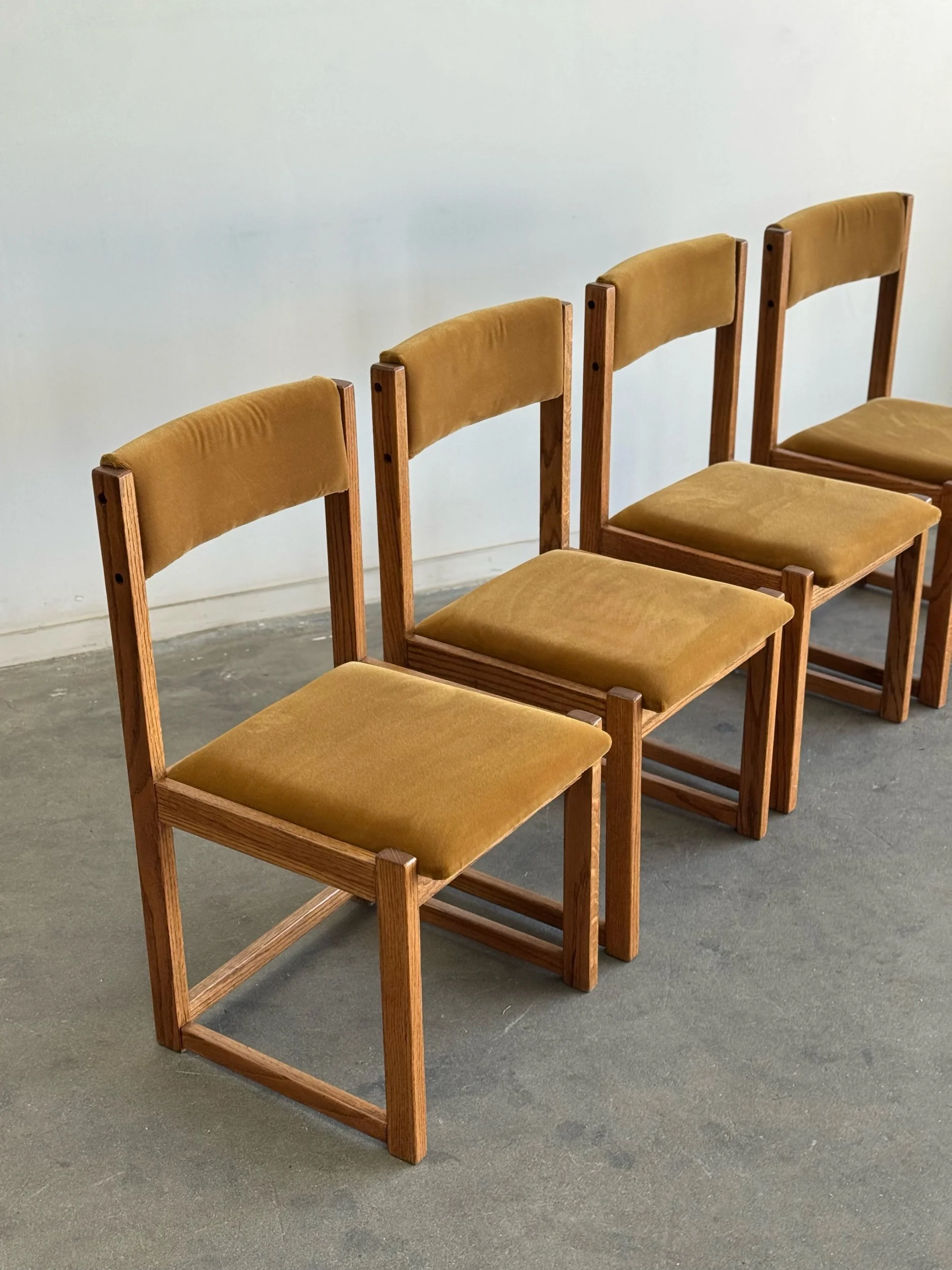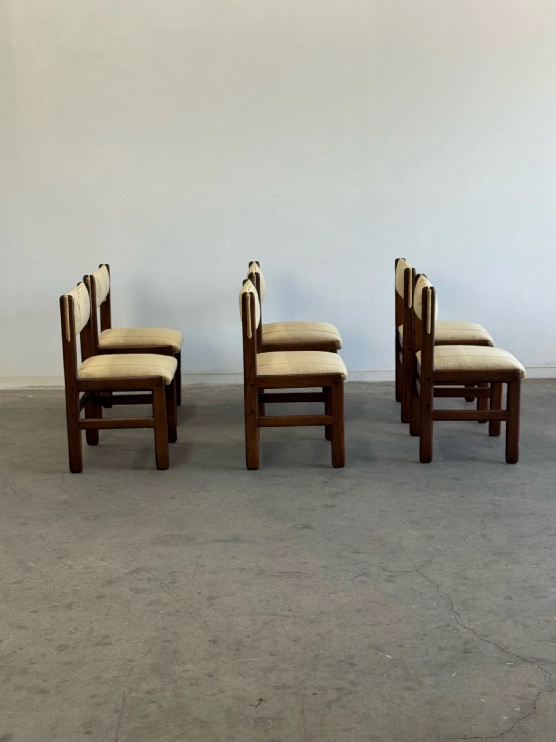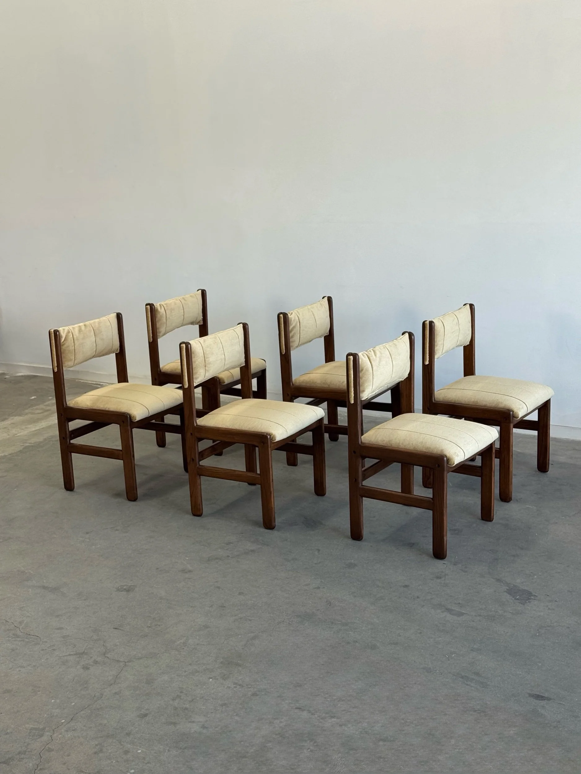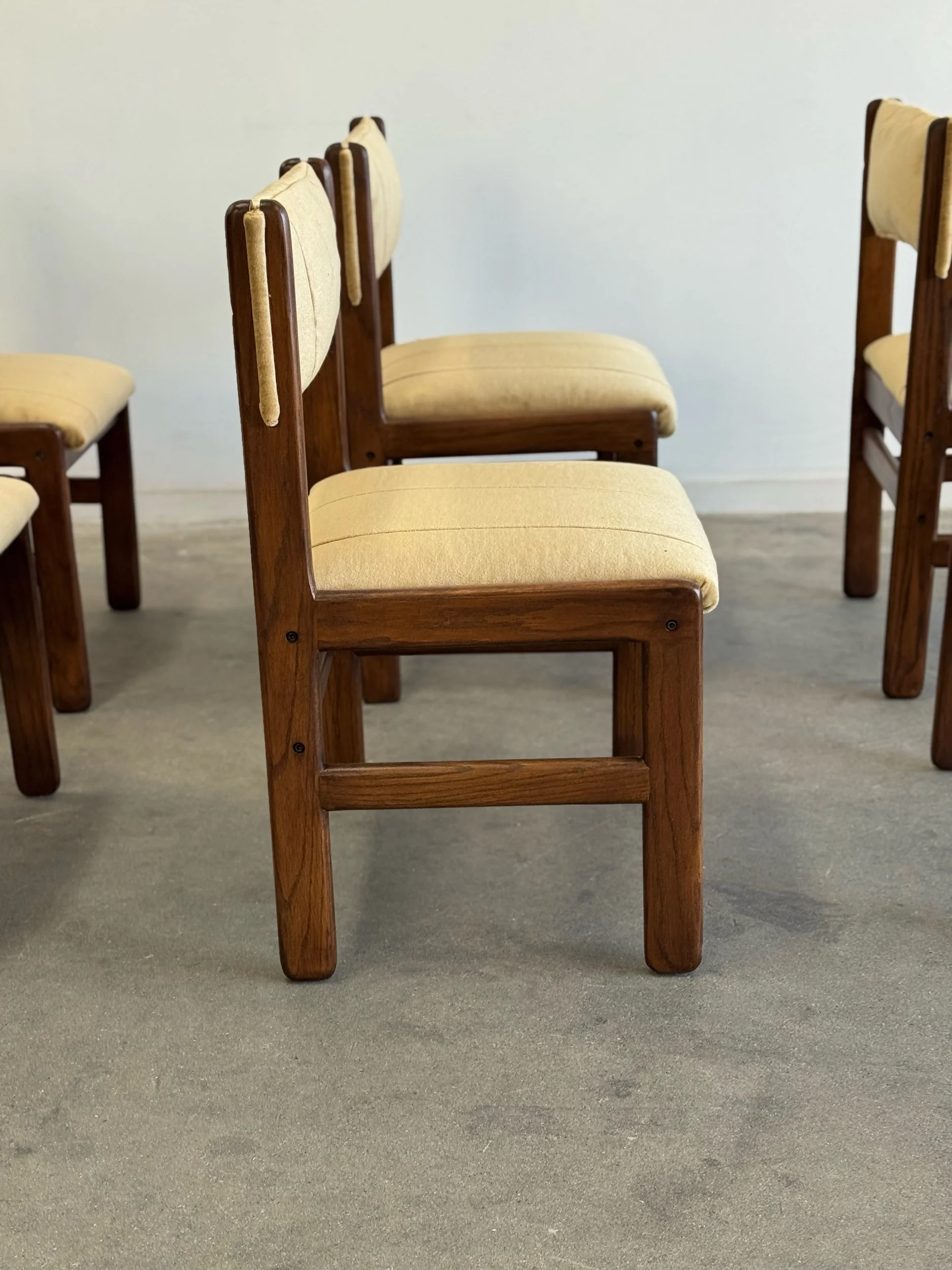 Solid oak dining chairs in excellent fully restored condition. Chairs have been reinforced and inspected for structural integrity, each unit presents in sturdy sound condition. Each unit features fresh fill and foam , new low pile mohair fabric, and fresh medium dark walnut stain on all the wooden surfaces. Price is for the set of six.