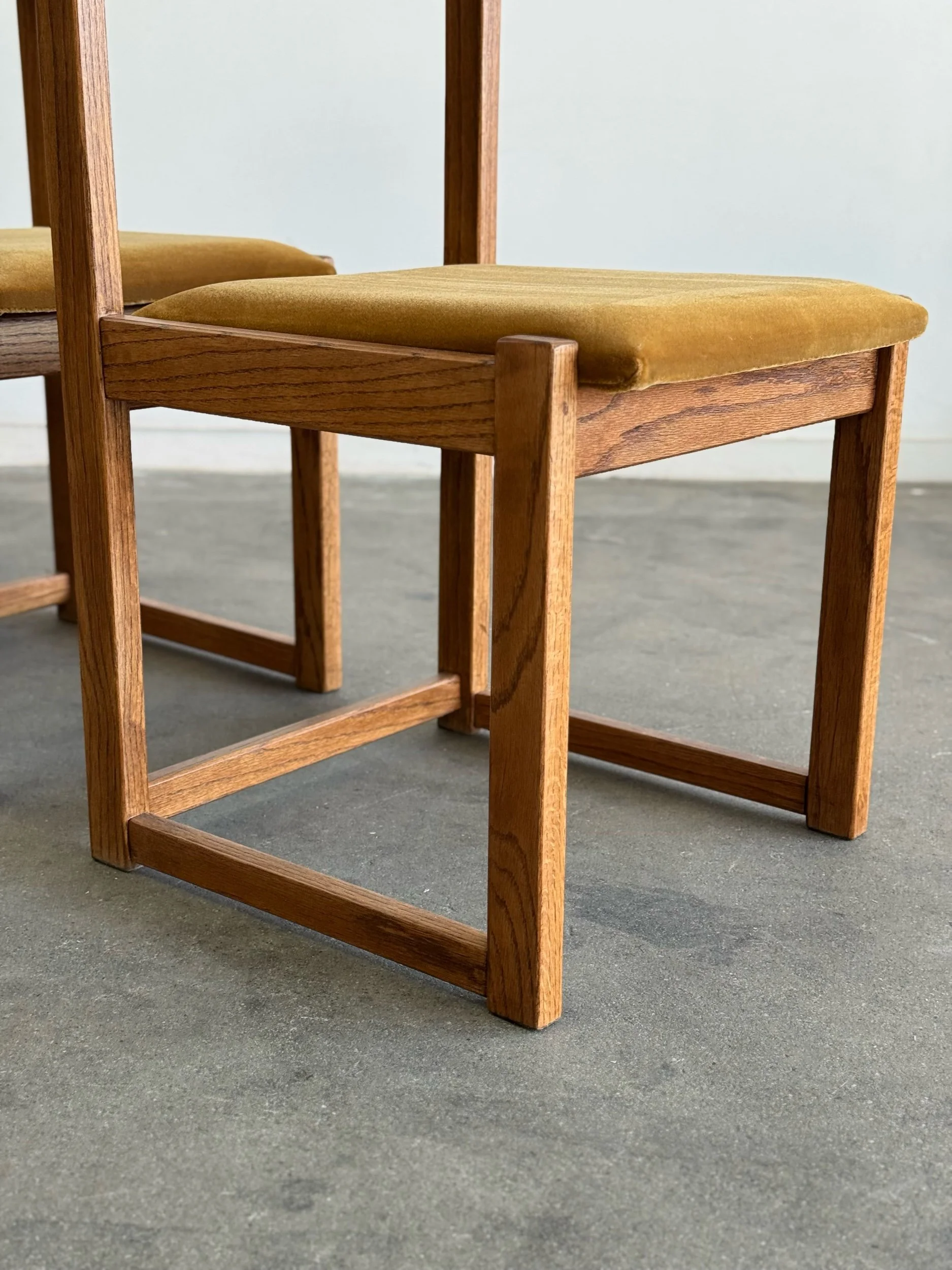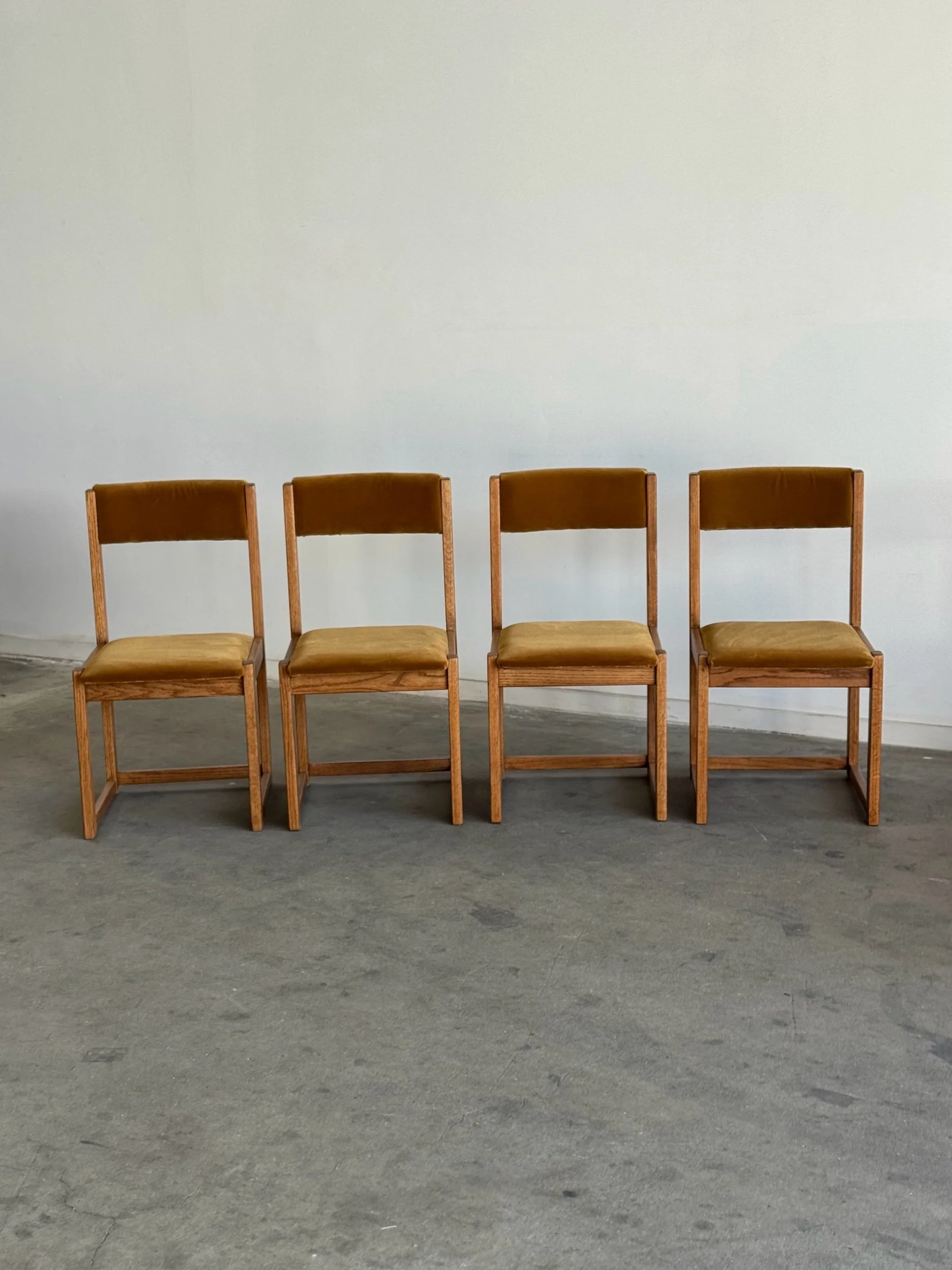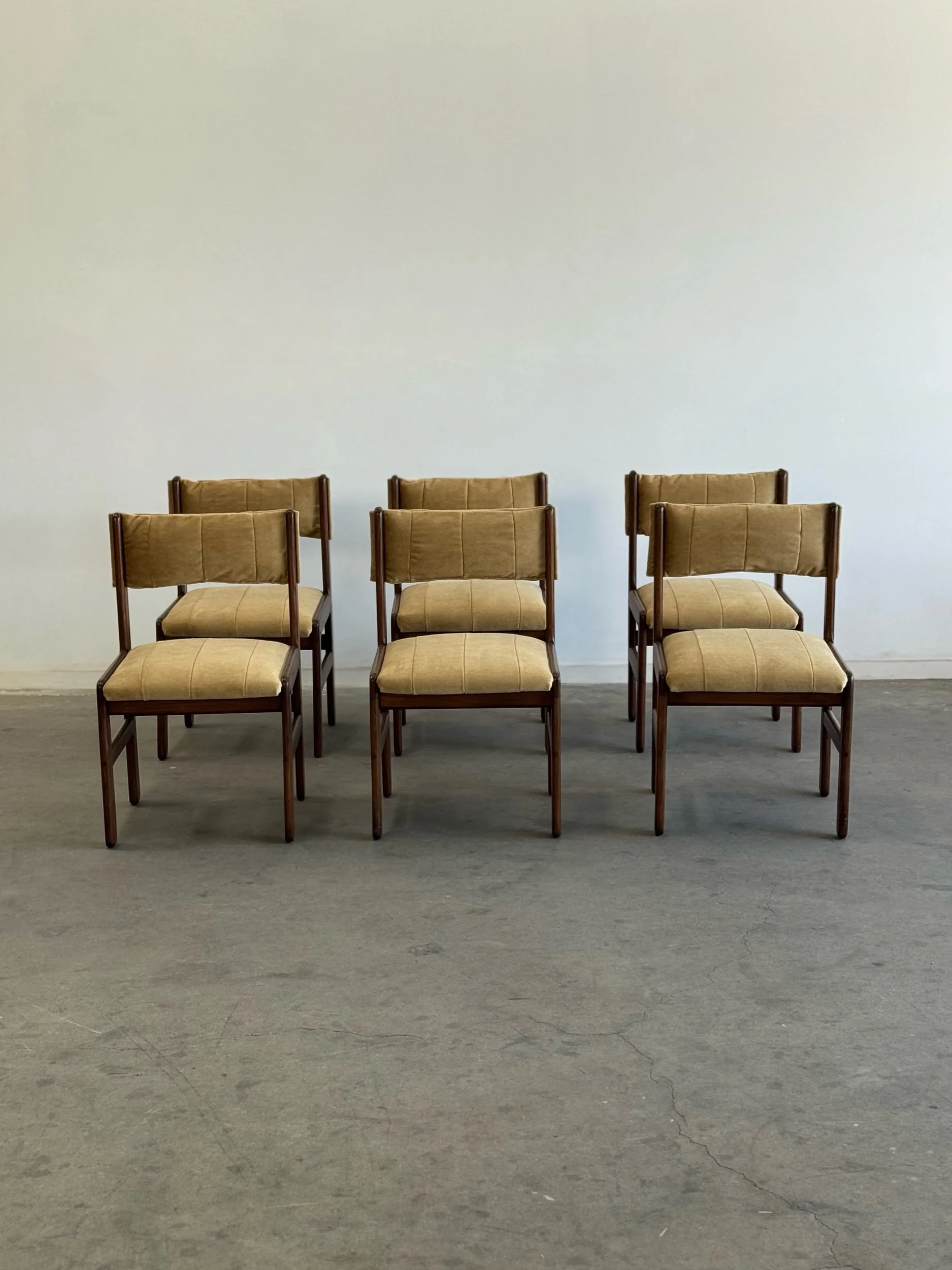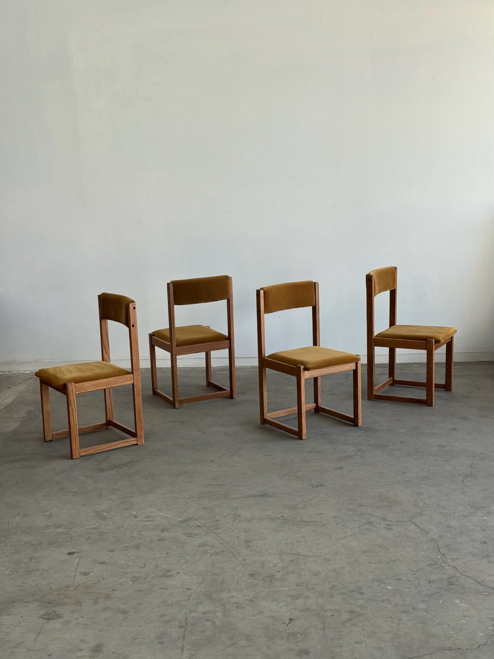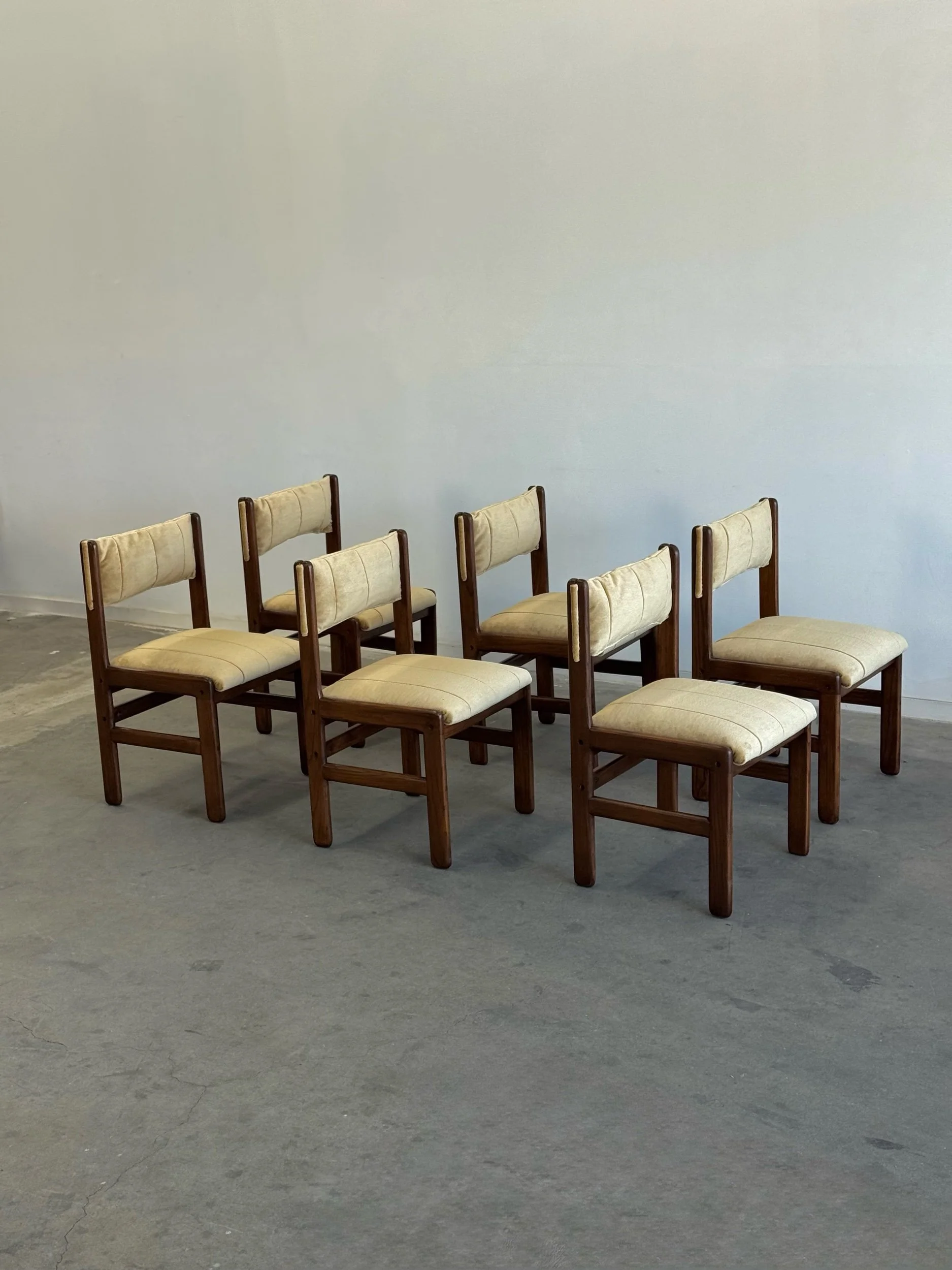 Solid oak dining chairs in excellent fully restored condition. Chairs have been reinforced and inspected for structural integrity, each unit presents in sturdy sound condition. Each unit features fresh fill and foam , new low pile mohair fabric, and fresh medium dark walnut stain on all the wooden surfaces. Price is for the set of six.