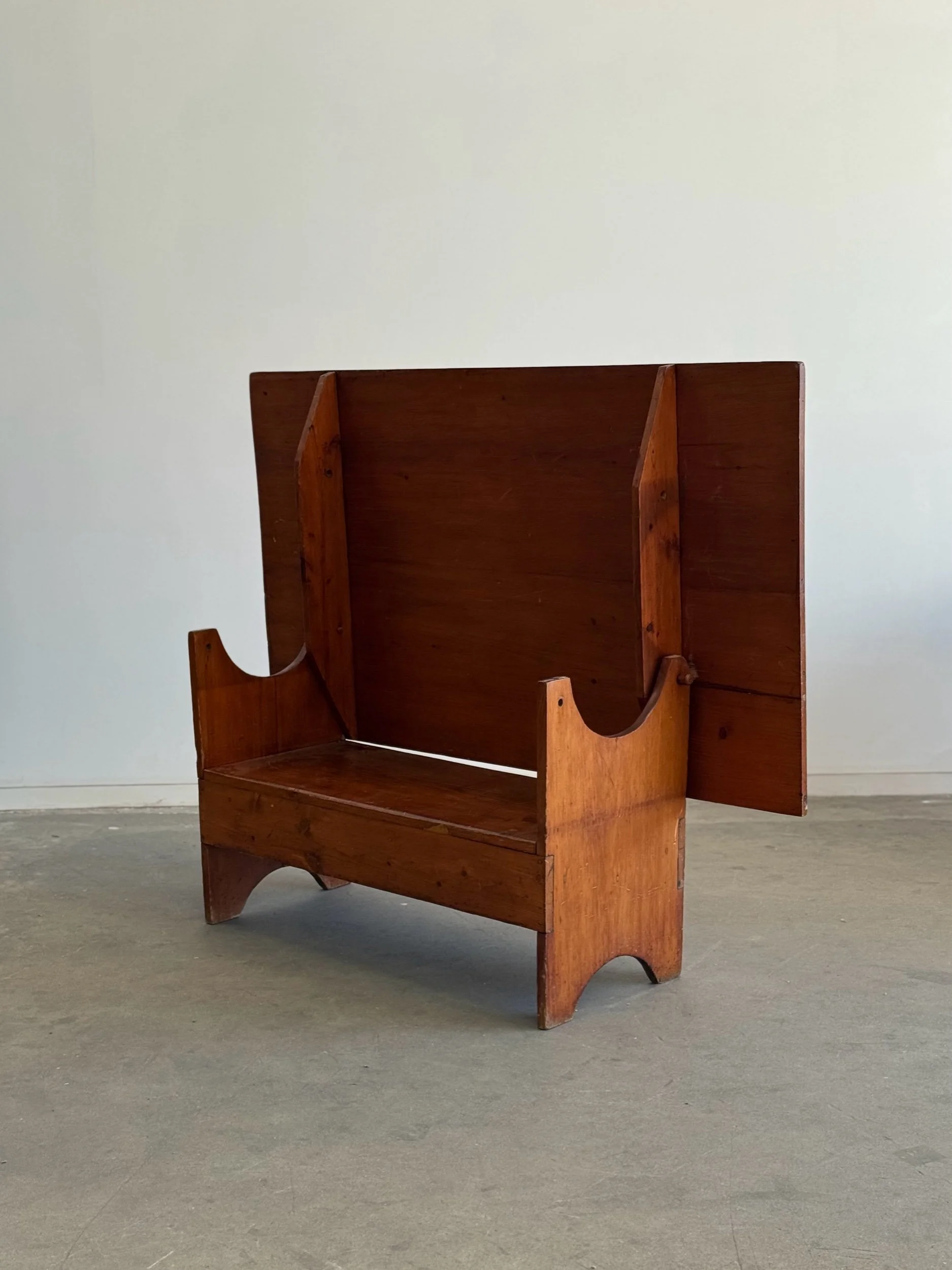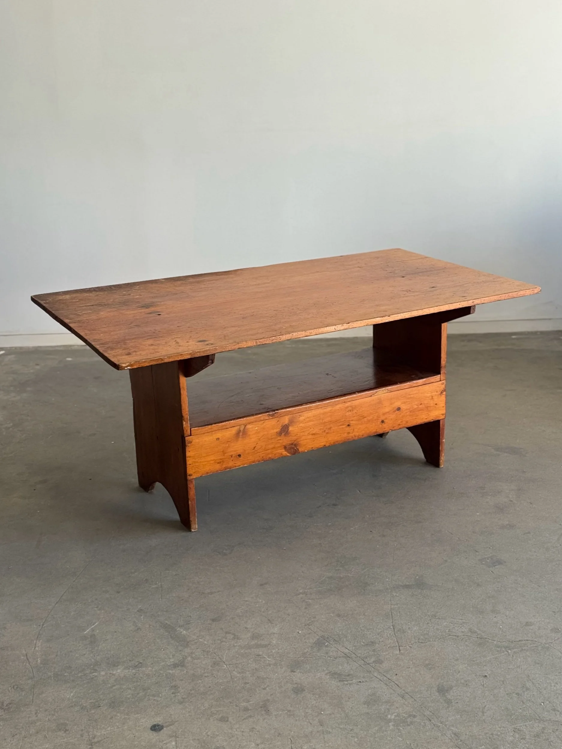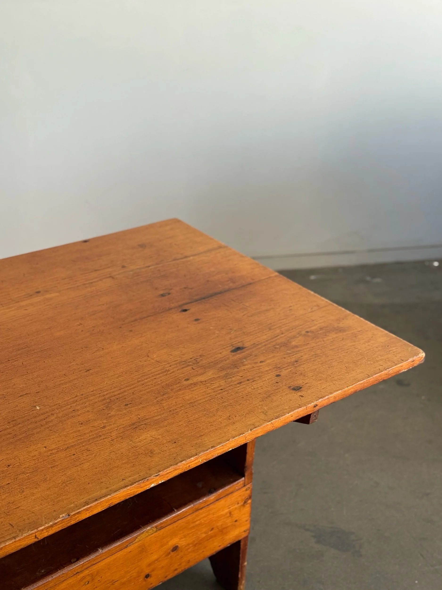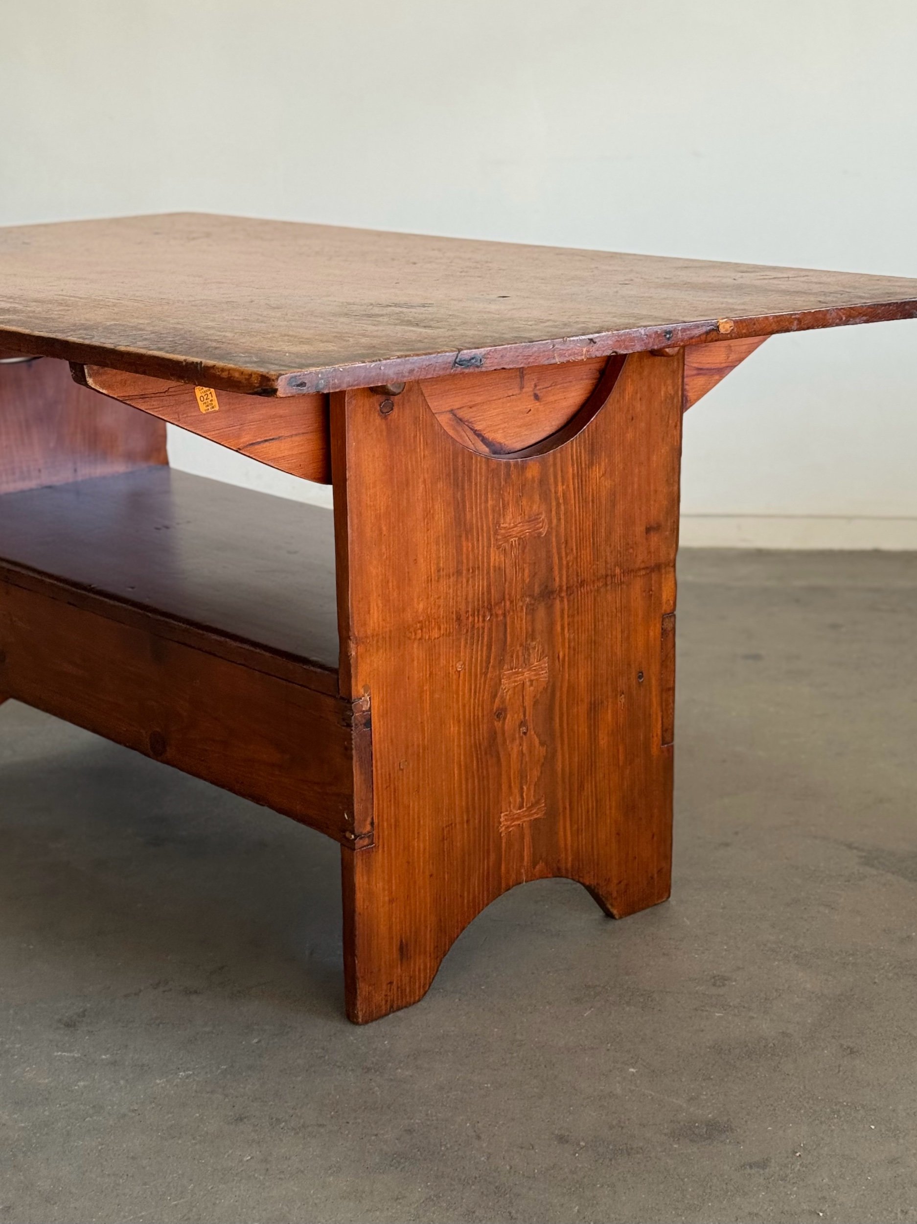 Antique pine table made in great patinated vintage condition. Unit has been reinforced where needed and table is structurally sound and sturdy. Table is fully functional and has four handmade dowel that lock surface into place, two are removed when used for seating.
