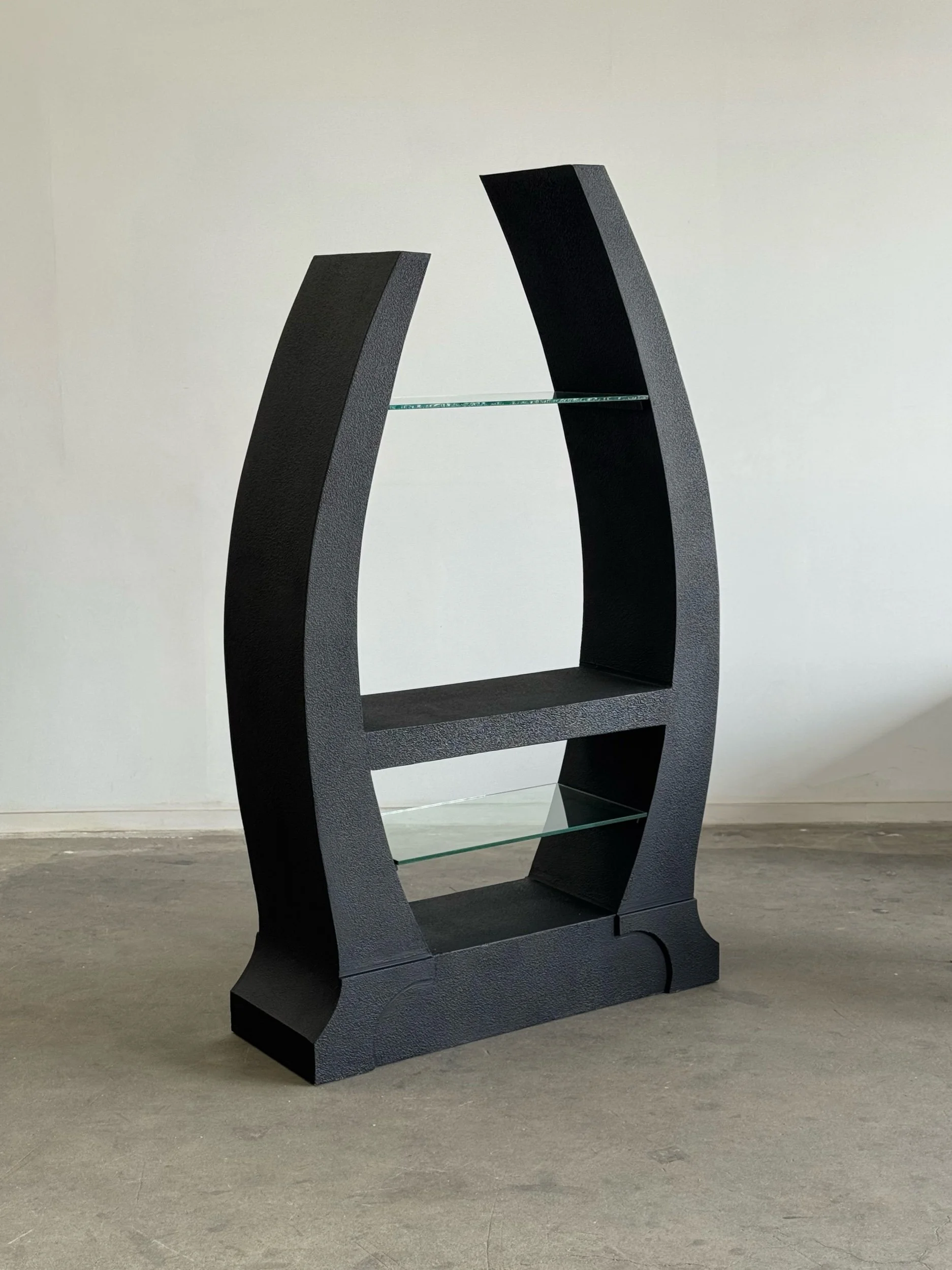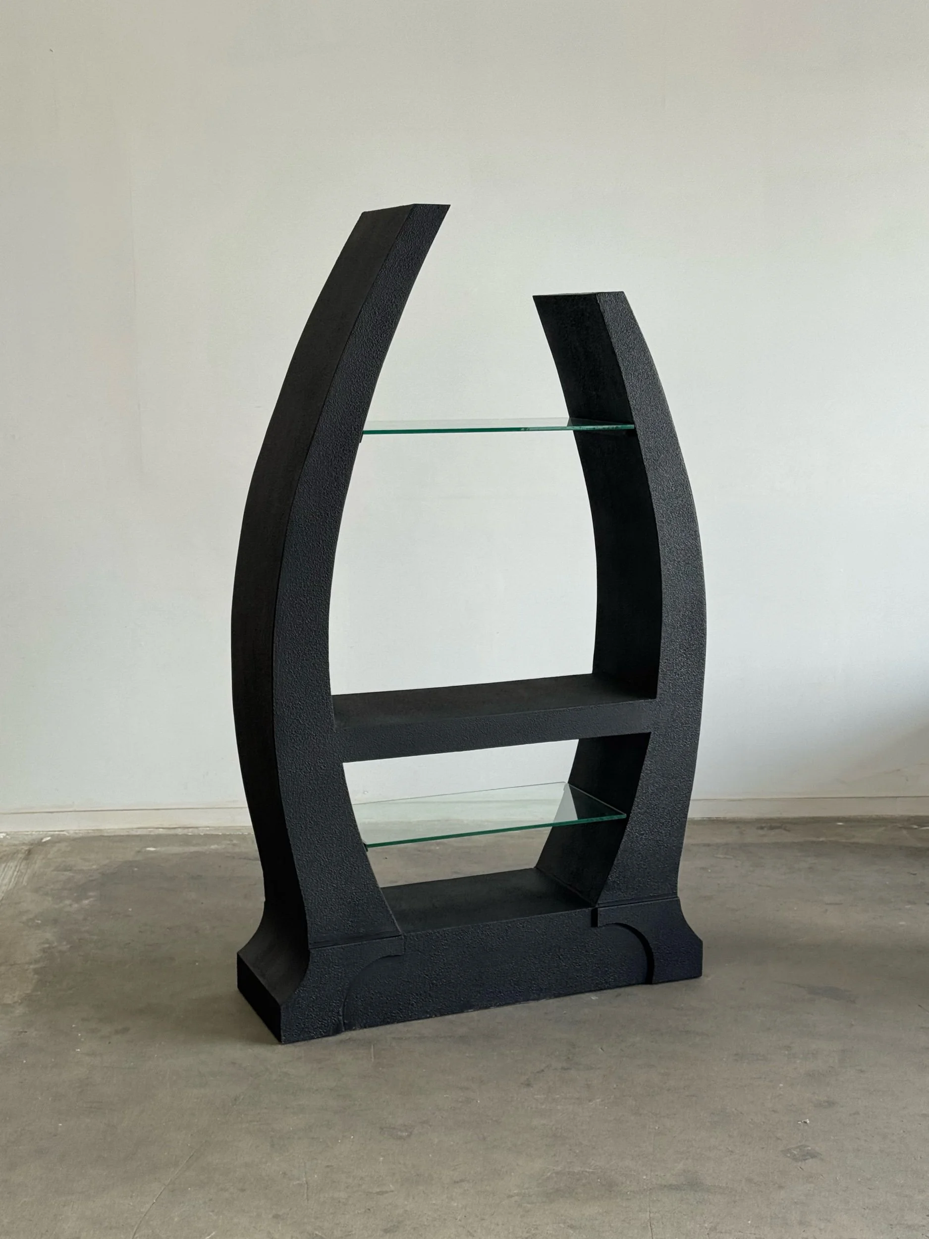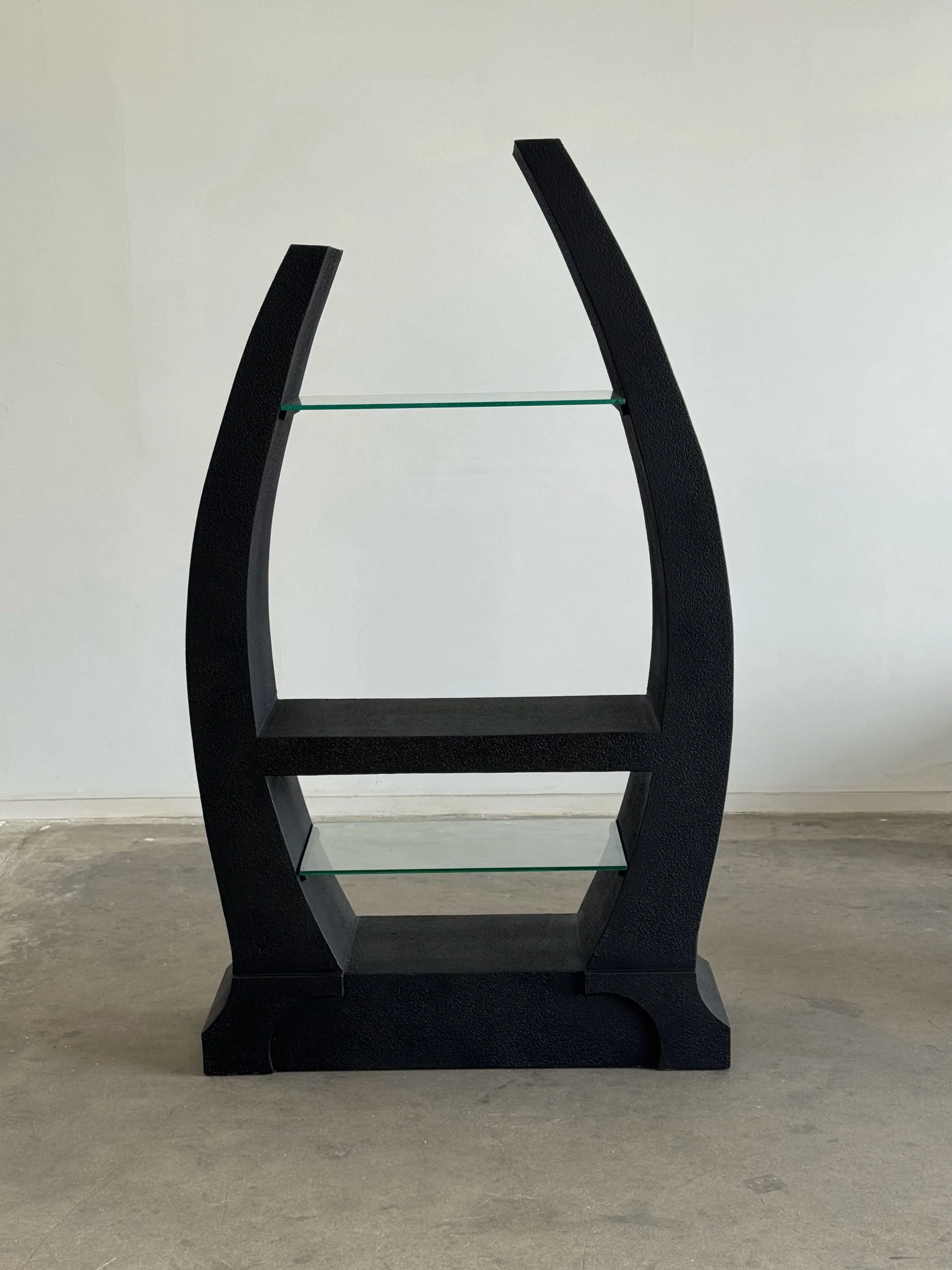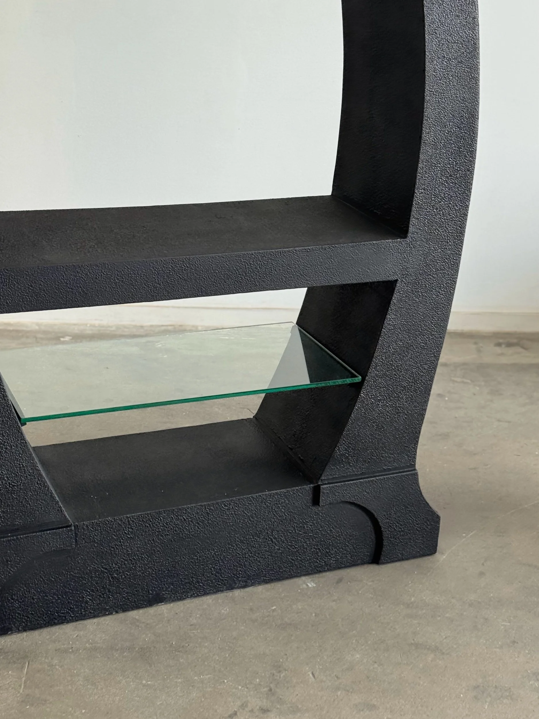 Vintage Stucco Shelving Unit in great condition. Item has been coated in black and presents well with no major areas of wear. Minor scratches in glass have been shown closely. Unit is structurally sound.