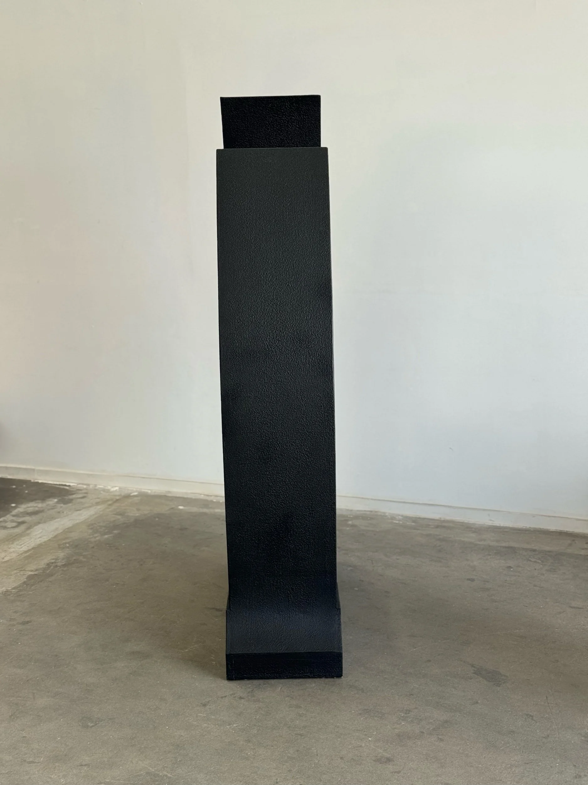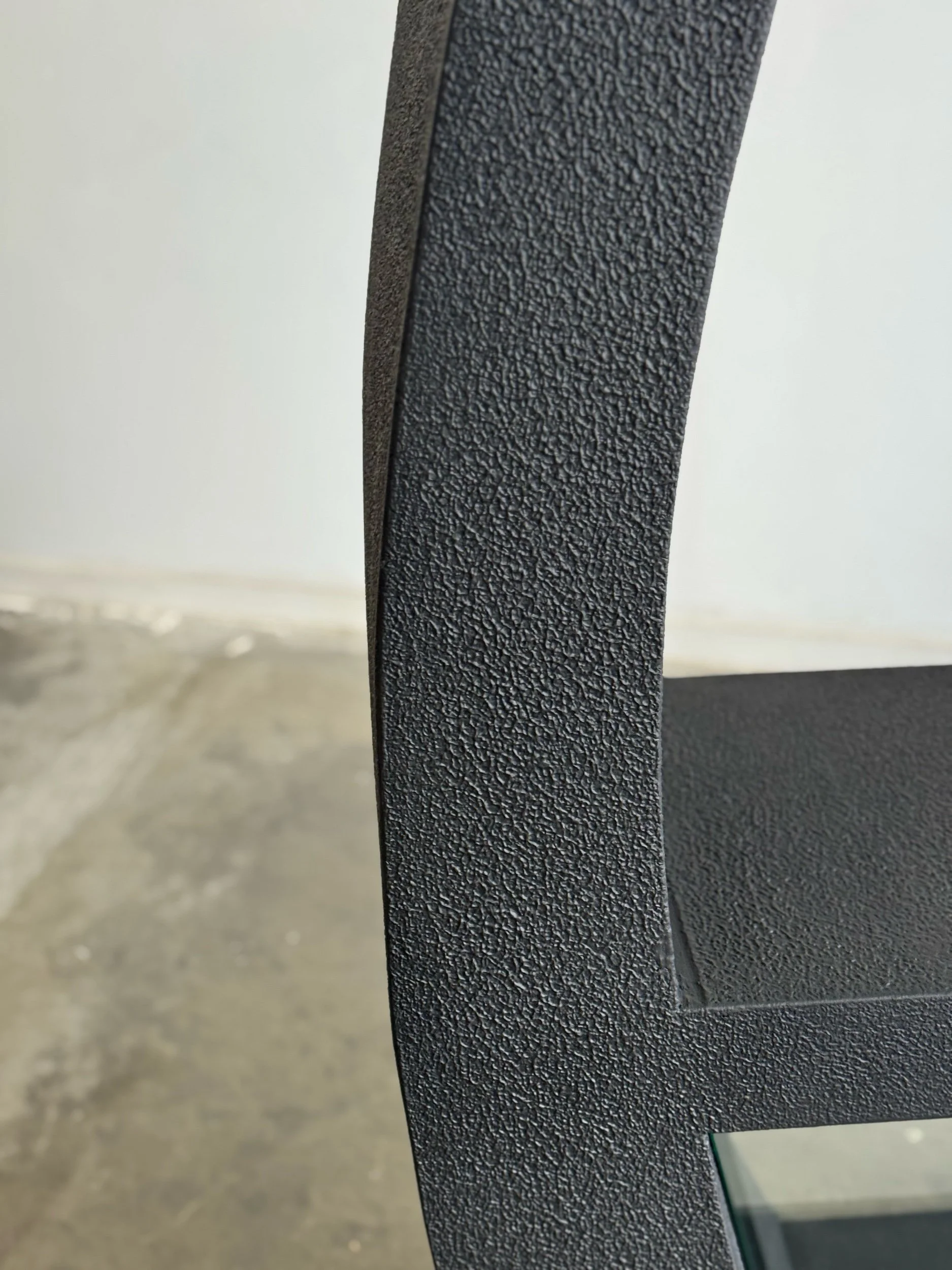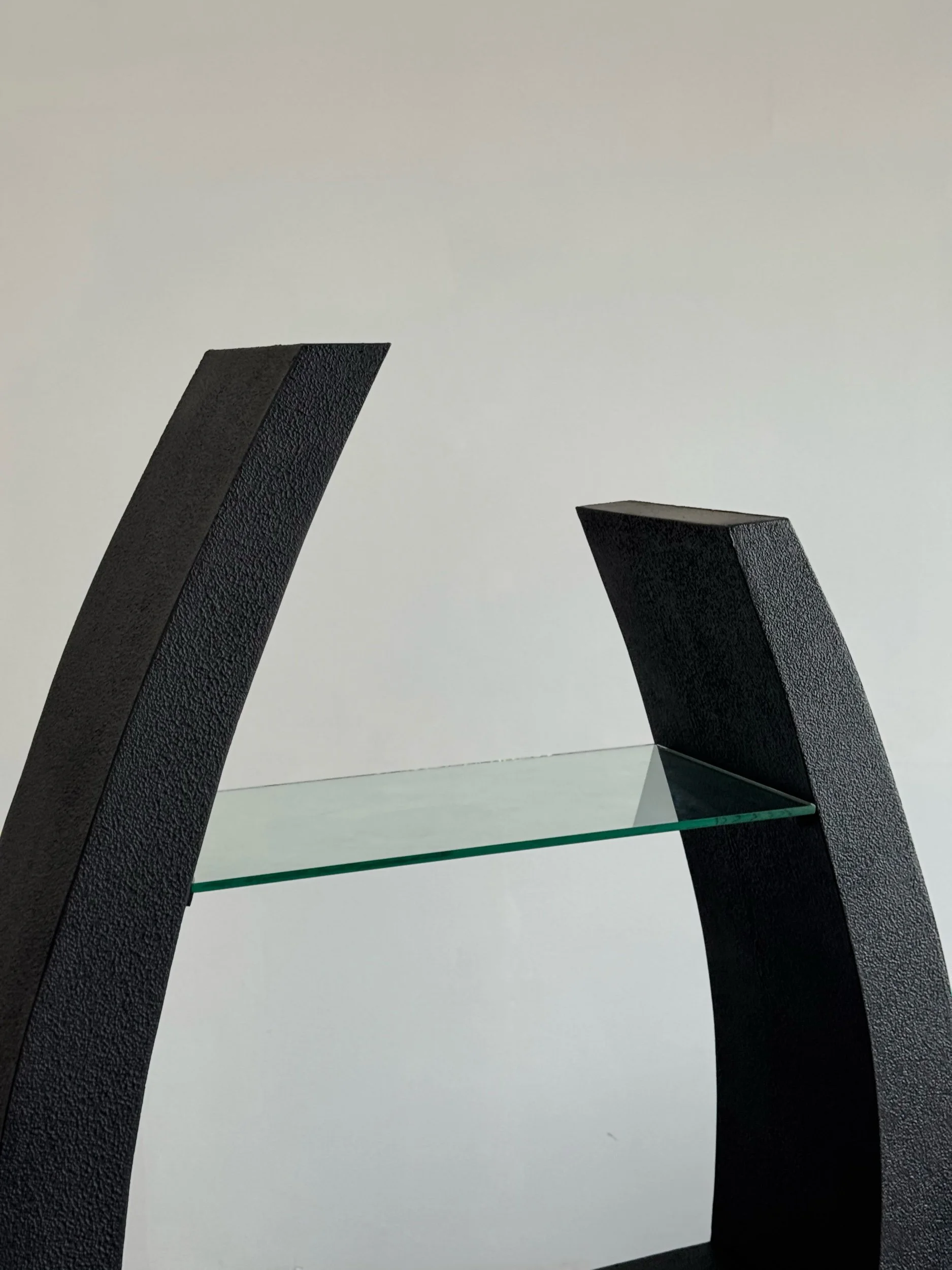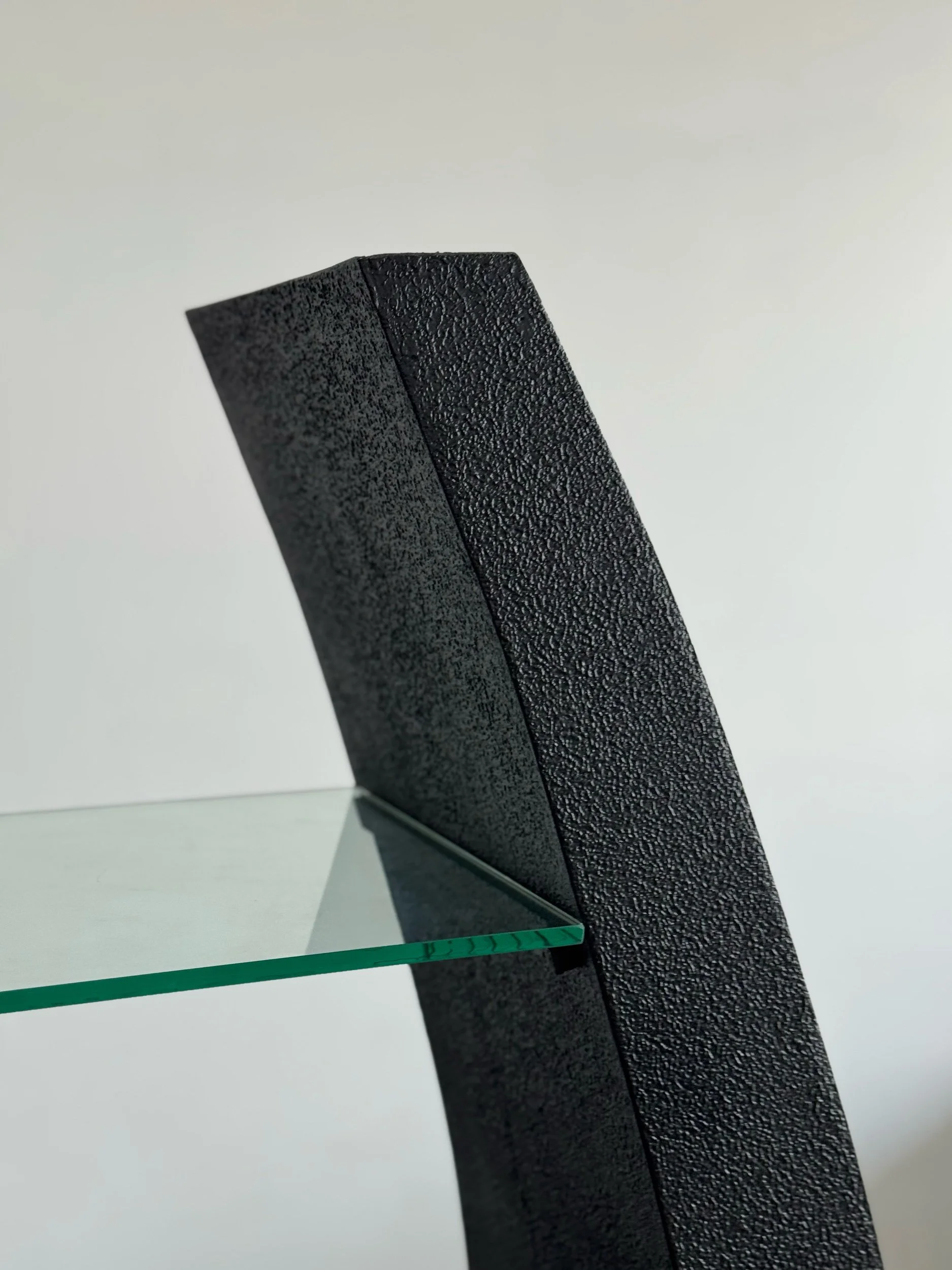 Vintage Stucco Shelving Unit in great condition. Item has been coated in black and presents well with no major areas of wear. Minor scratches in glass have been shown closely. Unit is structurally sound.