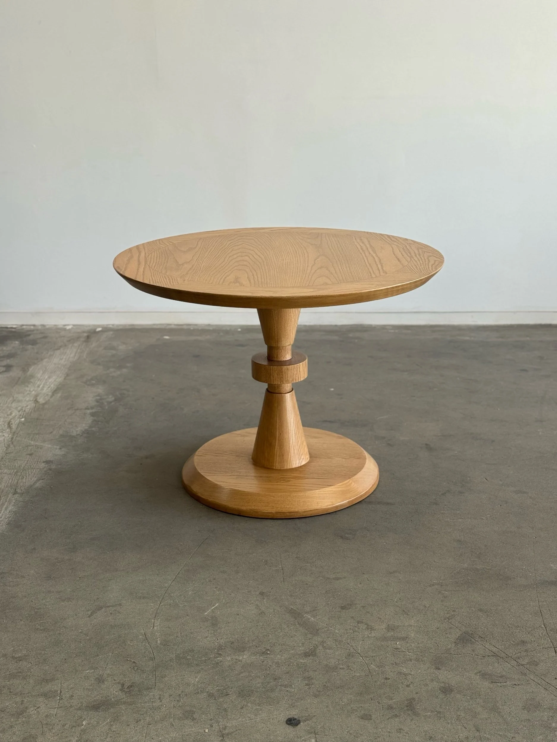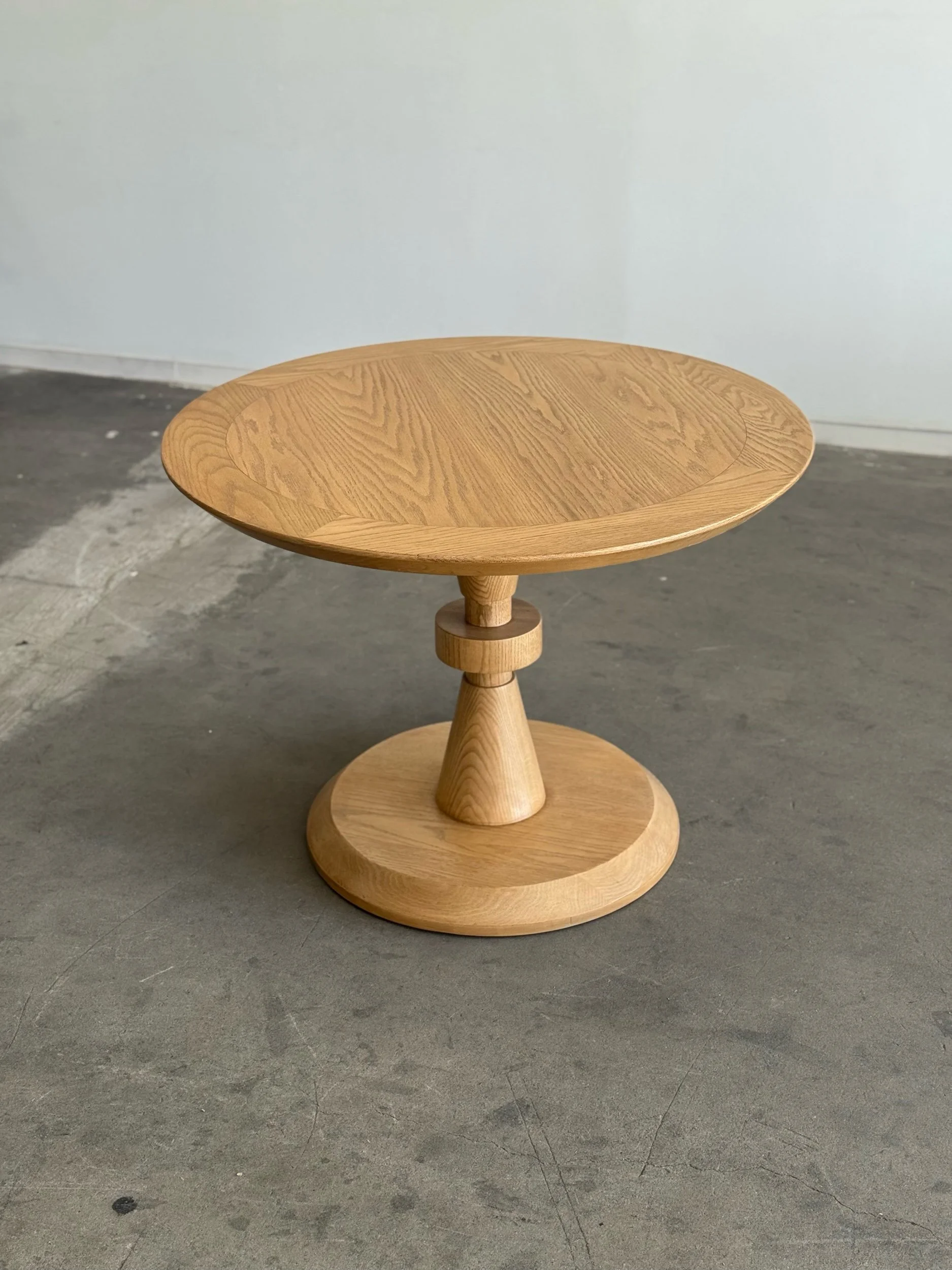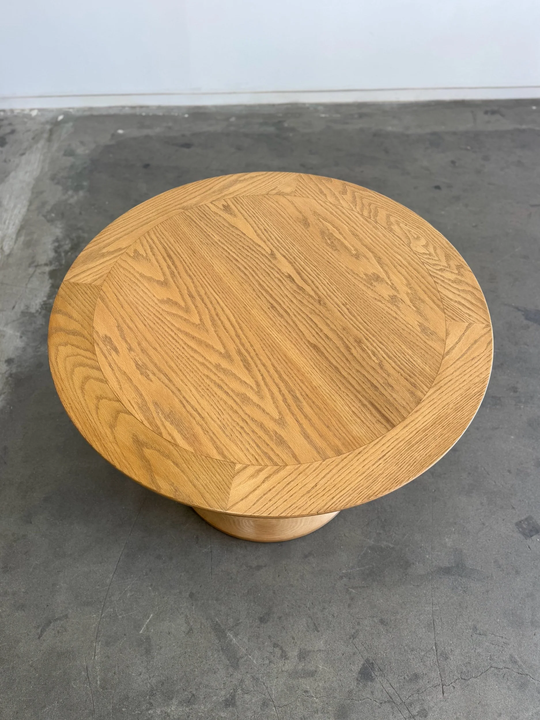 Forma dining table custom made here in Los Angeles. This table includes a clear natural finish, allowing for its organic form to be displayed as is, please note a clear coat does show natural imperfections in the wood. Finish can be adjusted to clients preference for a surcharge. Made in solid white oak but can be custom ordered using wood of choice. Features denting along bottom to create balance. Fully customizable to fit your aesthetic.