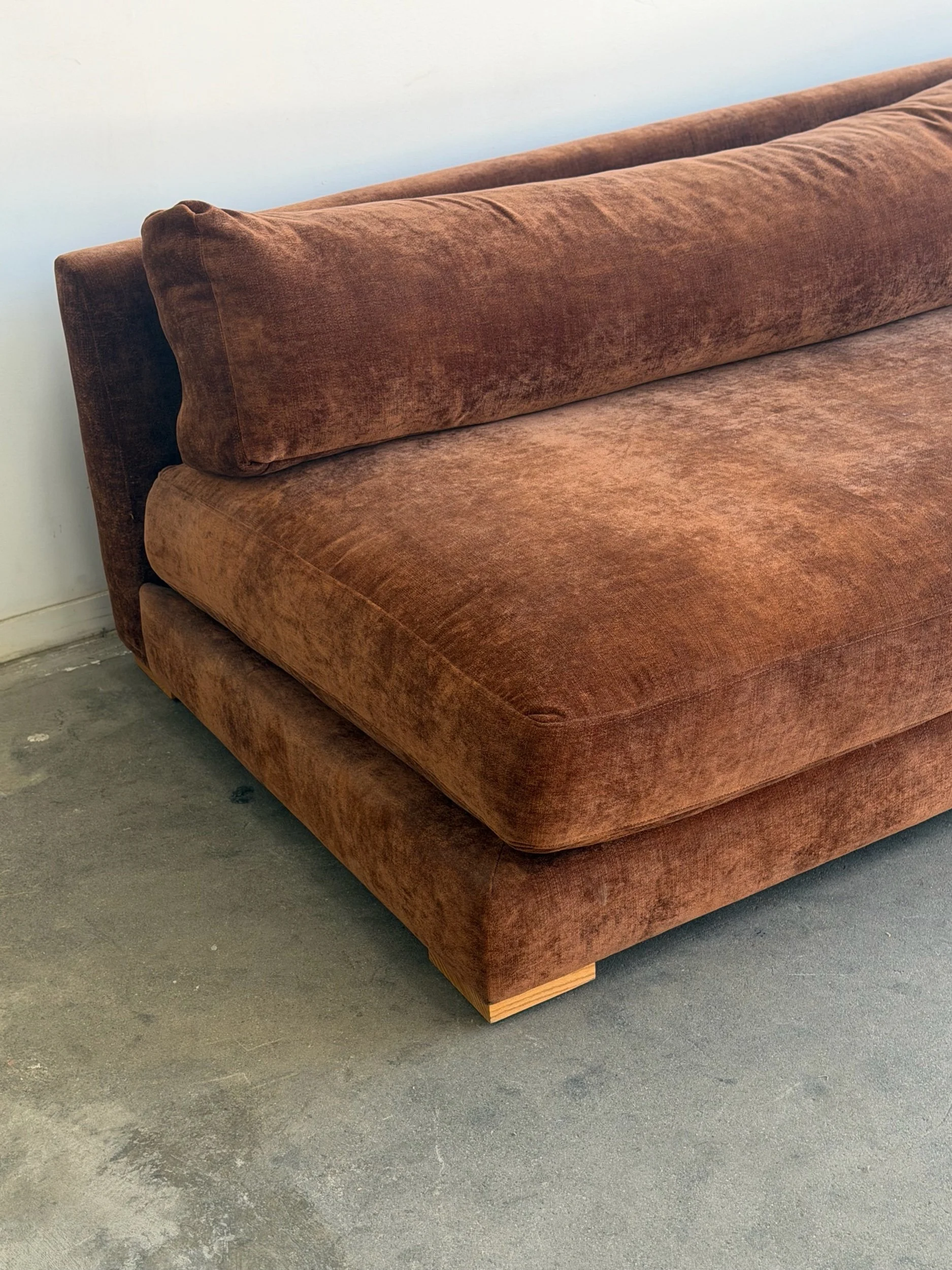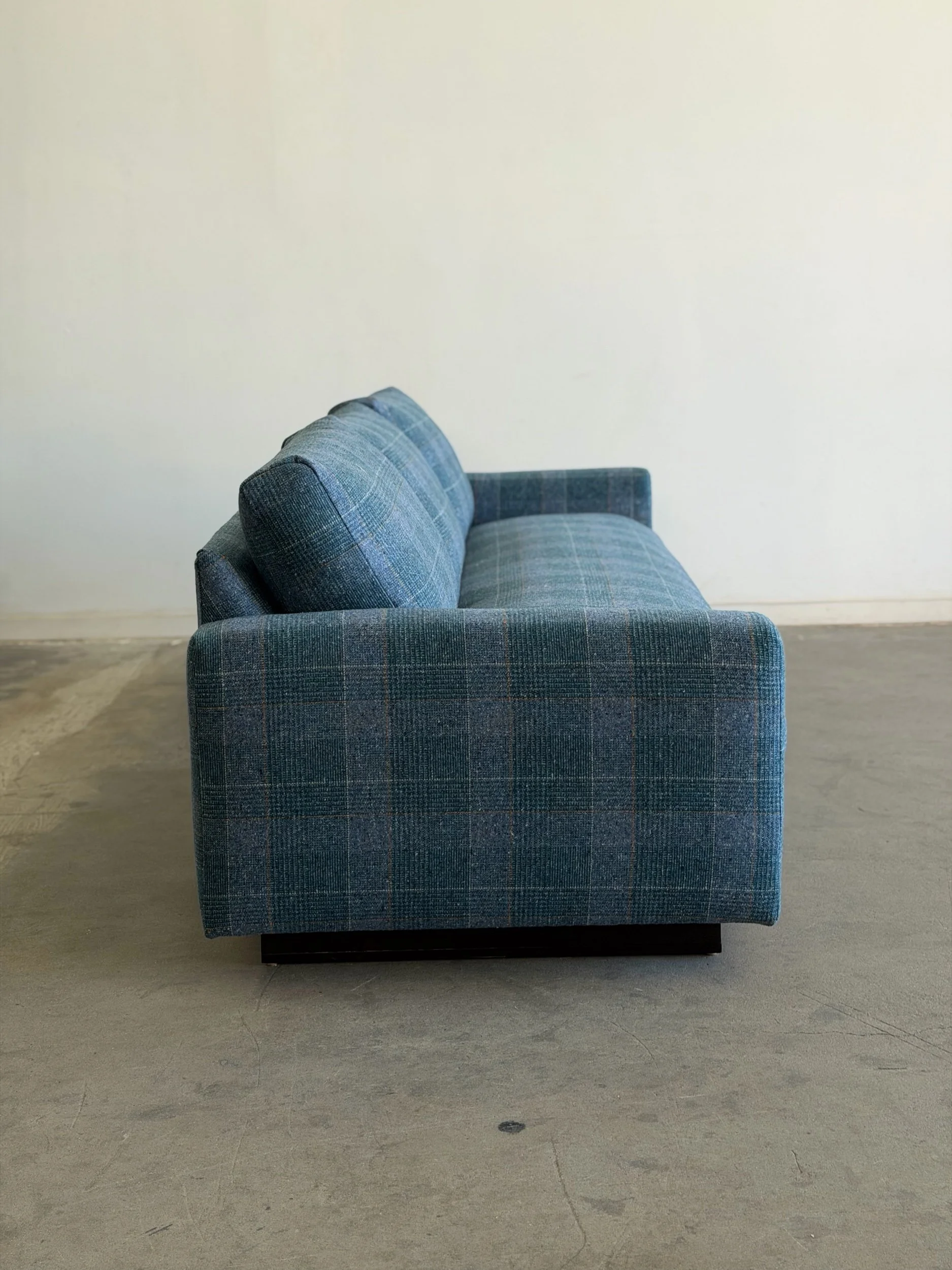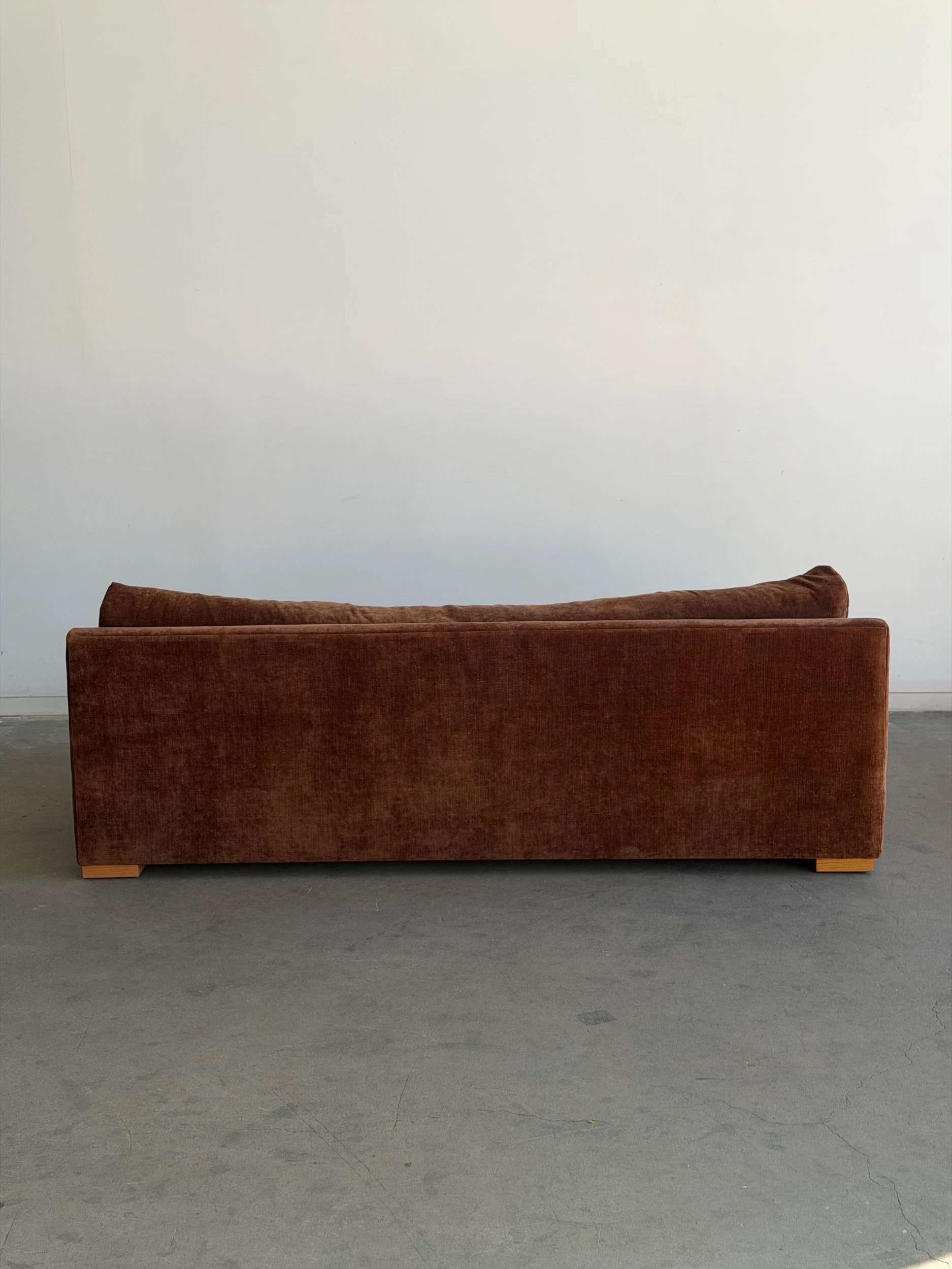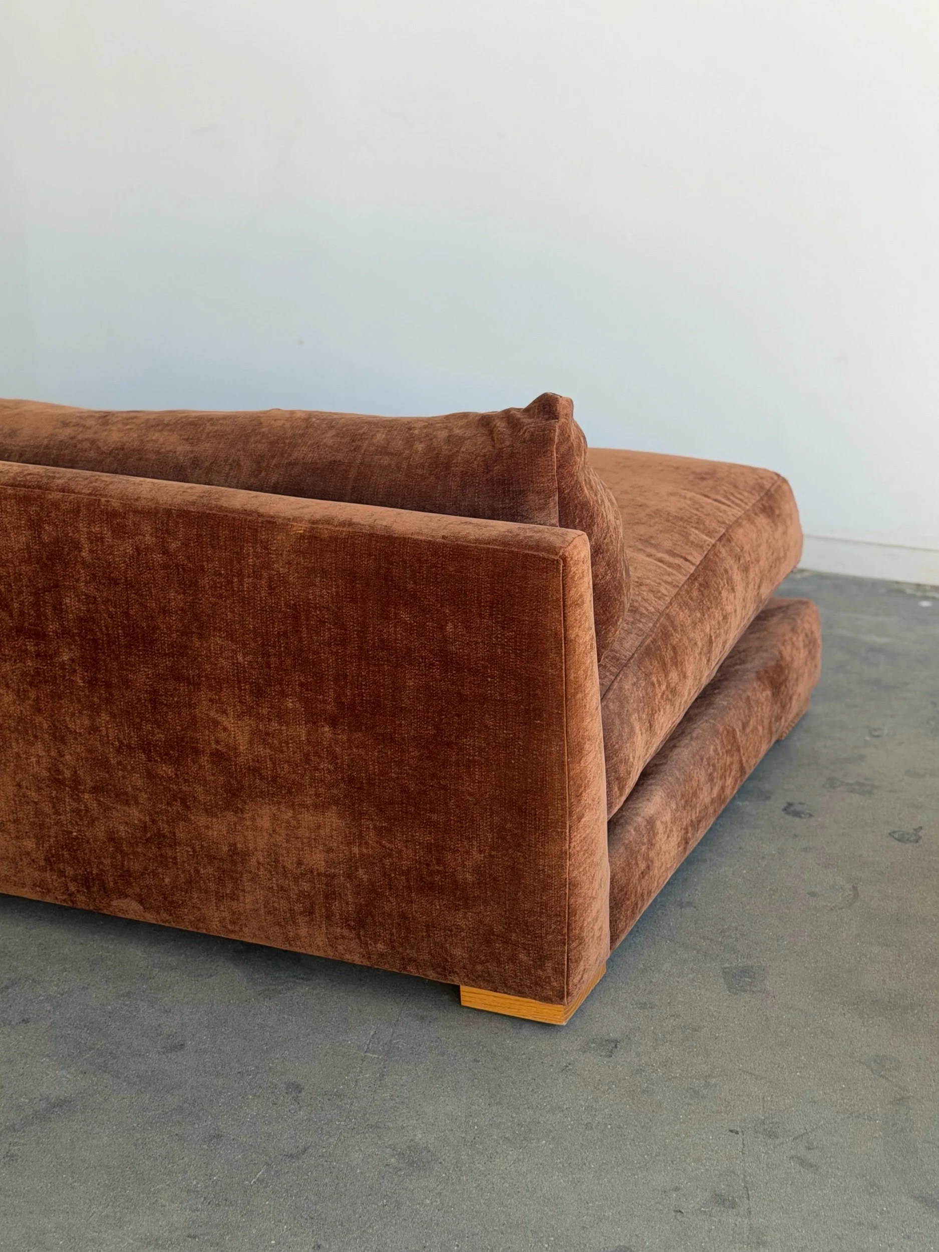 Fully restored sofa with fresh feather and foam mix. Unit features freshly refinished wooden plinth base. Base also has an added solid wooden cleat for added protection and durability.