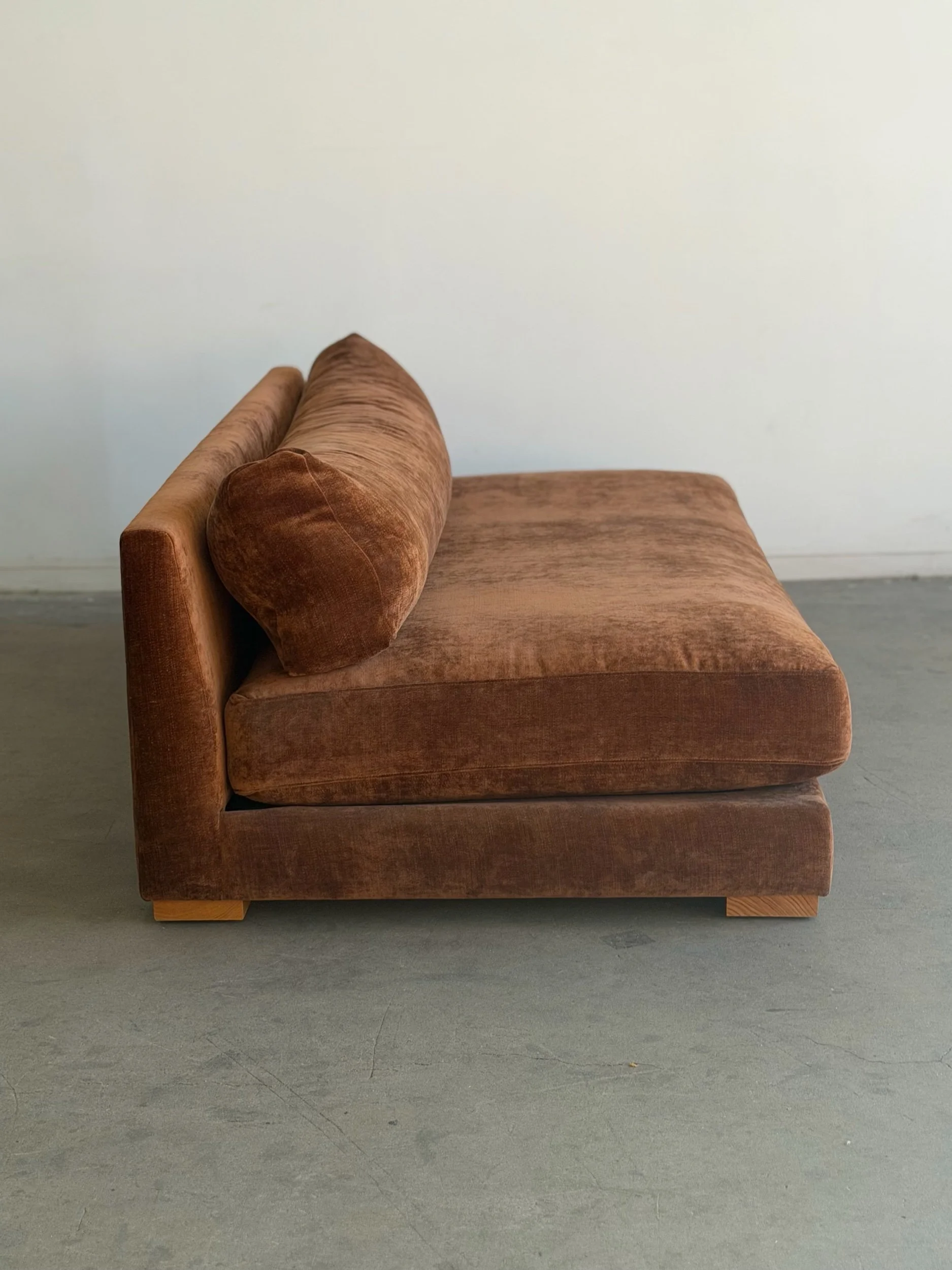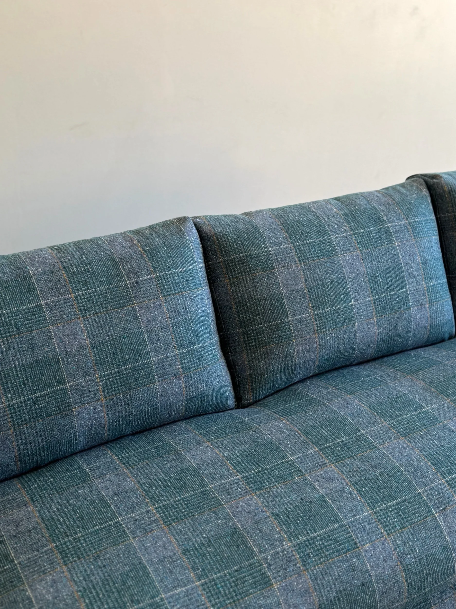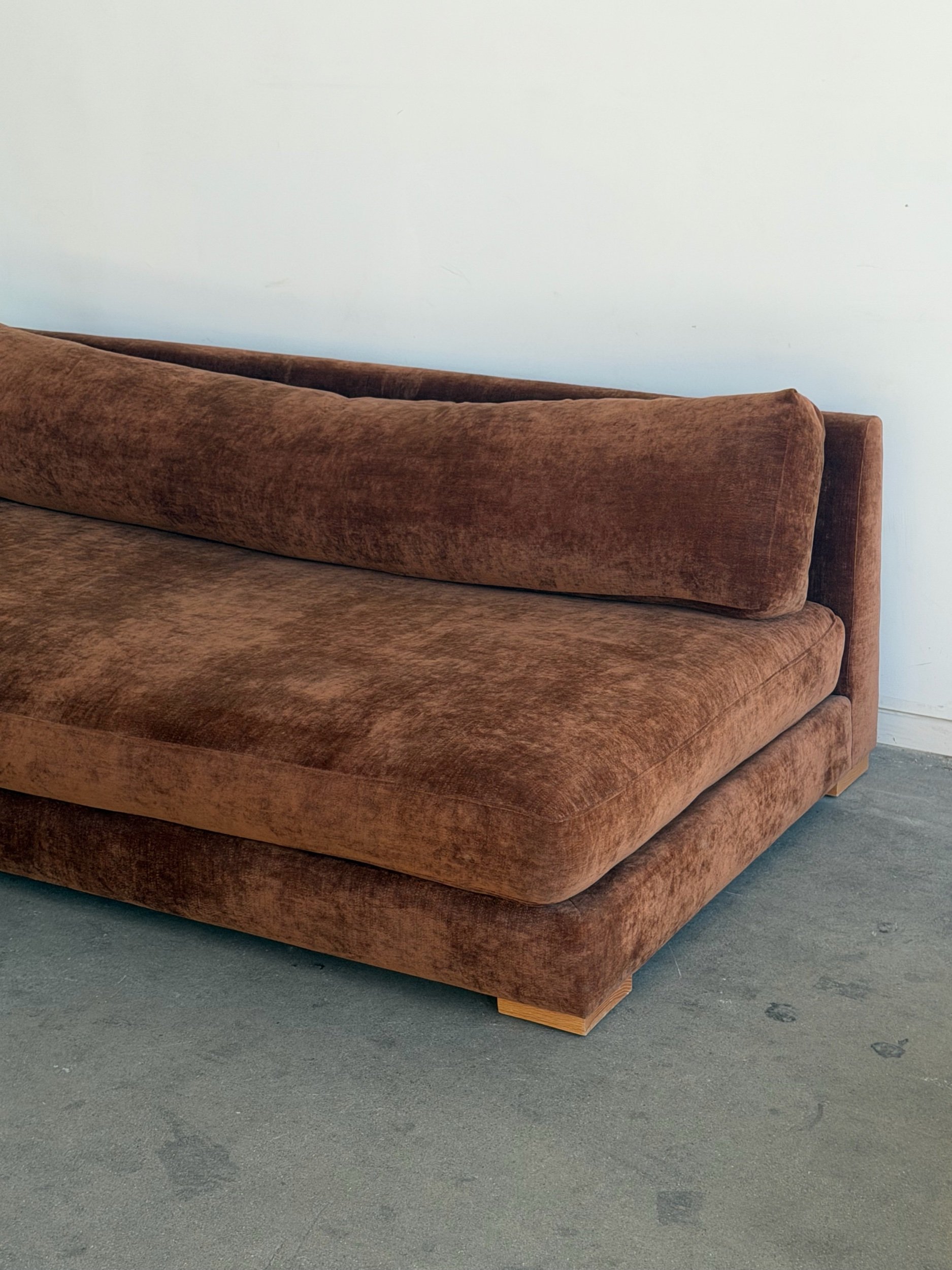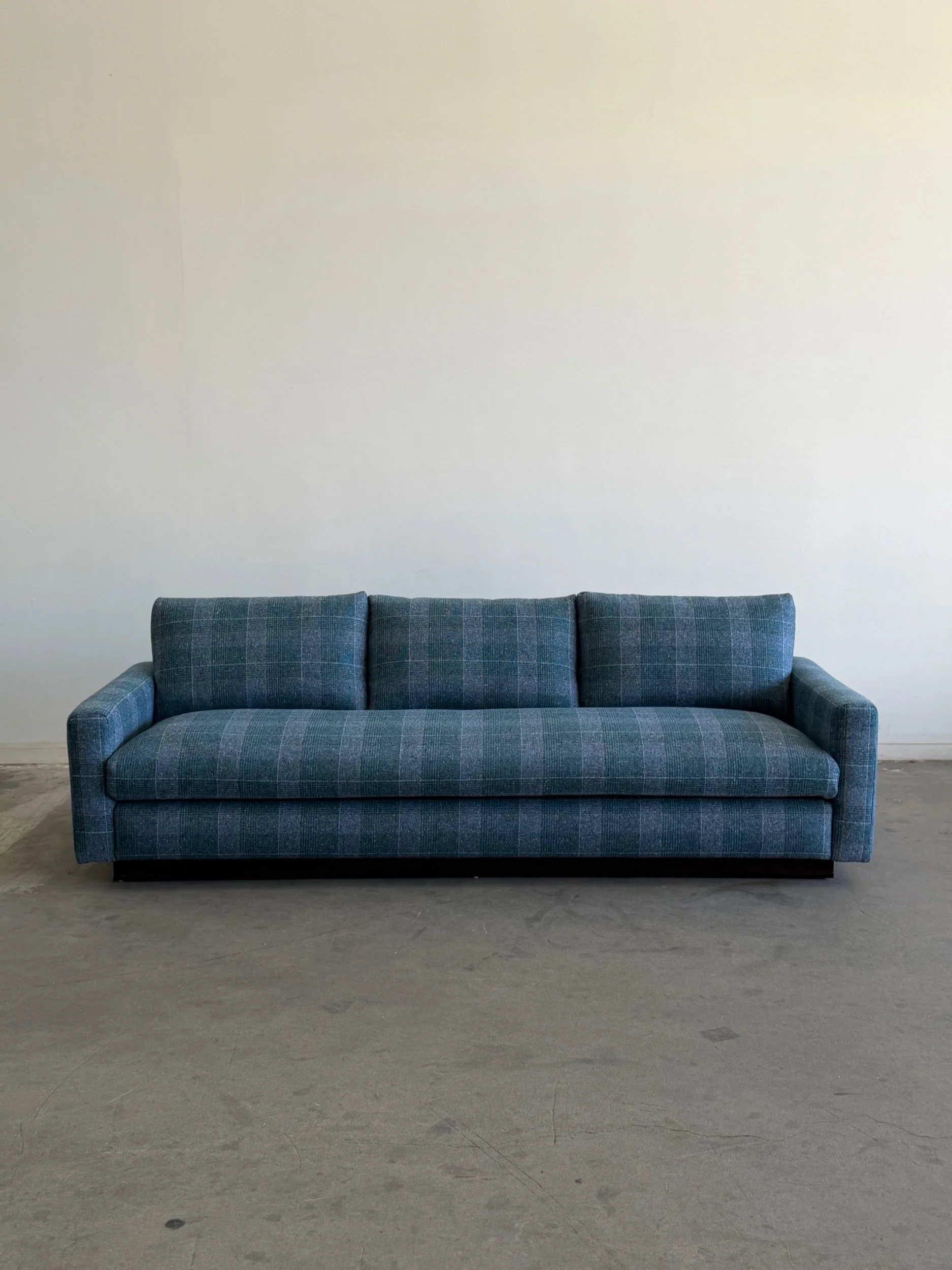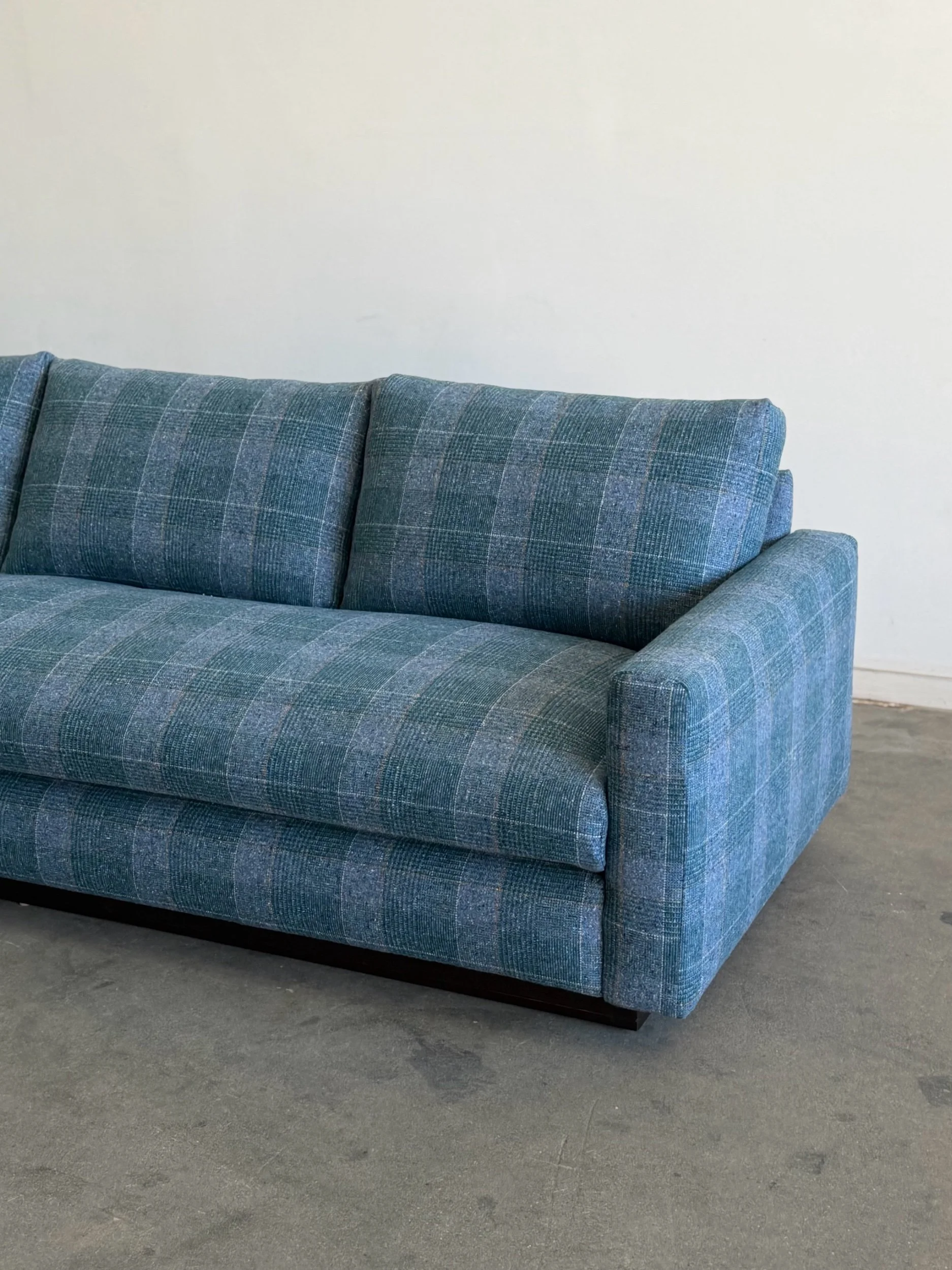 Fully restored sofa with fresh feather and foam mix. Unit features freshly refinished wooden plinth base. Base also has an added solid wooden cleat for added protection and durability.