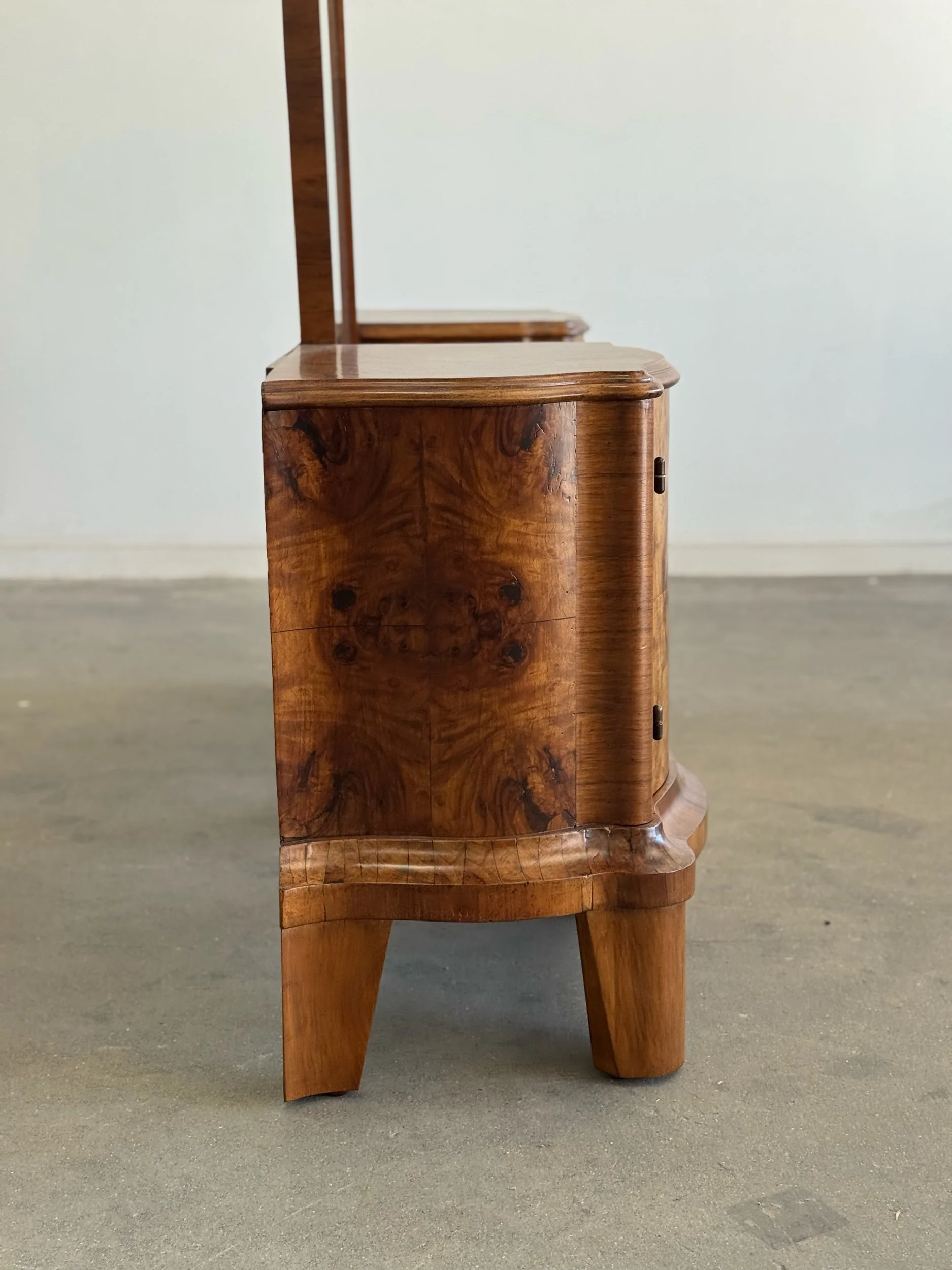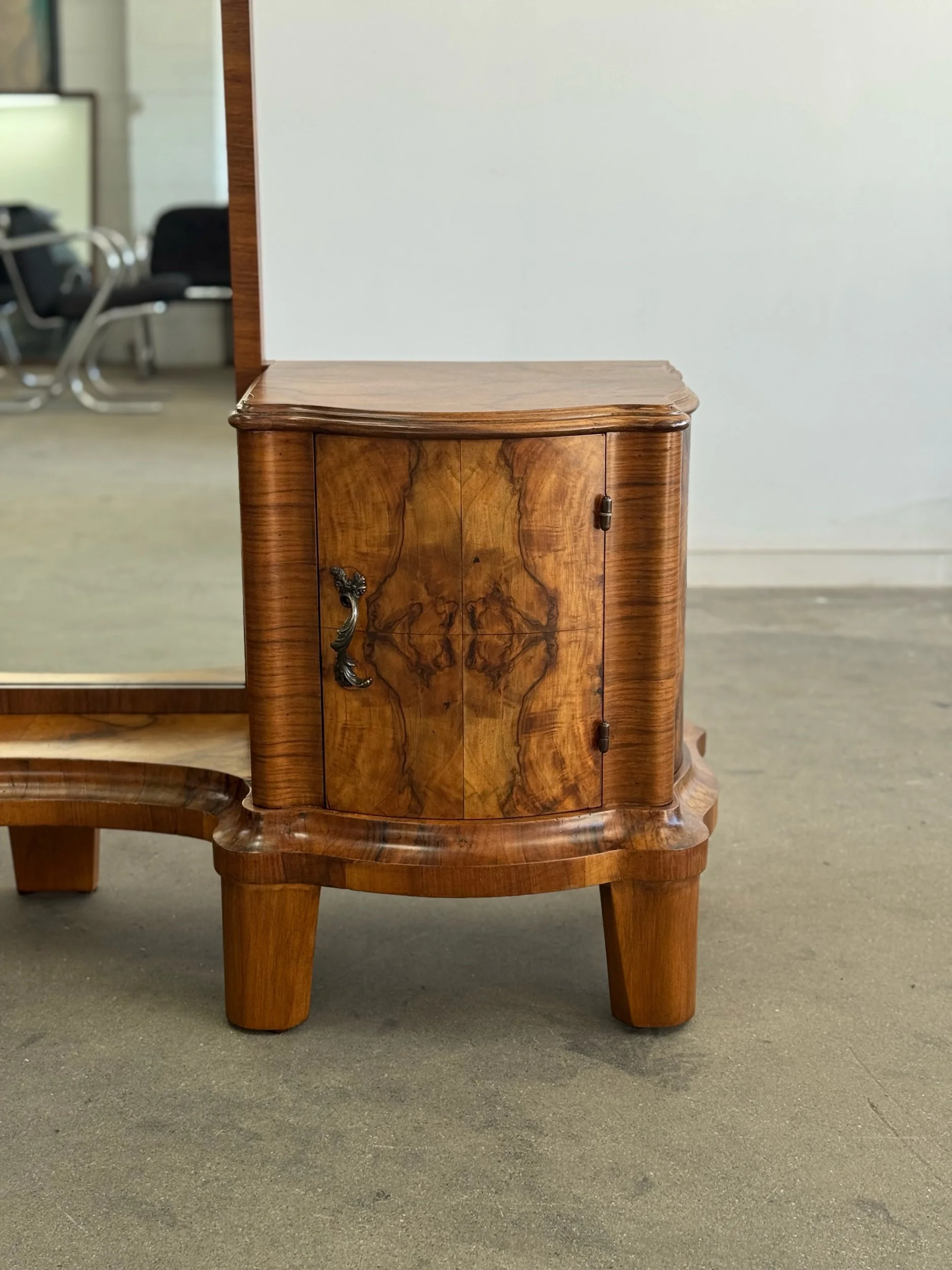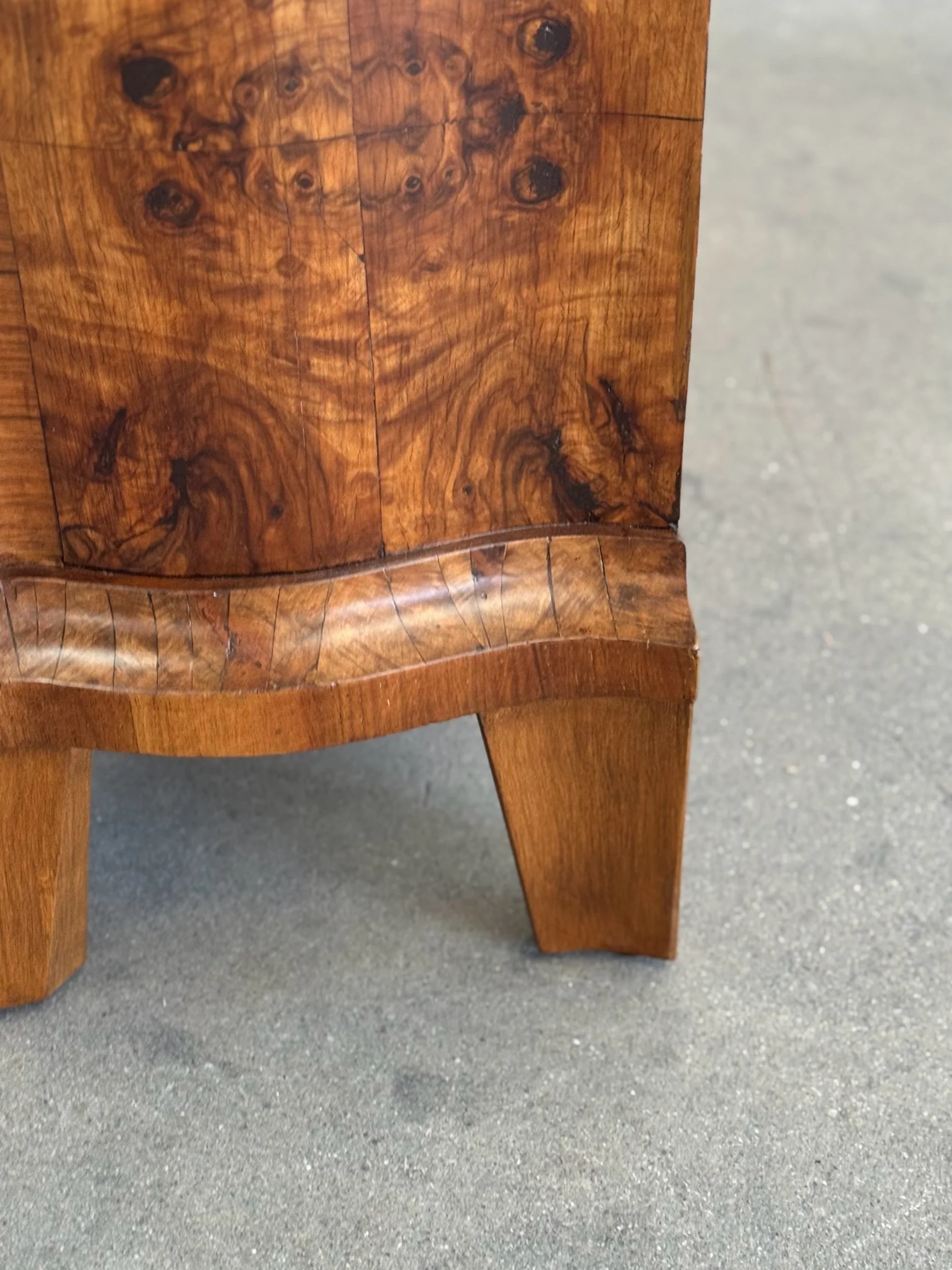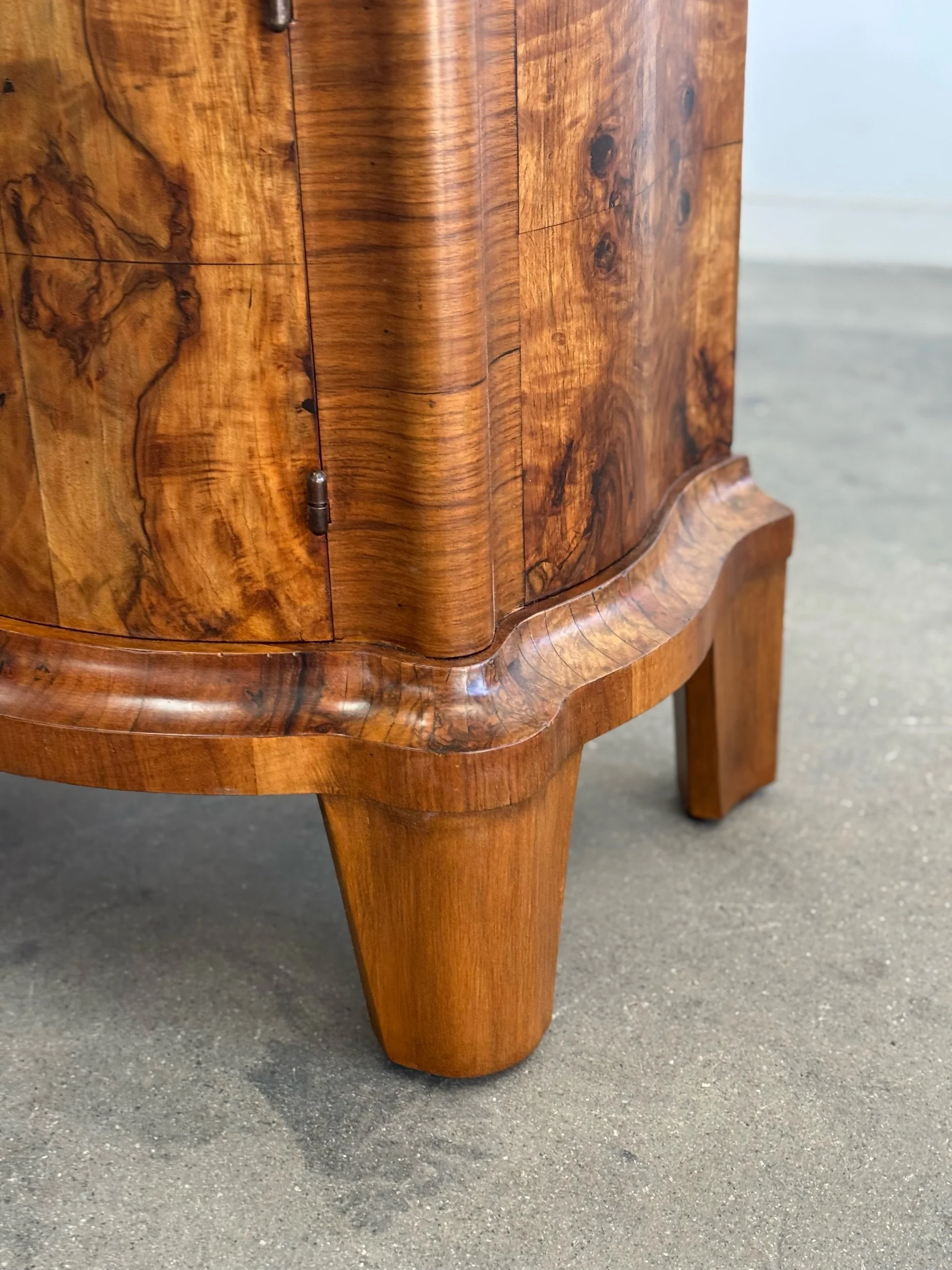 The distinctive swirling grain of the burl wood is a characteristic of the Art Deco era along with its curved shapes and geometric details. Thoughtfully restored, this unit features a new base with new legs to match the Art Deco style. This unit stands in amazing shape structurally and aesthetically.