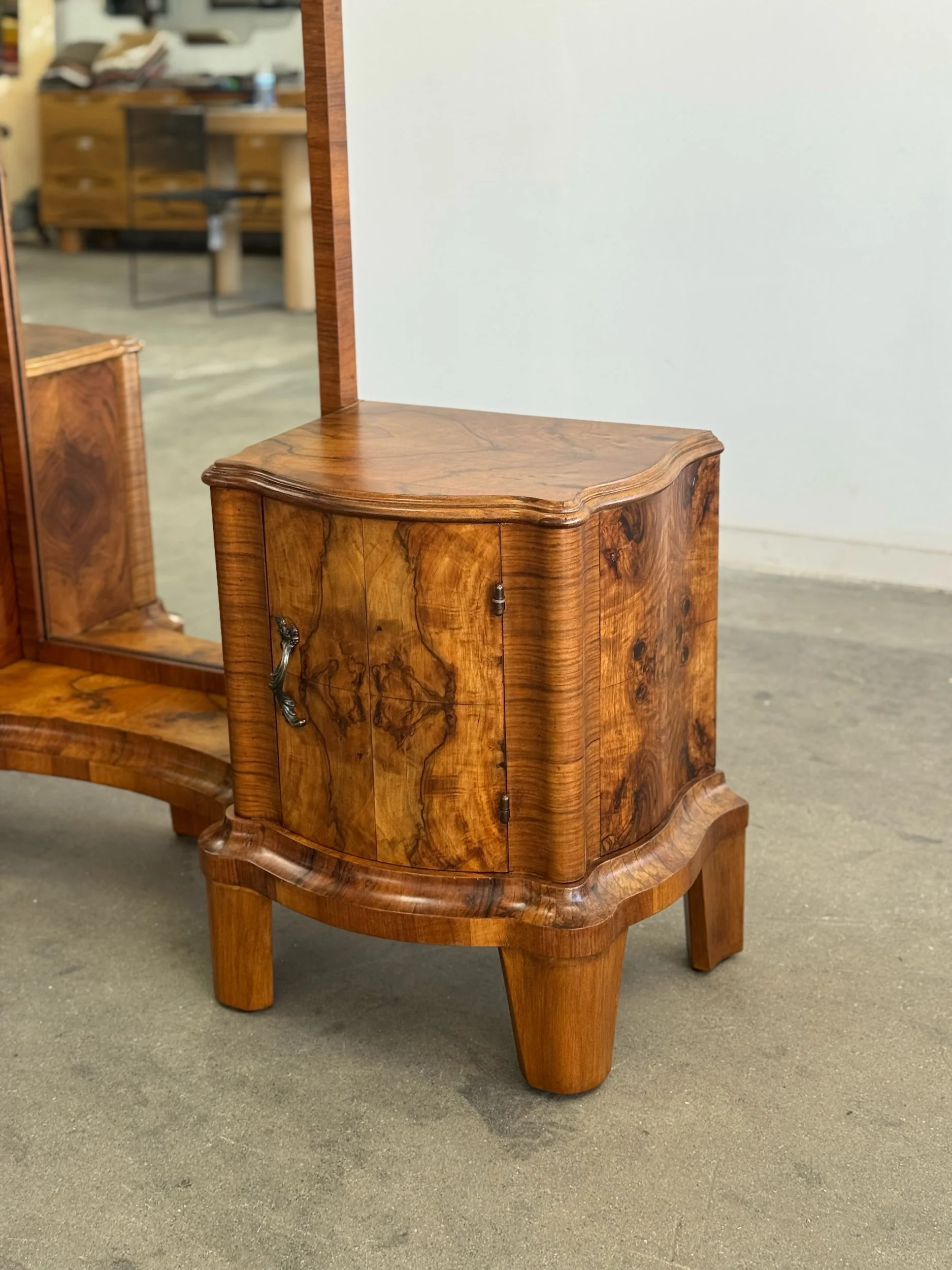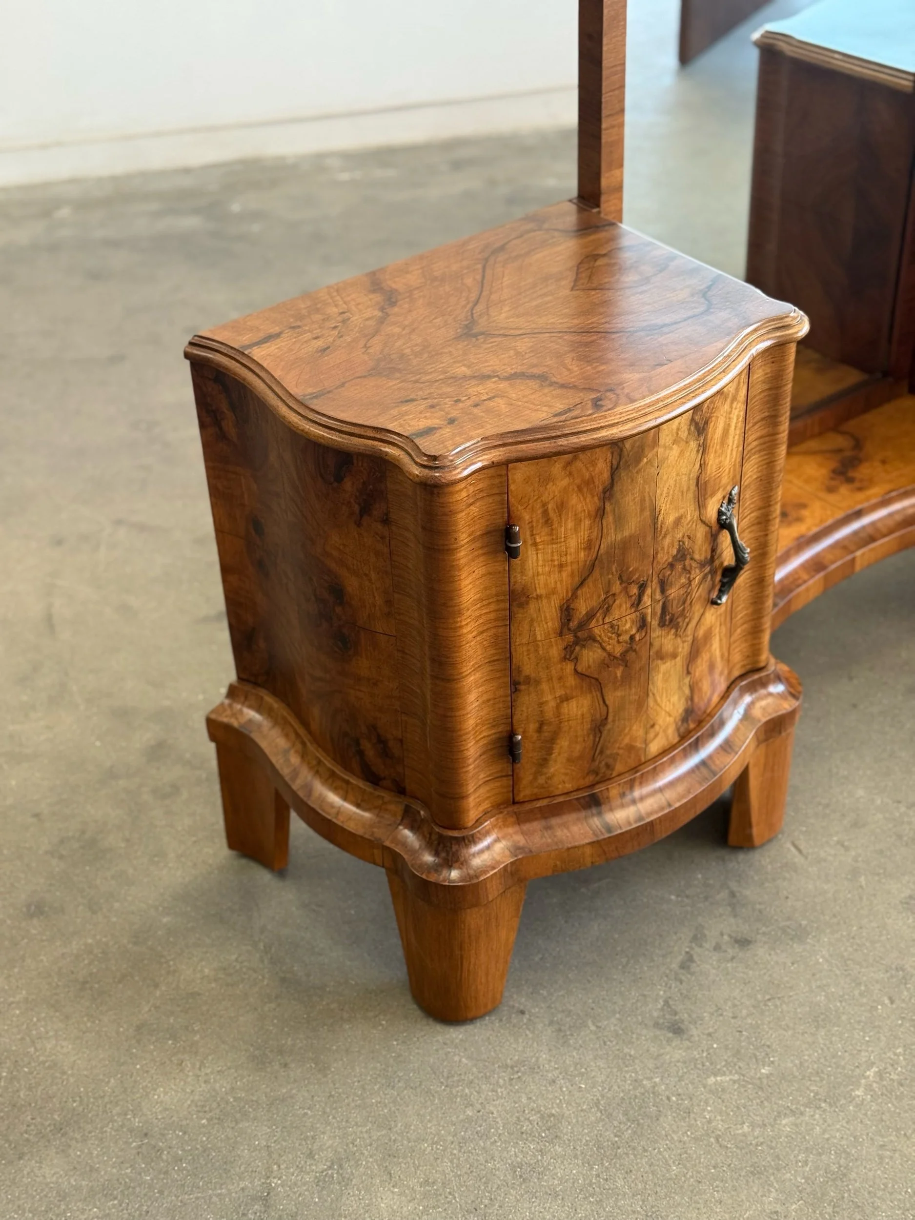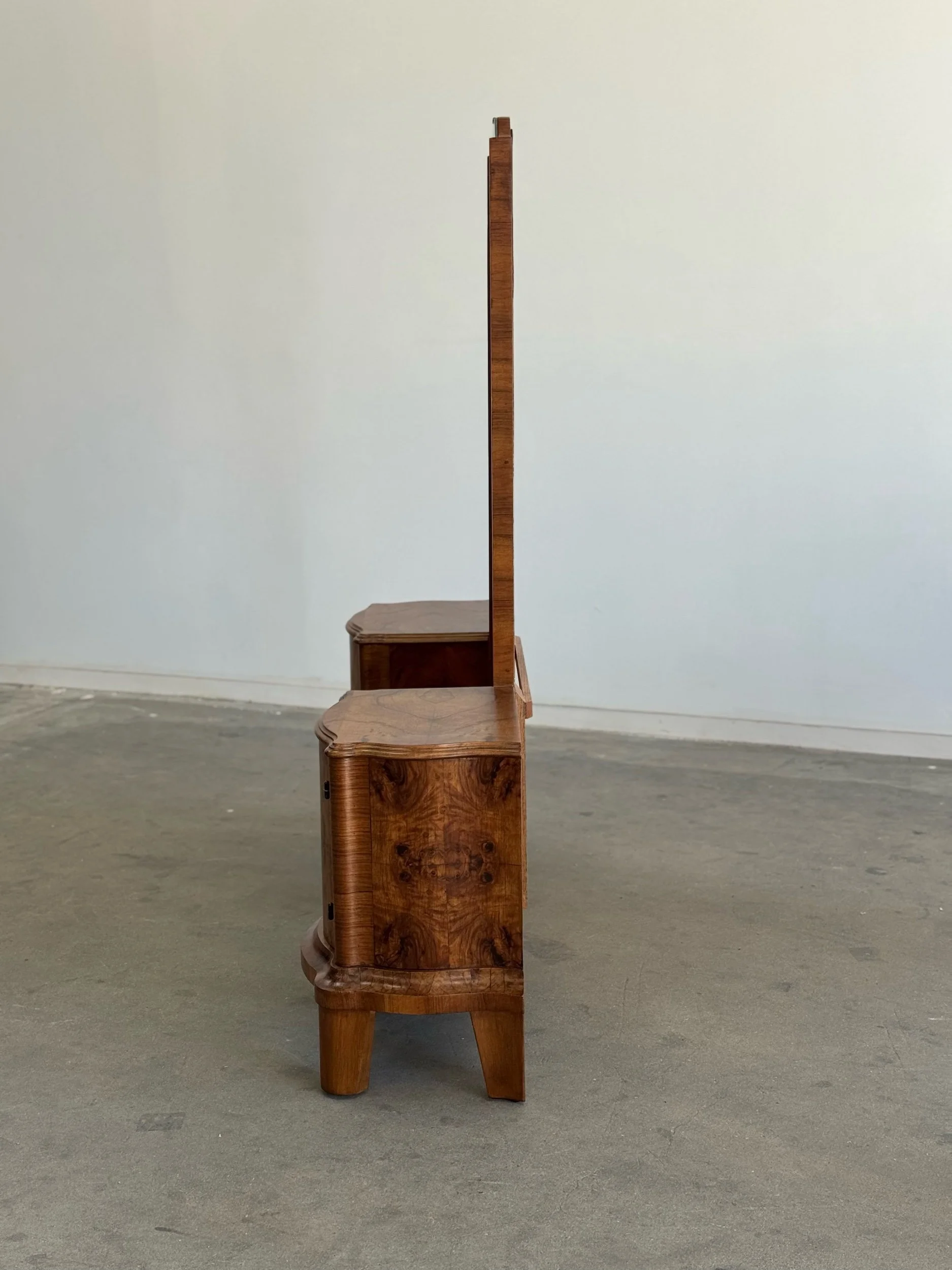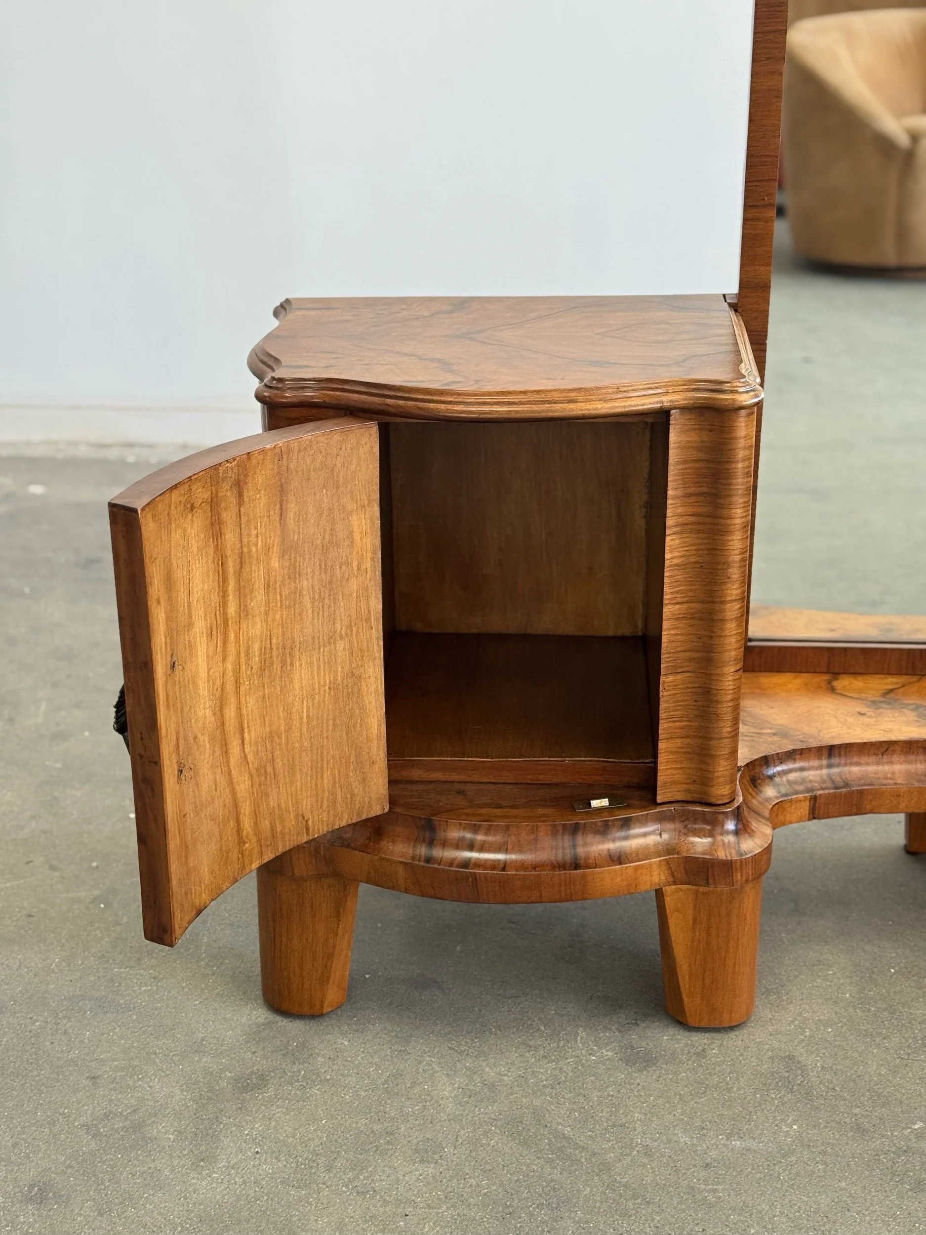 The distinctive swirling grain of the burl wood is a characteristic of the Art Deco era along with its curved shapes and geometric details. Thoughtfully restored, this unit features a new base with new legs to match the Art Deco style. This unit stands in amazing shape structurally and aesthetically.