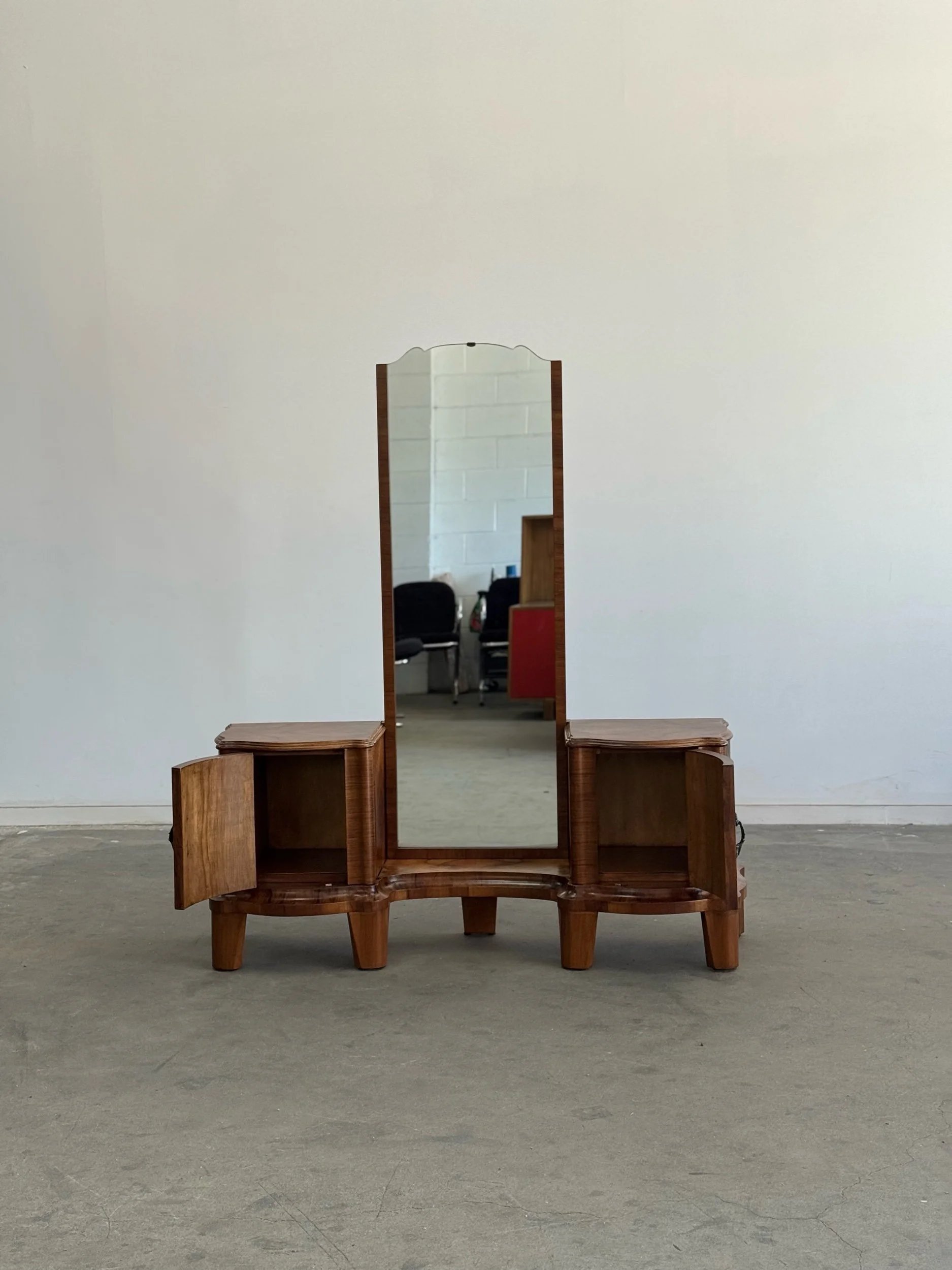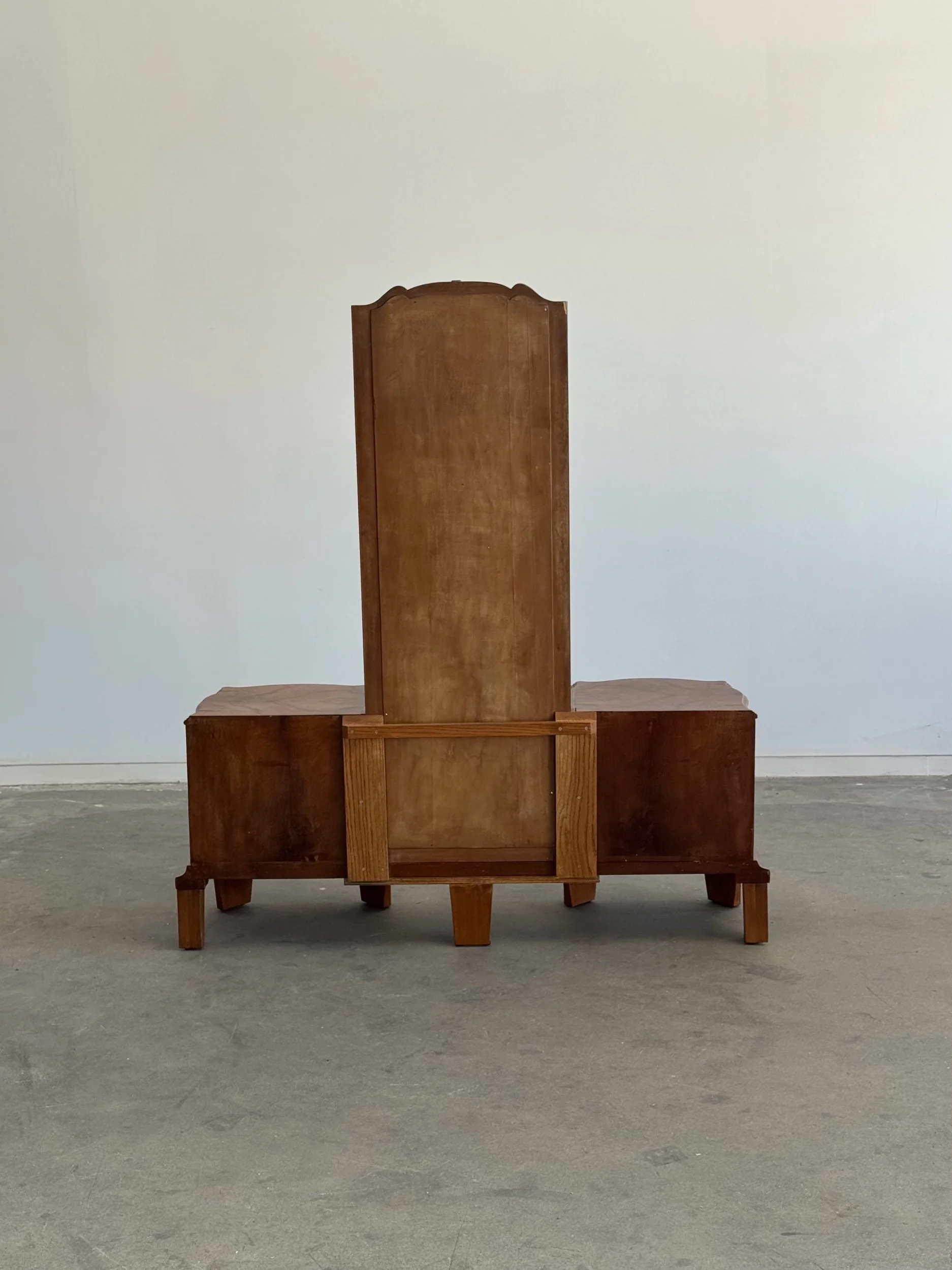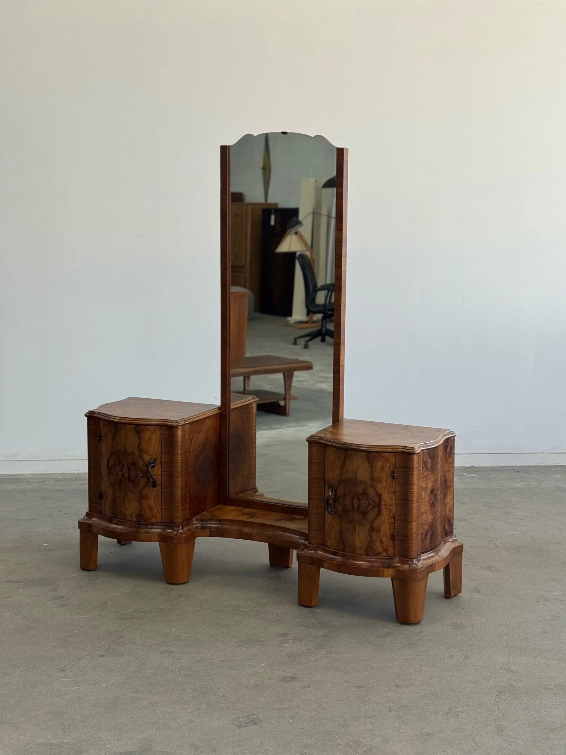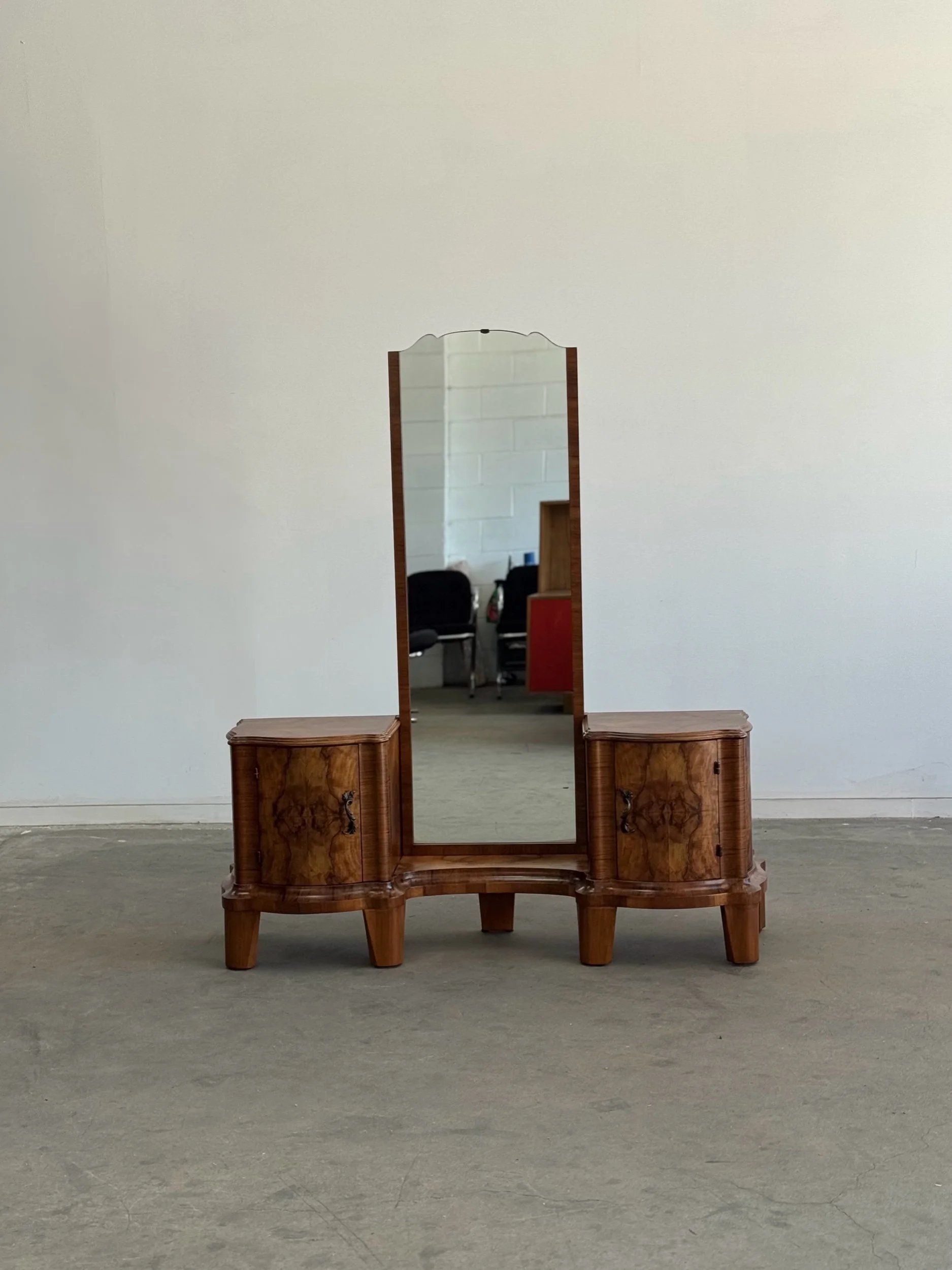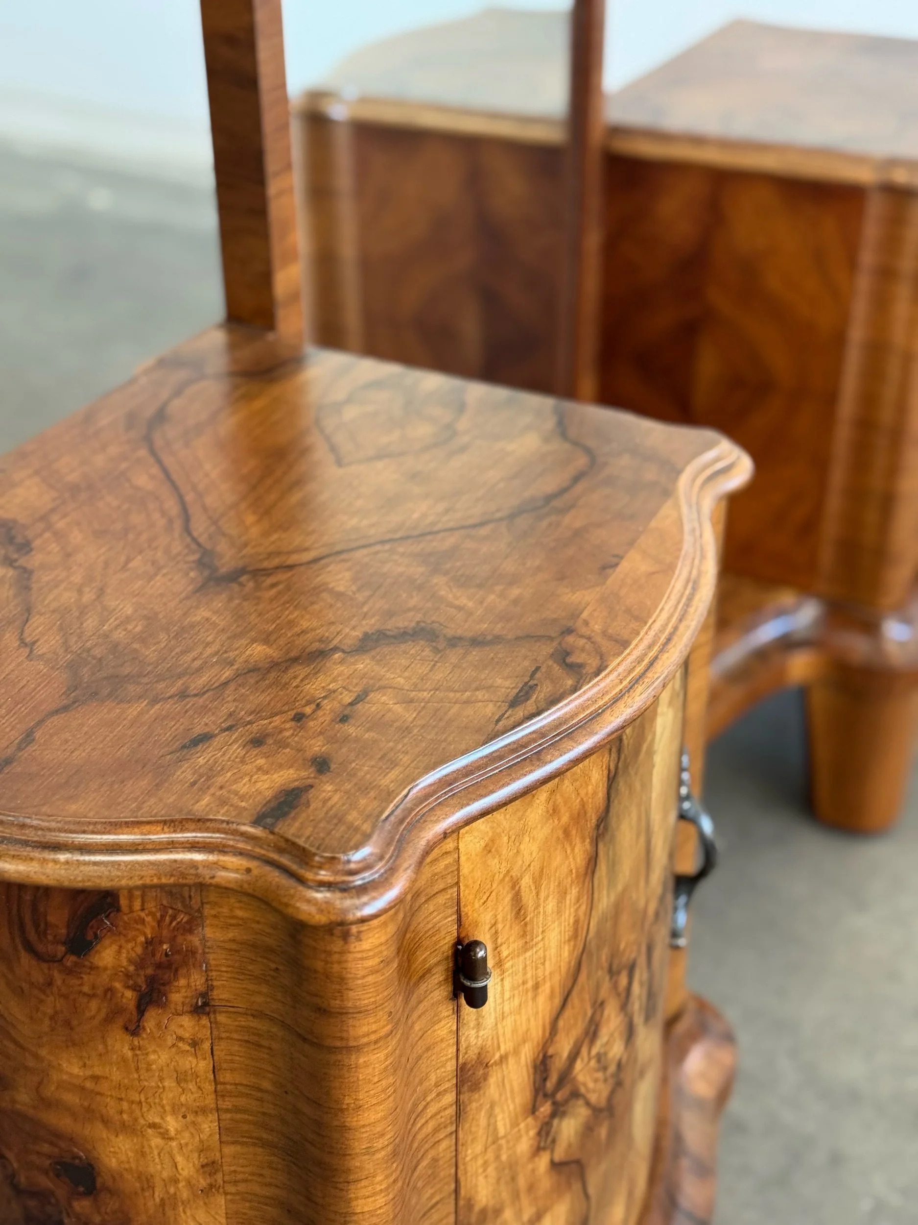 The distinctive swirling grain of the burl wood is a characteristic of the Art Deco era along with its curved shapes and geometric details. Thoughtfully restored, this unit features a new base with new legs to match the Art Deco style. This unit stands in amazing shape structurally and aesthetically.