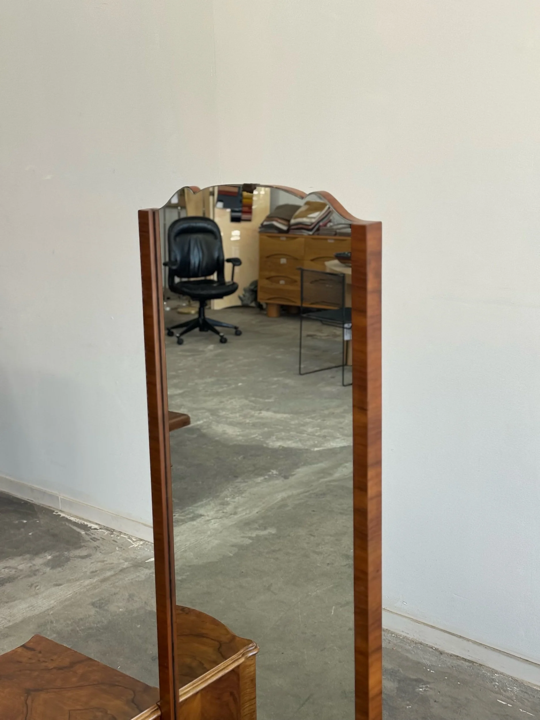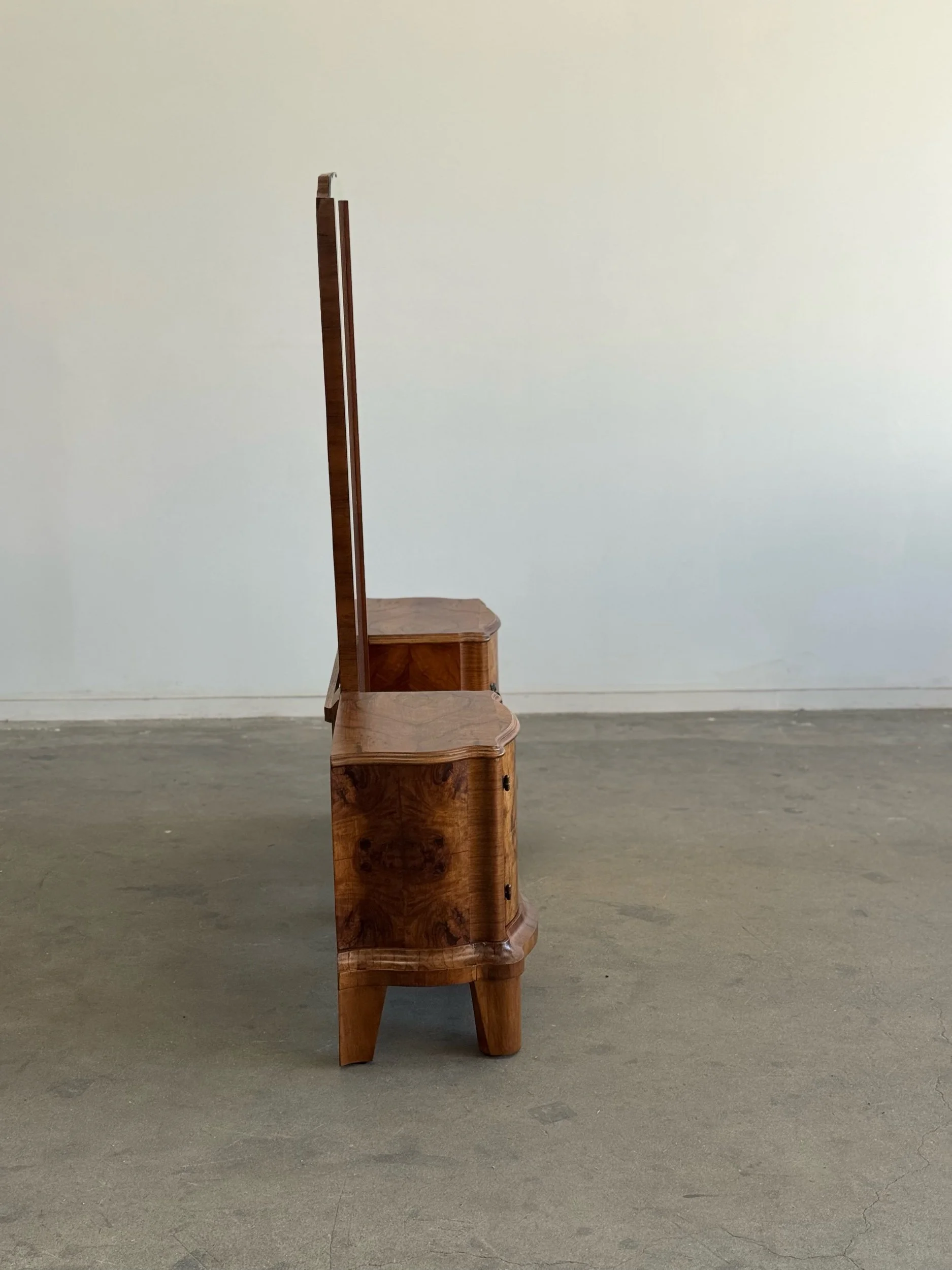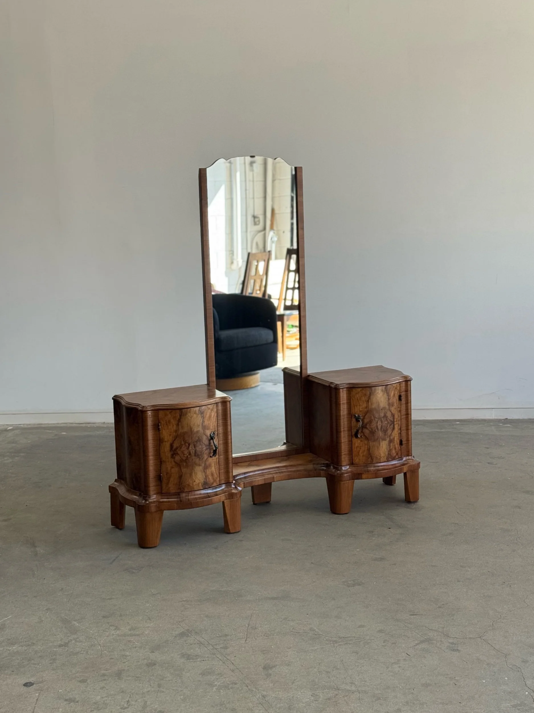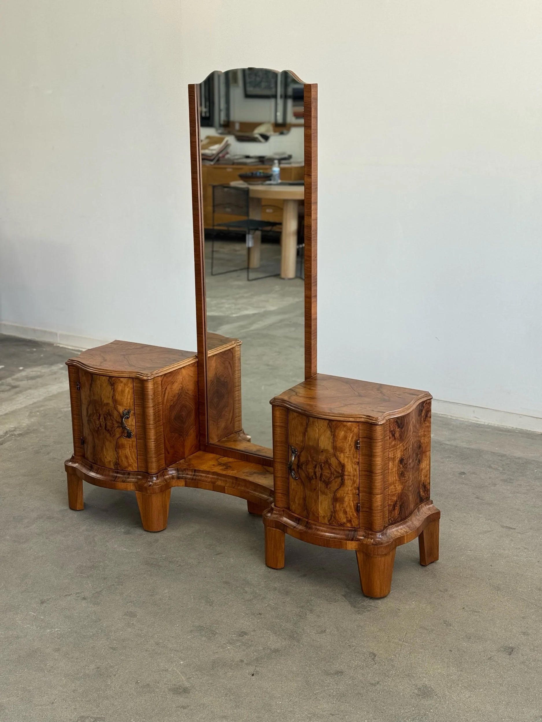 The distinctive swirling grain of the burl wood is a characteristic of the Art Deco era along with its curved shapes and geometric details. Thoughtfully restored, this unit features a new base with new legs to match the Art Deco style. This unit stands in amazing shape structurally and aesthetically.