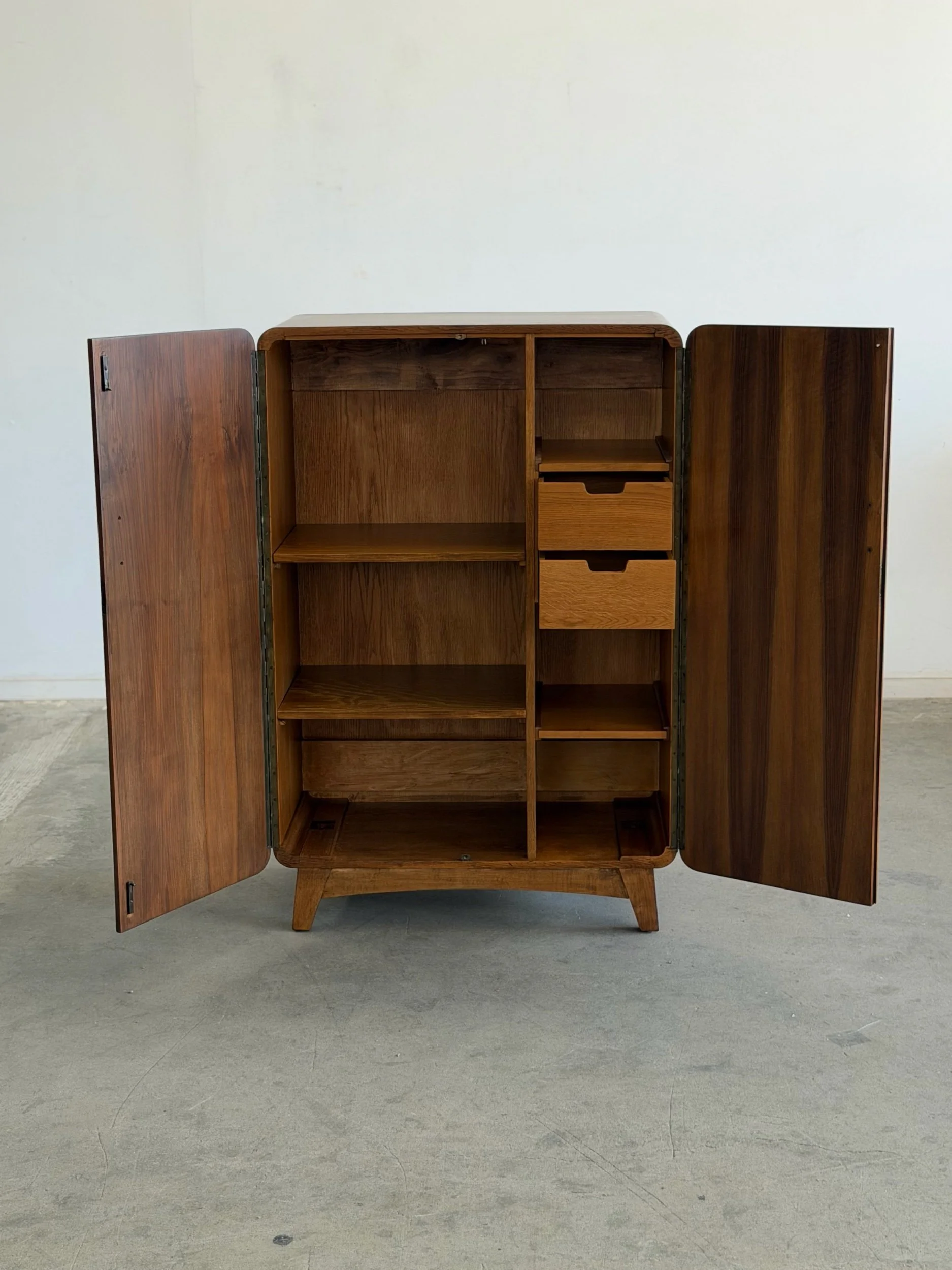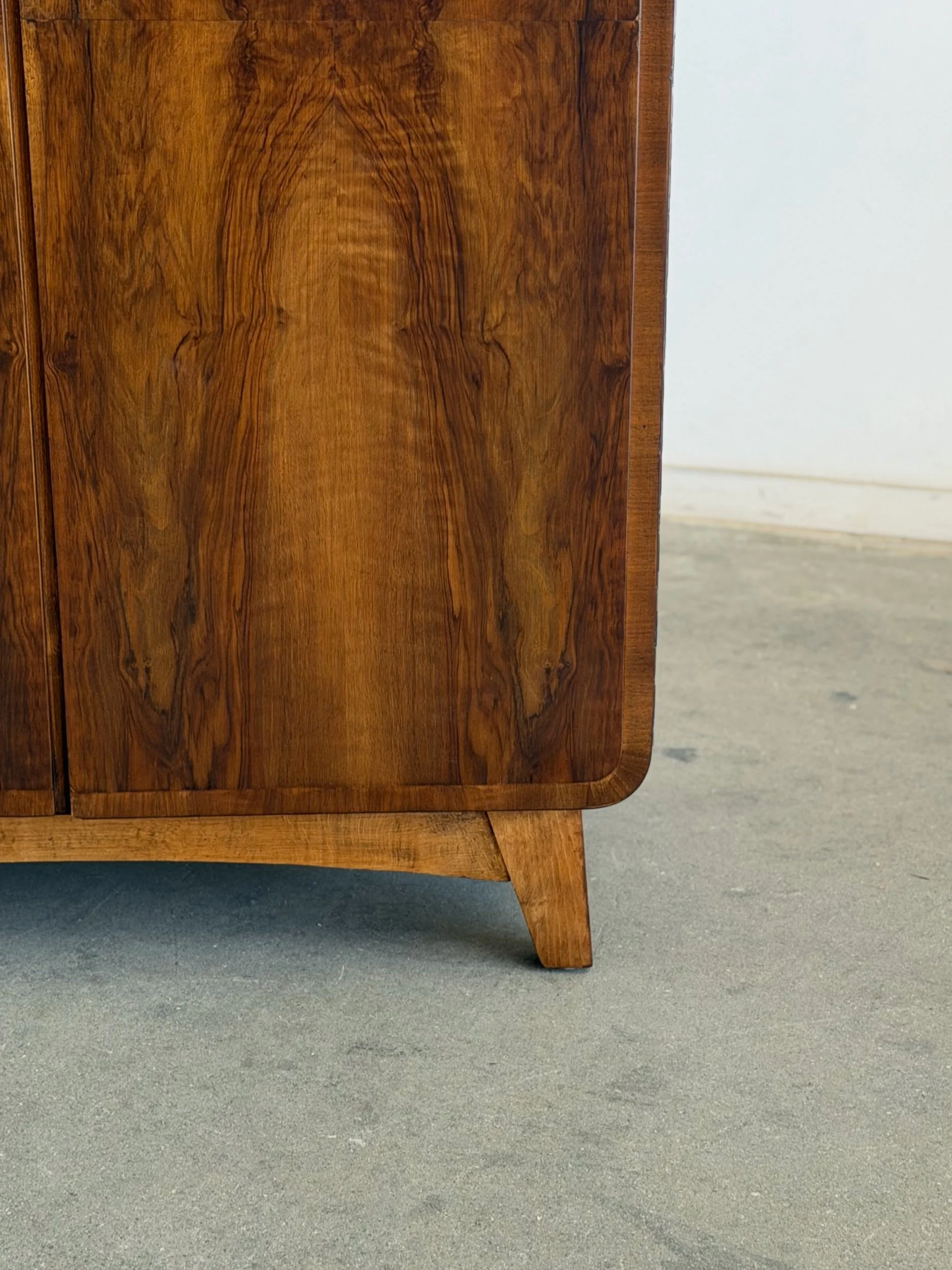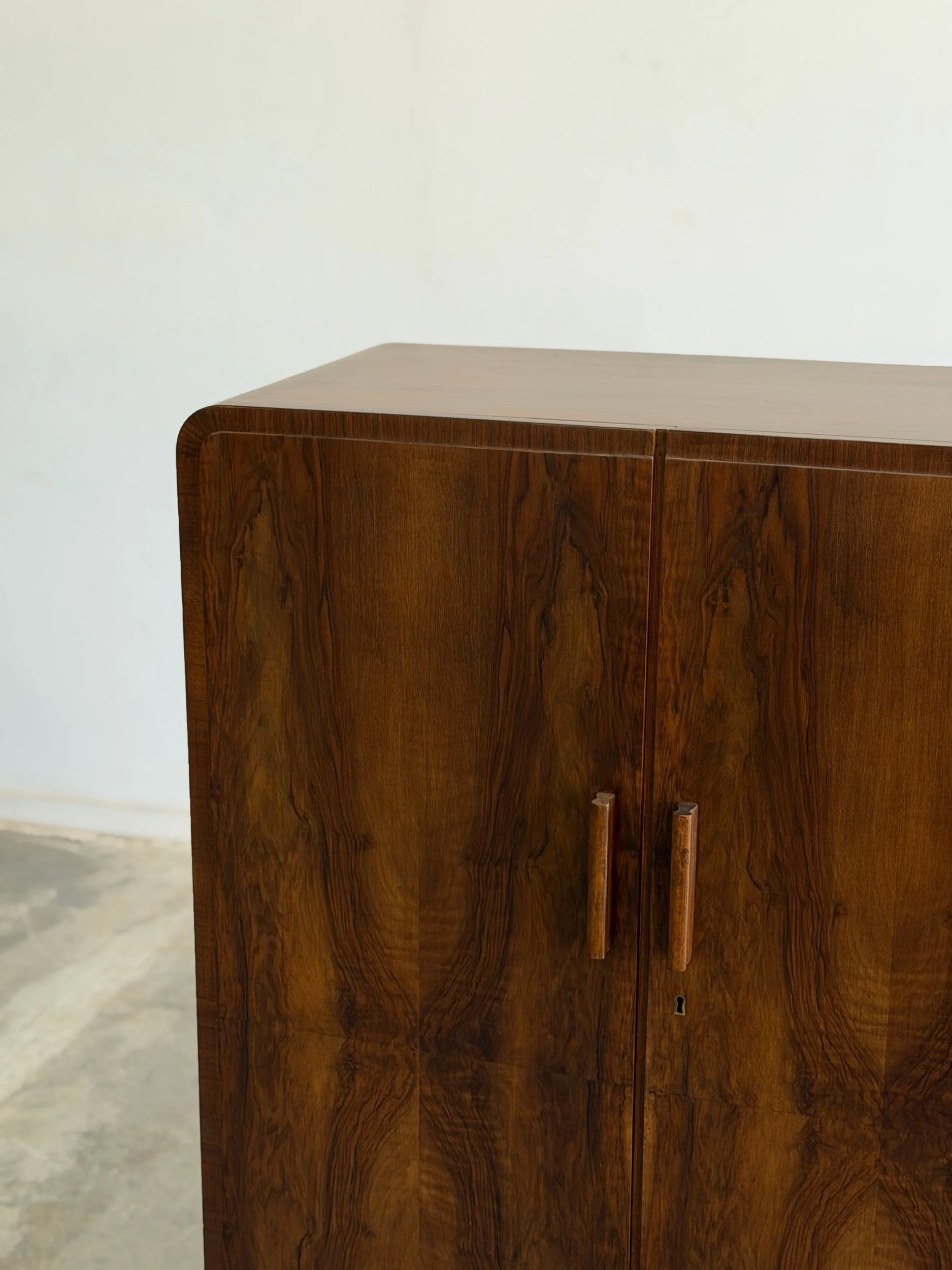 Fully restored 1950’s walnut wood wardrobe elevated with shelving for ample storage. Featuring book matched walnut veneers, creating a symmetrical, mirror grained pattern. Crafted in the European Functionalism period this unit brings a piece of history.