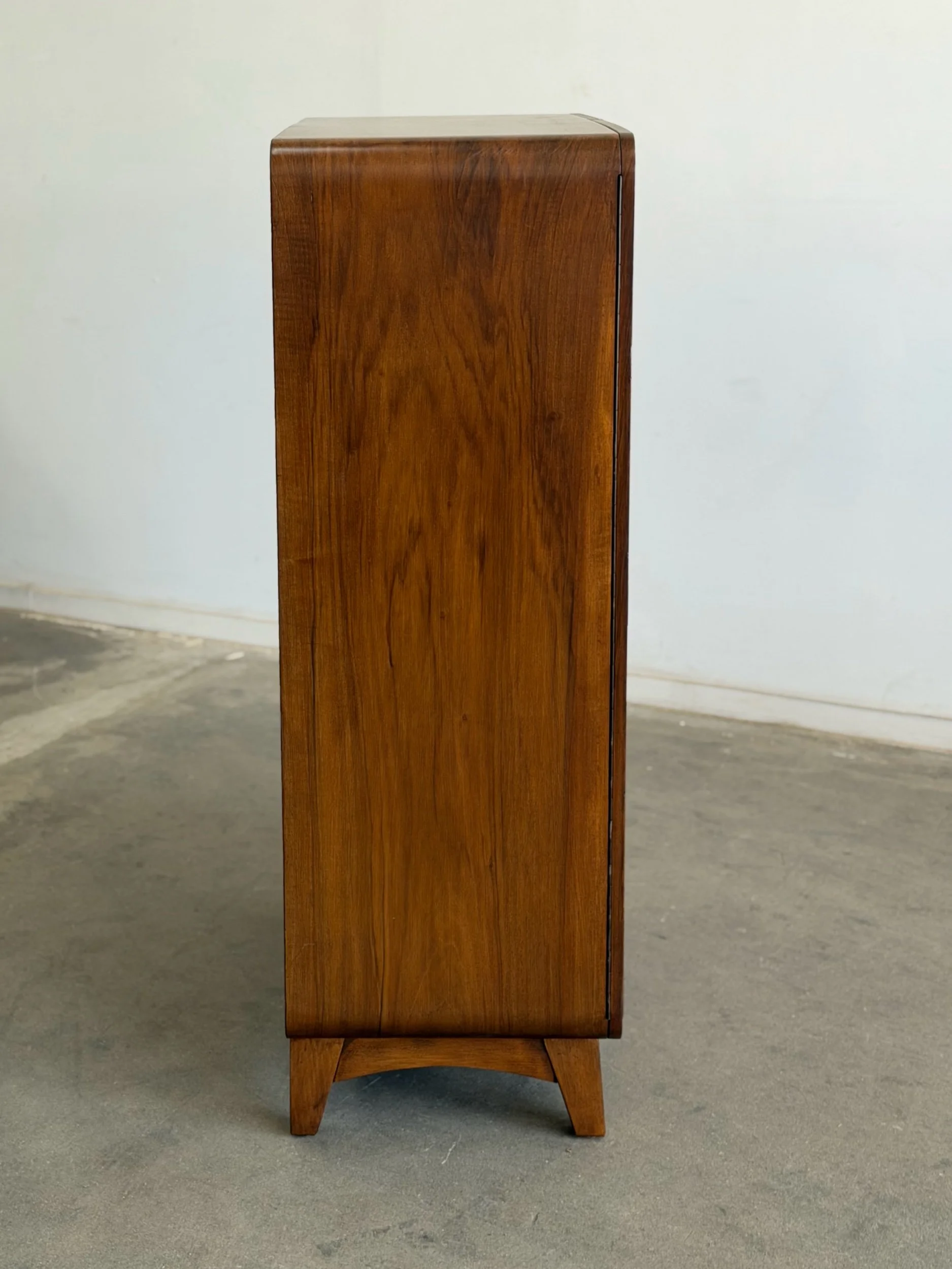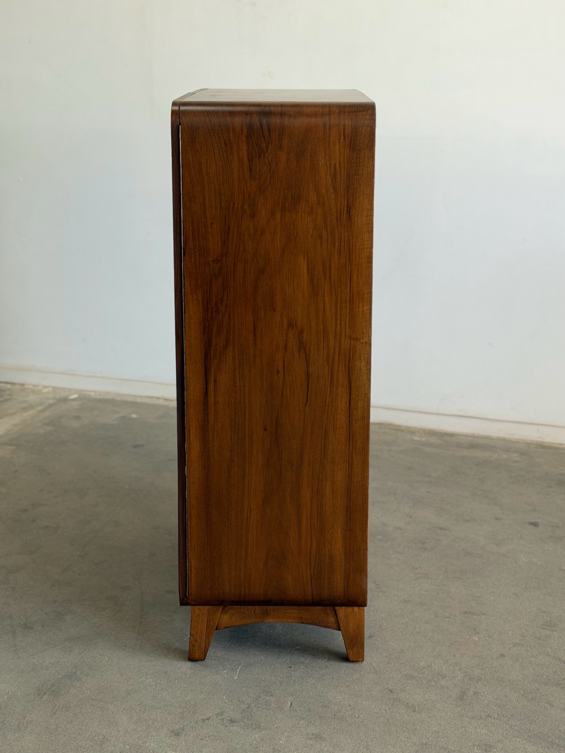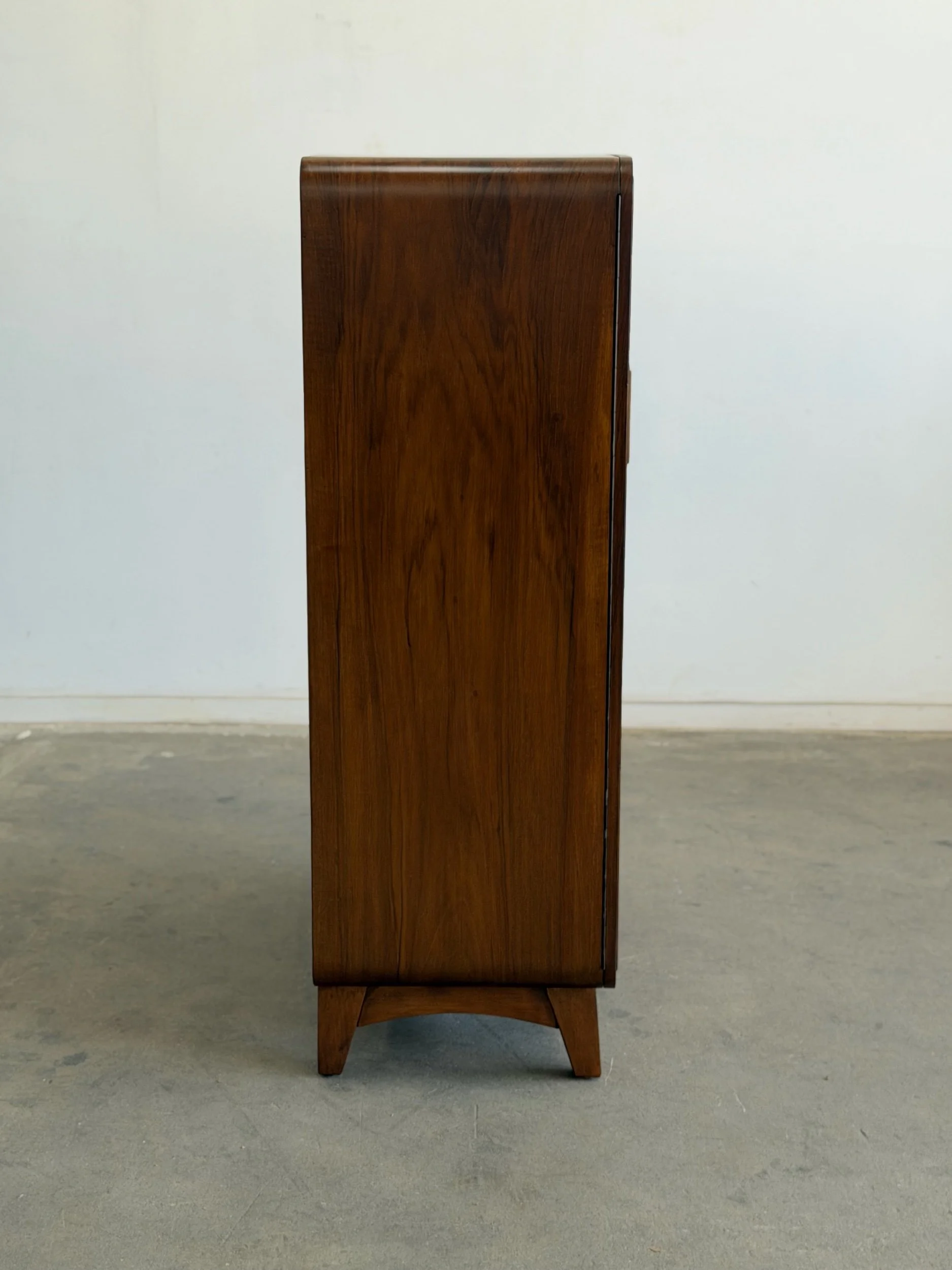 Fully restored 1950’s walnut wood wardrobe elevated with shelving for ample storage. Featuring book matched walnut veneers, creating a symmetrical, mirror grained pattern. Crafted in the European Functionalism period this unit brings a piece of history.