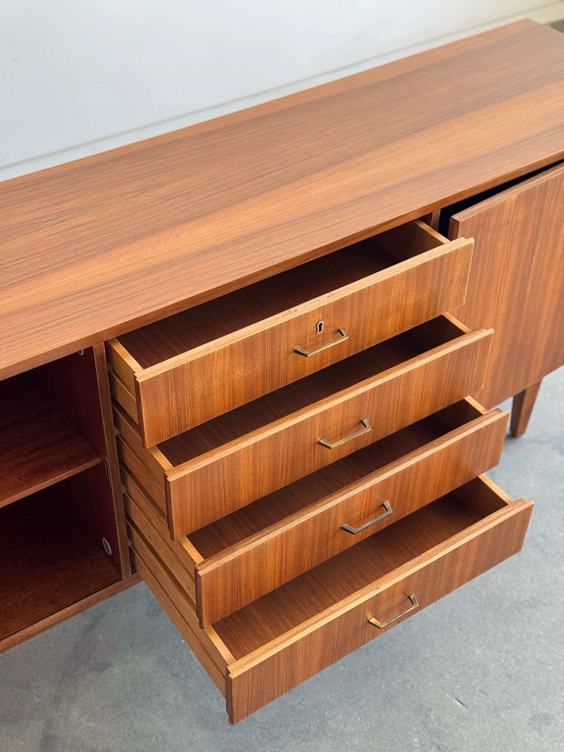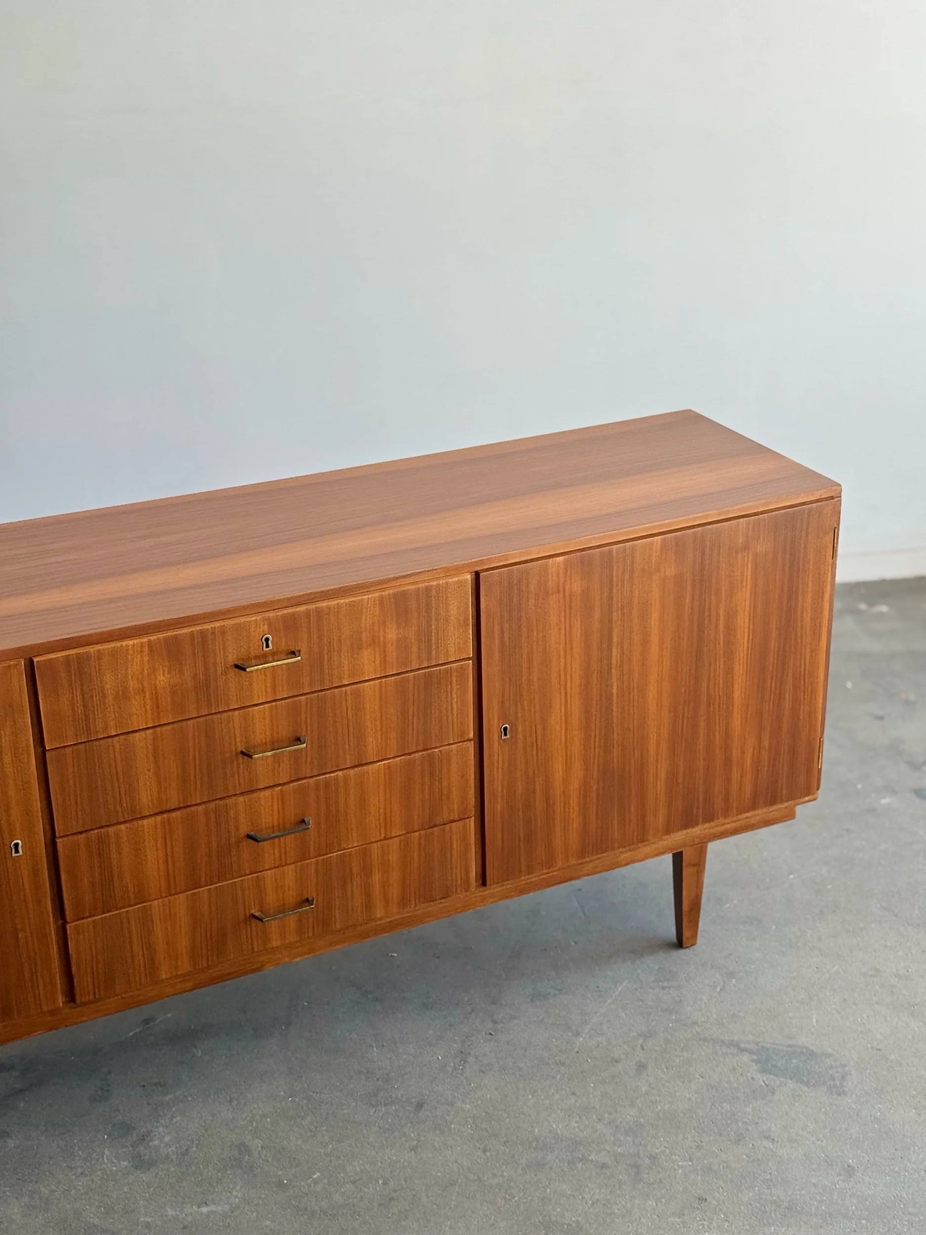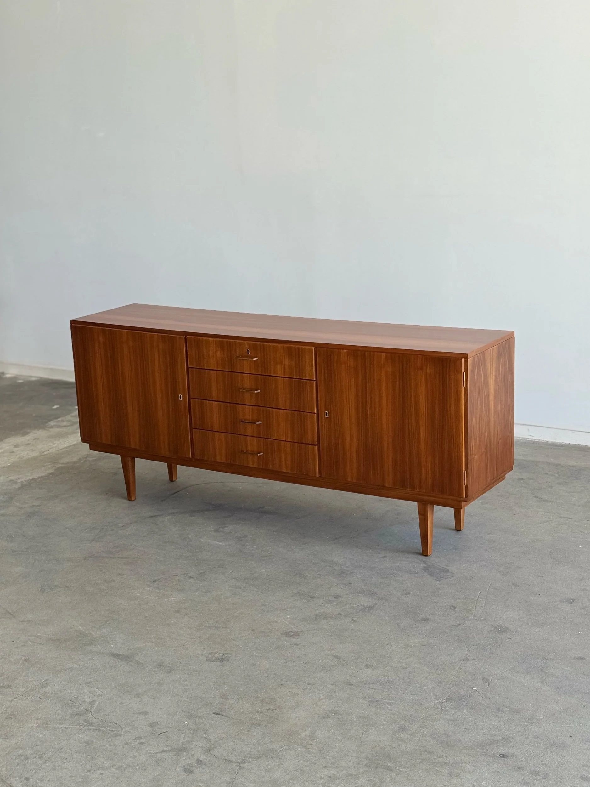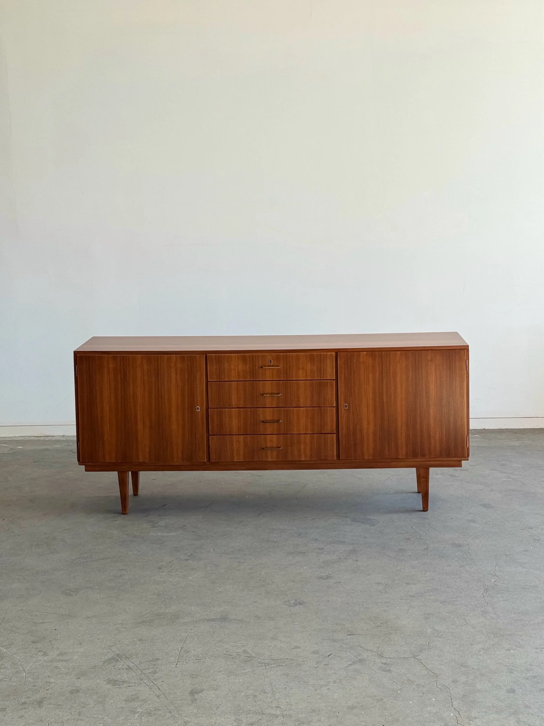Mid-century Danish teak credenza featuring lockable drawers and cabinets with key included. Characterized by its clean lines, tapered legs, and minimalist design, this credenza has been thoughtfully restored with no major areas of wear. New push magnets have been installed.