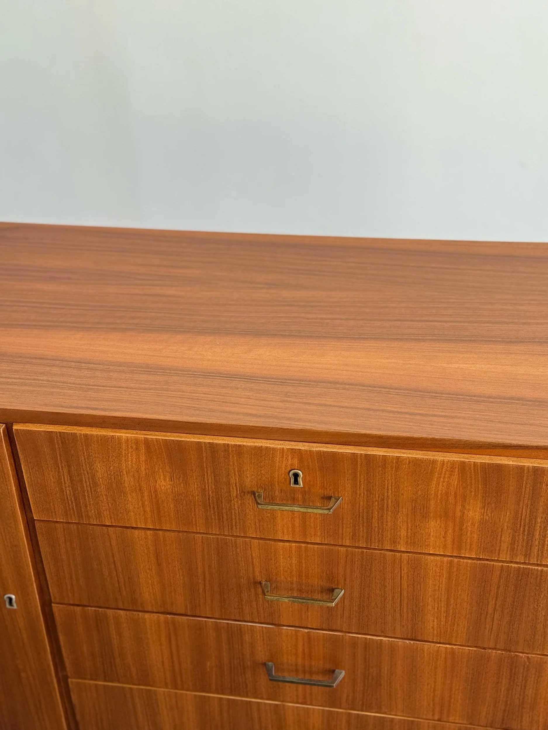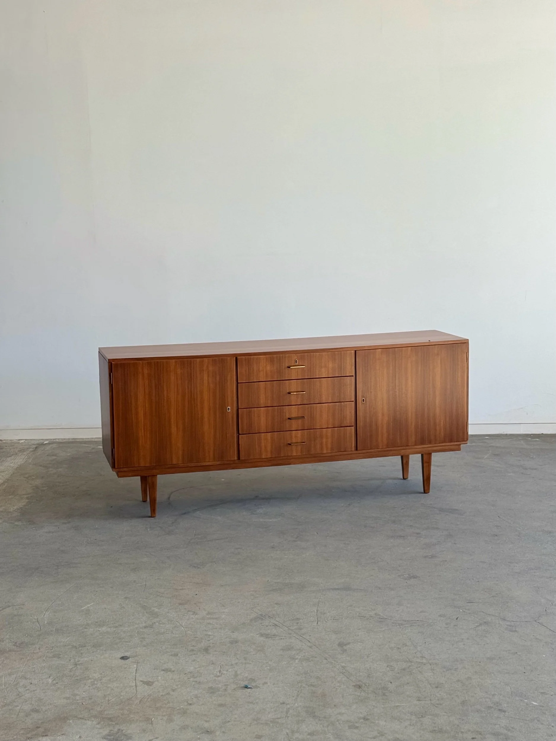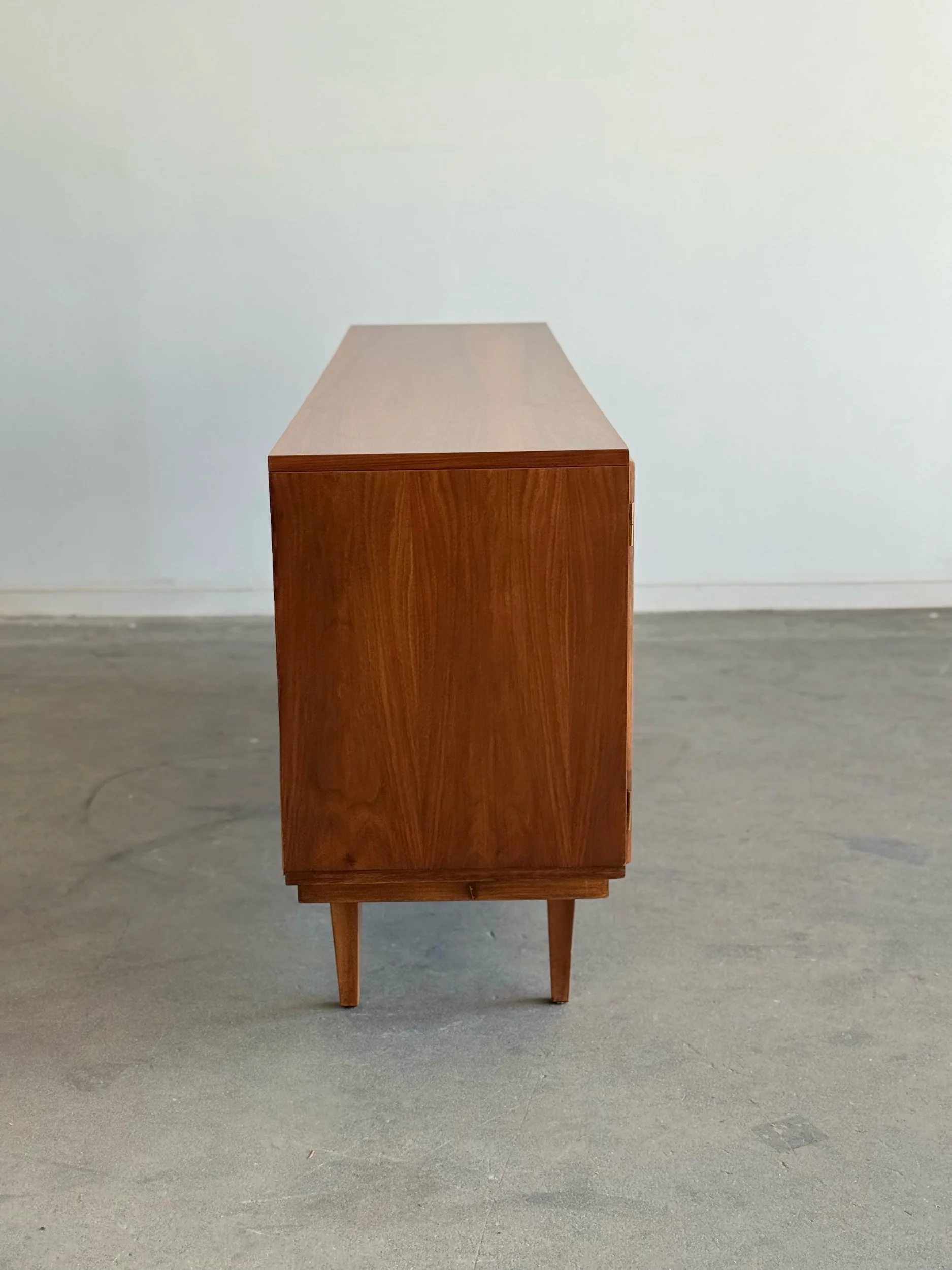 Mid-century Danish teak credenza featuring lockable drawers and cabinets with key included. Characterized by its clean lines, tapered legs, and minimalist design, this credenza has been thoughtfully restored with no major areas of wear. New push magnets have been installed.