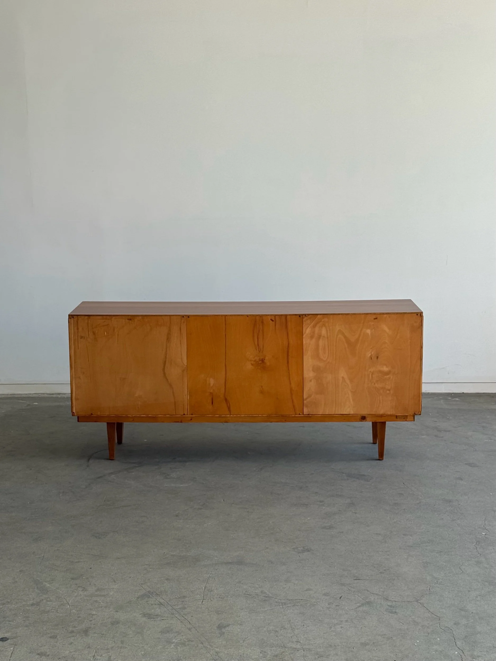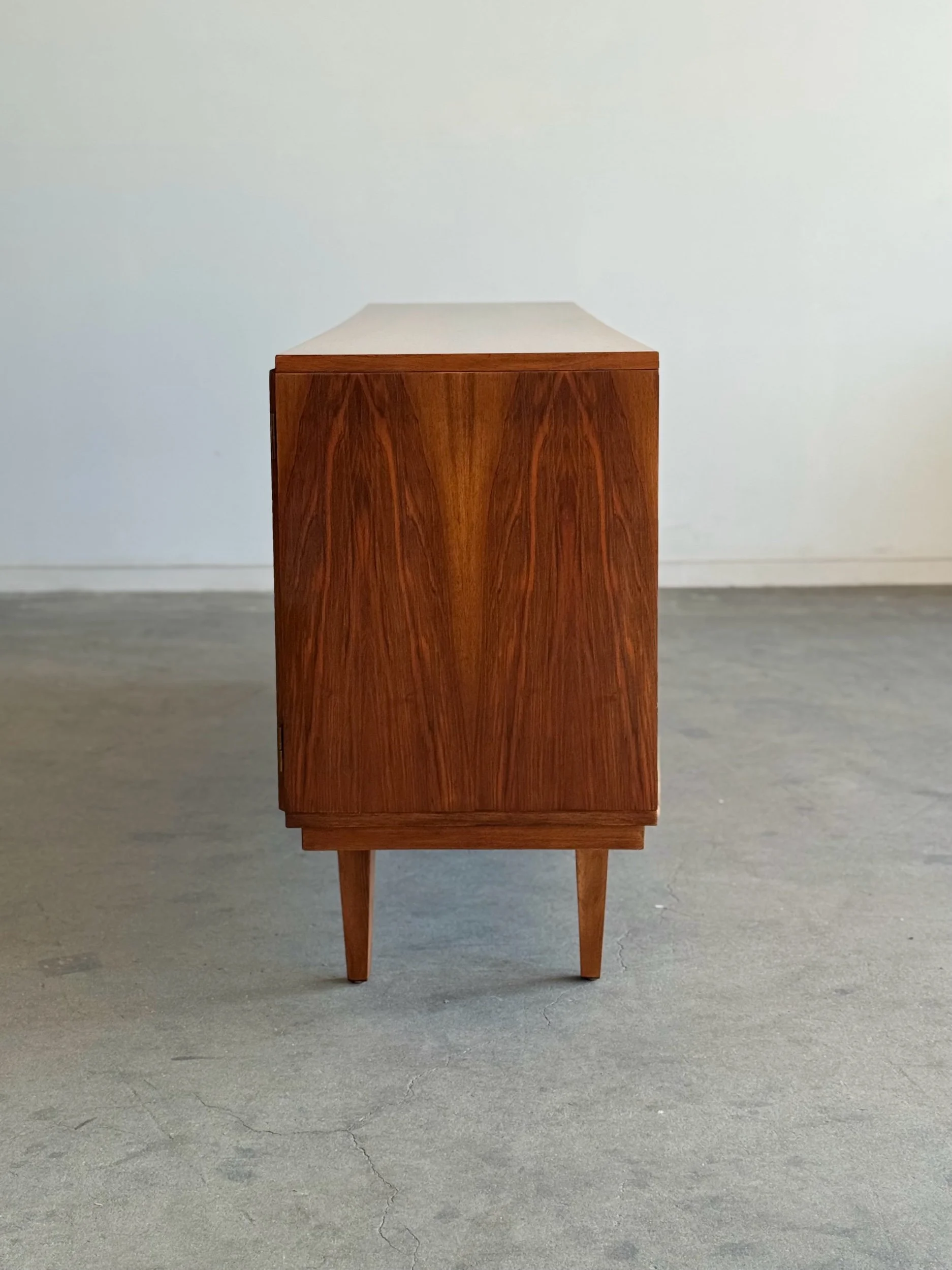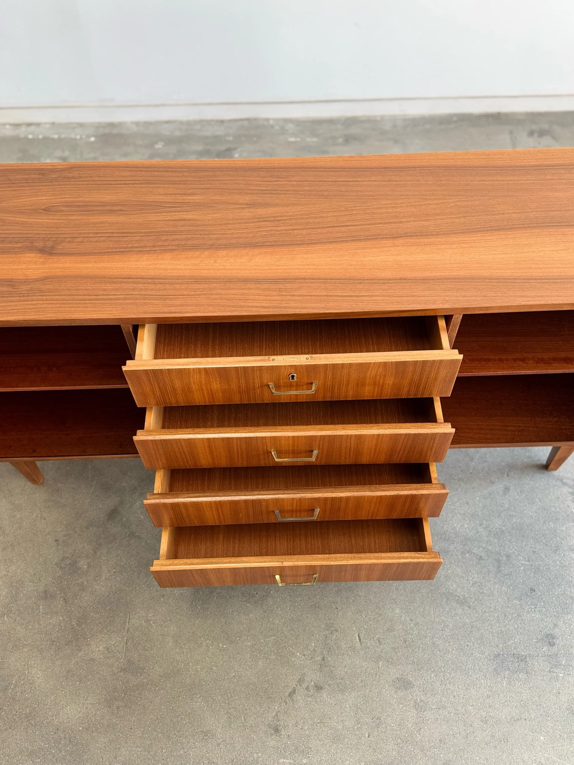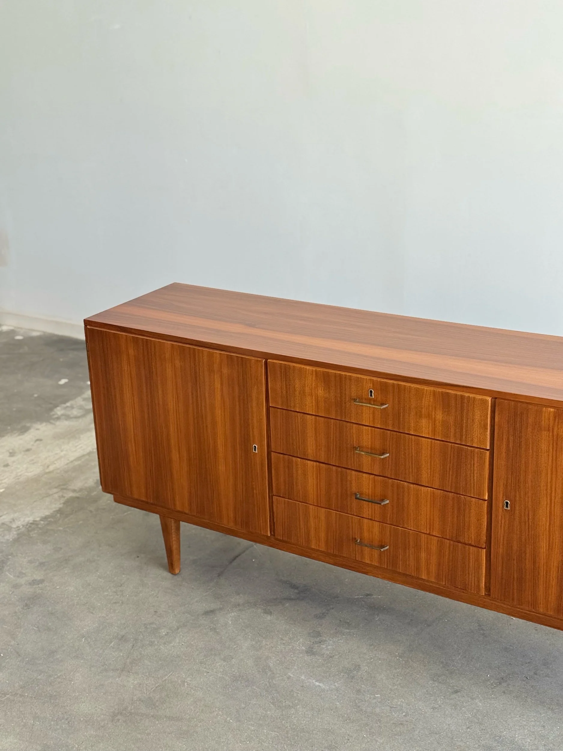 Mid-century Danish teak credenza featuring lockable drawers and cabinets with key included. Characterized by its clean lines, tapered legs, and minimalist design, this credenza has been thoughtfully restored with no major areas of wear. New push magnets have been installed.