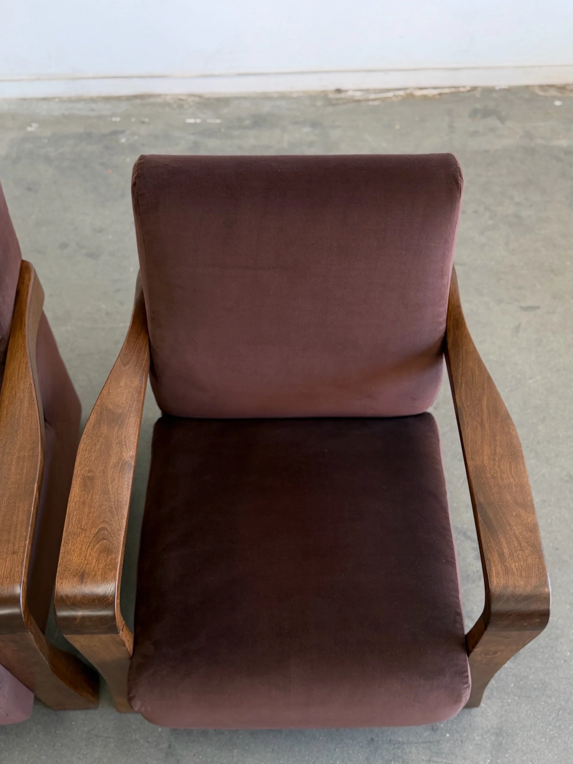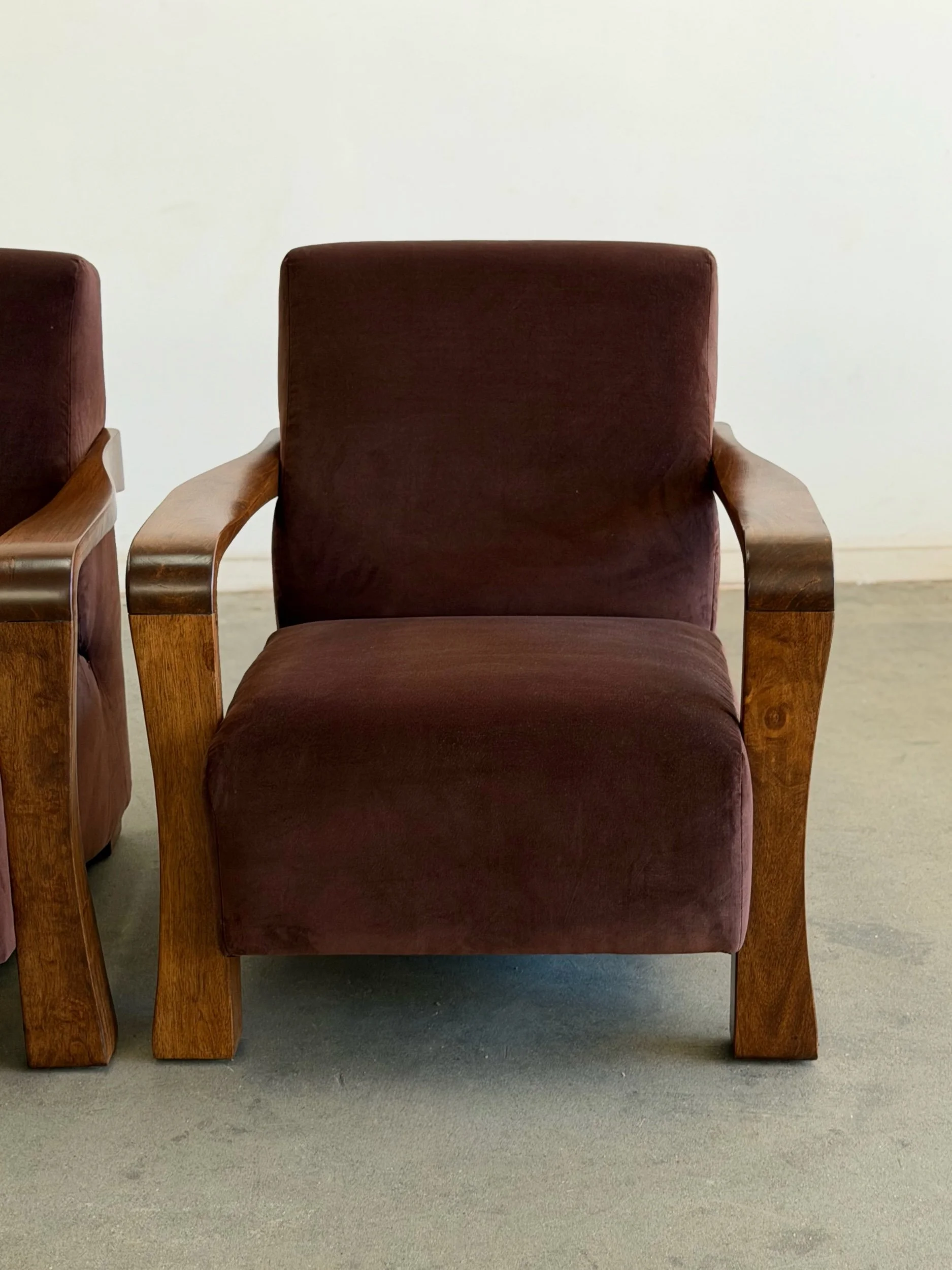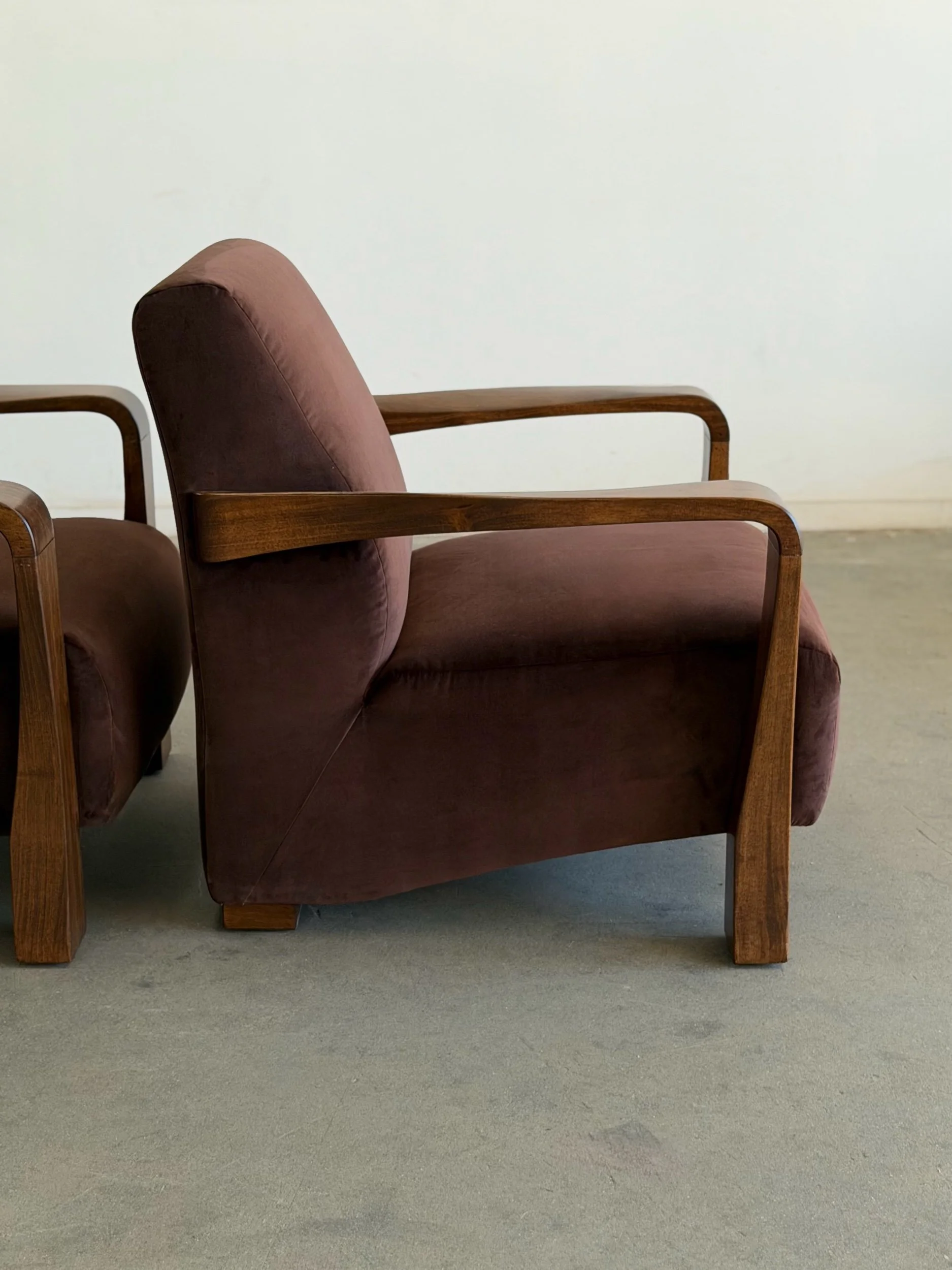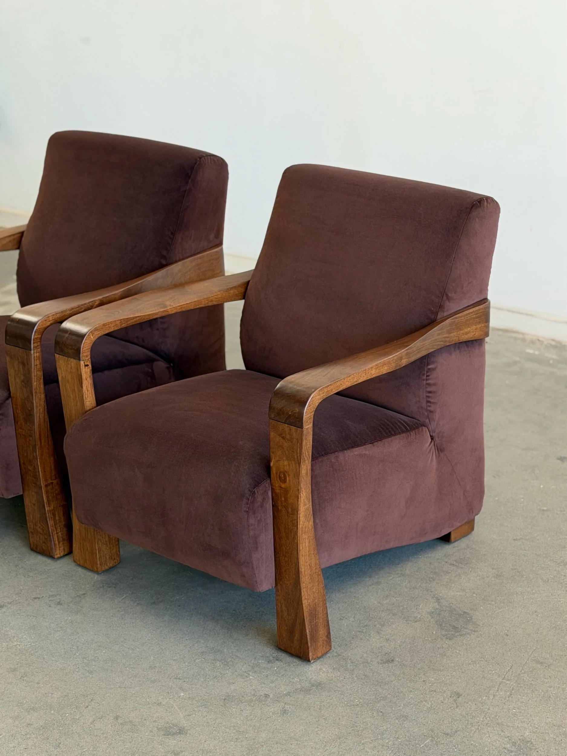 Pair of fully restored lounge chairs in velvet. The pair has nice sculpted, solid, wooden arms and features fresh foam and fresh fabric. Each unit is structurally sound and has no wobble. Price is for the pair.