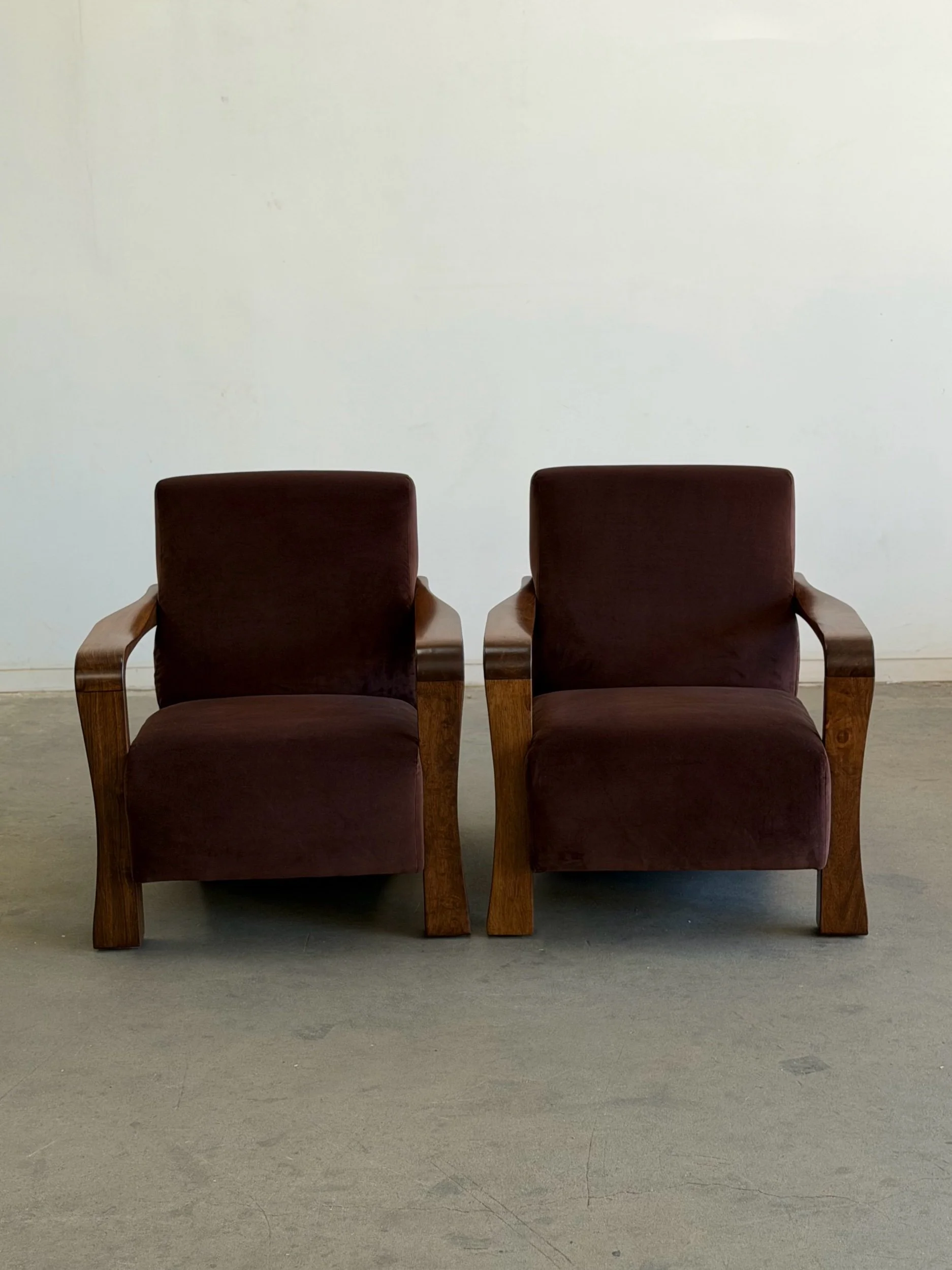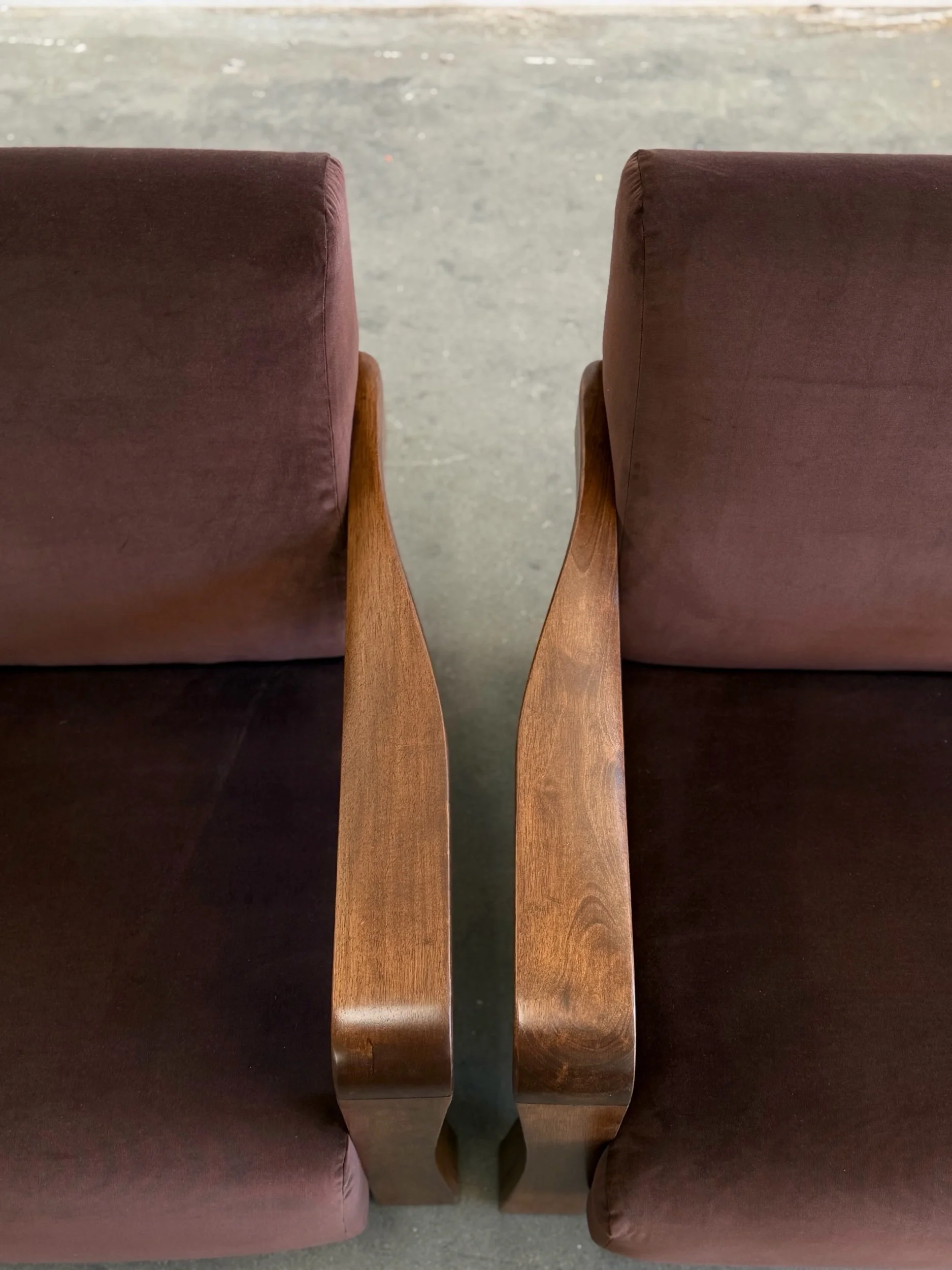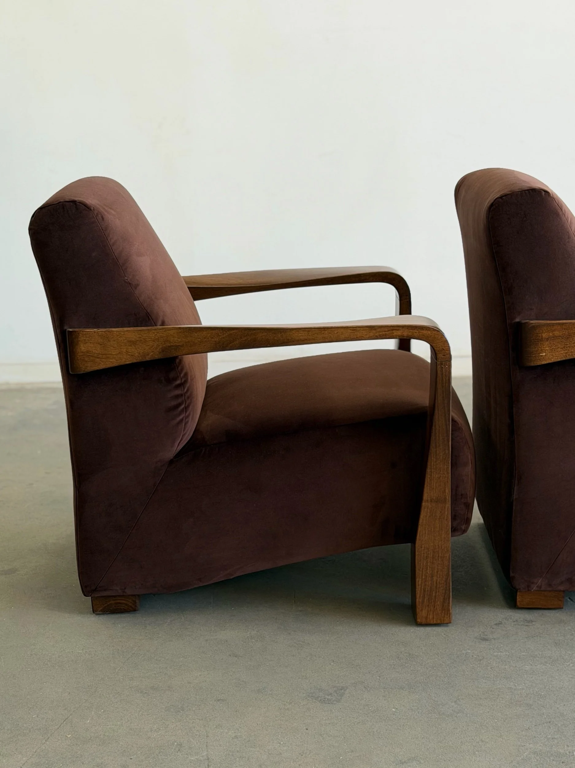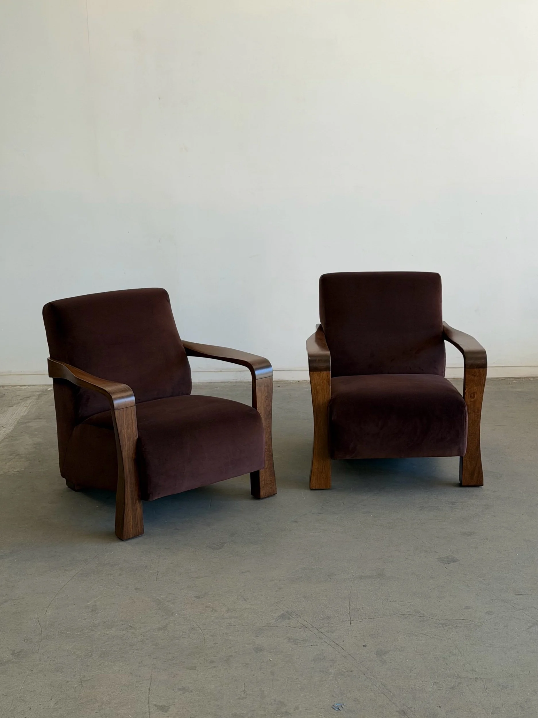 Pair of fully restored lounge chairs in velvet. The pair has nice sculpted, solid, wooden arms and features fresh foam and fresh fabric. Each unit is structurally sound and has no wobble. Price is for the pair.