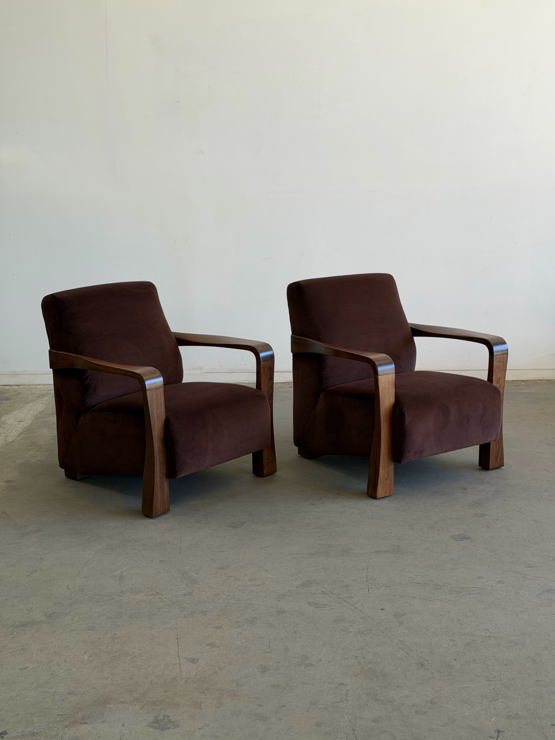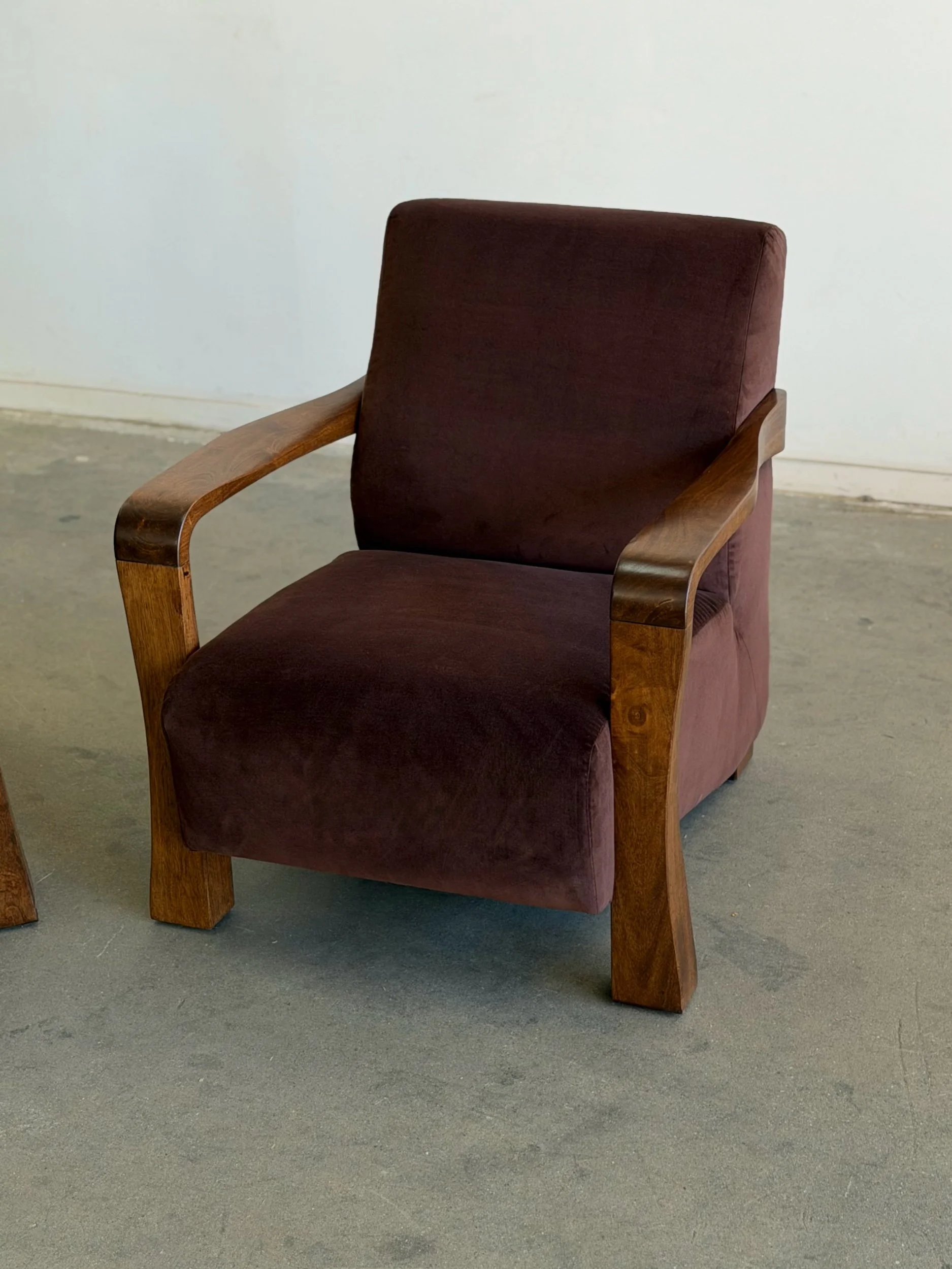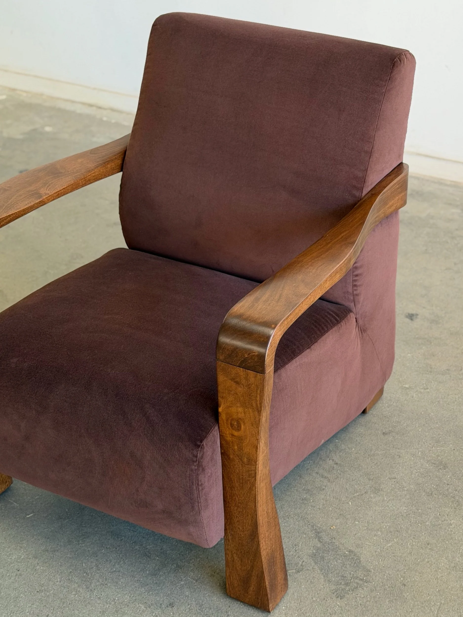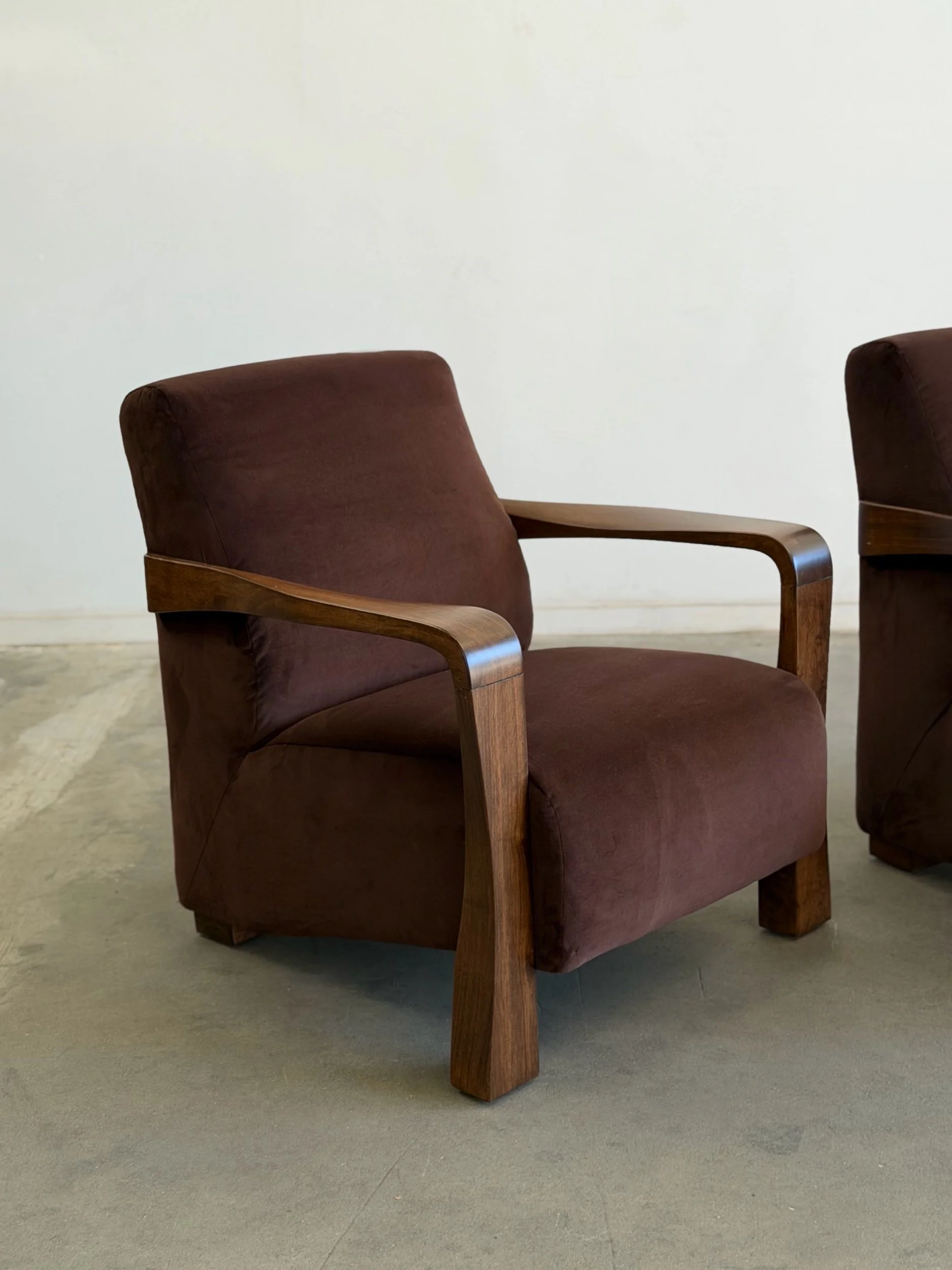 Pair of fully restored lounge chairs in velvet. The pair has nice sculpted, solid, wooden arms and features fresh foam and fresh fabric. Each unit is structurally sound and has no wobble. Price is for the pair.
