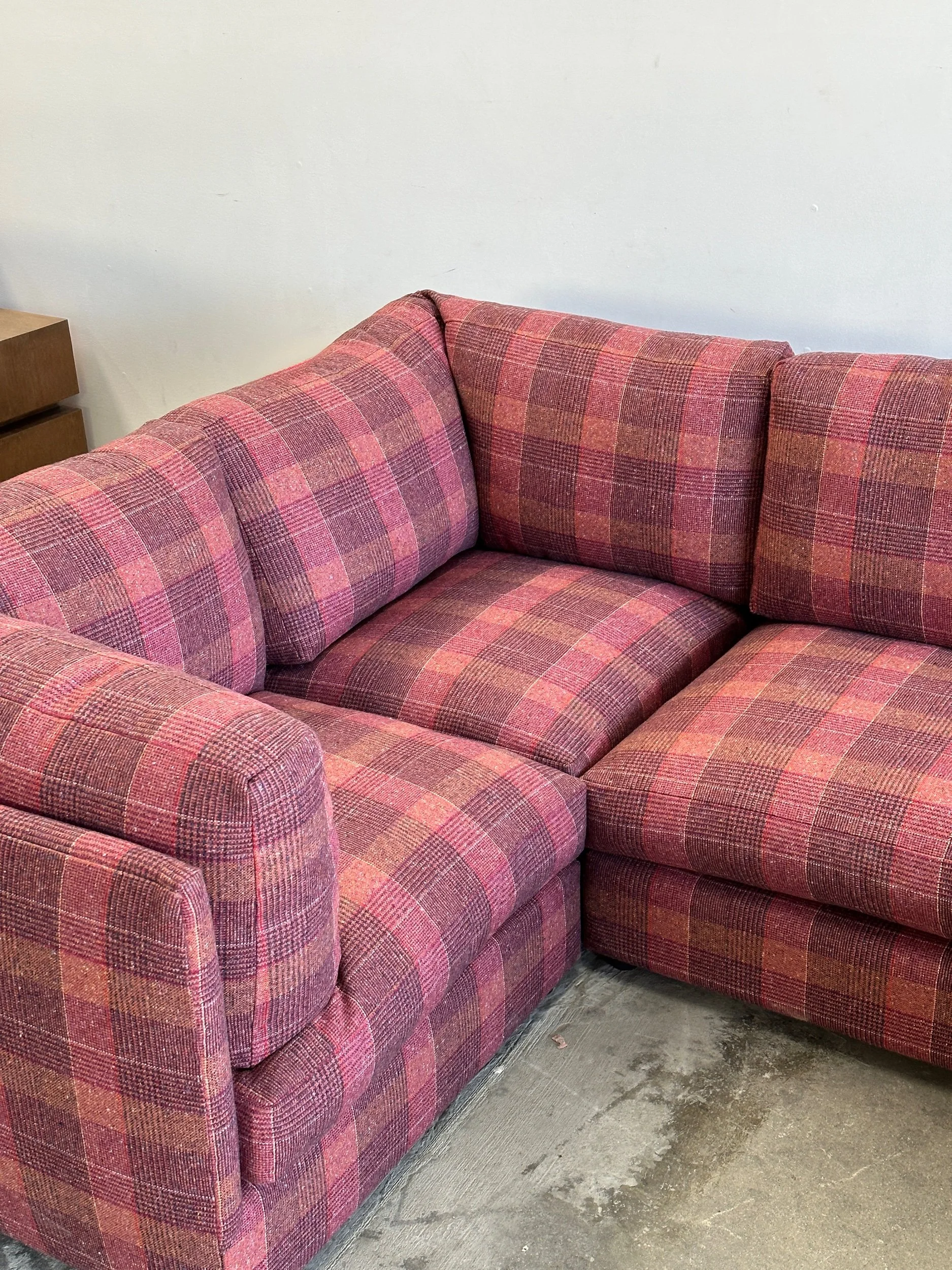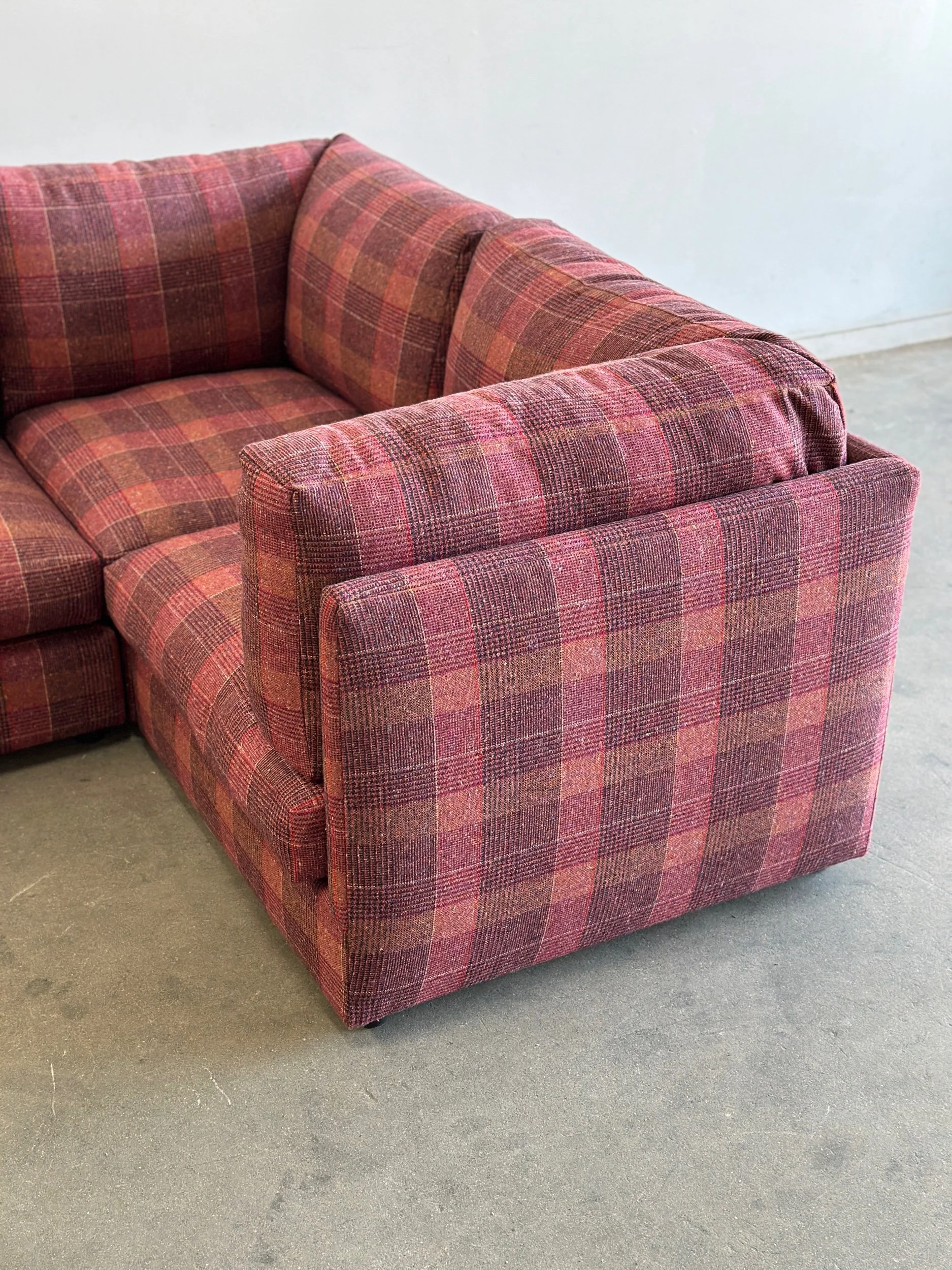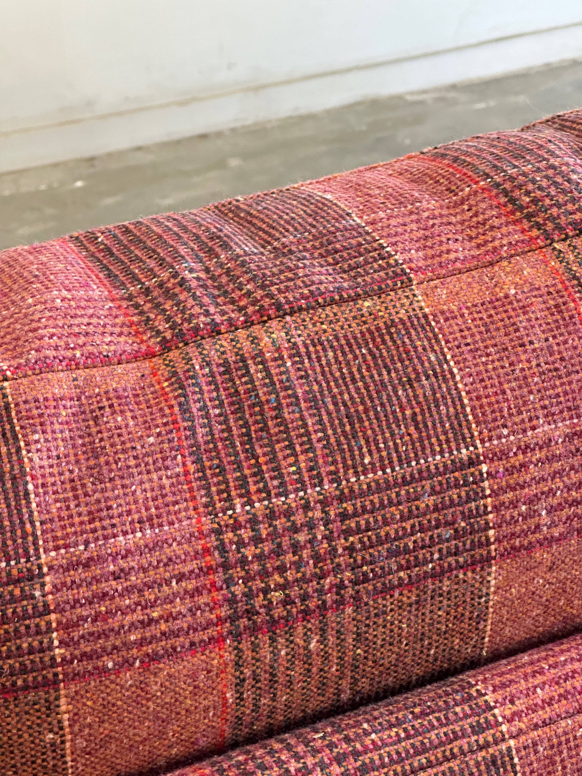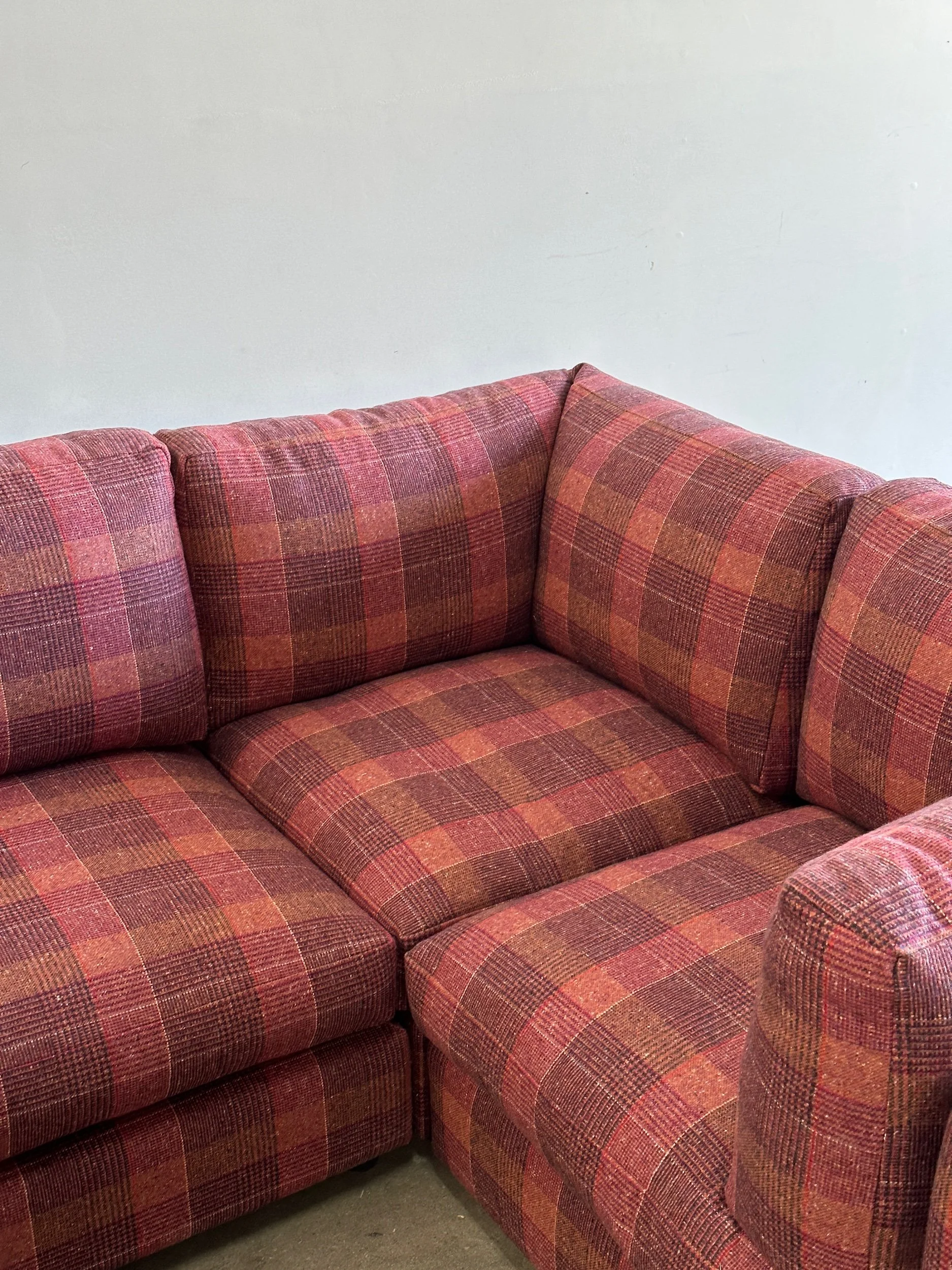 This custom made modular sectional sofa pairs a simple timeless design with fun woven plaid fabric in shades of pink, magenta, orange, yellows and speckles of blue.