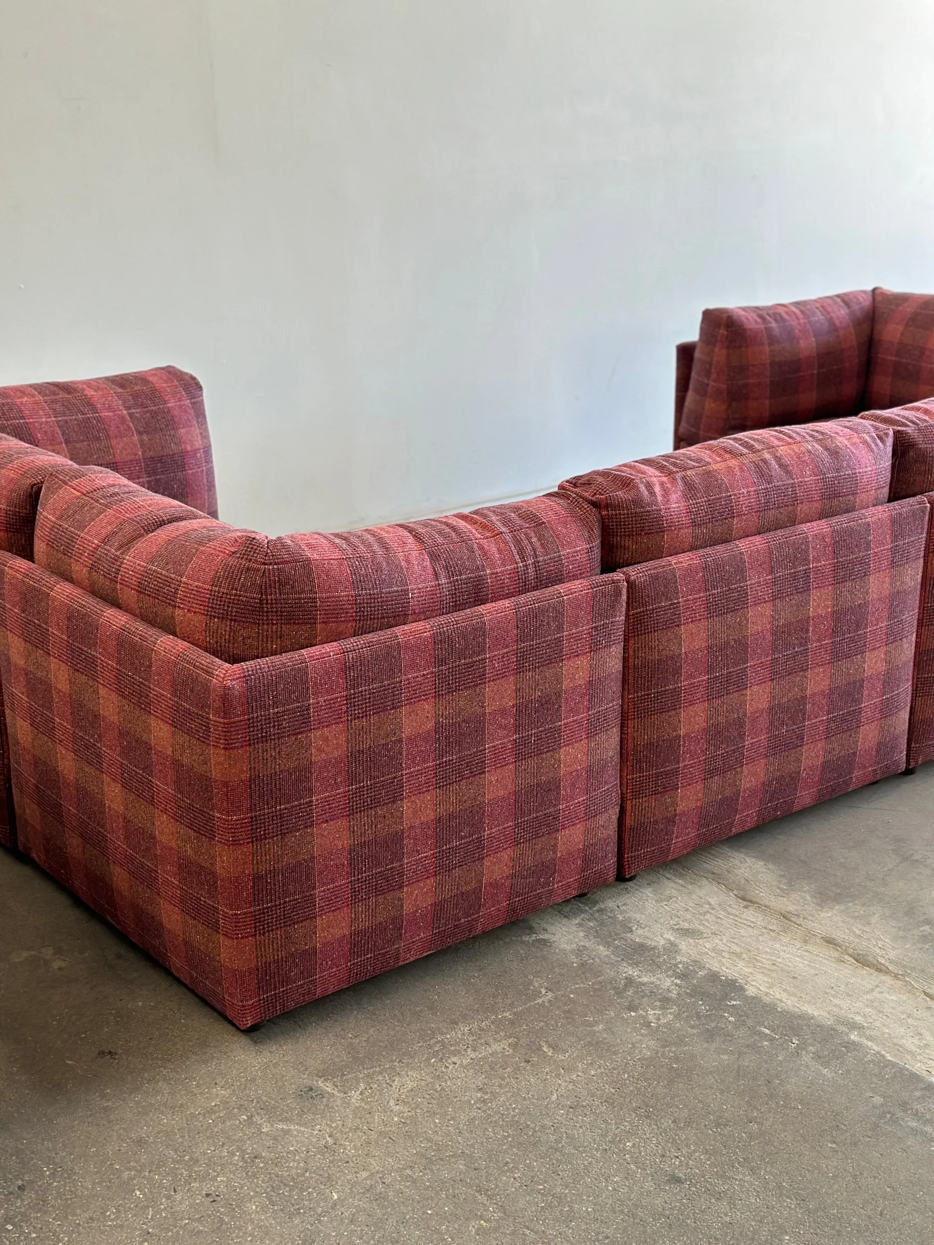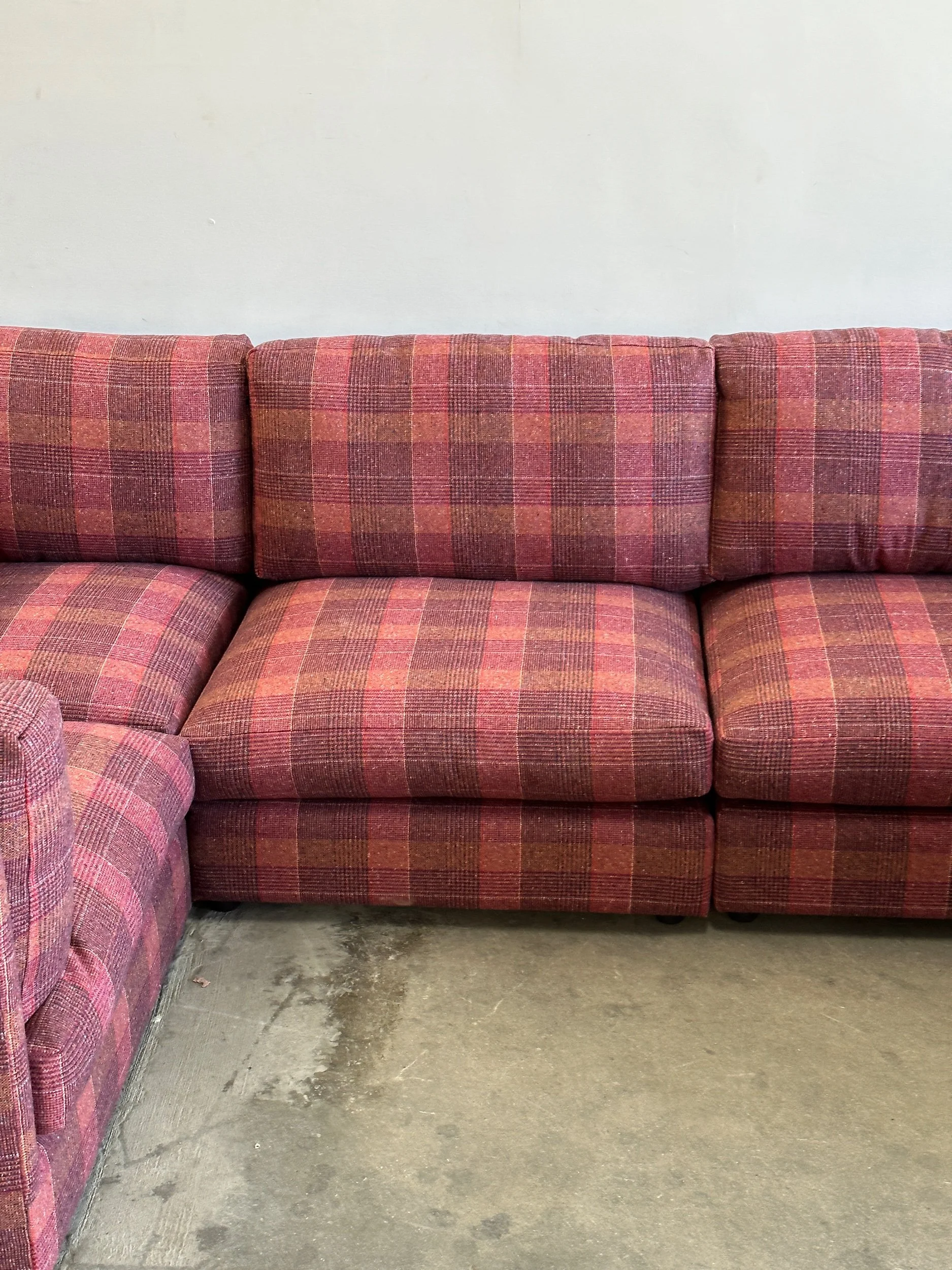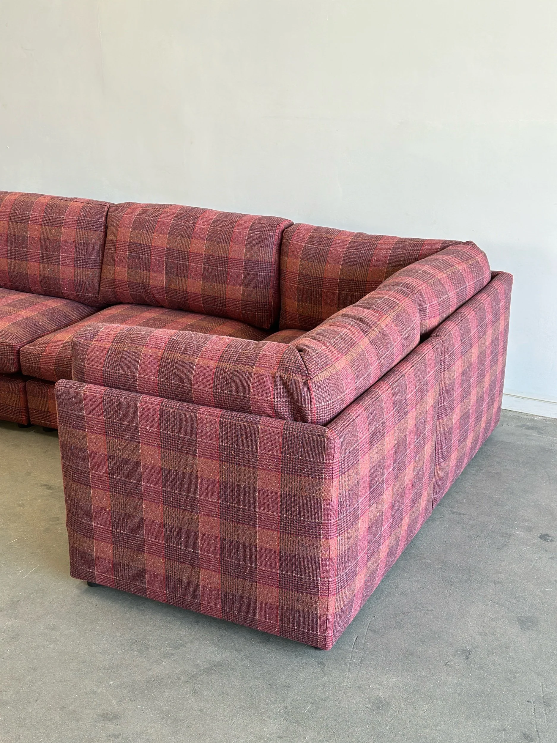 This custom made modular sectional sofa pairs a simple timeless design with fun woven plaid fabric in shades of pink, magenta, orange, yellows and speckles of blue.