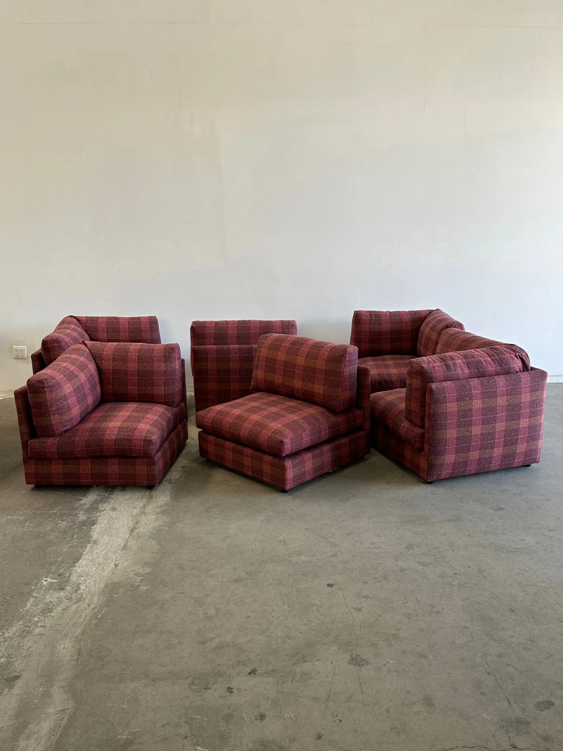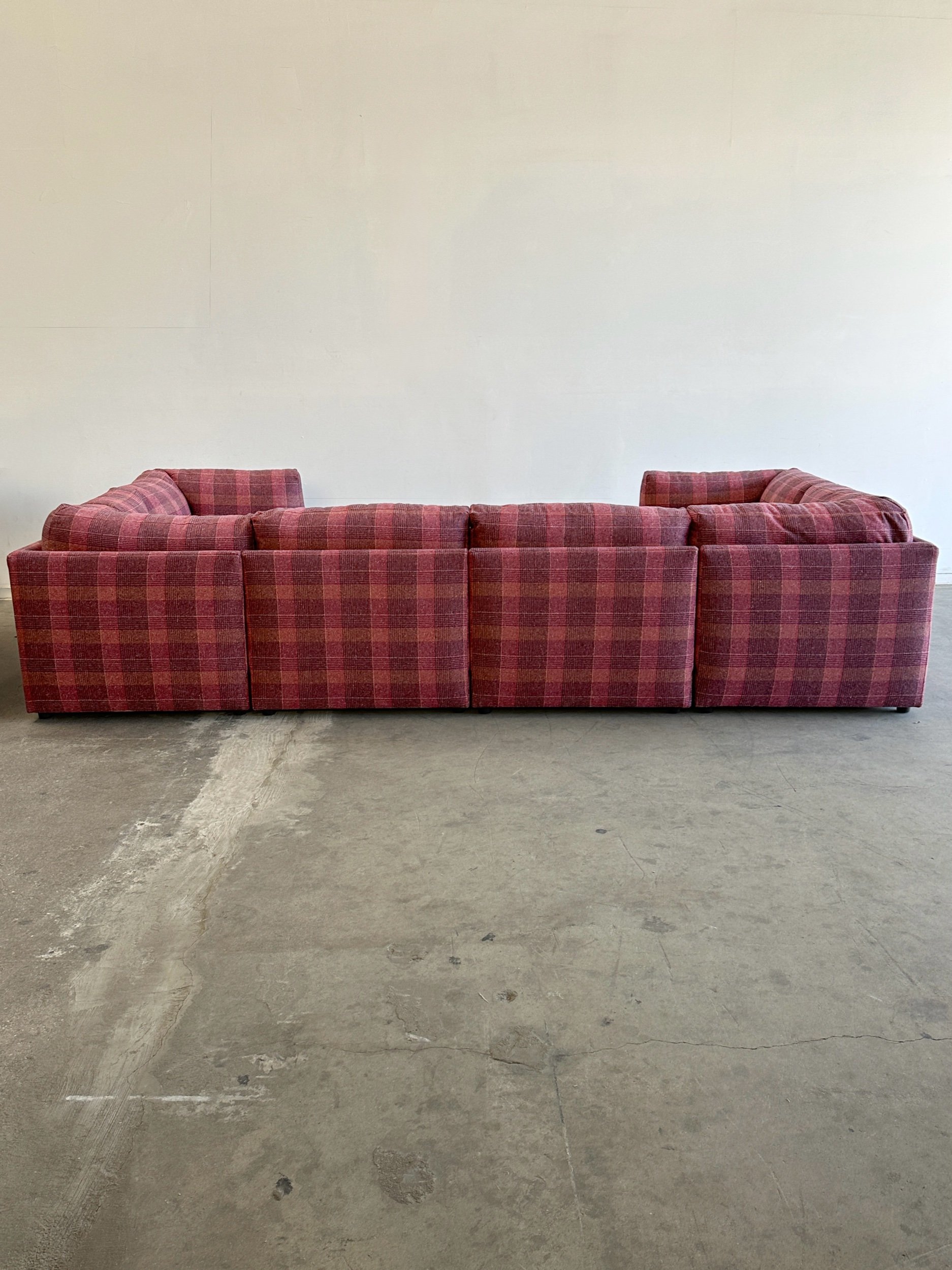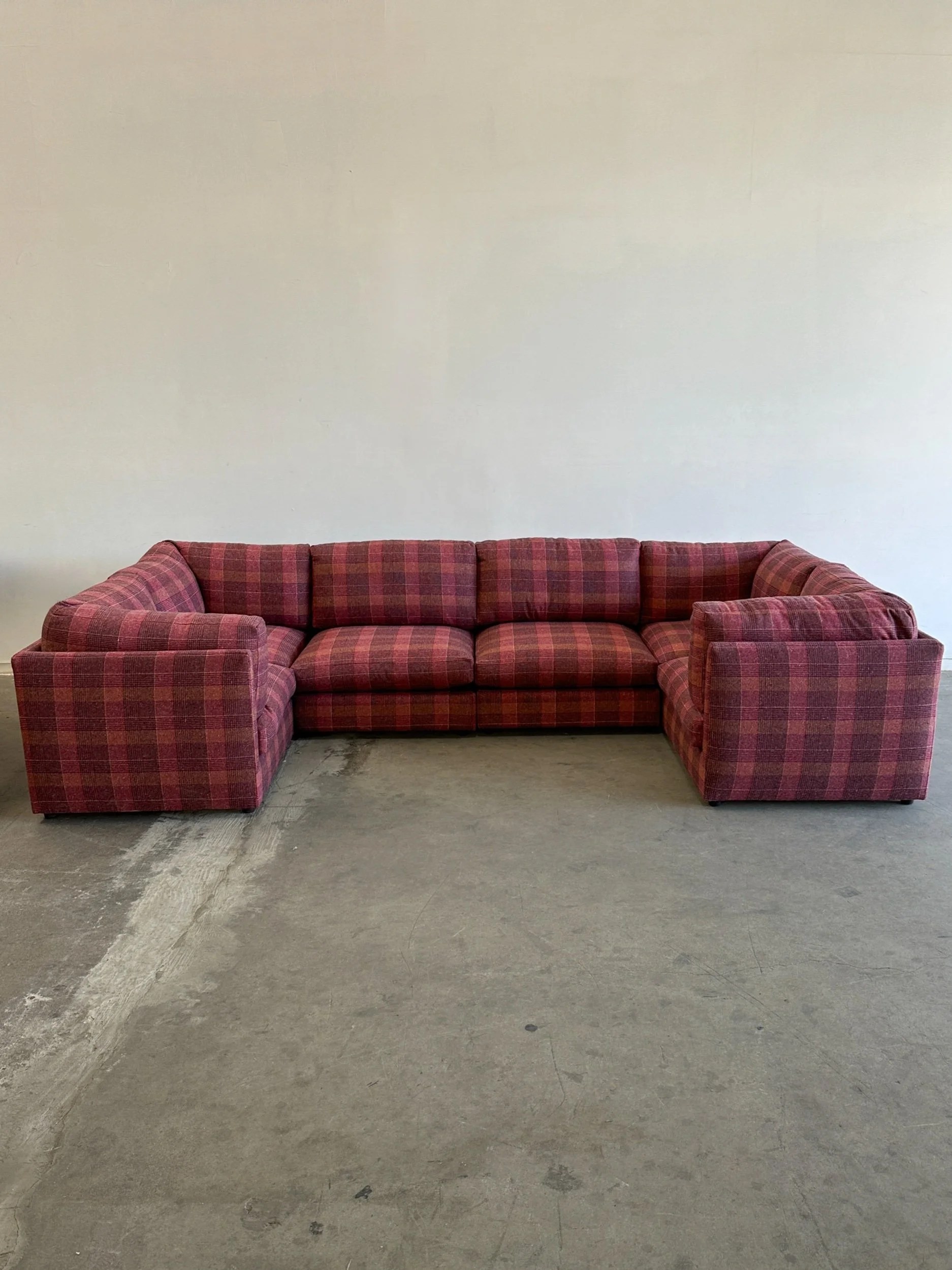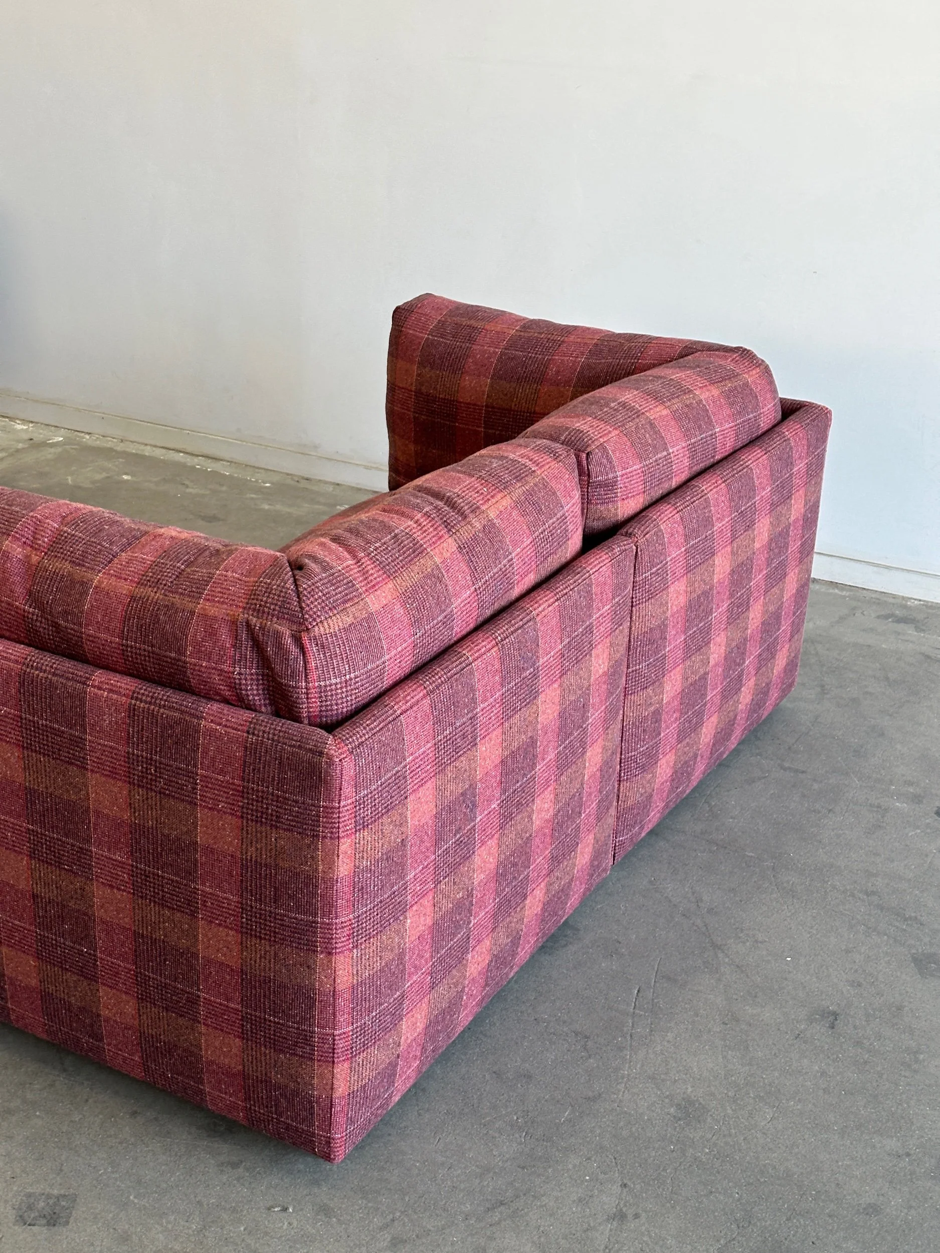 This custom made modular sectional sofa pairs a simple timeless design with fun woven plaid fabric in shades of pink, magenta, orange, yellows and speckles of blue.
