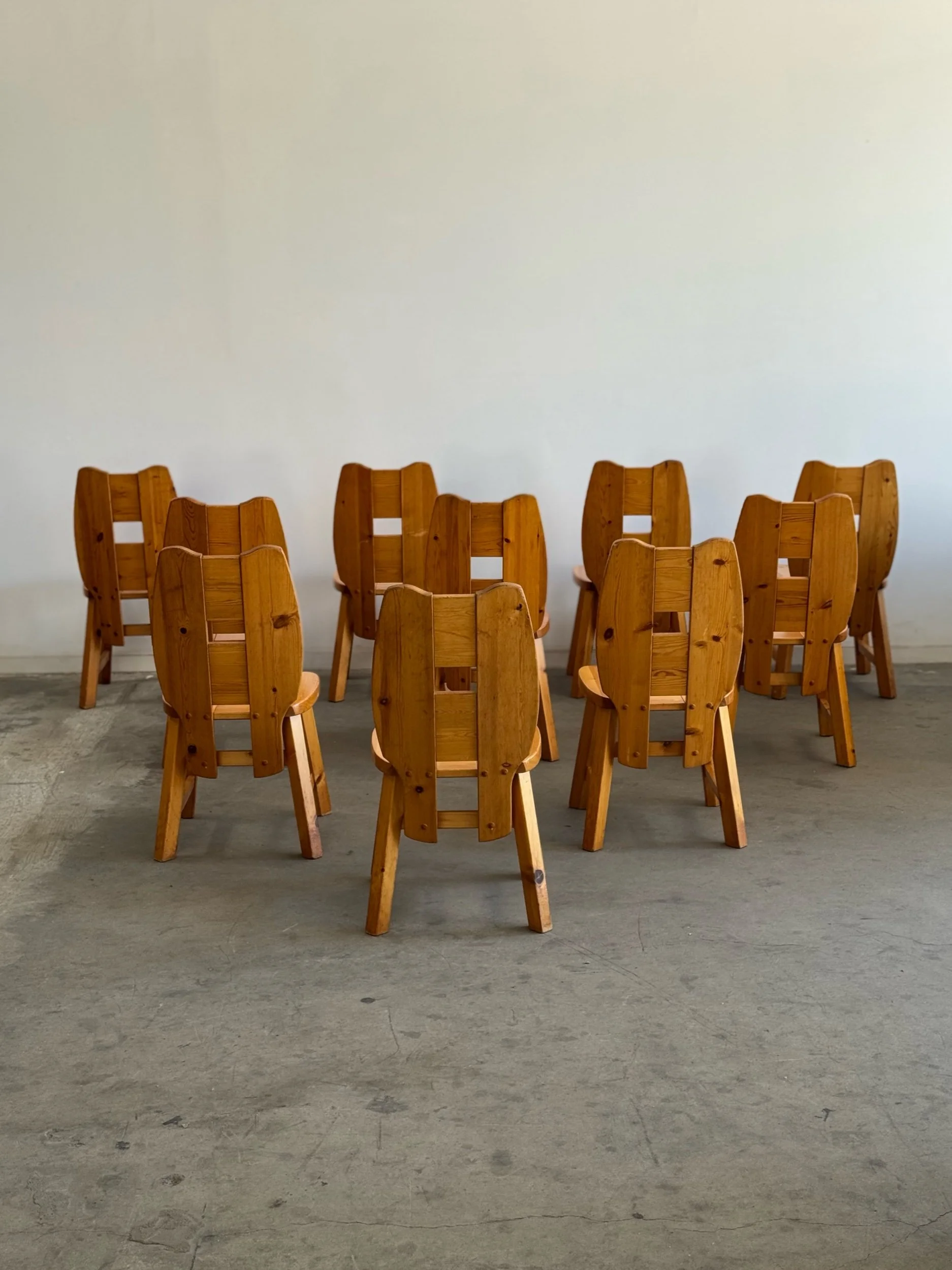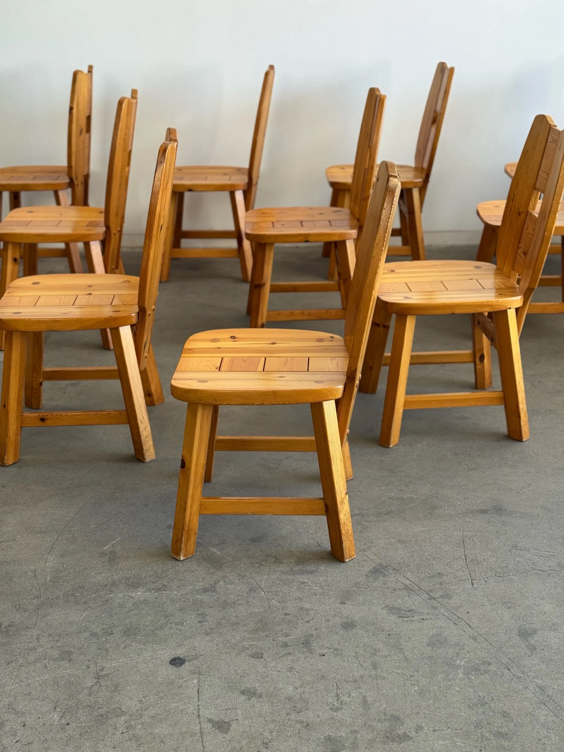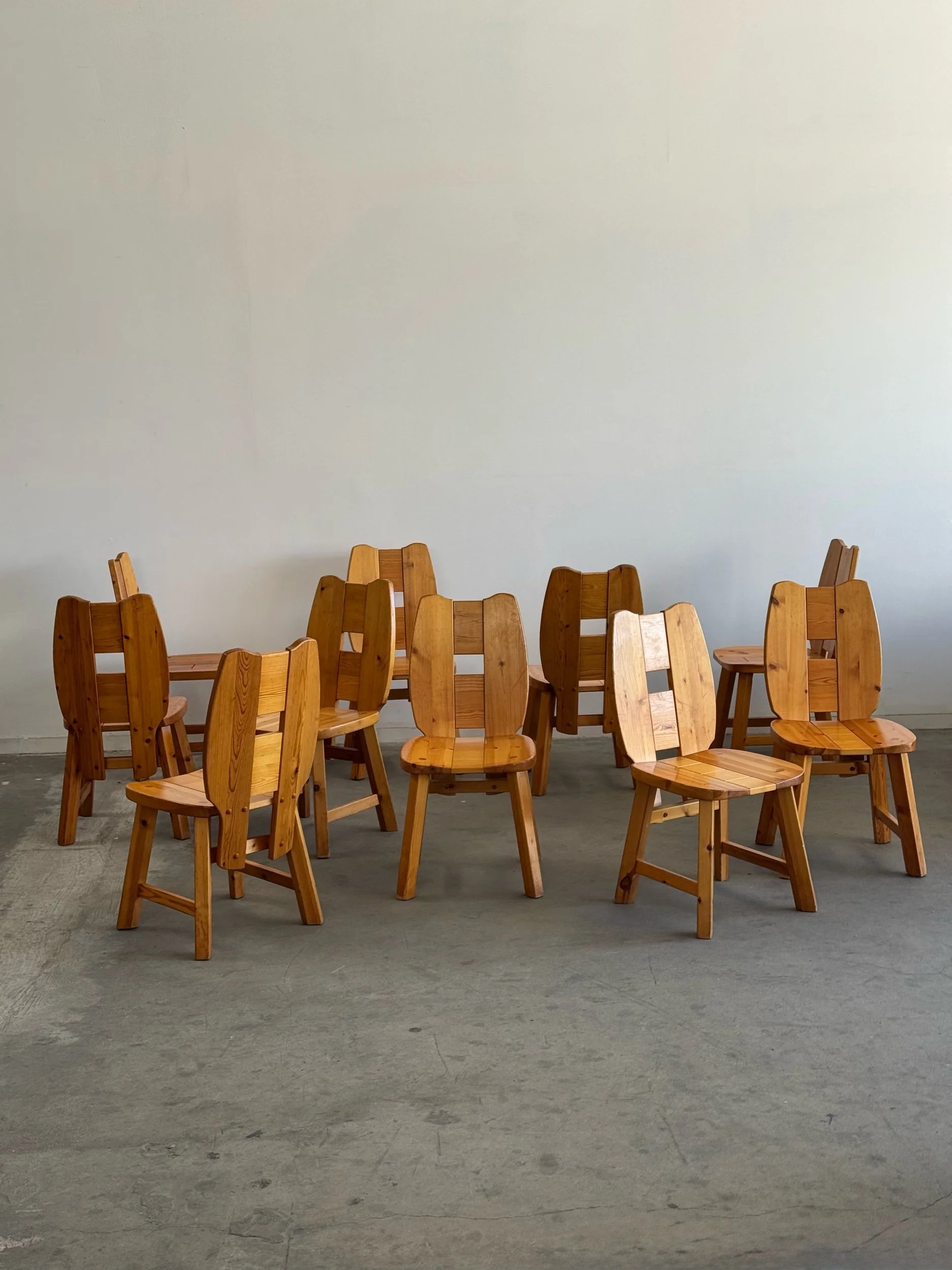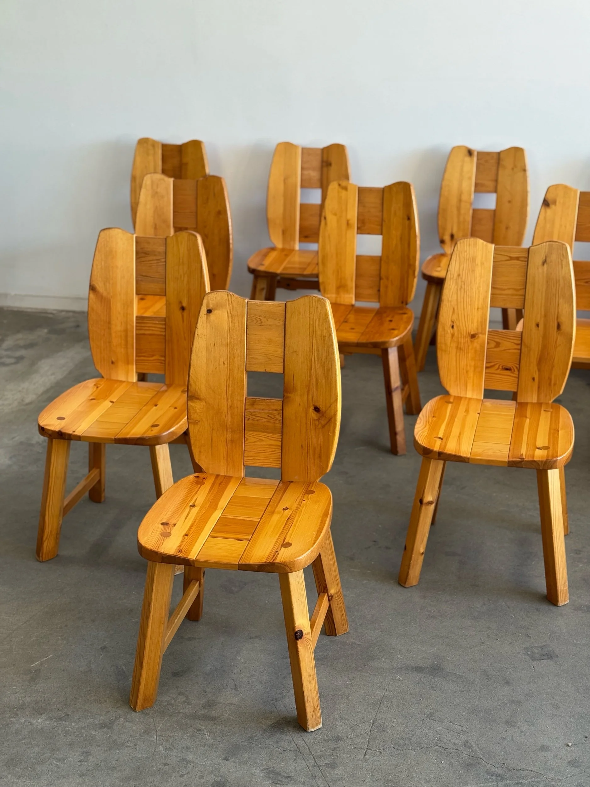 Vintage pine dining chairs most like Sweden circa 1970s . Chairs are in excellent lightly restored condition. Each unit features solid older pine construction, Chair are structurally sound and fully functional with no major areas of wear. Price is for the set of ten.