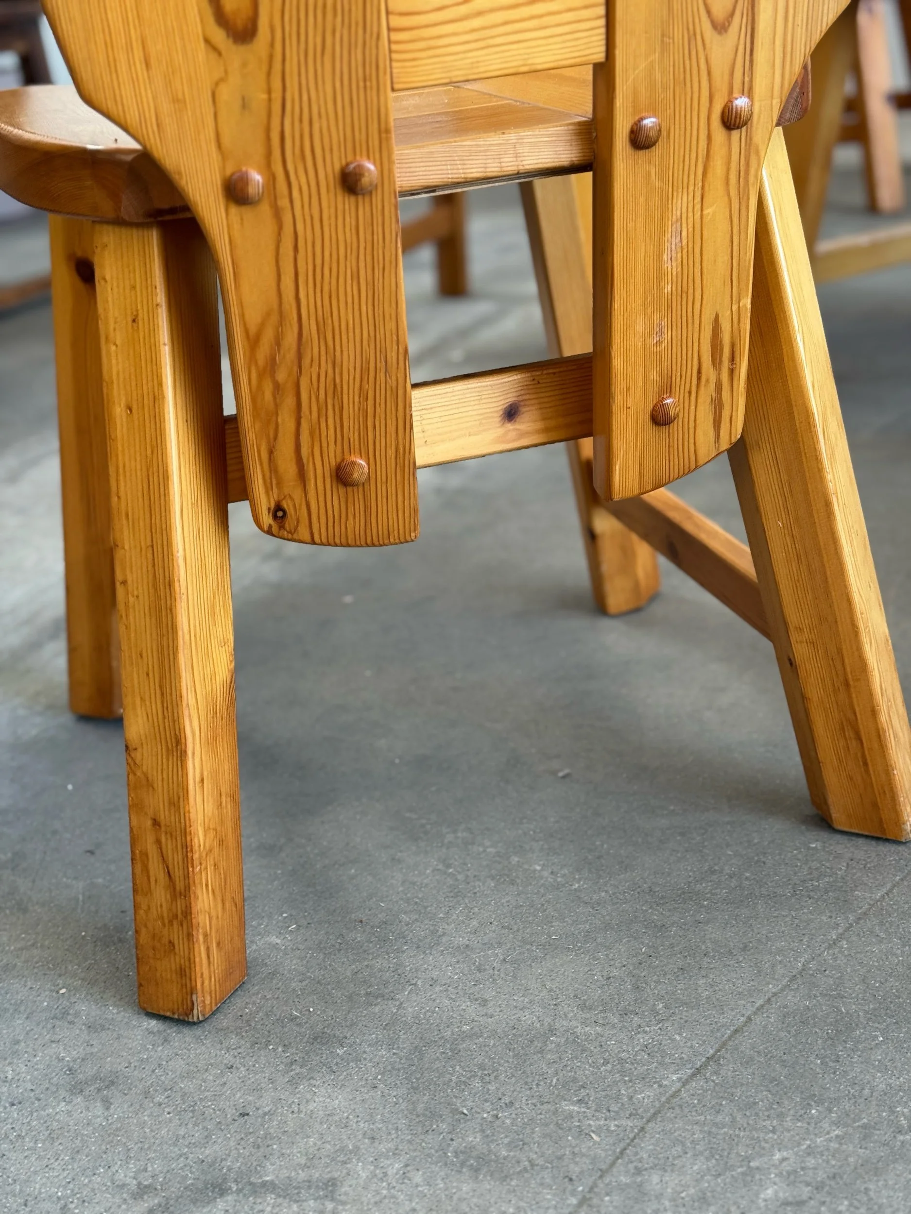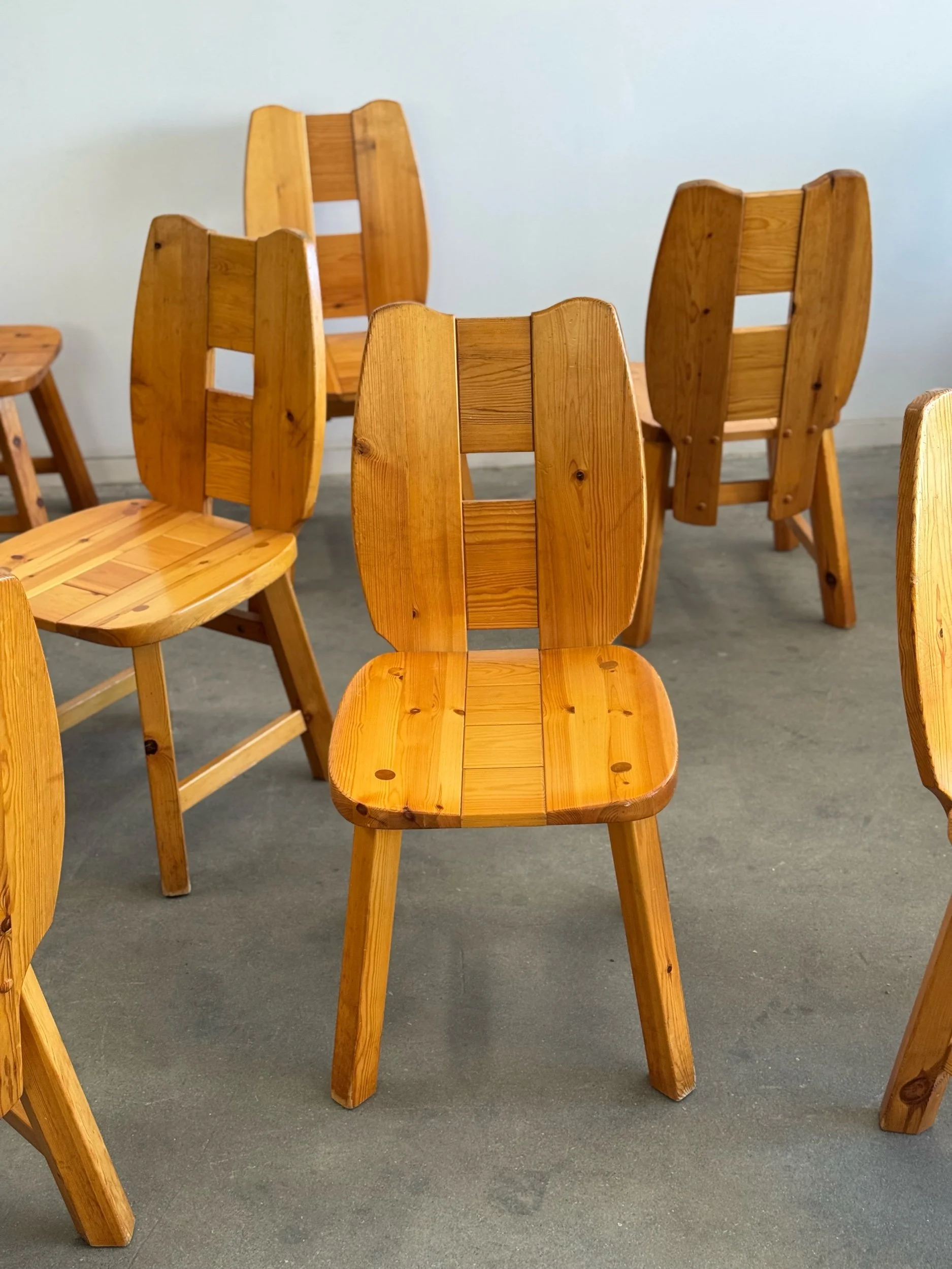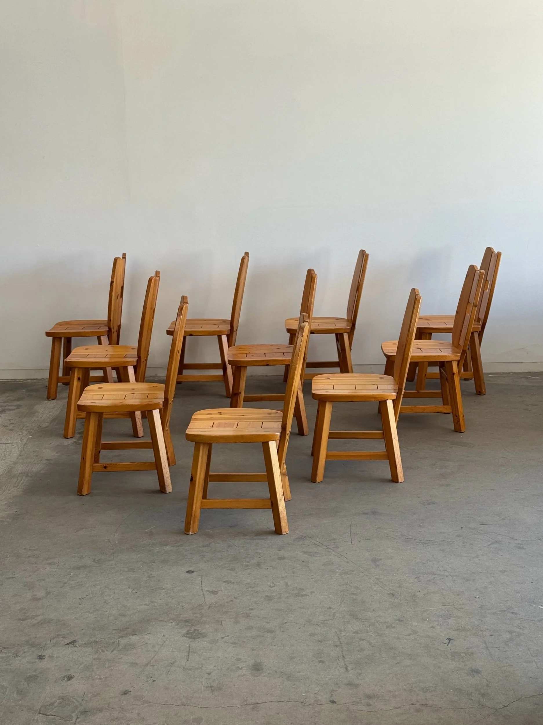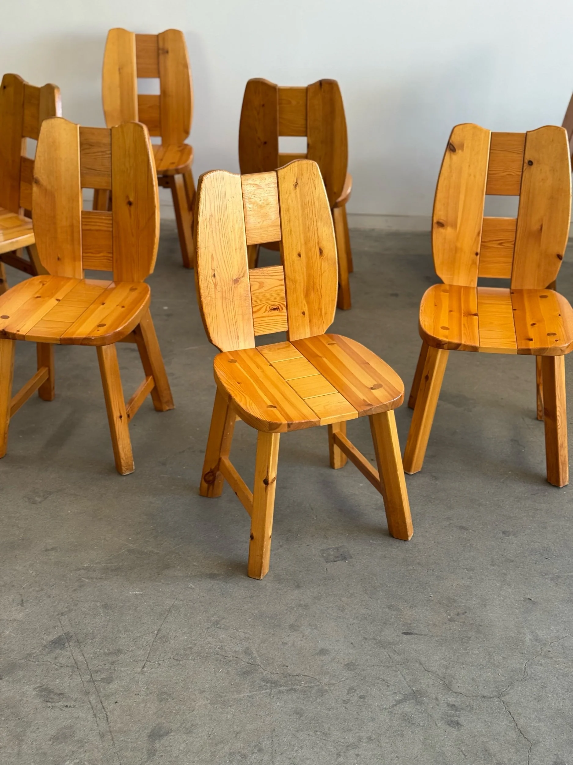 Vintage pine dining chairs most like Sweden circa 1970s . Chairs are in excellent lightly restored condition. Each unit features solid older pine construction, Chair are structurally sound and fully functional with no major areas of wear. Price is for the set of ten.