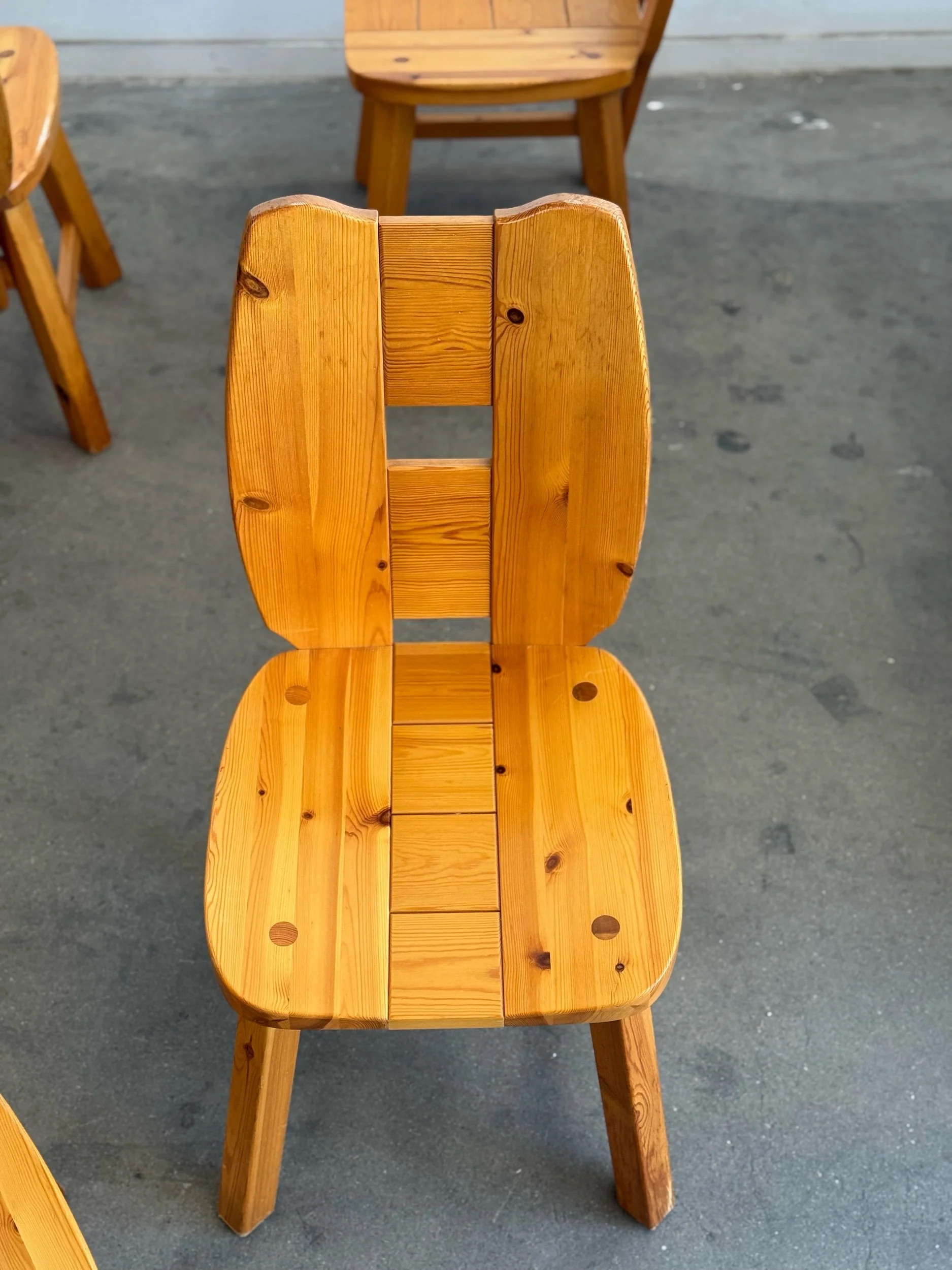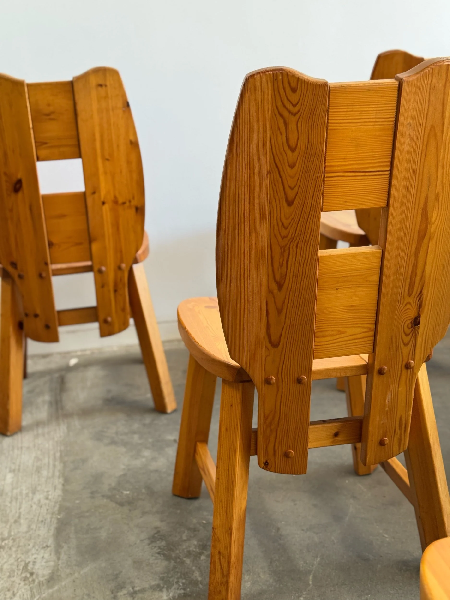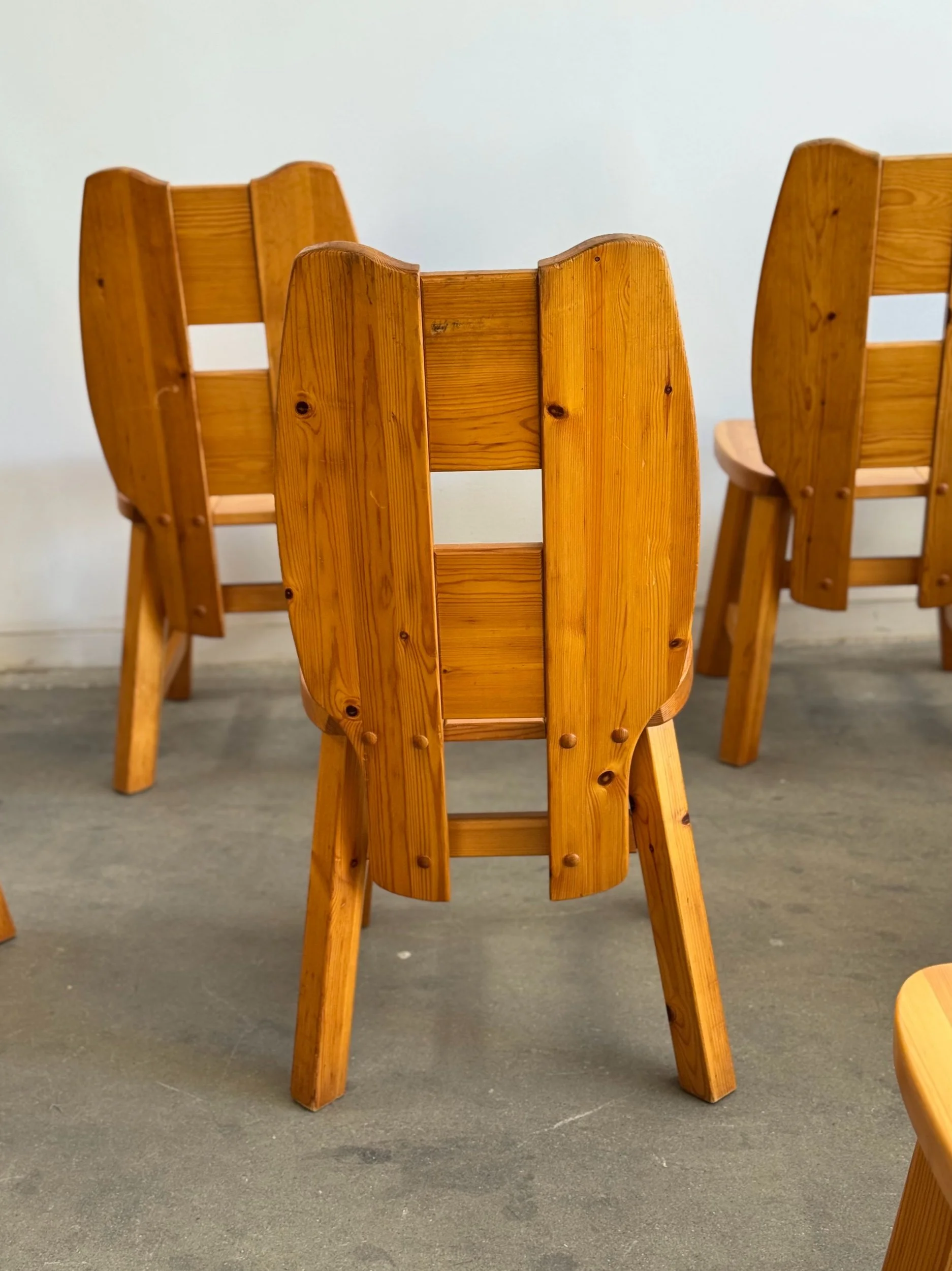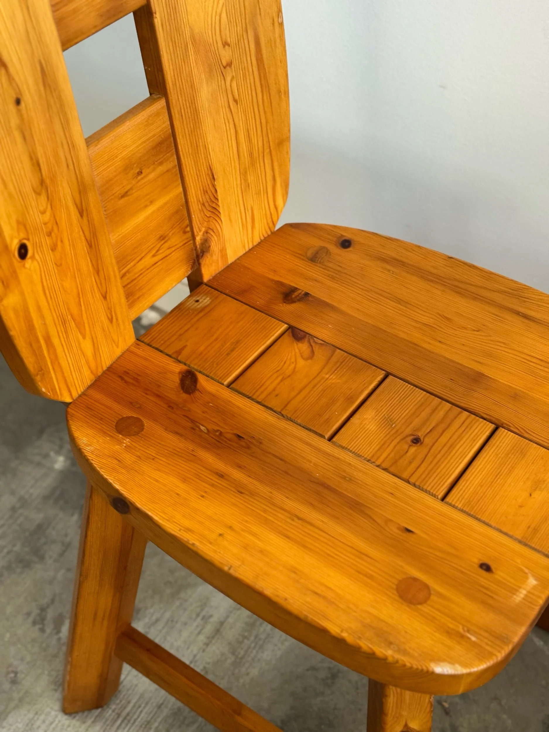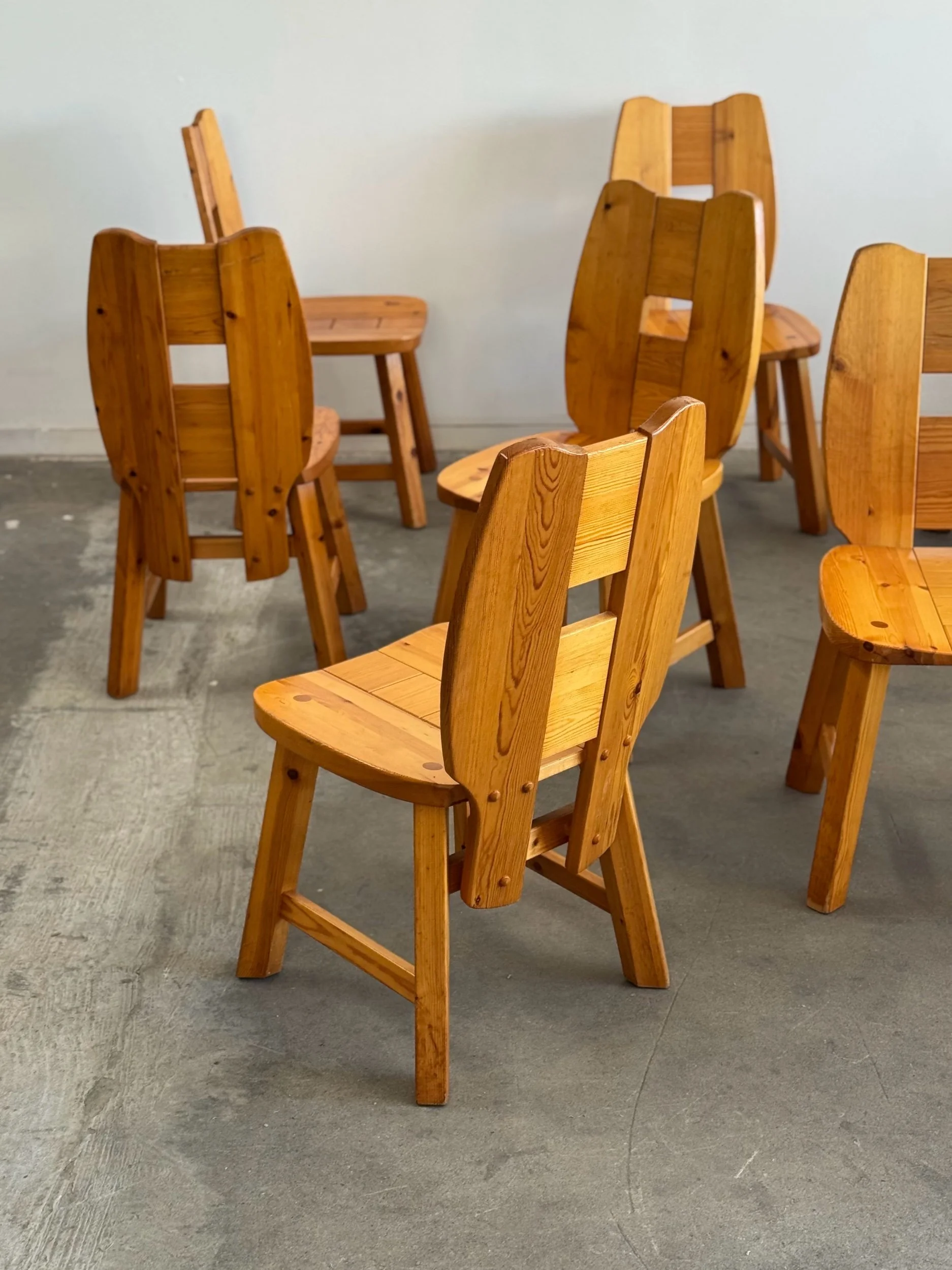 Vintage pine dining chairs most like Sweden circa 1970s . Chairs are in excellent lightly restored condition. Each unit features solid older pine construction, Chair are structurally sound and fully functional with no major areas of wear. Price is for the set of ten.