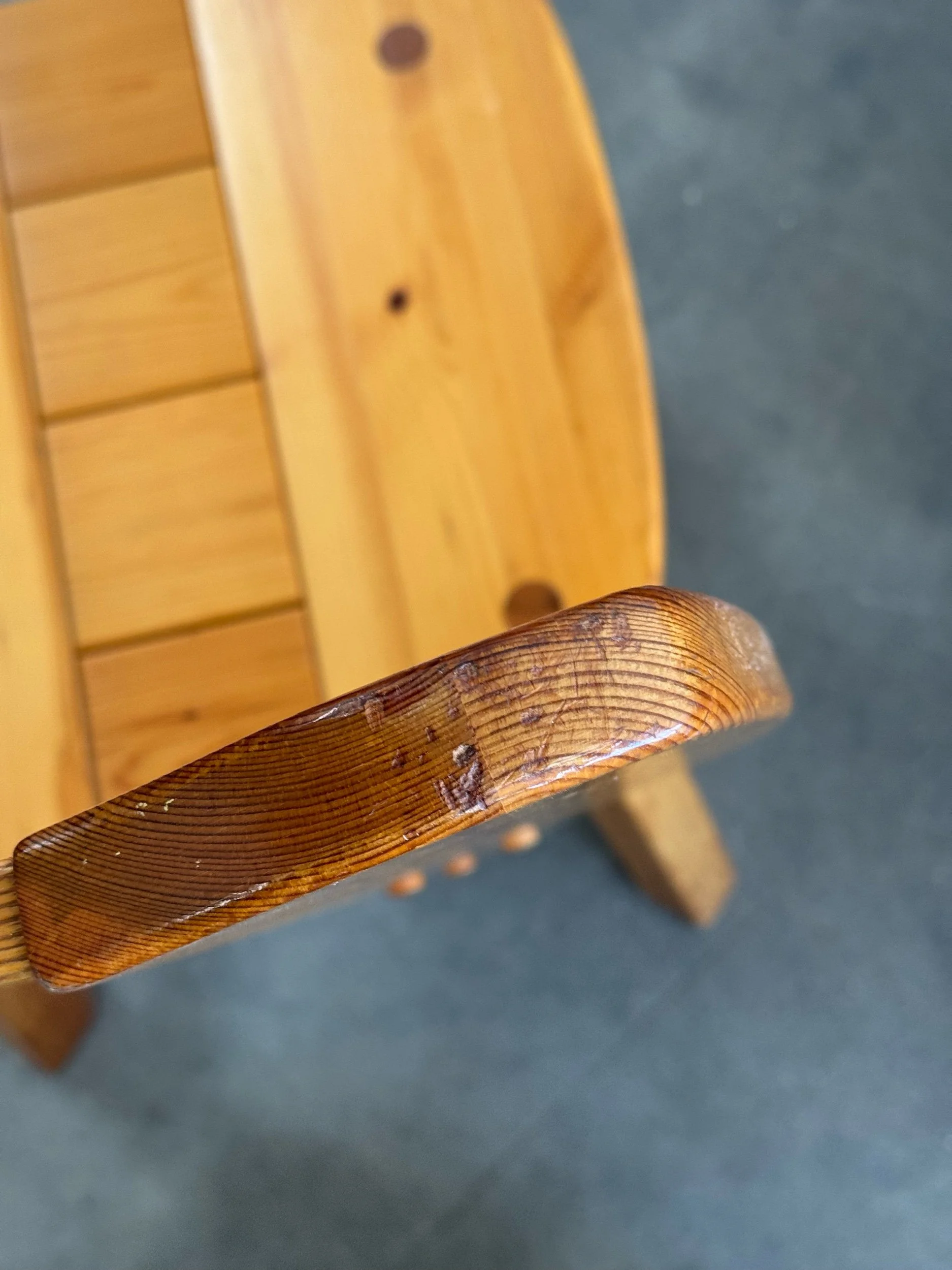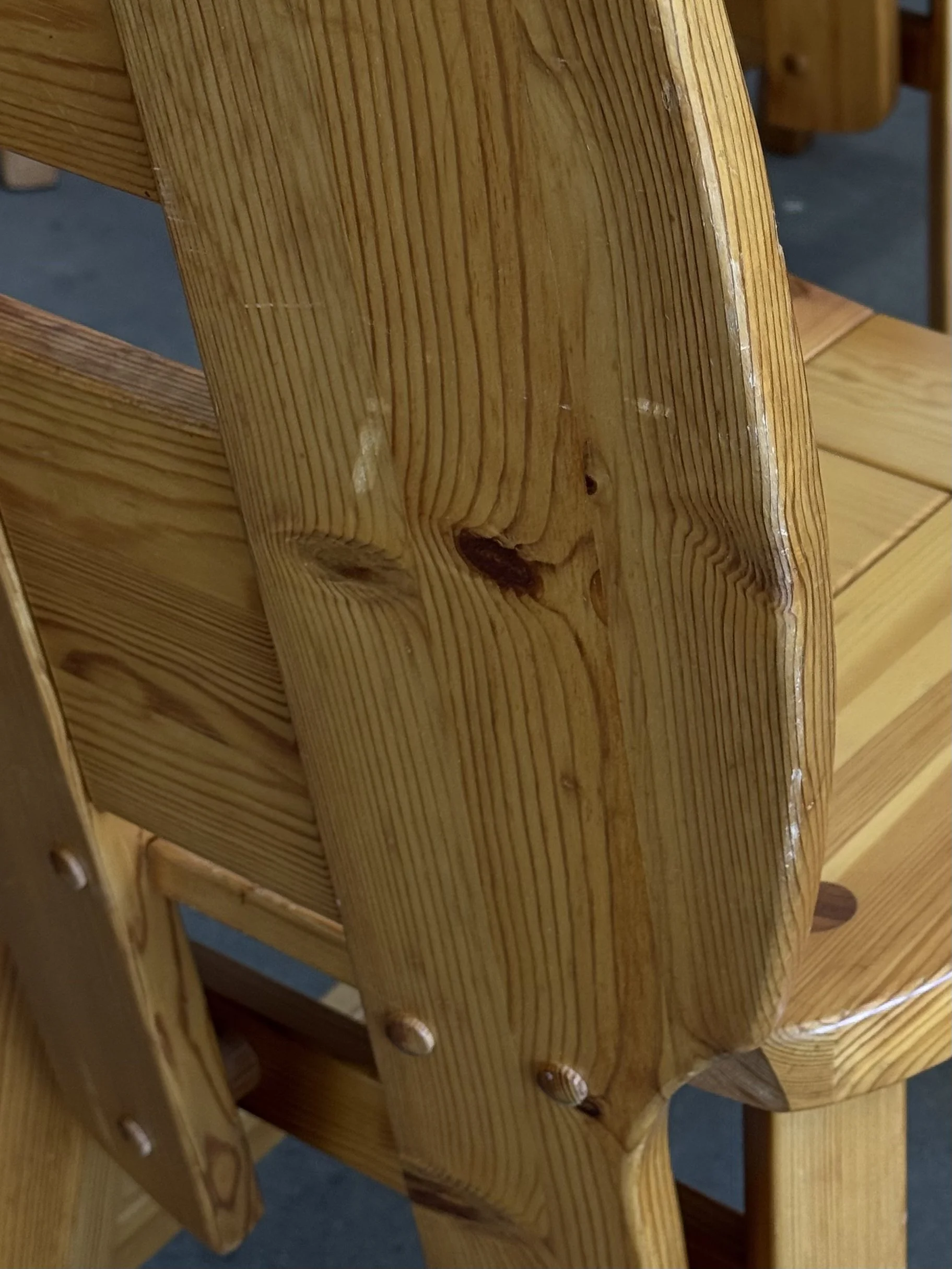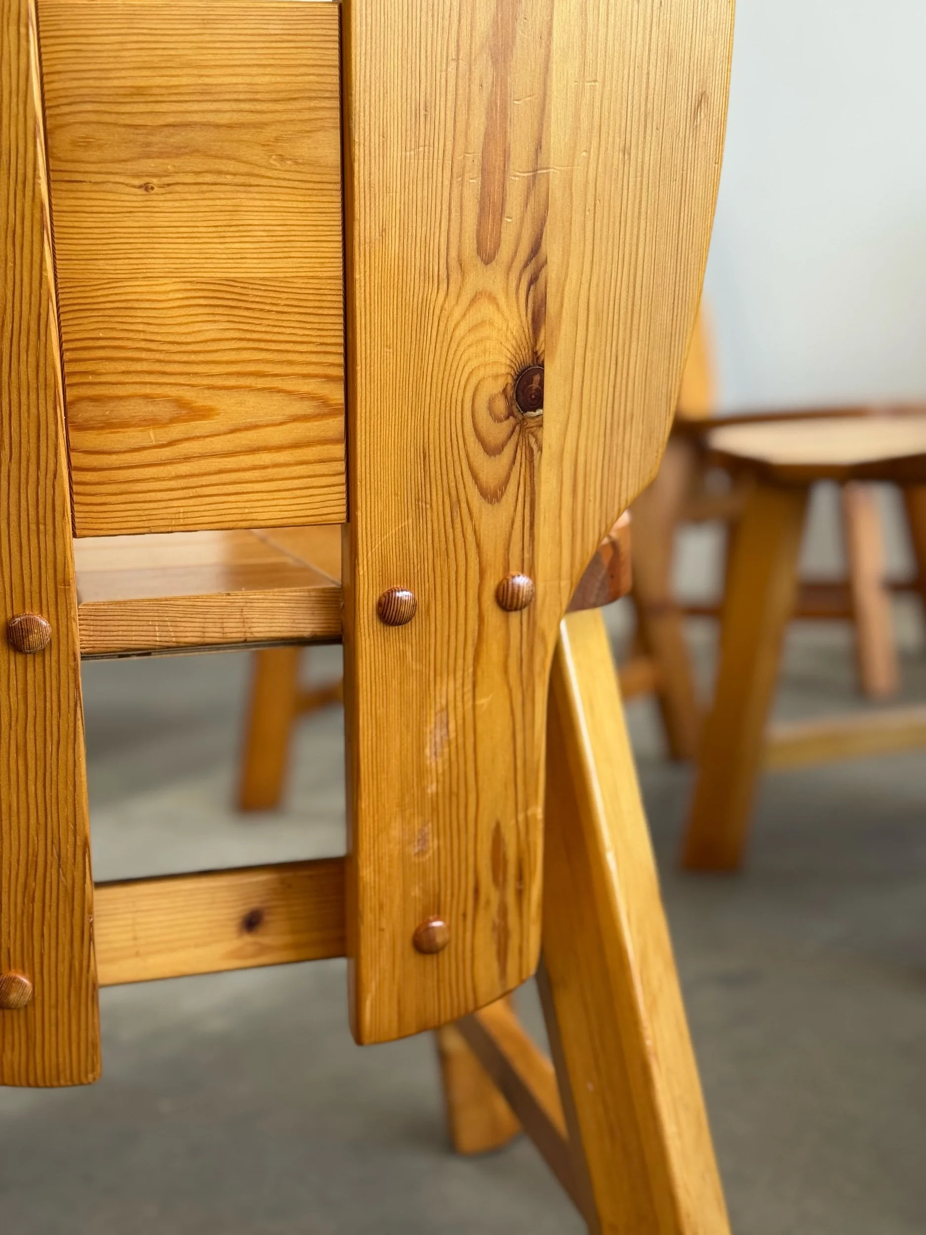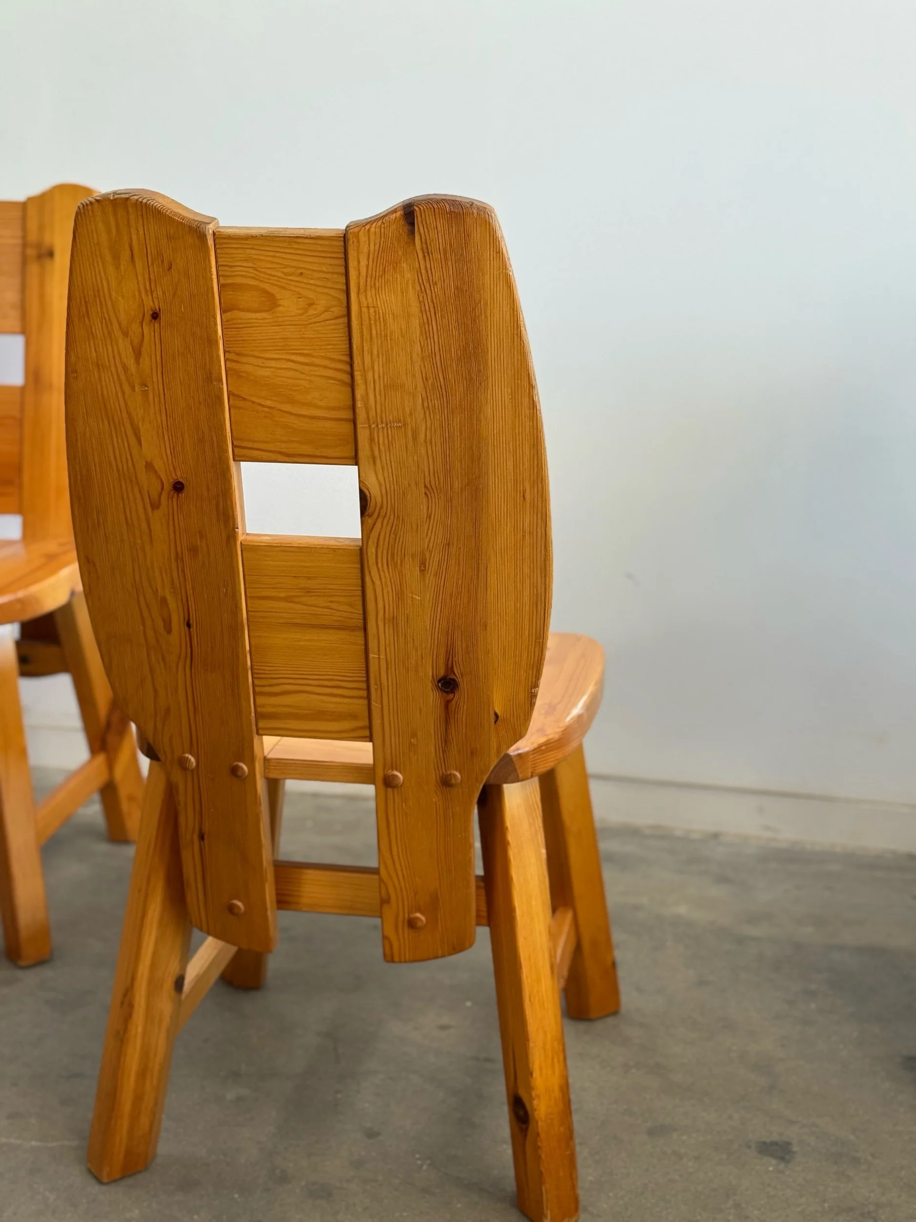 Vintage pine dining chairs most like Sweden circa 1970s . Chairs are in excellent lightly restored condition. Each unit features solid older pine construction, Chair are structurally sound and fully functional with no major areas of wear. Price is for the set of ten.